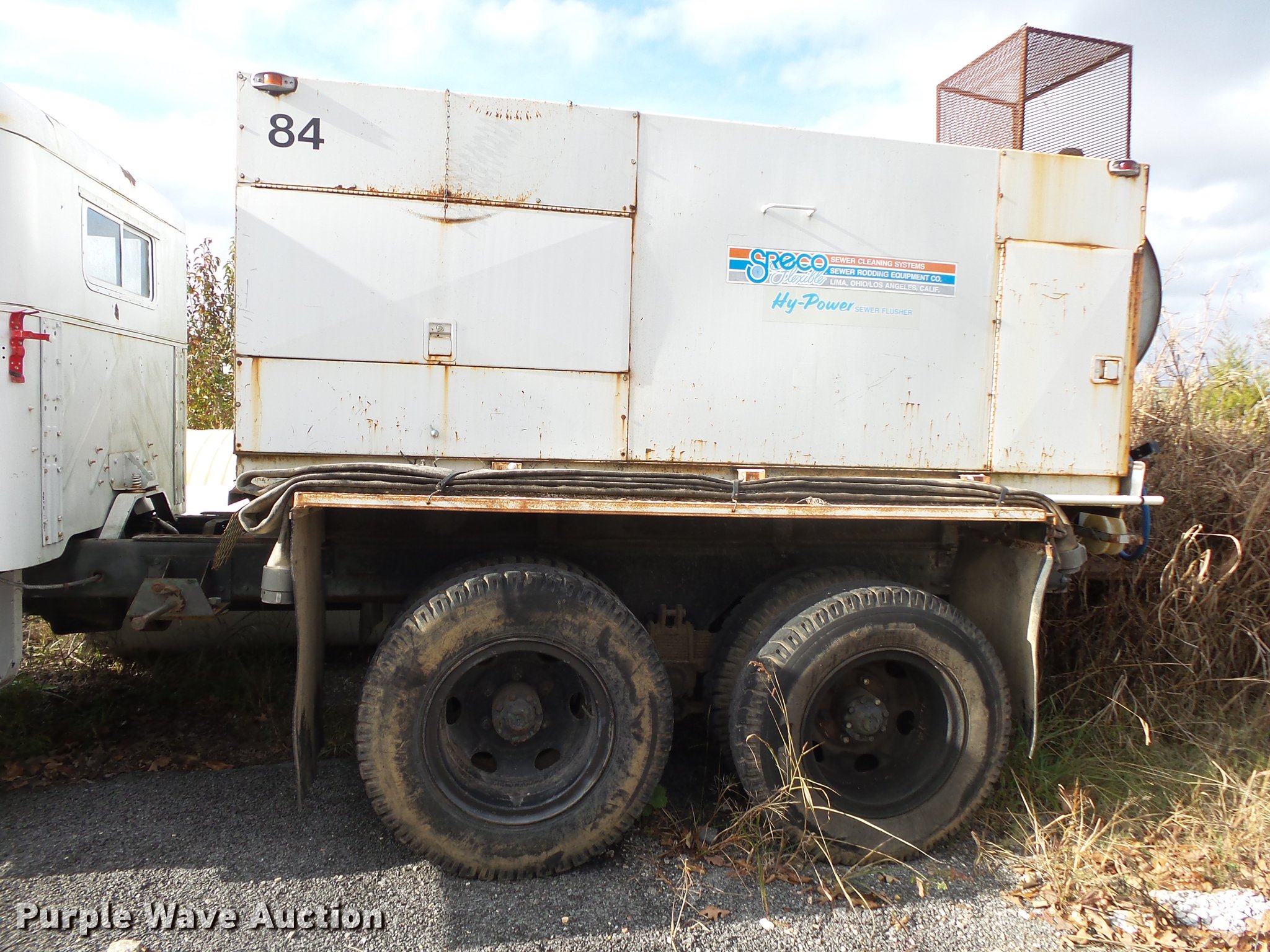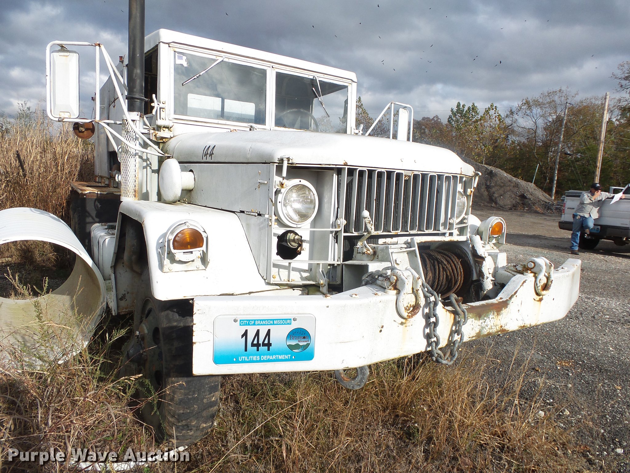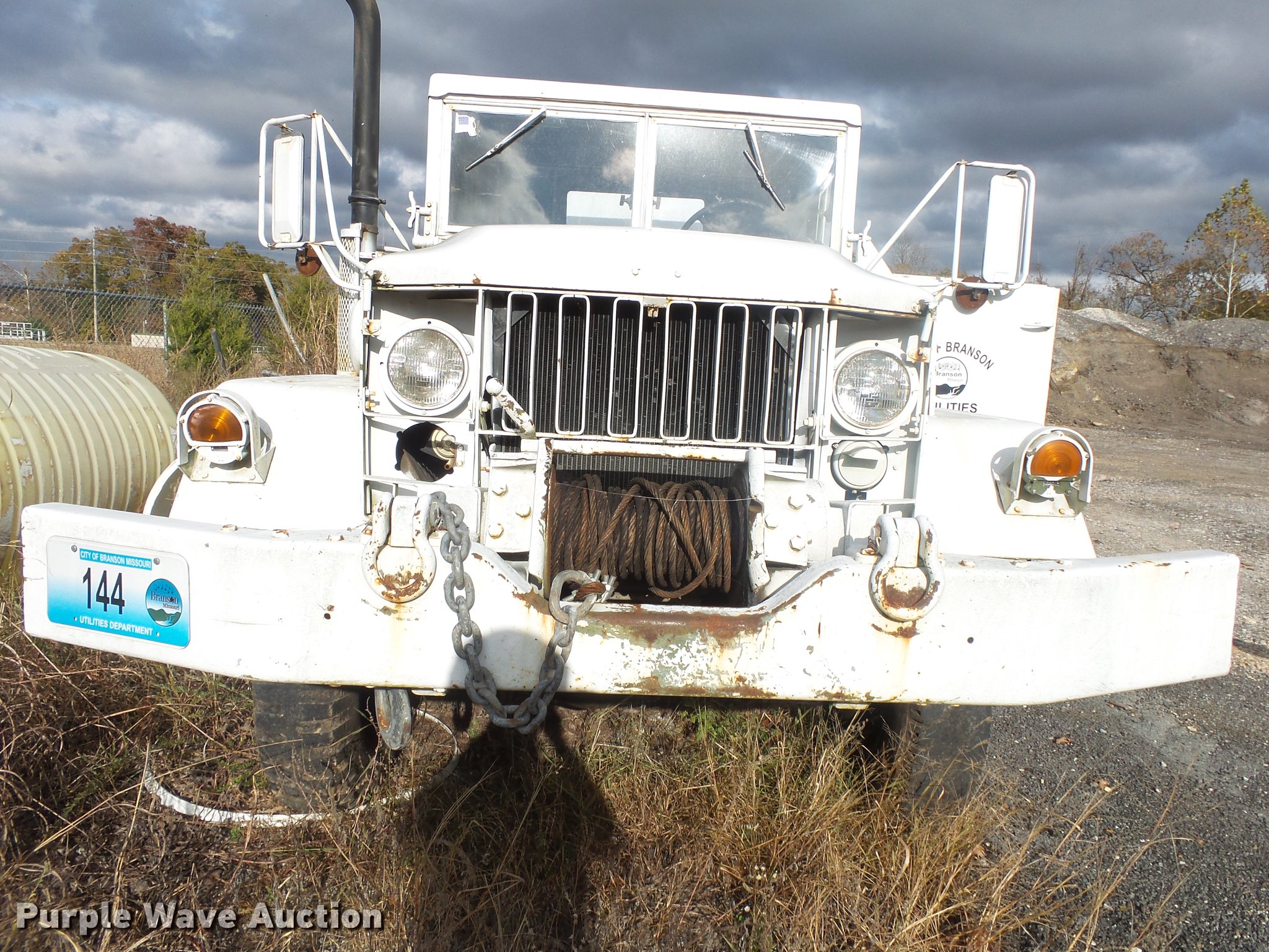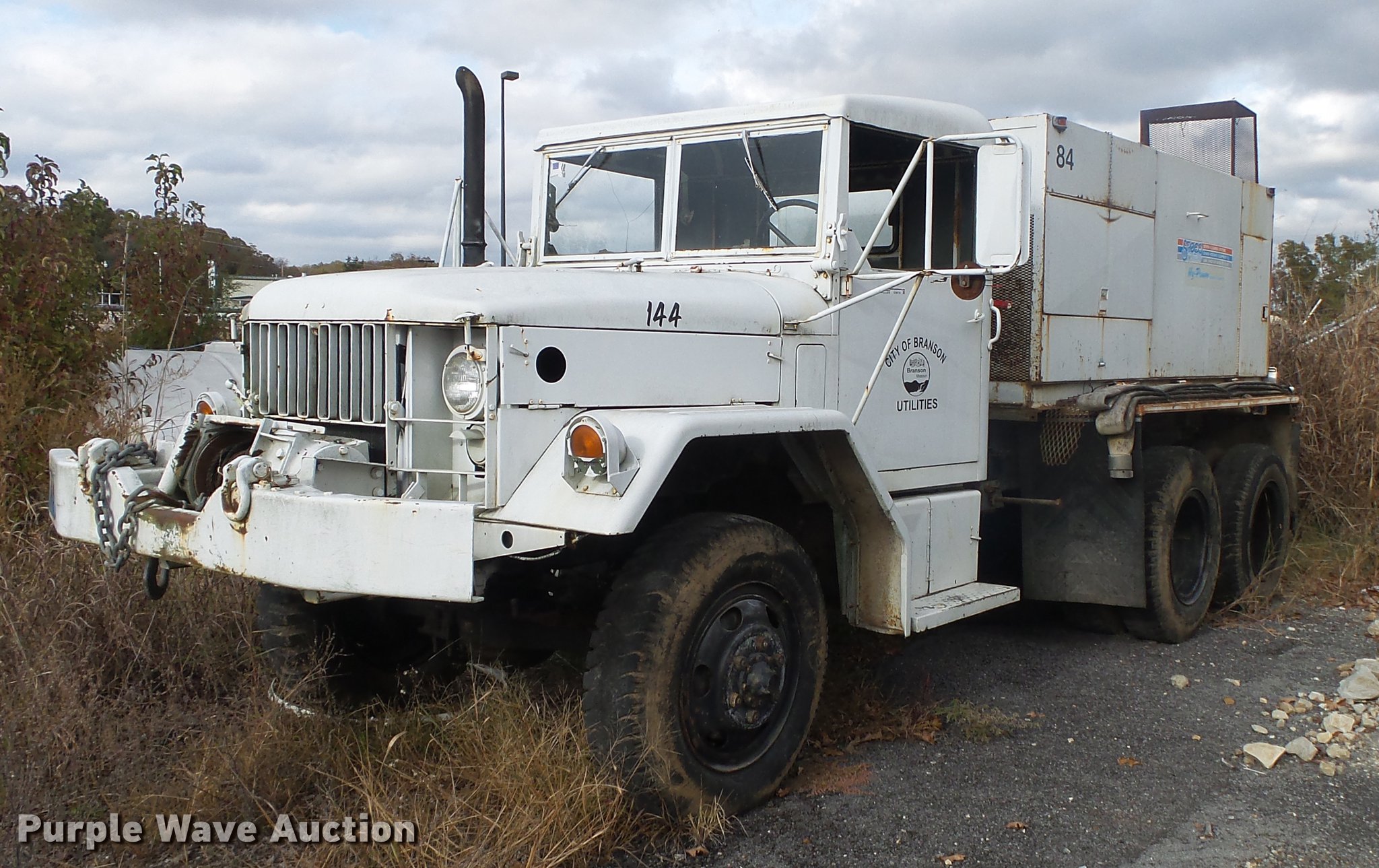 Purple Wave is selling a used Vacuum Truck in Missouri. This item is a 1967 Kaiser M44 sewer rodding truck with the following: 7,912 miles on odometer, 1,092 hours on meter, Six cylinder turbo gas engine, Five speed manual transmission, Tandem axle, Rear work lights, Front tow hooks, Front mounted winch, 20 ton capacity, Flusher pump unit, Four cylinder gas engine, 1990 Sreco pump, 1,251 hours on meter, 200 gallon holding tank, Model 1HV1800TR, Hose, Reel, Single fuel tank, Spring suspension, Hydraulic brakes, 9.00-20 tires, Non-operational flusher pump, Windshield cracked, Driver's side window missing, Unit# 144