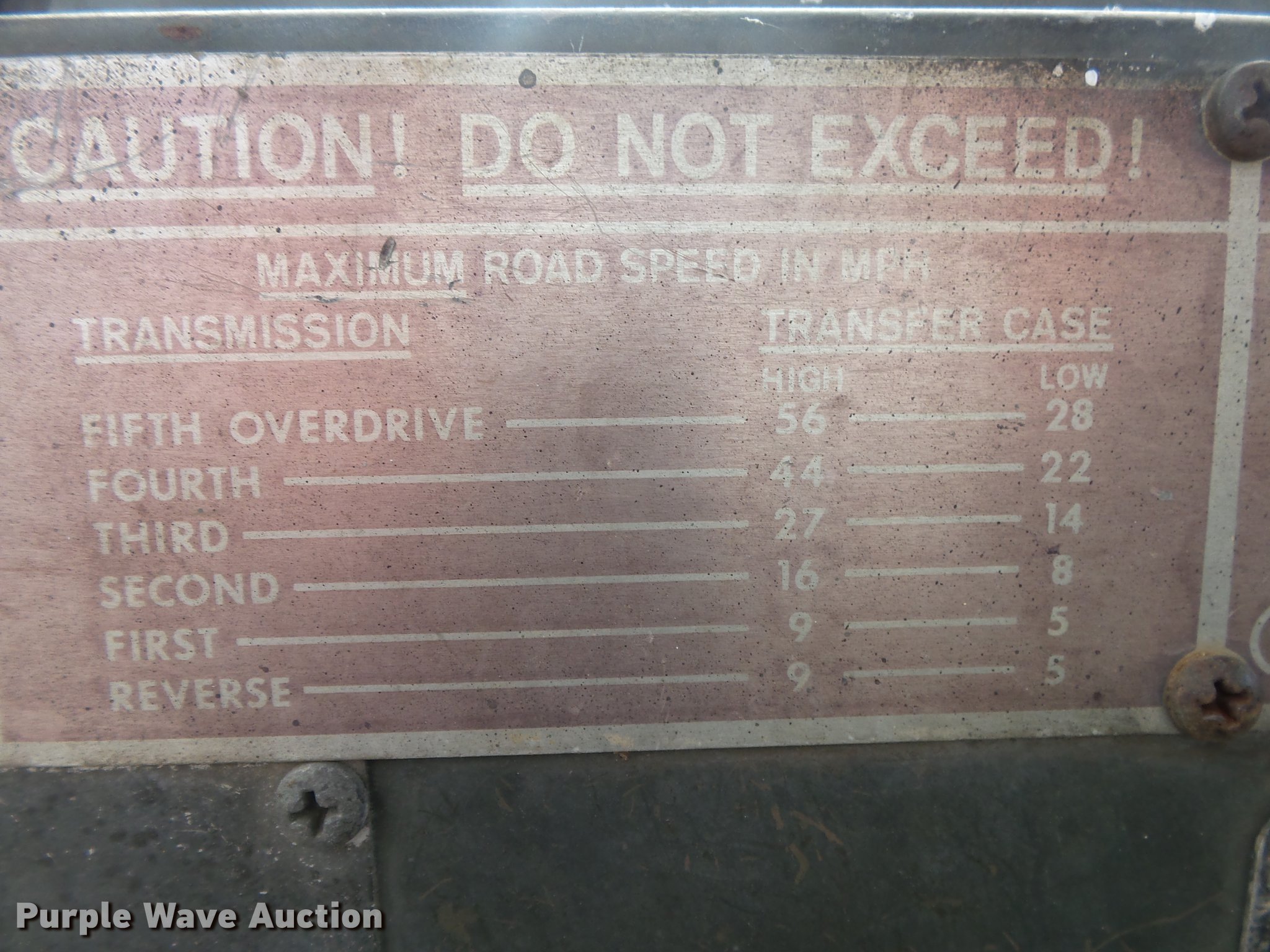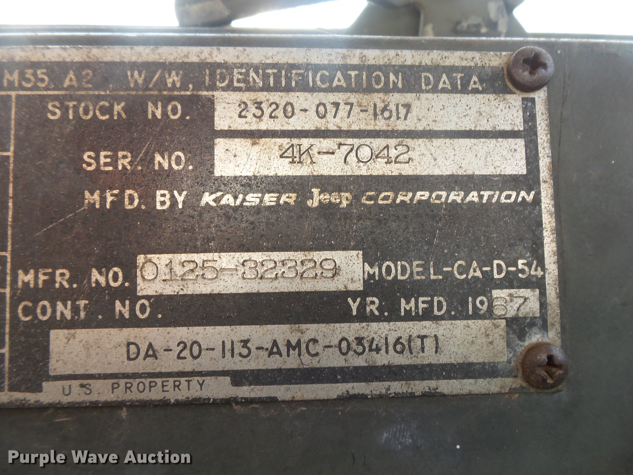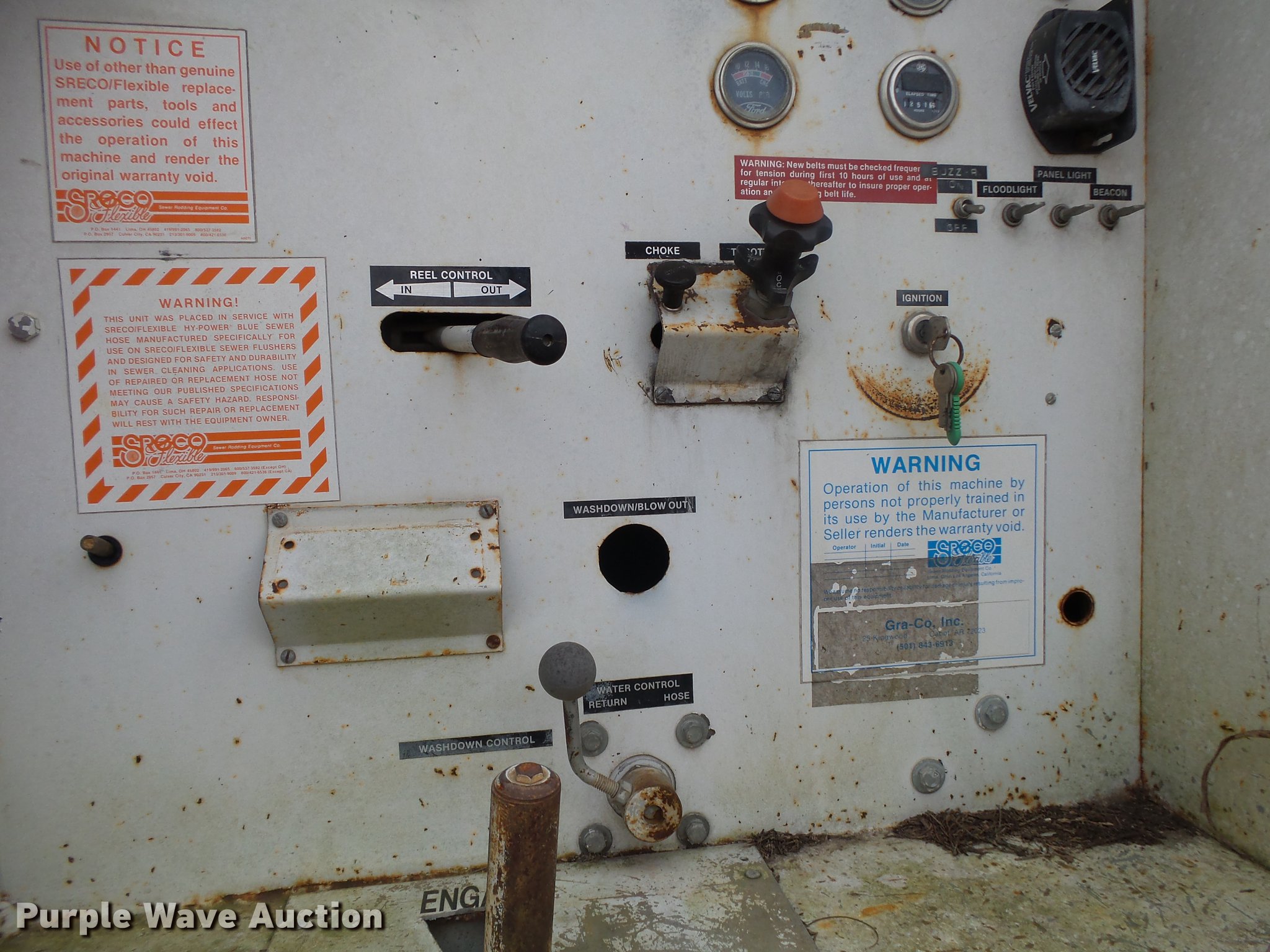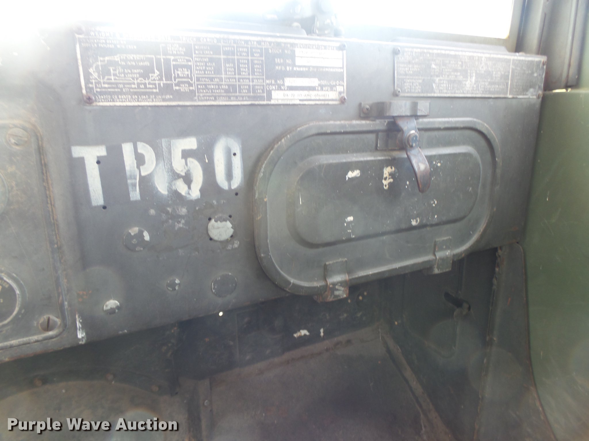 Purple Wave is selling a used Vacuum Truck in Missouri. This item is a 1967 Kaiser M44 sewer rodding truck with the following: 7,912 miles on odometer, 1,092 hours on meter, Six cylinder turbo gas engine, Five speed manual transmission, Tandem axle, Rear work lights, Front tow hooks, Front mounted winch, 20 ton capacity, Flusher pump unit, Four cylinder gas engine, 1990 Sreco pump, 1,251 hours on meter, 200 gallon holding tank, Model 1HV1800TR, Hose, Reel, Single fuel tank, Spring suspension, Hydraulic brakes, 9.00-20 tires, Non-operational flusher pump, Windshield cracked, Driver's side window missing, Unit# 144