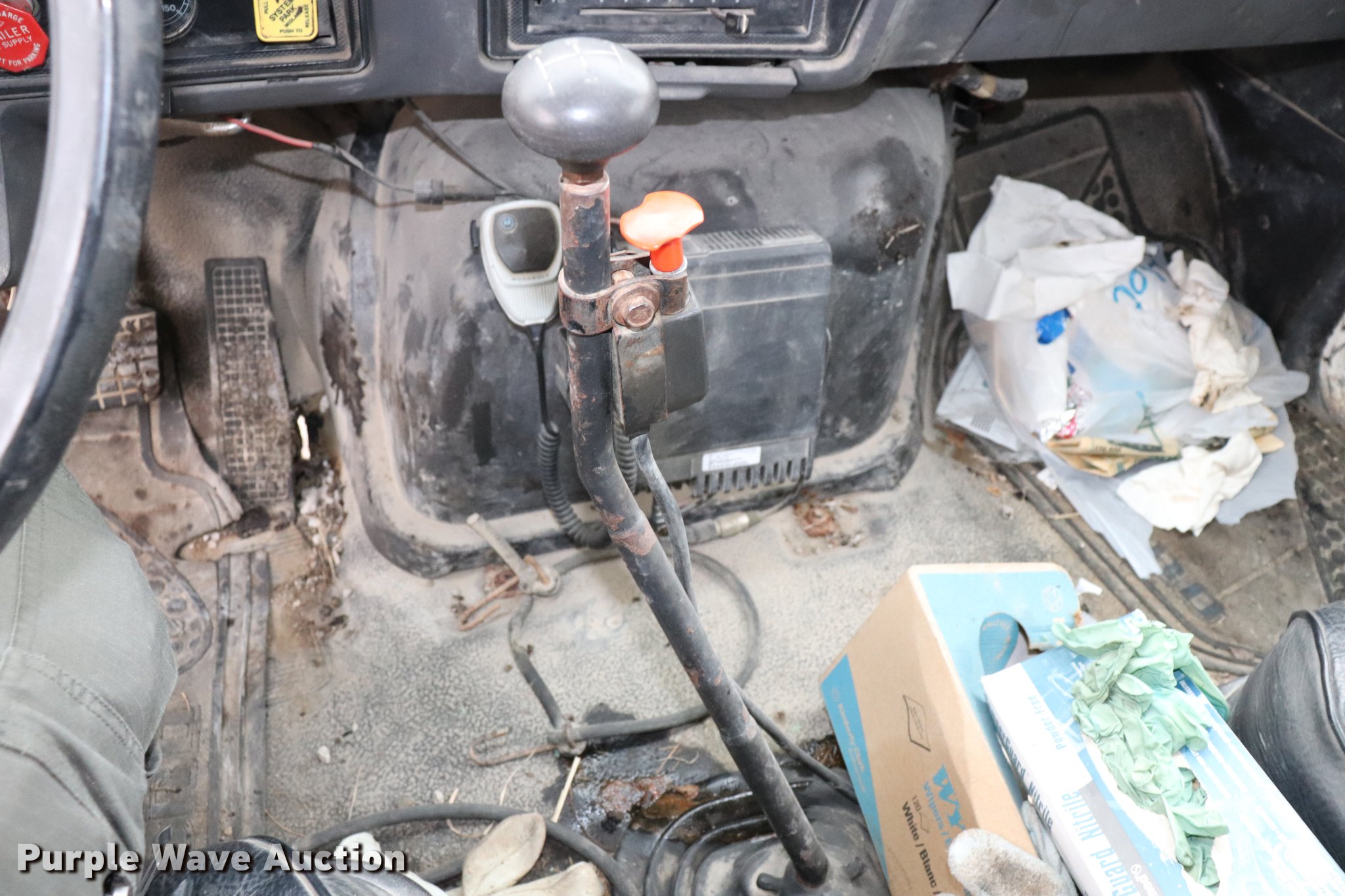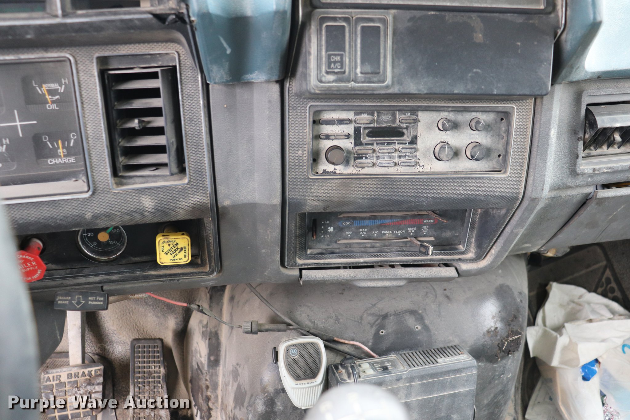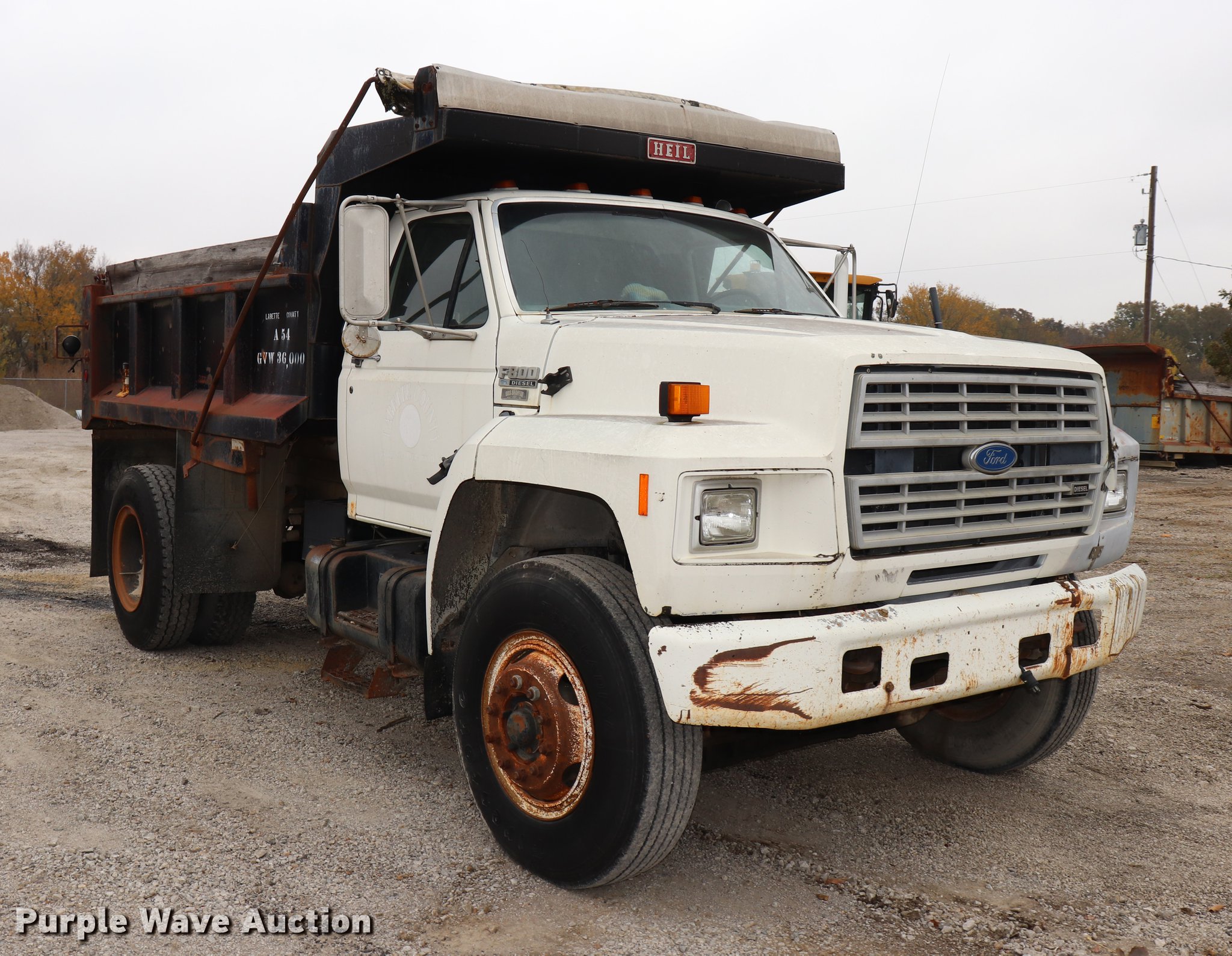 Purple Wave is selling a used Construction Dump Truck in Kansas. This item is a 1994 Ford F800 dump truck with the following: 158,391 miles on odometer, Cummins ISC 8.3L L6 diesel engine, Five speed manual transmission, Single axle, AC and heat, AM/FM, Suspension seat, Block heater, PTO, Heil SLT5YD10 steel dump bed, 128"L x 96"W, 28" side height, 7" side board height, Roll tarp, Manual end gate, Single ram hoist, Dual fuel tanks, Pintle hitch, Spring suspensin, Air brakes, 156" wheelbase, 10.00R20 tires, GVWR 31,500 lbs, Crafco unit and two-way radio not included, Unit# A54