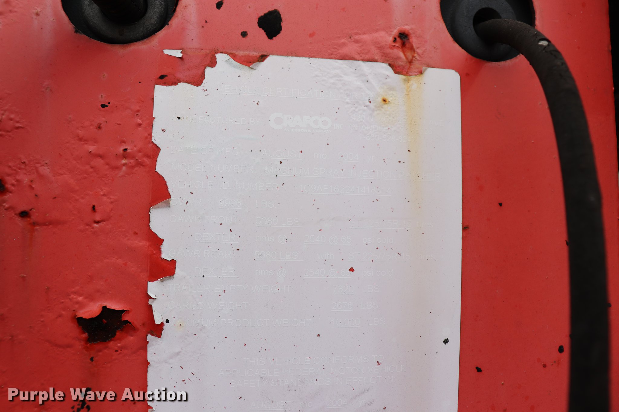 2004 Crafco pot hole patcher. 1,095 hours on meter, Four cylinder diesel engine, Hydraulic drive, Warning lights, Pintle hitch, Single leg landing gear, 225/75R15 tires, Unit# AP-1. Kansas title. 1C9AF162241418314. Labette County. 901 S Huston St. Altamont, KS 67330