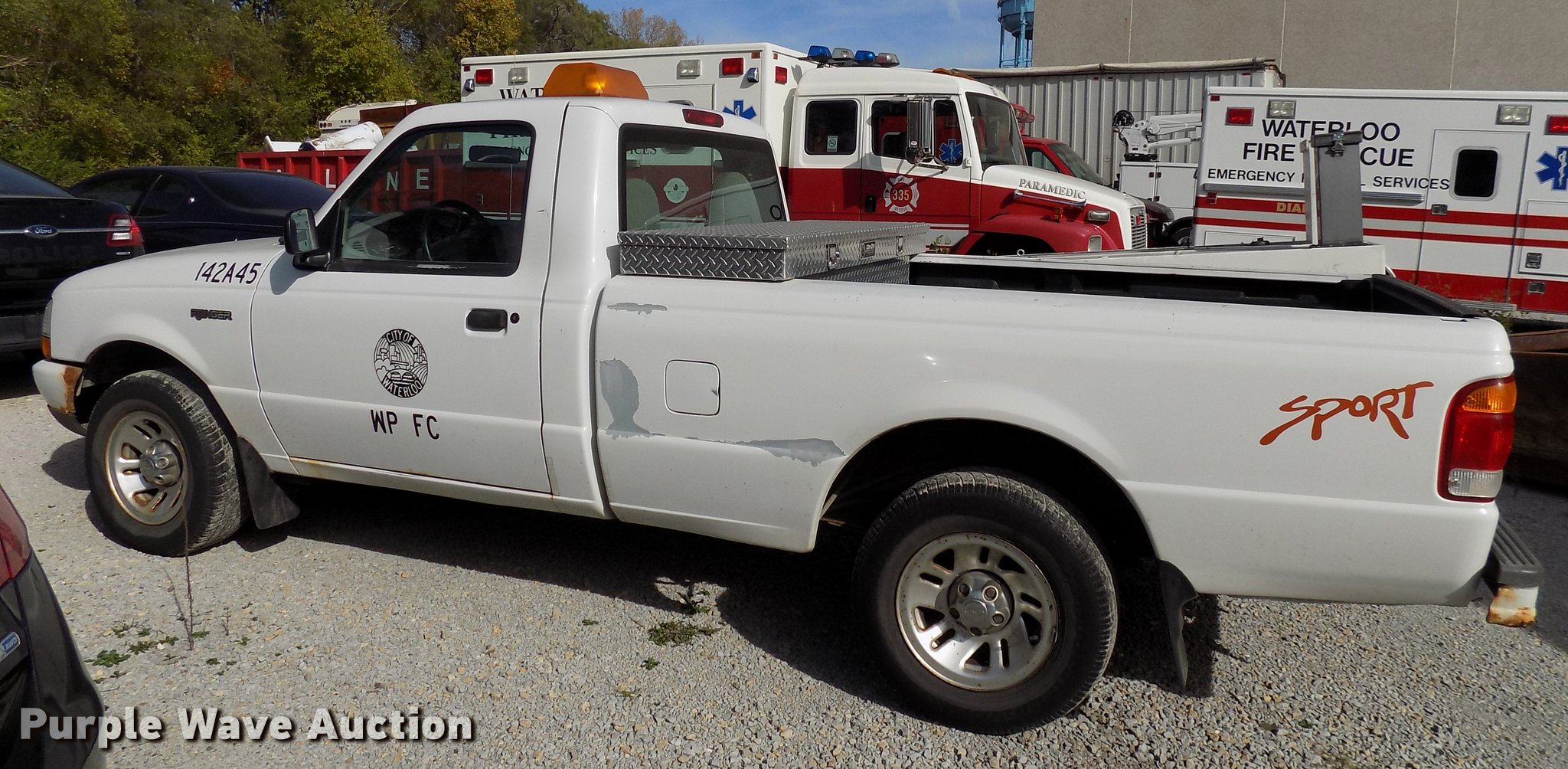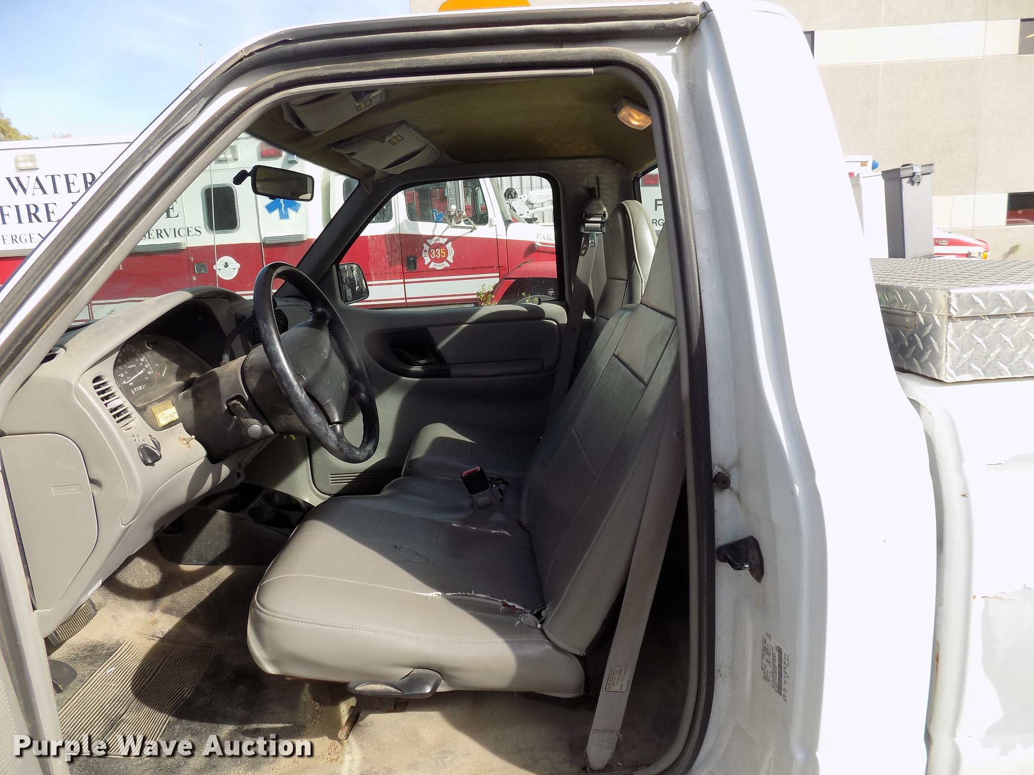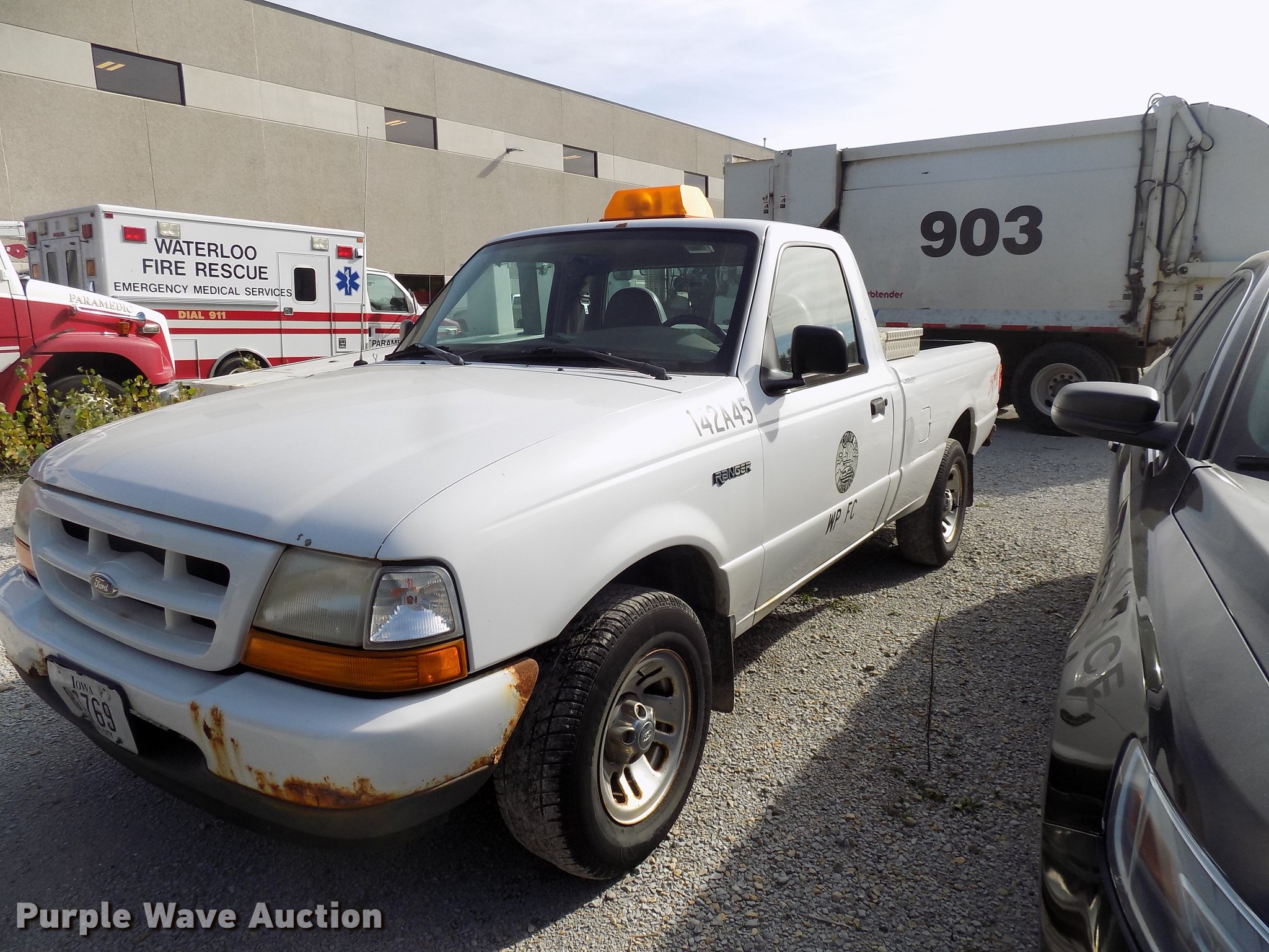 Purple Wave is selling a used Compact Pickup or Van in Iowa. This item is a 1999 Ford Ranger pickup truck with the following: 46,662 miles on odometer, 2.5L L4 SOHC 8V gas engine, Automatic transmission, Heat, AM/FM, Manual windows and locks, Beacon light, Toolbox, Bumper ball hitch, 245/55R18 tires