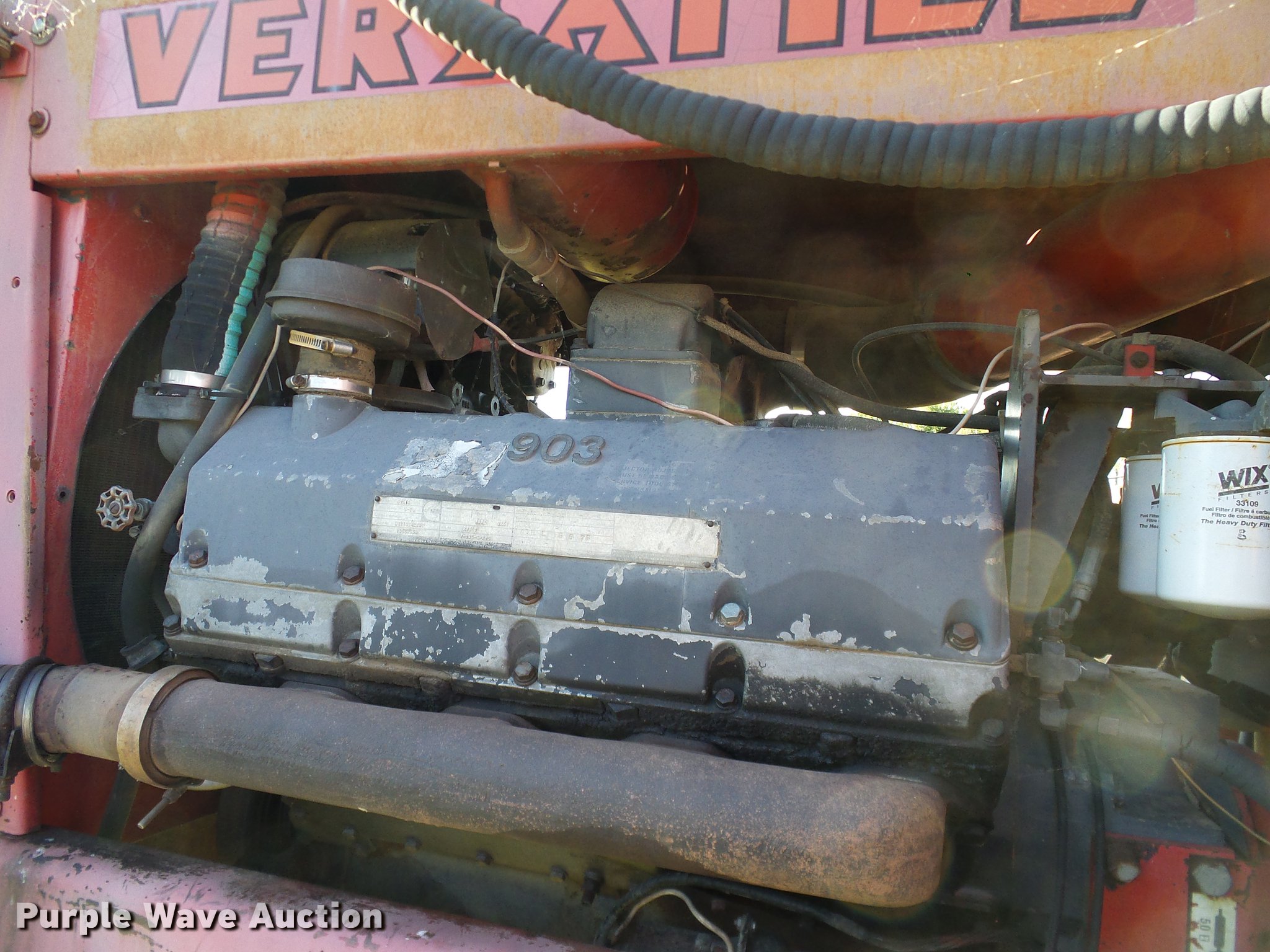 Purple Wave is selling a used Articulated 4-Wheel Drive Tractor in Oklahoma. This item is a 1976 Versatile 900 Series II 4WD tractor with the following: 6,043 hours on meter, Cummins V-903-C295 903 C.I.D. eight cylinder diesel engine, Serial 10552038, Manual transmission, 12F-4R gears, AC and heat, AM/FM, Suspension seat, (3) rear hydraulic remotes, 18.4-38 dual tires, Interior door handle needs to be repaired, Weak battery, Ignition needs to be repaired, Serial 071117