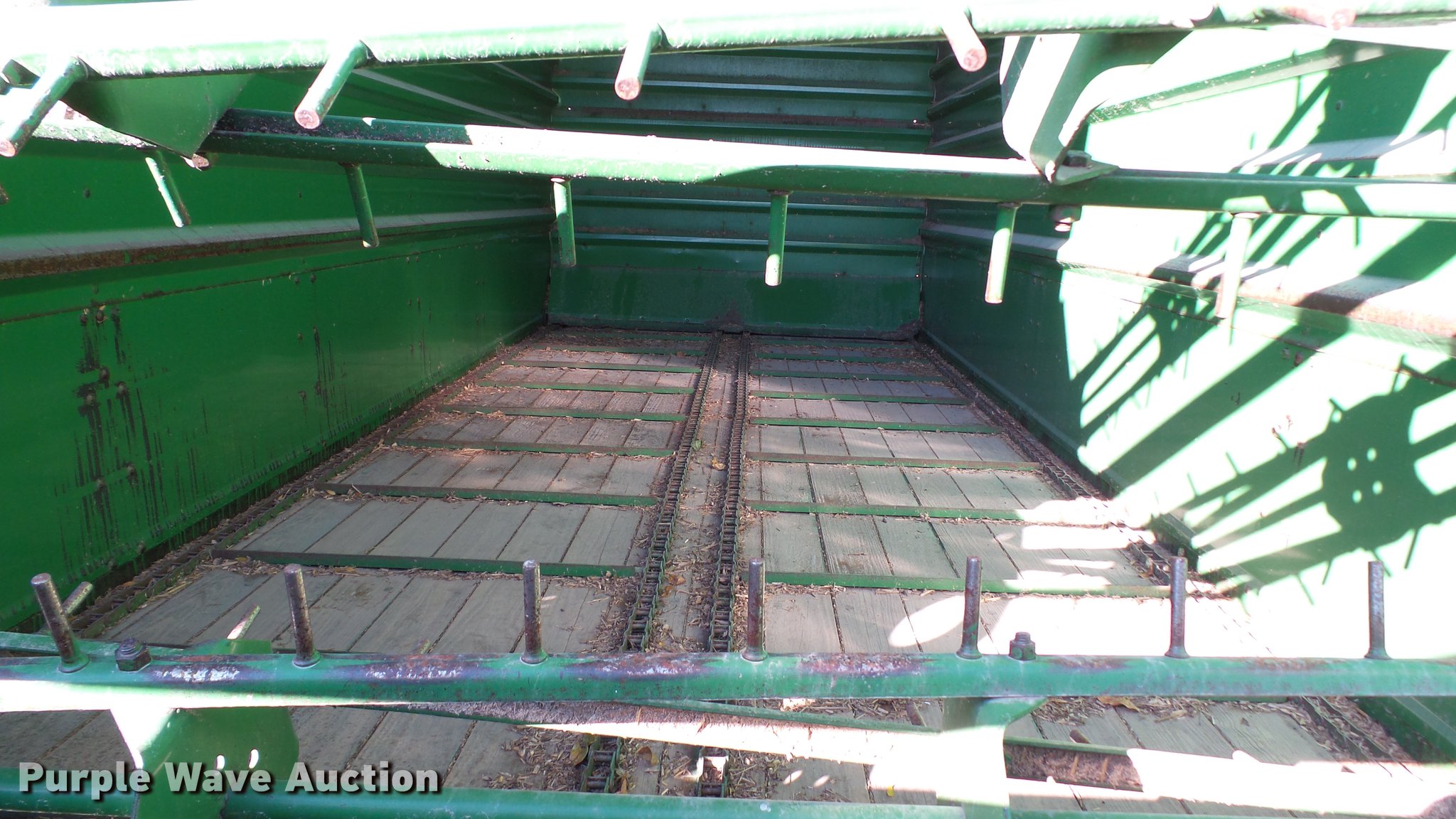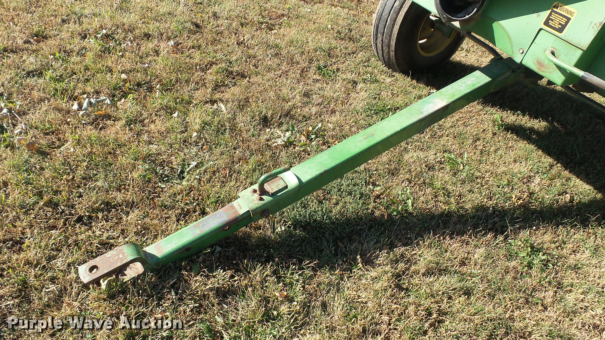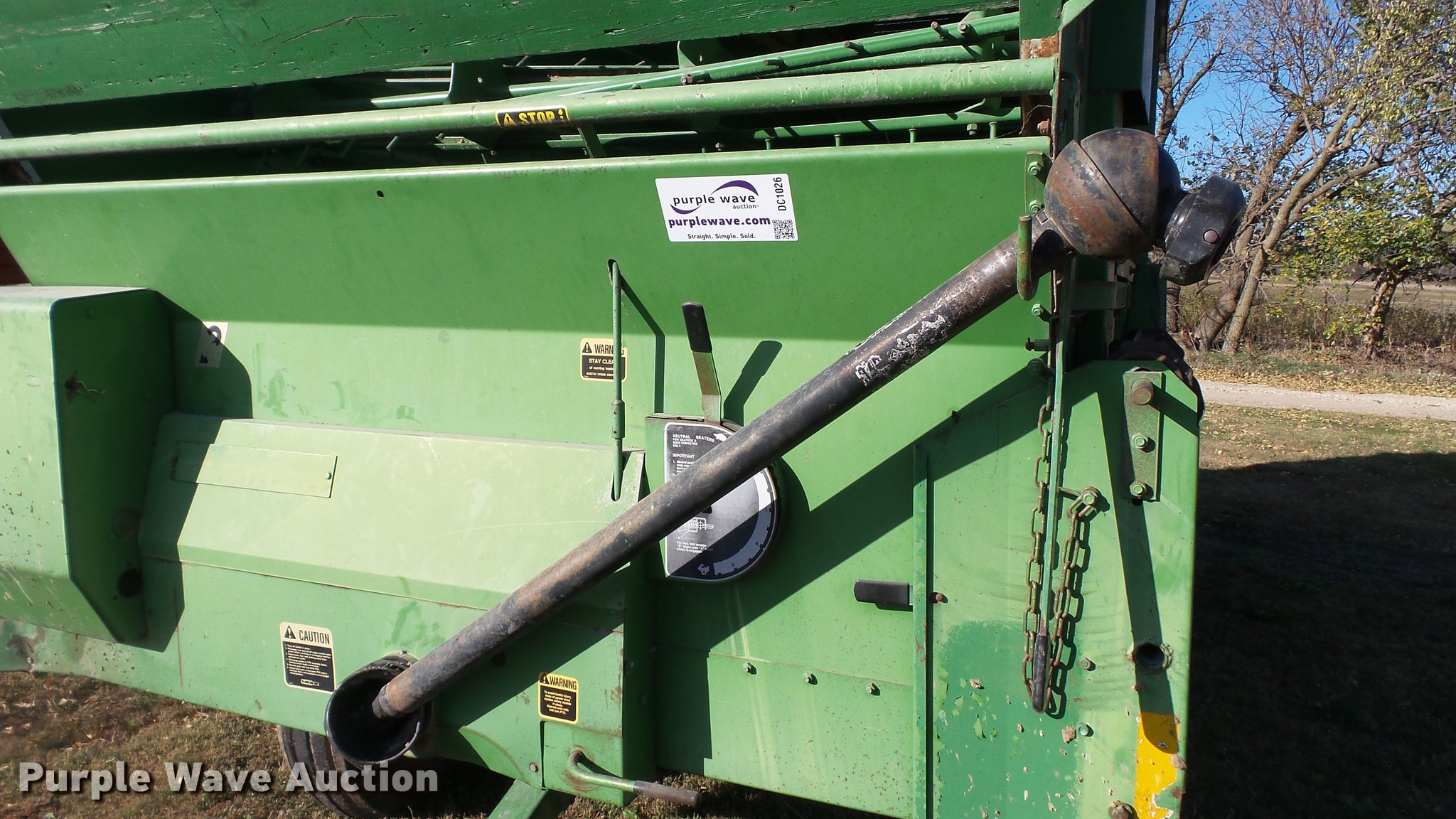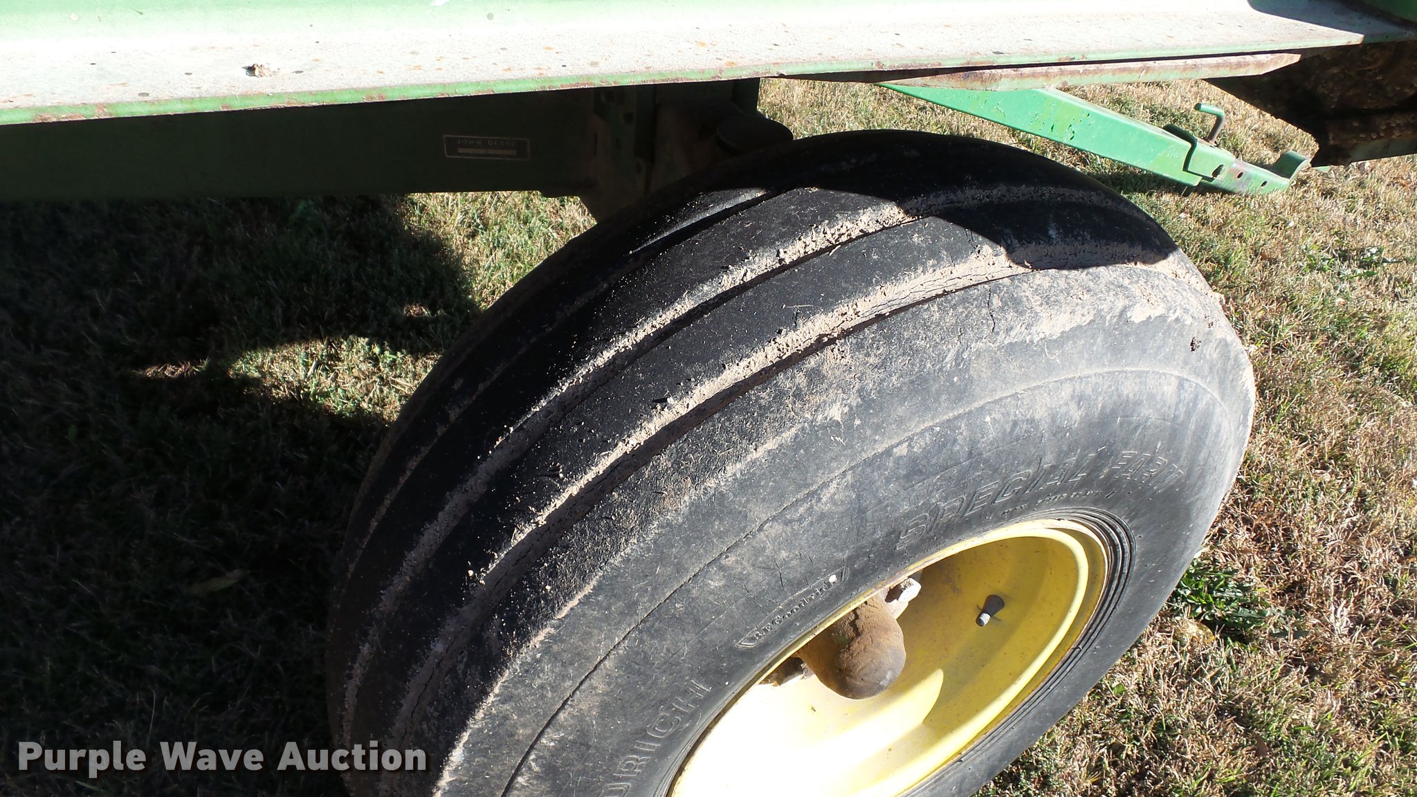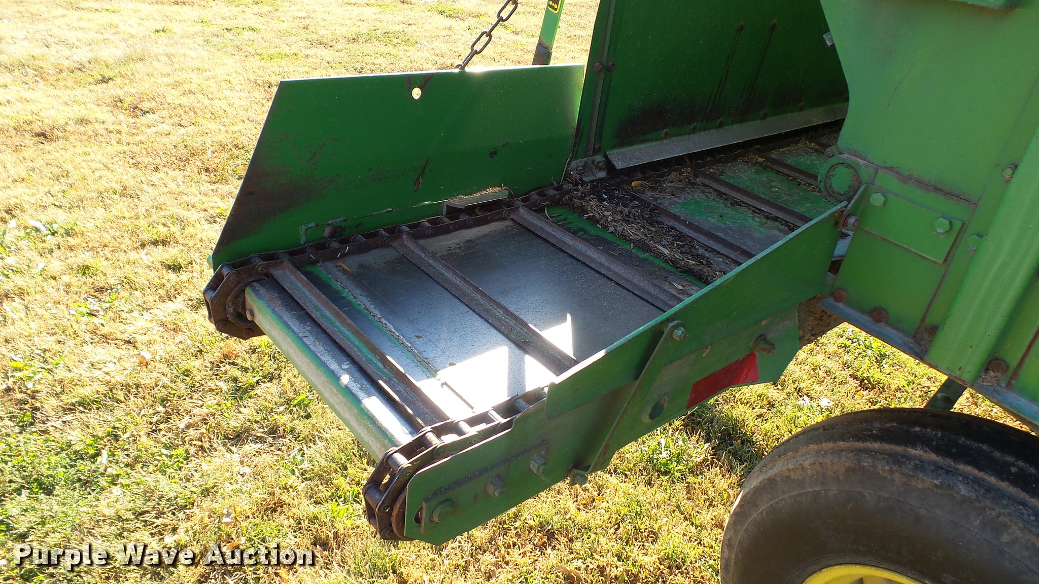 Purple Wave is selling a used Forage Head or Silage Handling in Kansas. This item is a John Deere 716A forage wagon with the following: 18'L x 7'W, Fold down discharge chute, Variable conveyor/beater speed control, 540 PTO, Pin hitch, Extendable tongue, Walking beam suspension, John Deere 1275 running gear, Serial 010011W, 10.00-15 tires