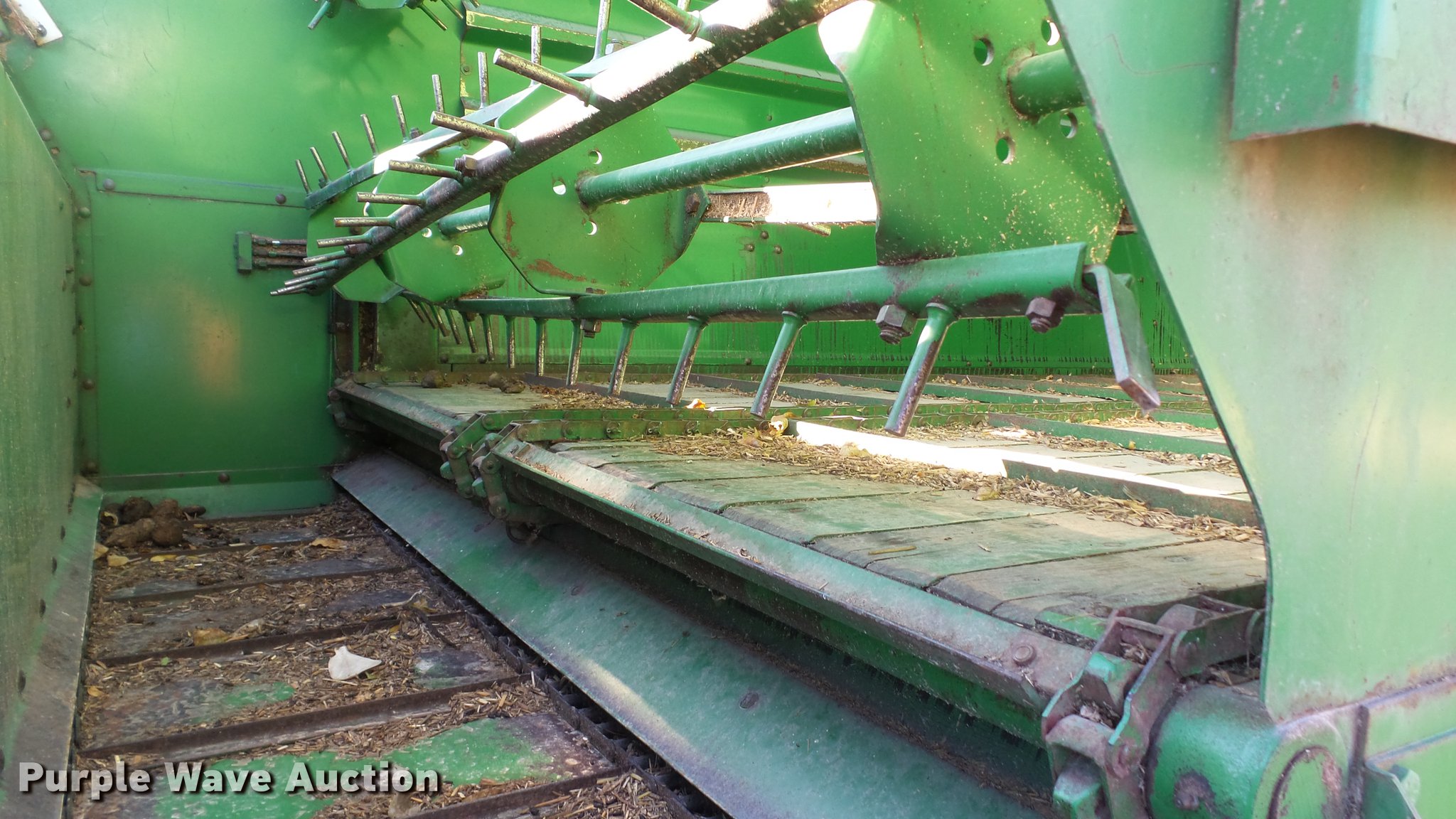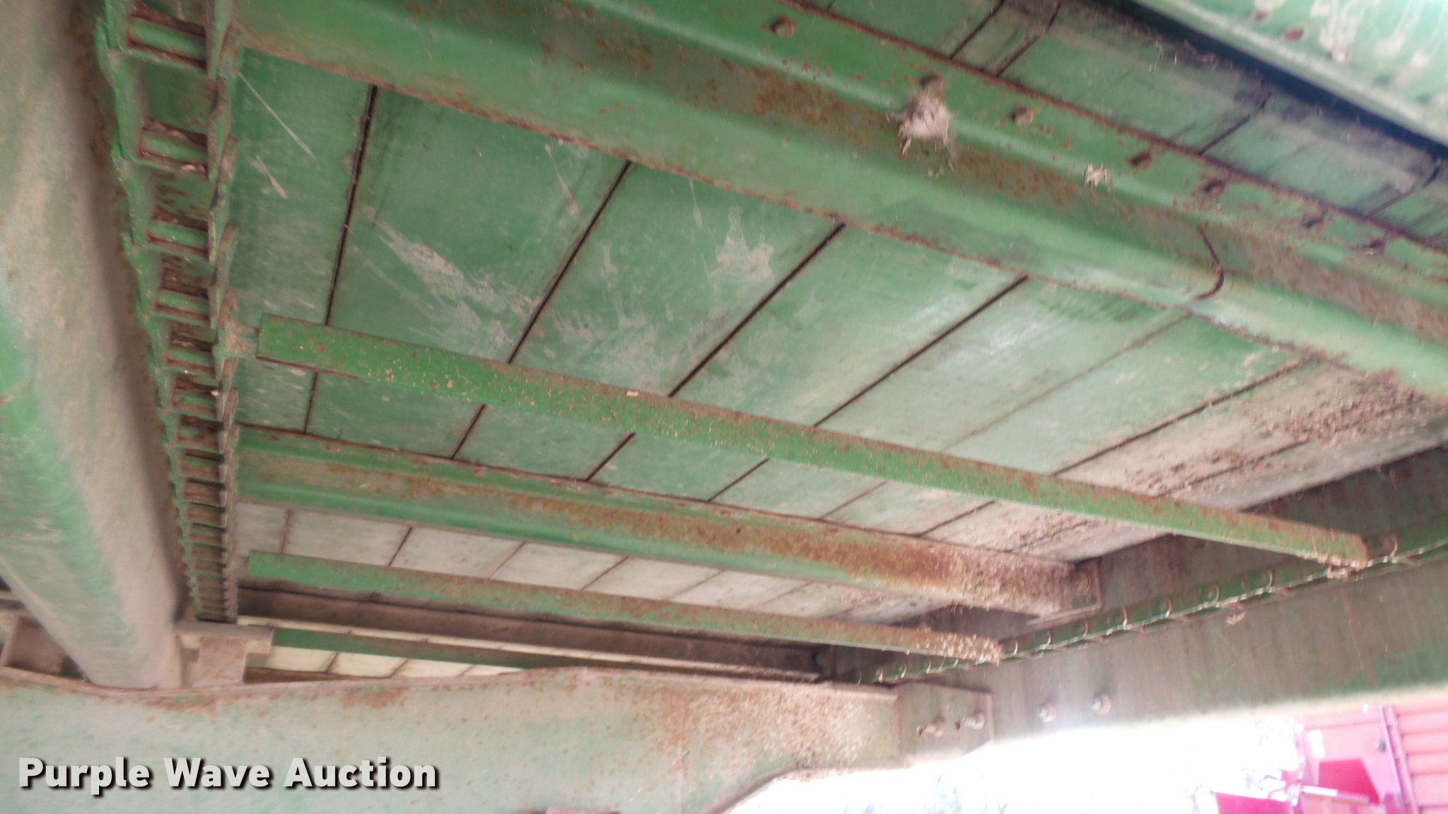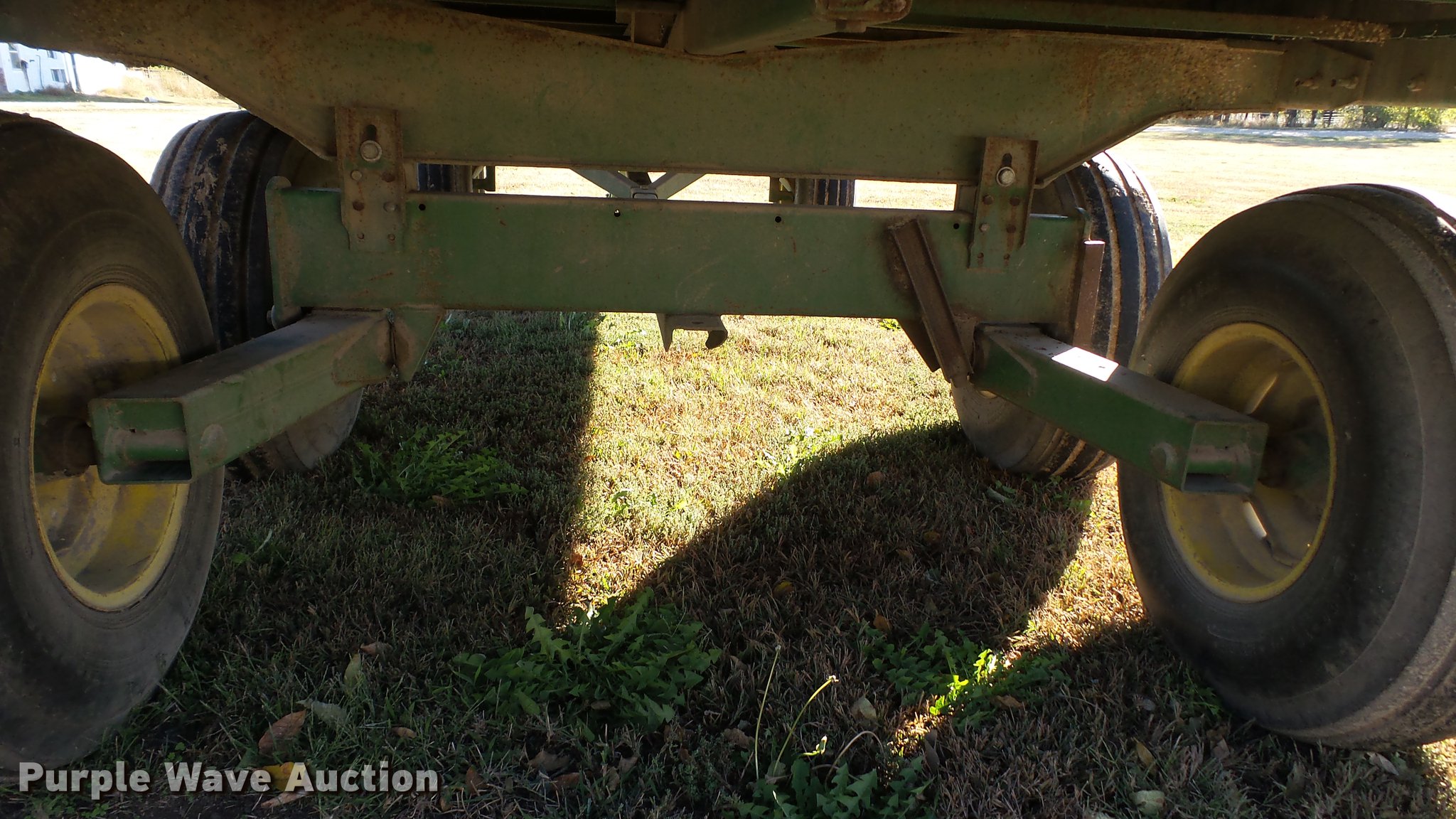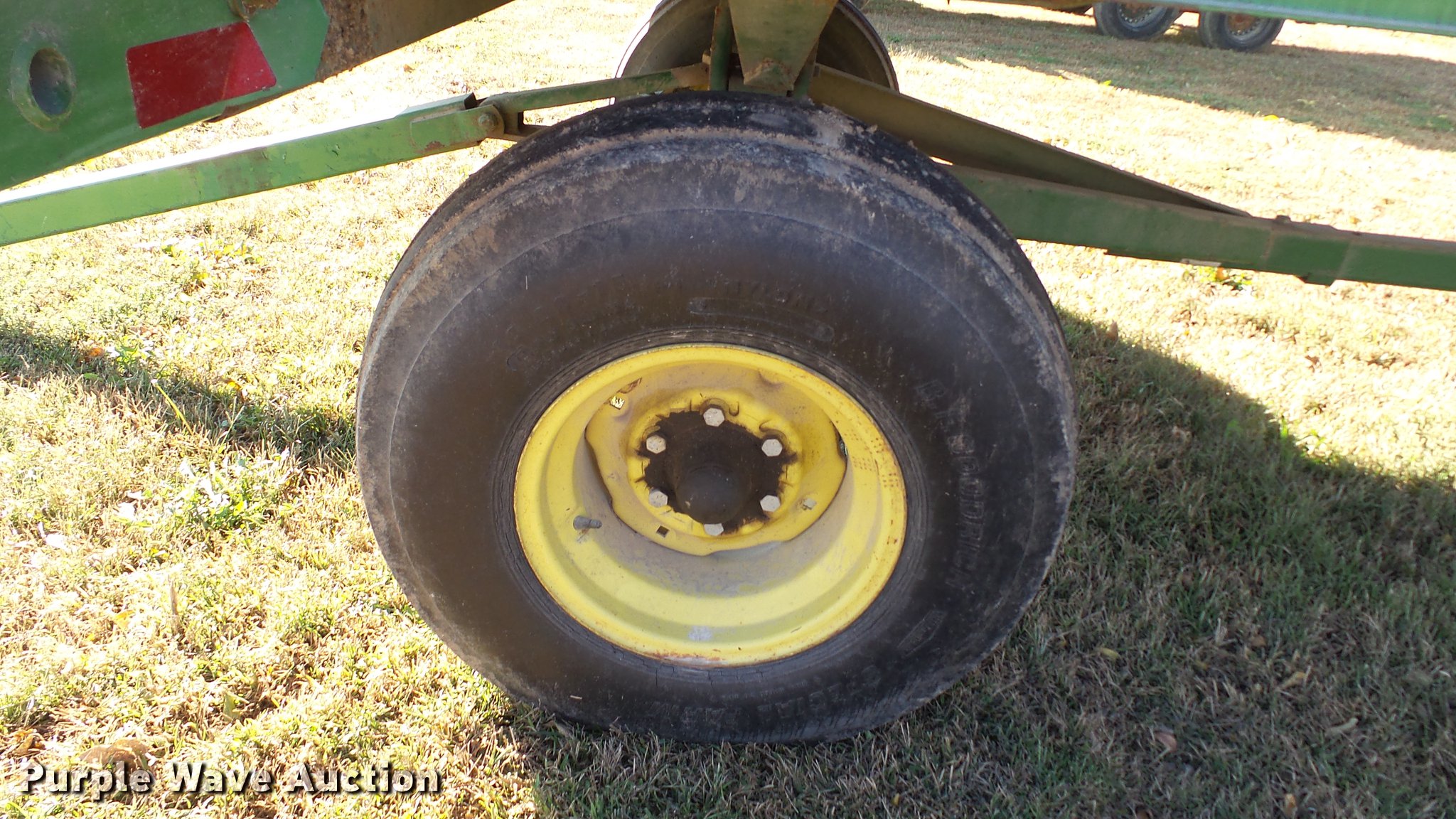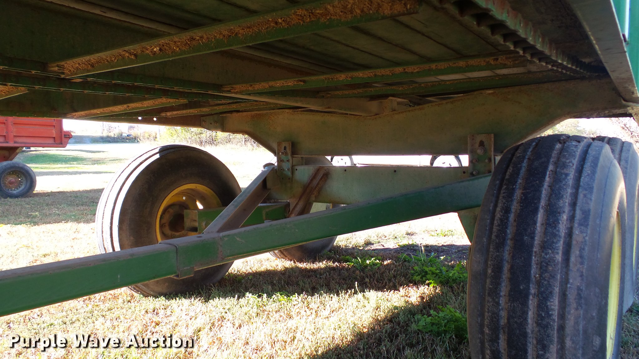 Purple Wave is selling a used Forage Head or Silage Handling in Kansas. This item is a John Deere 716A forage wagon with the following: 18'L x 7'W, Fold down discharge chute, Variable conveyor/beater speed control, 540 PTO, Pin hitch, Extendable tongue, Walking beam suspension, John Deere 1275 running gear, Serial 010011W, 10.00-15 tires