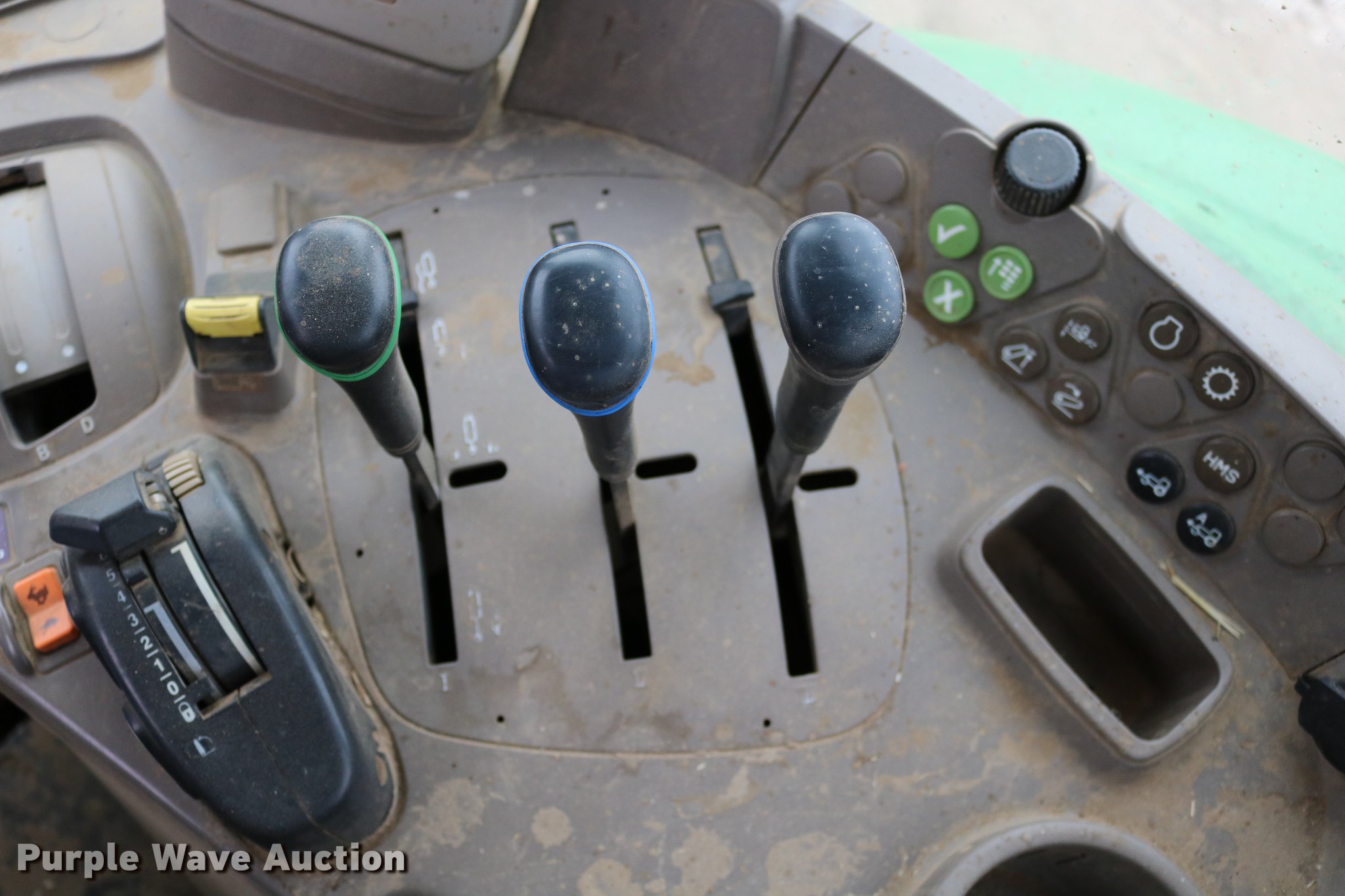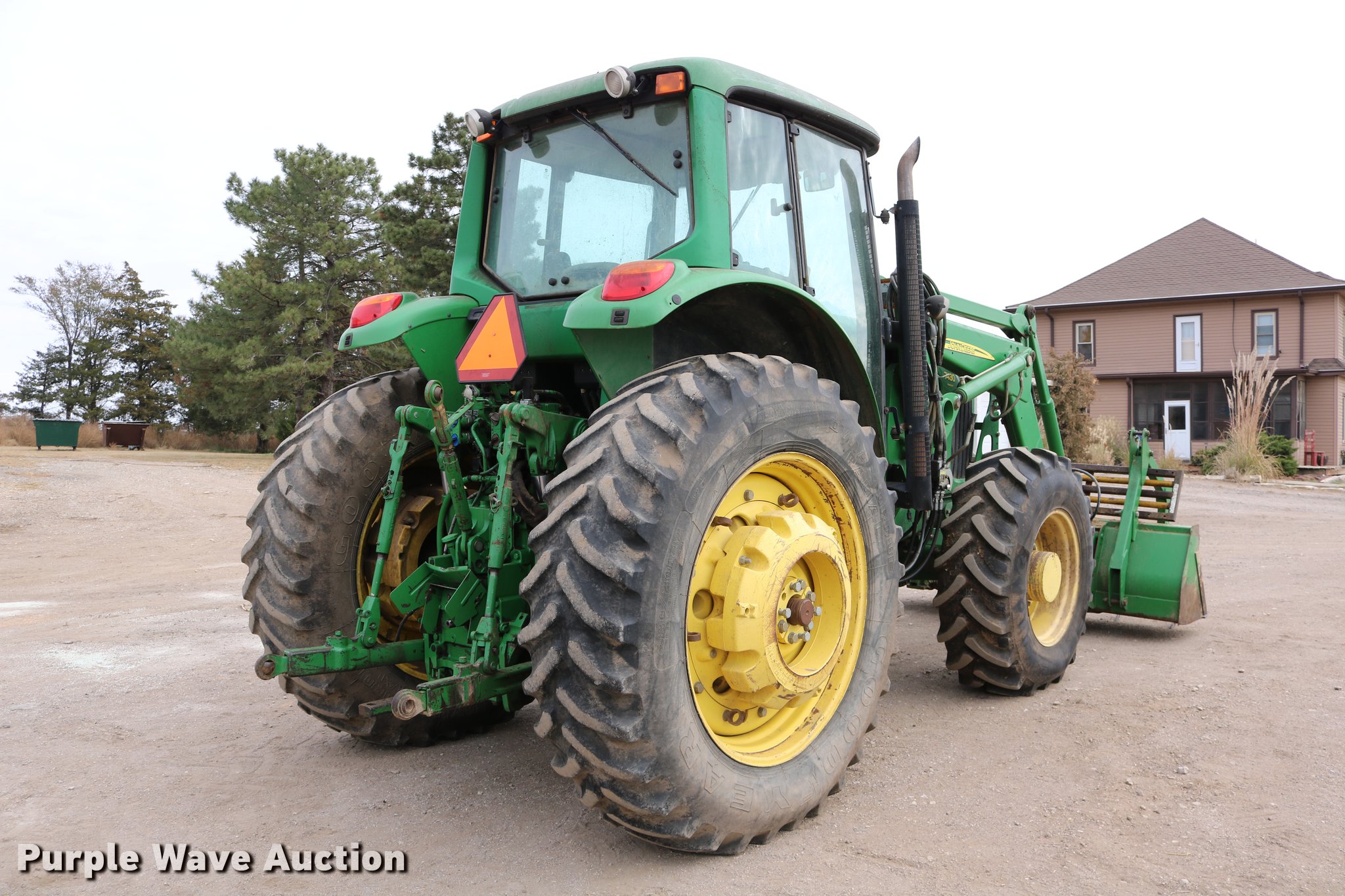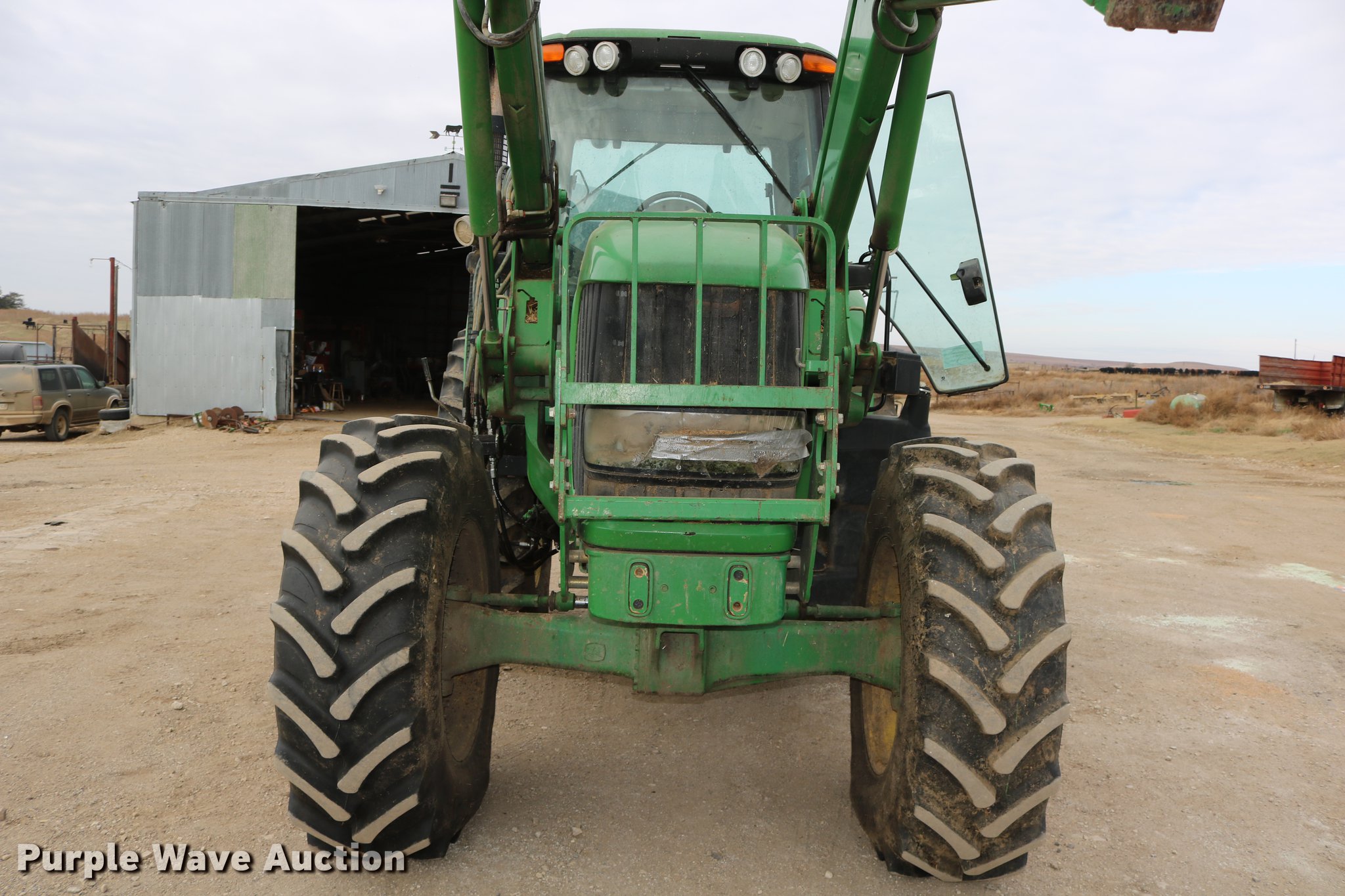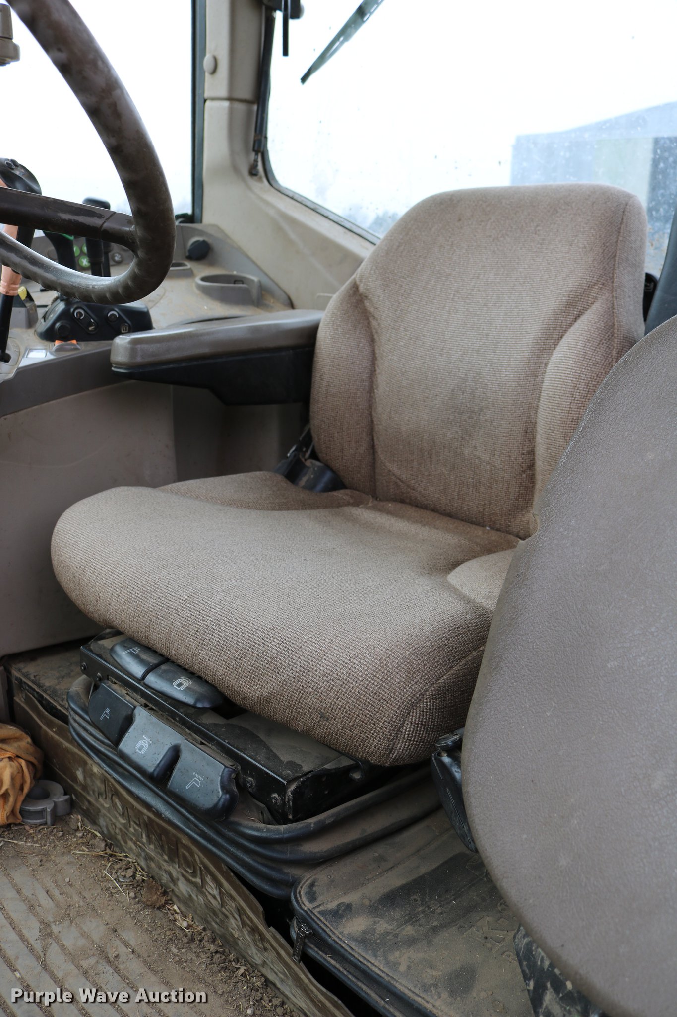 Purple Wave is selling a used Tractor in Kansas. This item is a John Deere 7430 MFWD tractor with the following: 6,717 hours on meter, John Deere 6068HRW77 six cylinder turbo diesel engine, Serial PE6068L045192, Quad-Range transmission, 16F-16R gears, Differential lock, AC and heat, Non-operational heat, Tilt steering wheel, AM/FM, Air suspension seat, Instructor's seat, Visor, Block heater, John Deere 741 loader, 97.5"W bucket, Five tine hydraulic grapple, Quick attach, Self-leveling, Joystick controls, Three point, Top link, Seven pin outlet, 540 PTO, (3) rear hydraulic remote sets, (6) wheel weights, Approx. 105" wheelbase, 16.9R23 front tires, 480/80R42 rear tires, Missing grapple hydraulic cylinder will be replaced prior to auction, Serial RW7430H006529