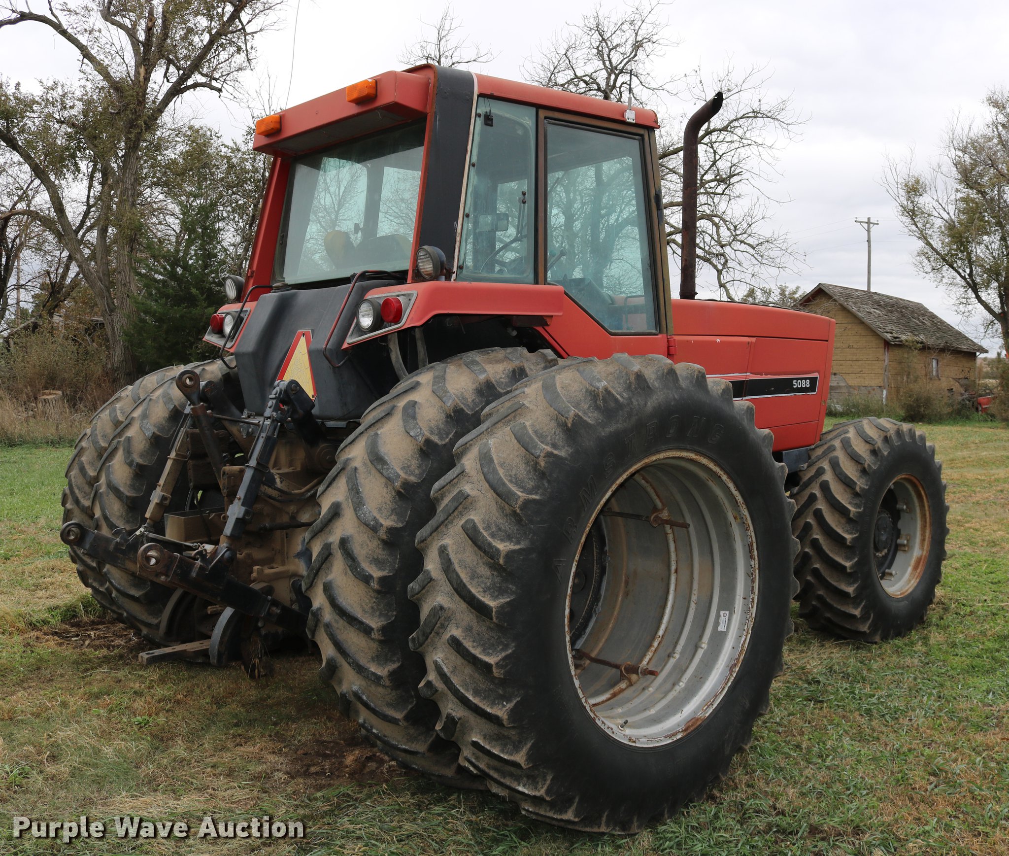 Purple Wave is selling a used Tractor in Kansas. This item is a 1984 International 5088 MFWD tractor with the following: 10,263 hours on meter, Six cylinder turbo diesel engine, Synchro transmission, 18F-6R gears, Differential lock, AC and heat, Tilt steering wheel, AM/FM, Air suspension seat, Visor, Block heater, Ether start, Three point, Top link, Seven pin outlet, 540/1000 PTO, (3) rear hydraulic remotes, (2) wheel weights, Approx. 116" wheelbase, 16.9-26 front tires, 18.4-38 dual rear tires, Serial 2540008U007343