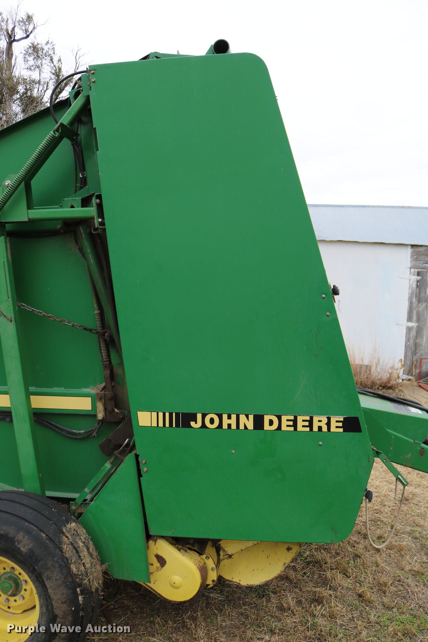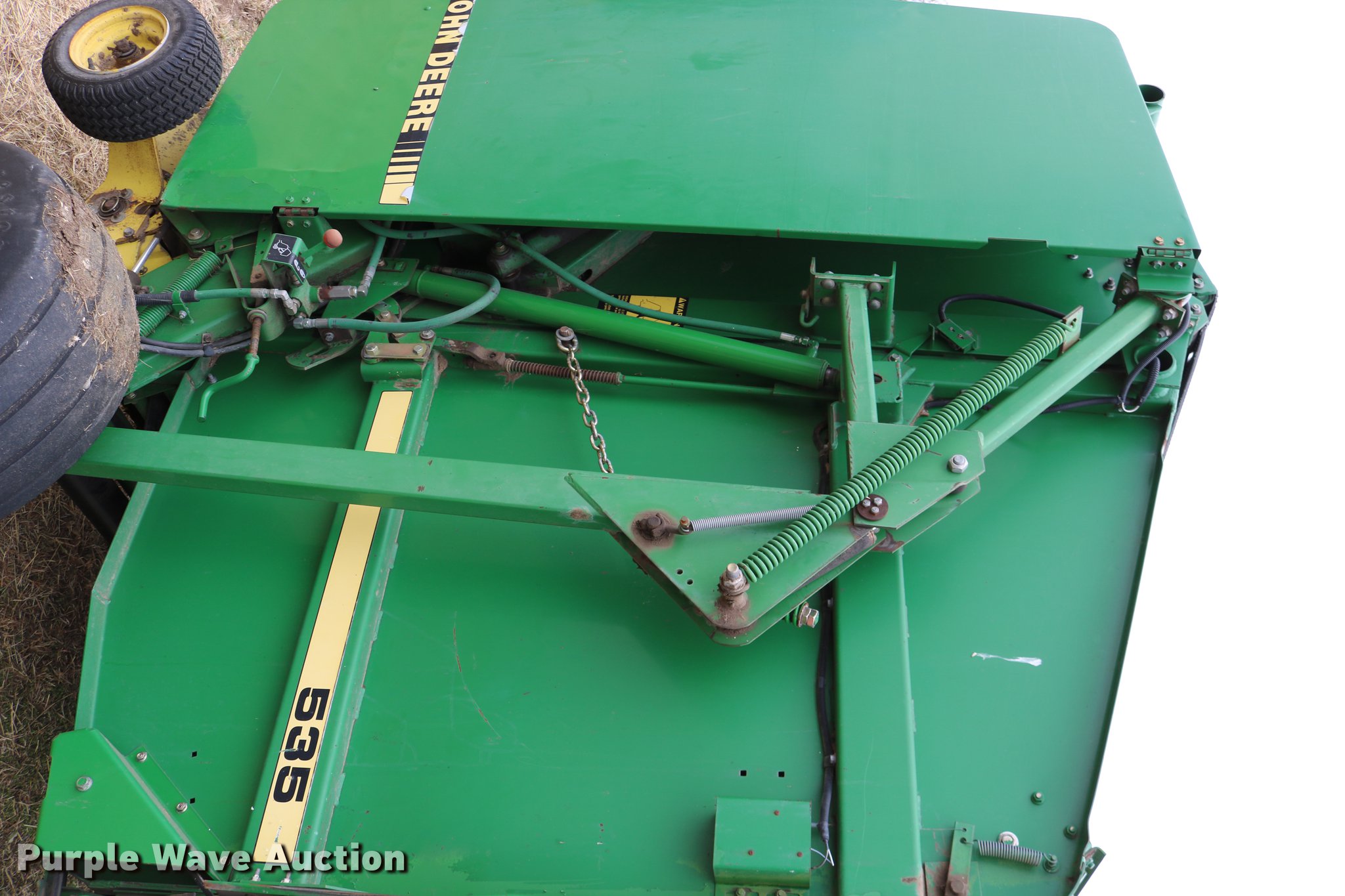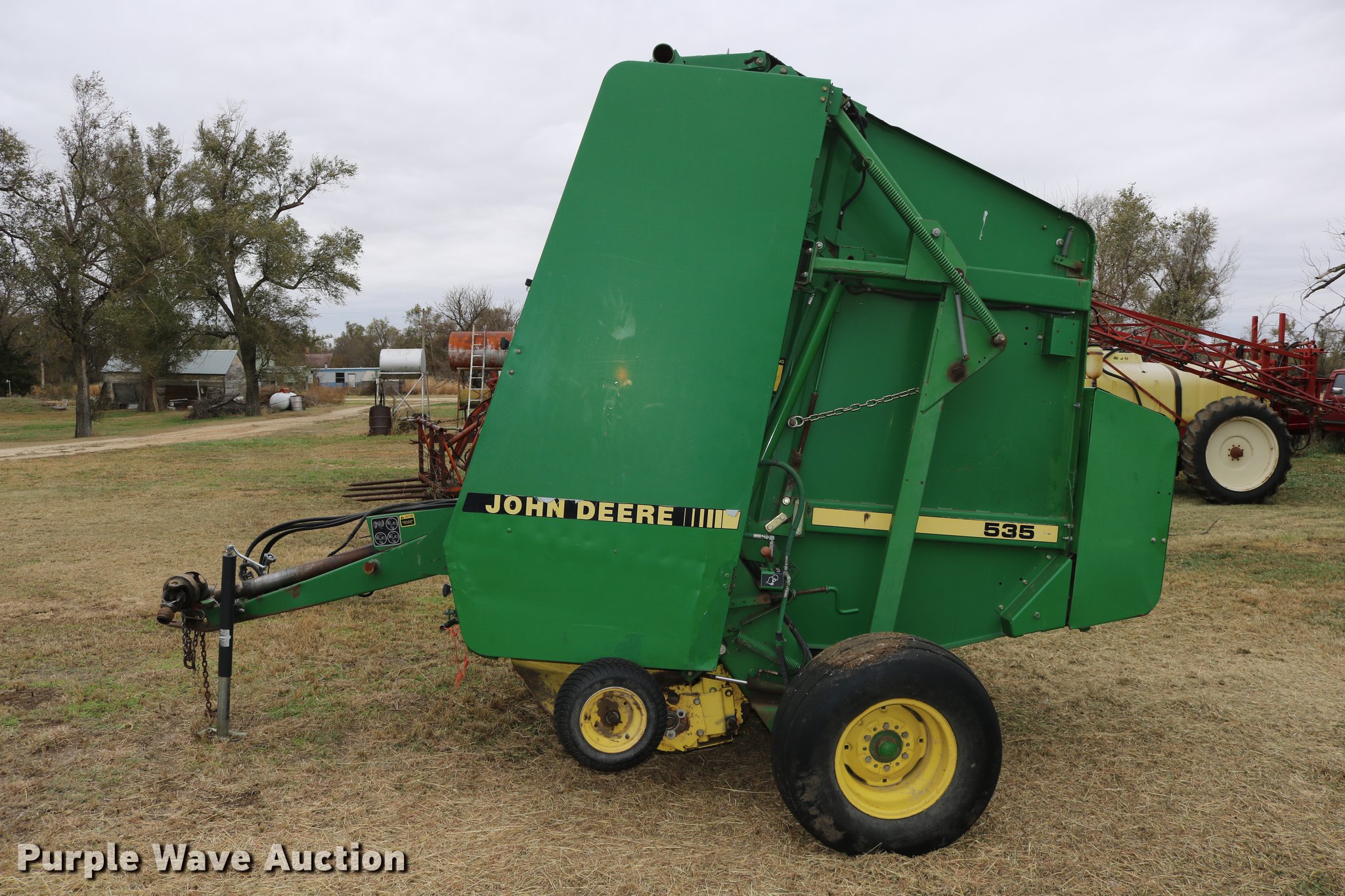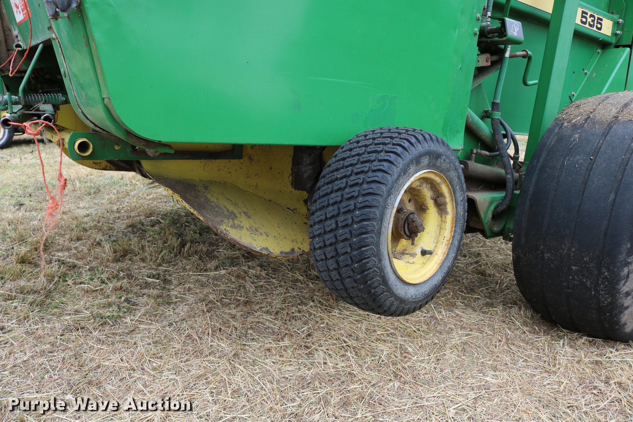 Purple Wave is selling a used Round Baler in Kansas. This item is a 1990 John Deere 535 round baler with the following: 5' x 6' bale capacity, 60"W pickup, Hydraulic pickup lift, 16x6.50-8 gauge wheels, John Deere monitor, Auto-tie, Twin twine tie, Net-wrap, Bale kicker, 540/1000 PTO, Clevis hitch, 31x13.5-15 tires, Serial E00535X861792