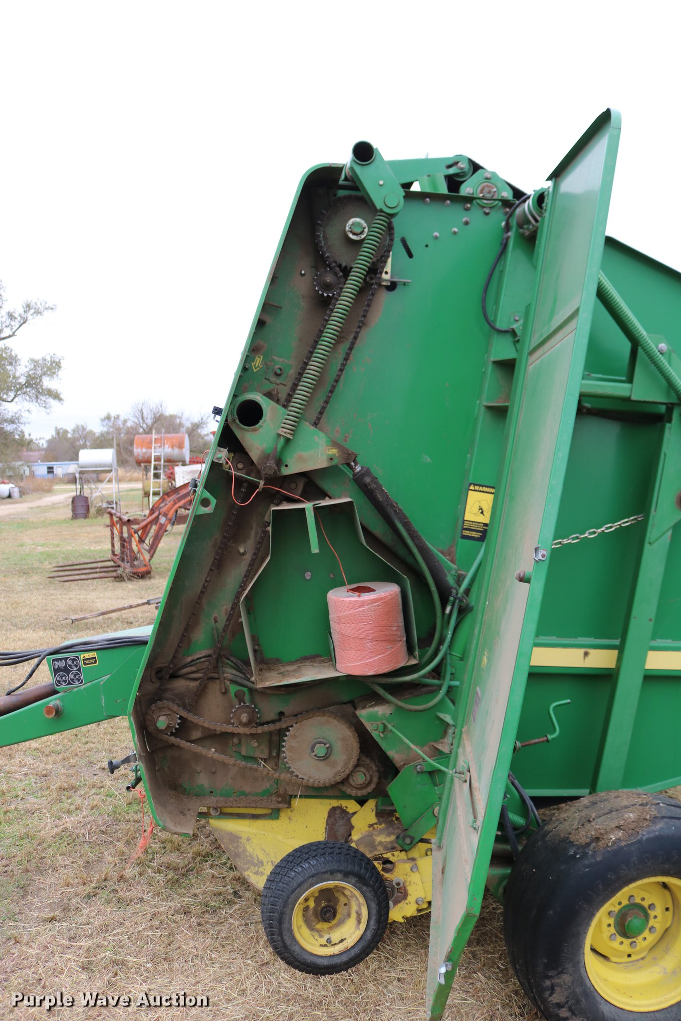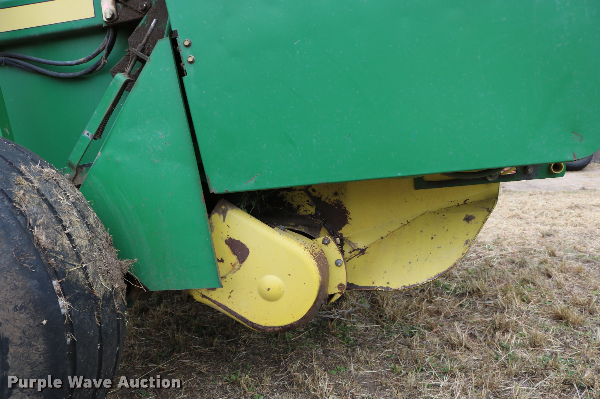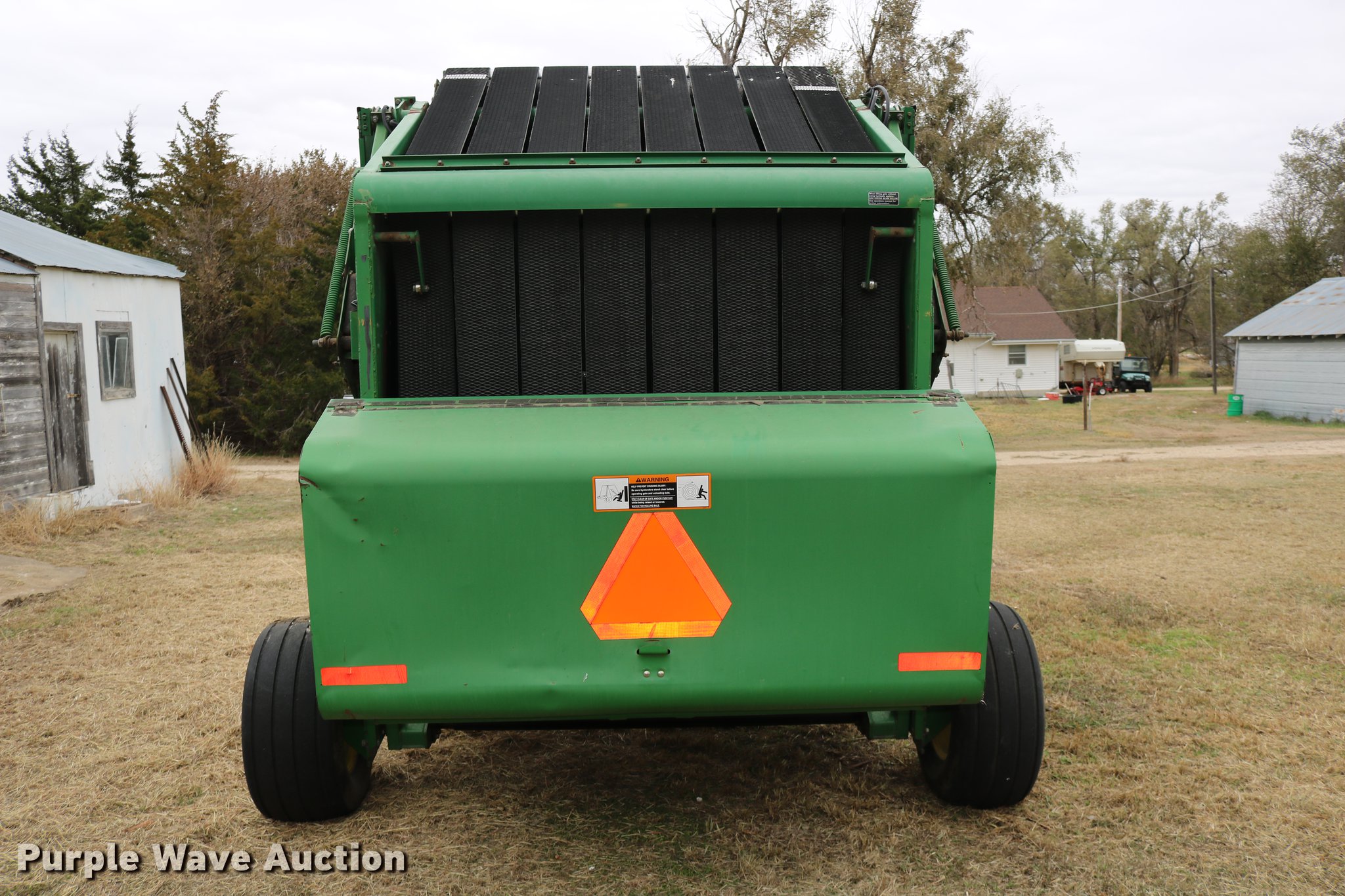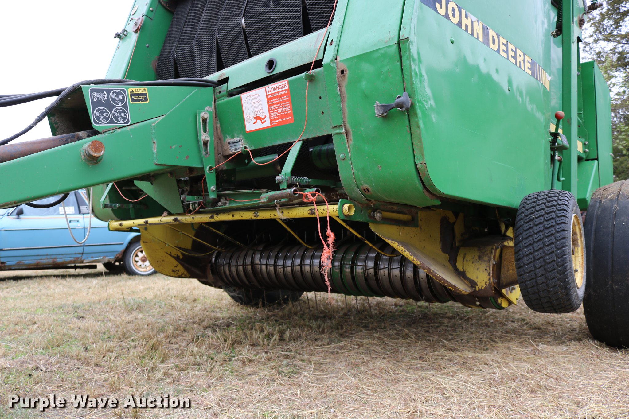 Purple Wave is selling a used Round Baler in Kansas. This item is a 1990 John Deere 535 round baler with the following: 5' x 6' bale capacity, 60"W pickup, Hydraulic pickup lift, 16x6.50-8 gauge wheels, John Deere monitor, Auto-tie, Twin twine tie, Net-wrap, Bale kicker, 540/1000 PTO, Clevis hitch, 31x13.5-15 tires, Serial E00535X861792