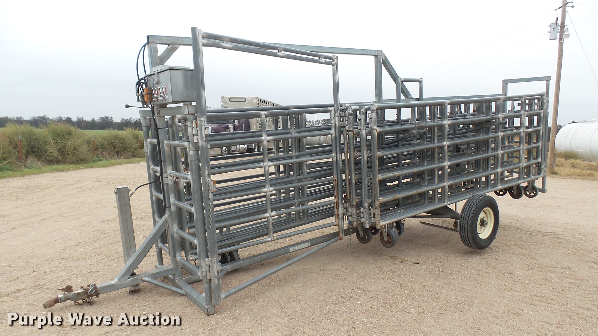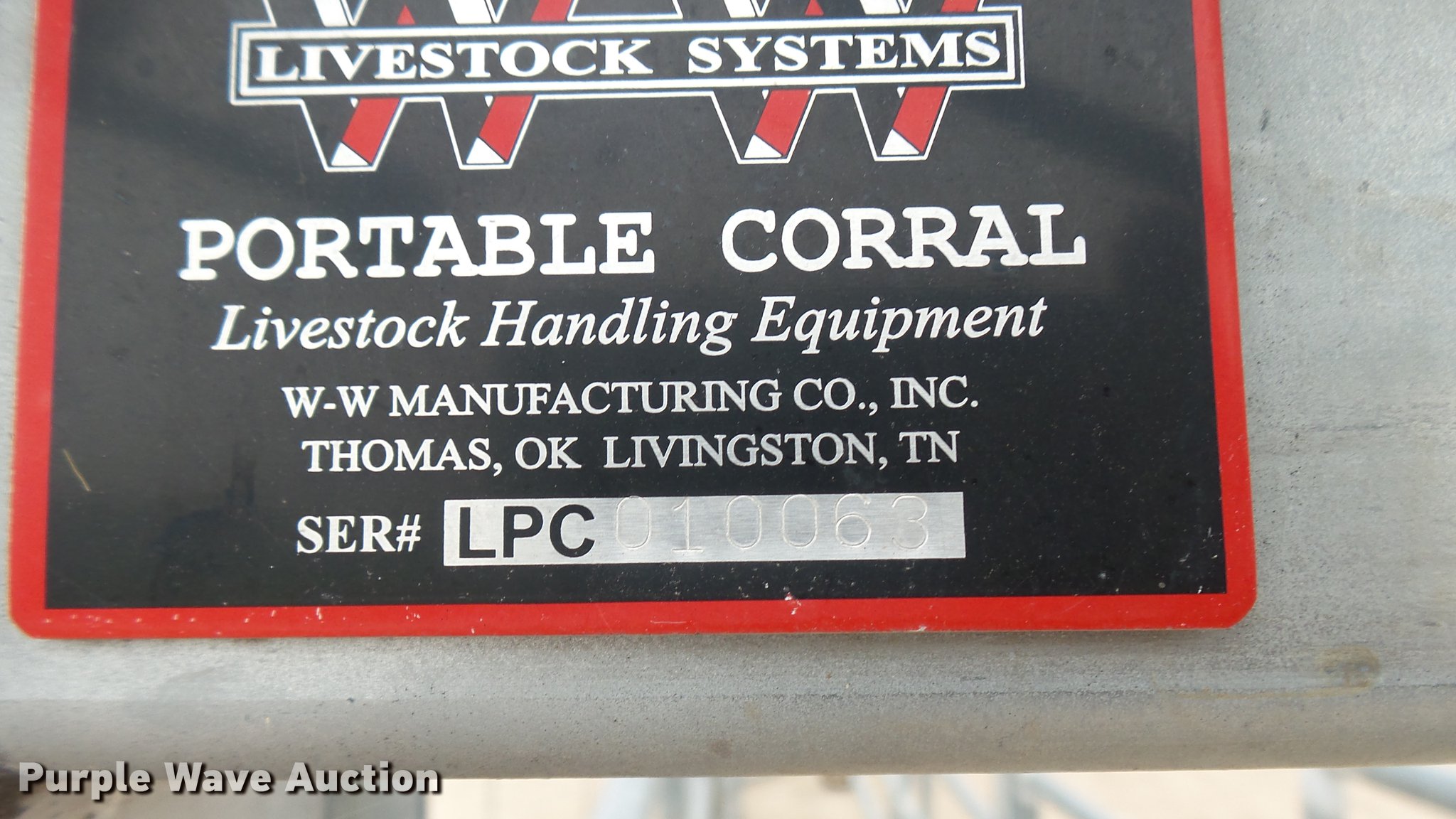 WW Livestock Systems corral. (15) panels (7) 13.5" x 6'H, (8) 20' x 6'H, 2" 14 gauge galvanized steel tubing construction, Solar charging system, Ball hitch, 235/85R16 tires, Serial LPC010063. Windom, KS 67491