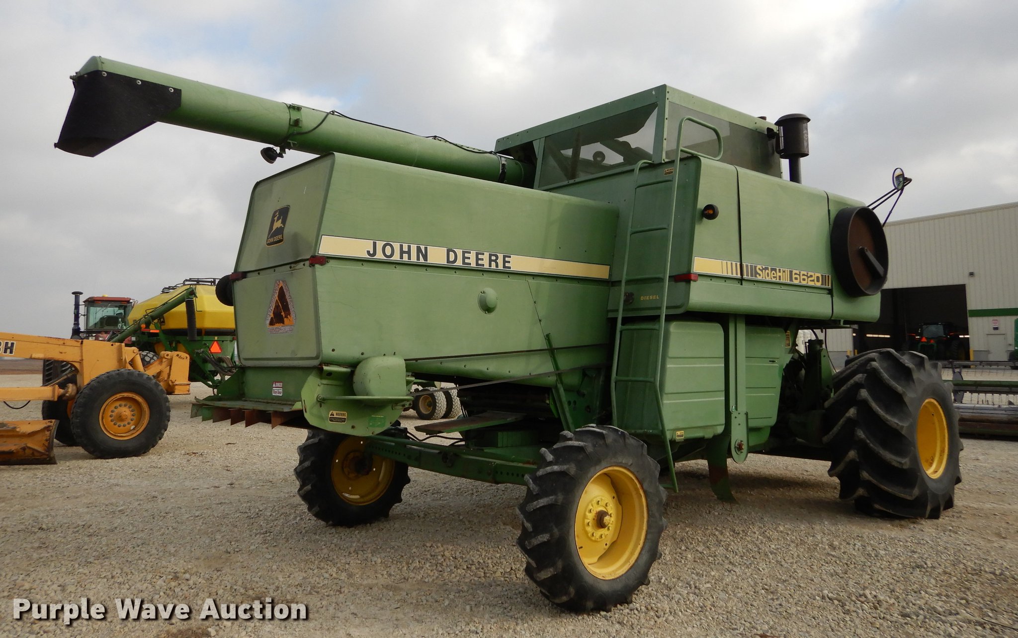 Purple Wave is selling a used Combine in Kansas. This item is a 1981 John Deere 6620 Side Hill combine with the following: 1,474 engine hours on meter, John Deere 6466TH-01 six cylinder turbo diesel engine, Serial 168307RG, Hydrostatic transmission, AC and heat, AM/FM, Wiper, Work lights, Straw chopper, 165 bu. grain bin, 15'L unloading auger, (9) rear axle weights, 28L-26 front tires, 12.4-24 rear tires, Serial 453836, Unit# 43518