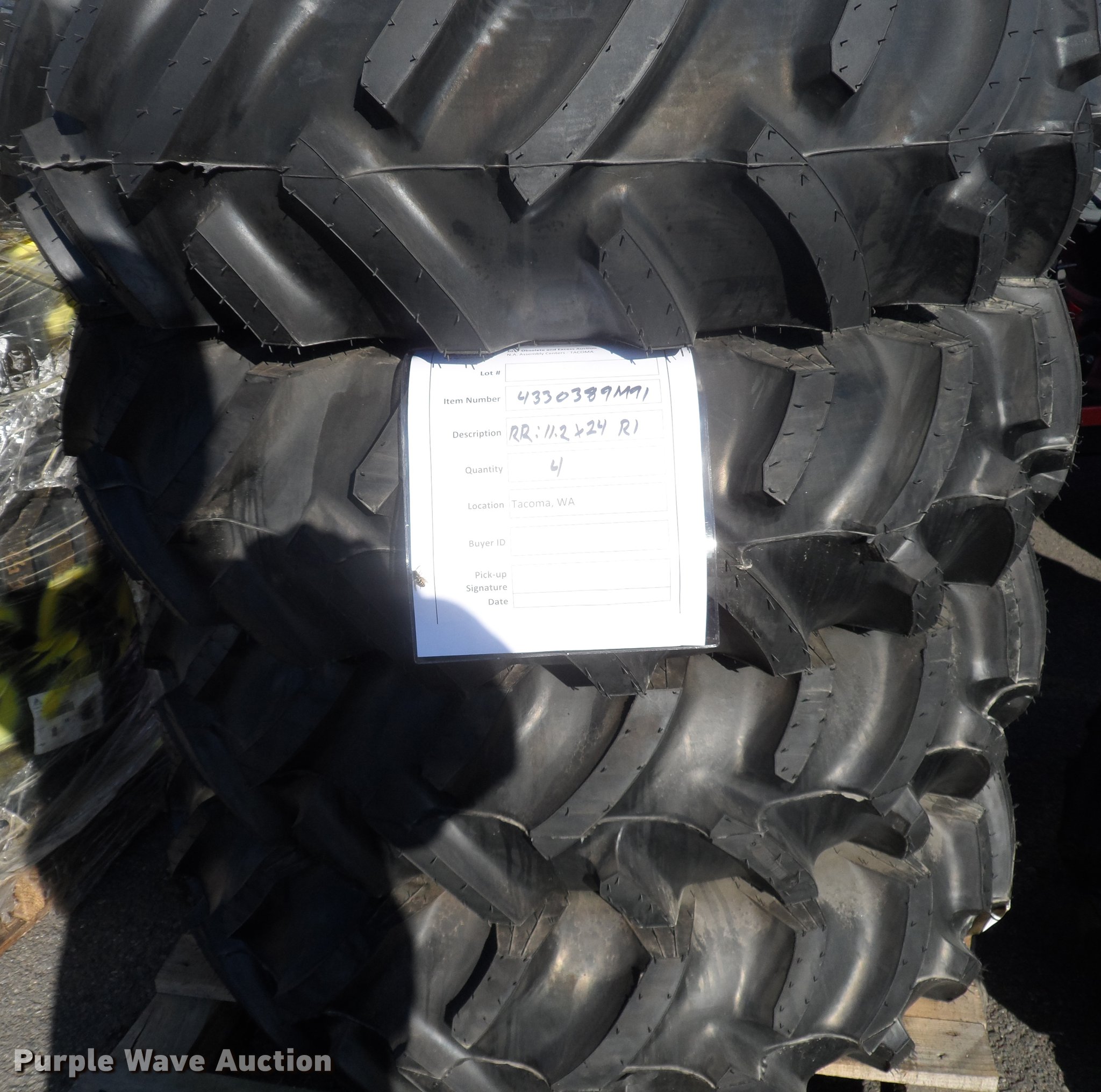 Purple Wave is selling a used Industrial Tires or Tracks in Maryland. This item is a (4) Galaxy 11.2x24 4PR R1 HTL rear tire assemblies with the following: Right side, Bolt pattern: 8 bolt, 8" diameter, Pilot: 6", Tread: R1 Ag lug, Usage: MF1700E, Item# 4330389M91