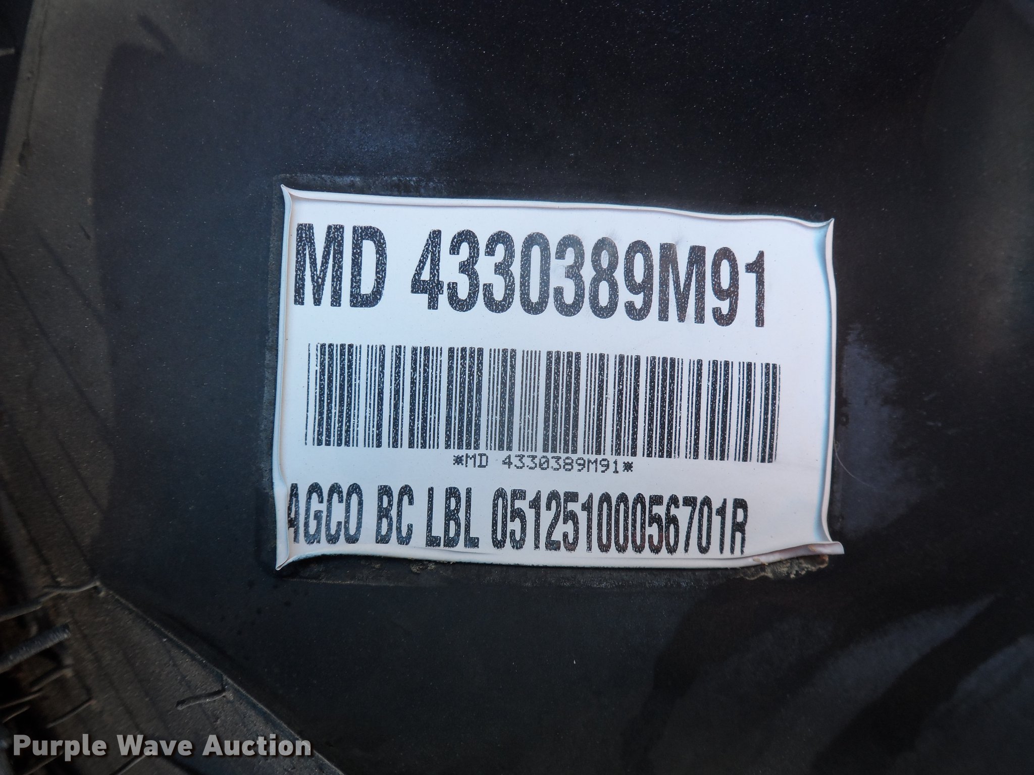 (4) Galaxy 11.2x24 4PR R1 HTL rear tire assemblies. Right side, Bolt pattern: 8 bolt, 8" diameter , Pilot: 6", Tread: R1 Ag lug, Usage: MF1700E, Item# 4330389M91. Representative photo. AGCO Corp Baltimore Assembly Center. 1704 Trimble Rd. Edgewood, MD 21040