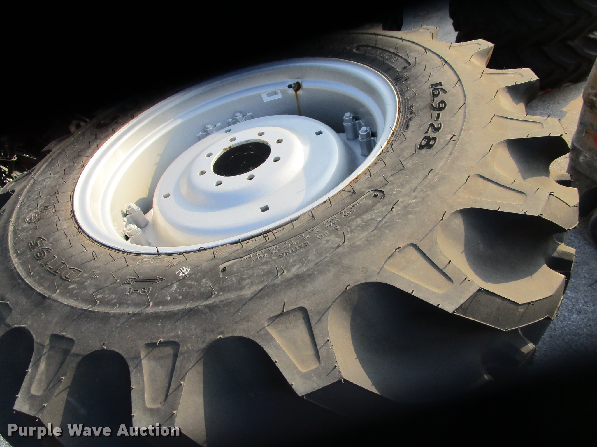 Purple Wave is selling a used Industrial Tires or Tracks in Texas. This item is a (4) Goodyear 16.9x28 R1 rear tire assemblies with the following: Bolt pattern: 8 bolt, 6" diameter, Pilot: 4.262", Tread: R1 Ag lug, Usage: MF2600, Item# 4340601R_old