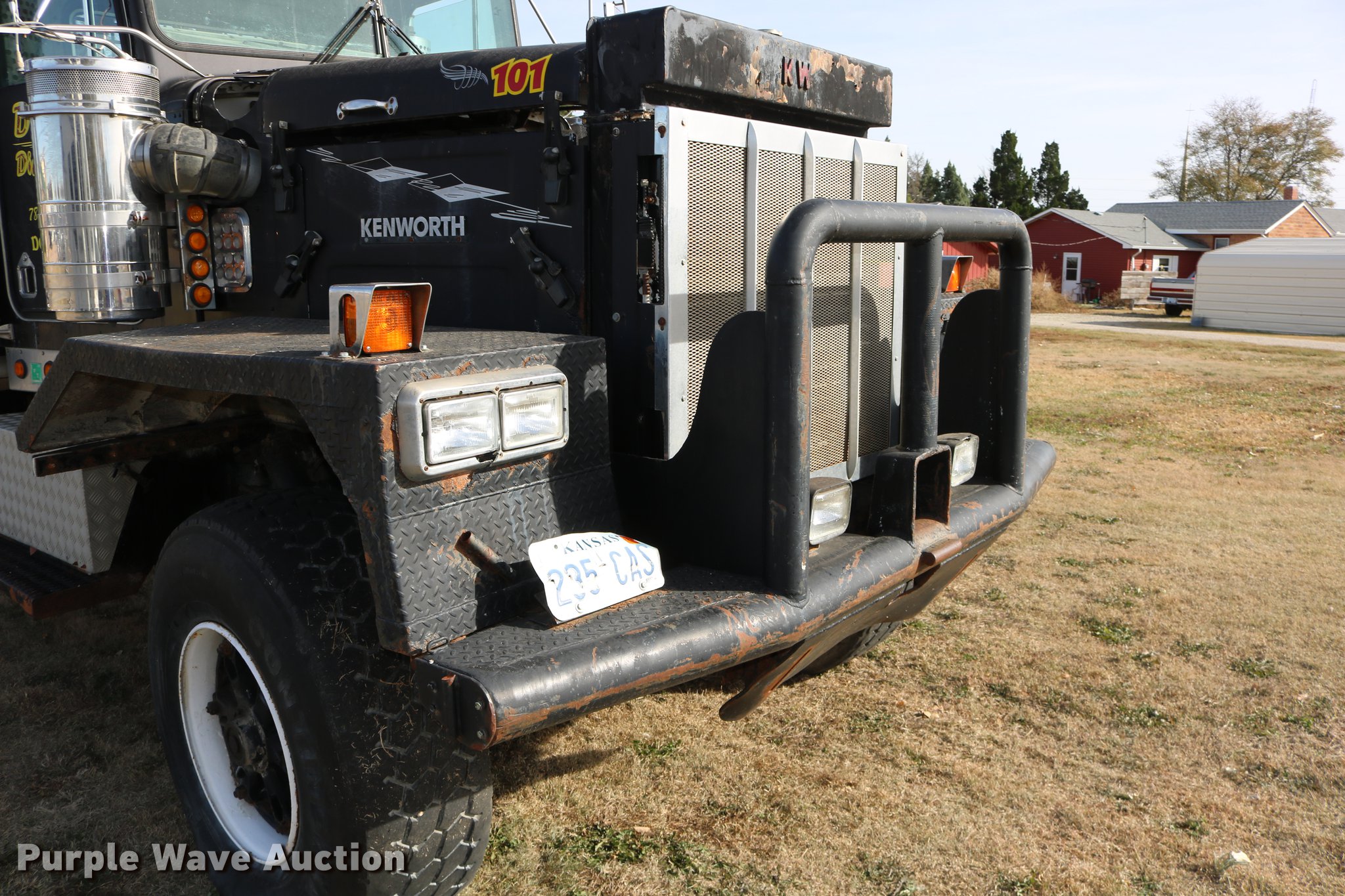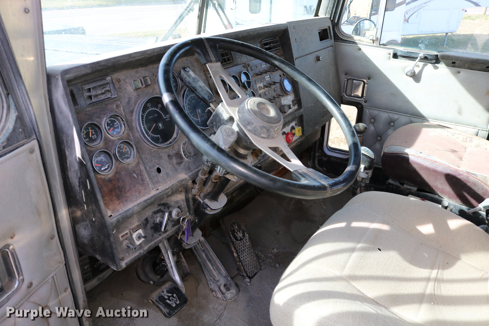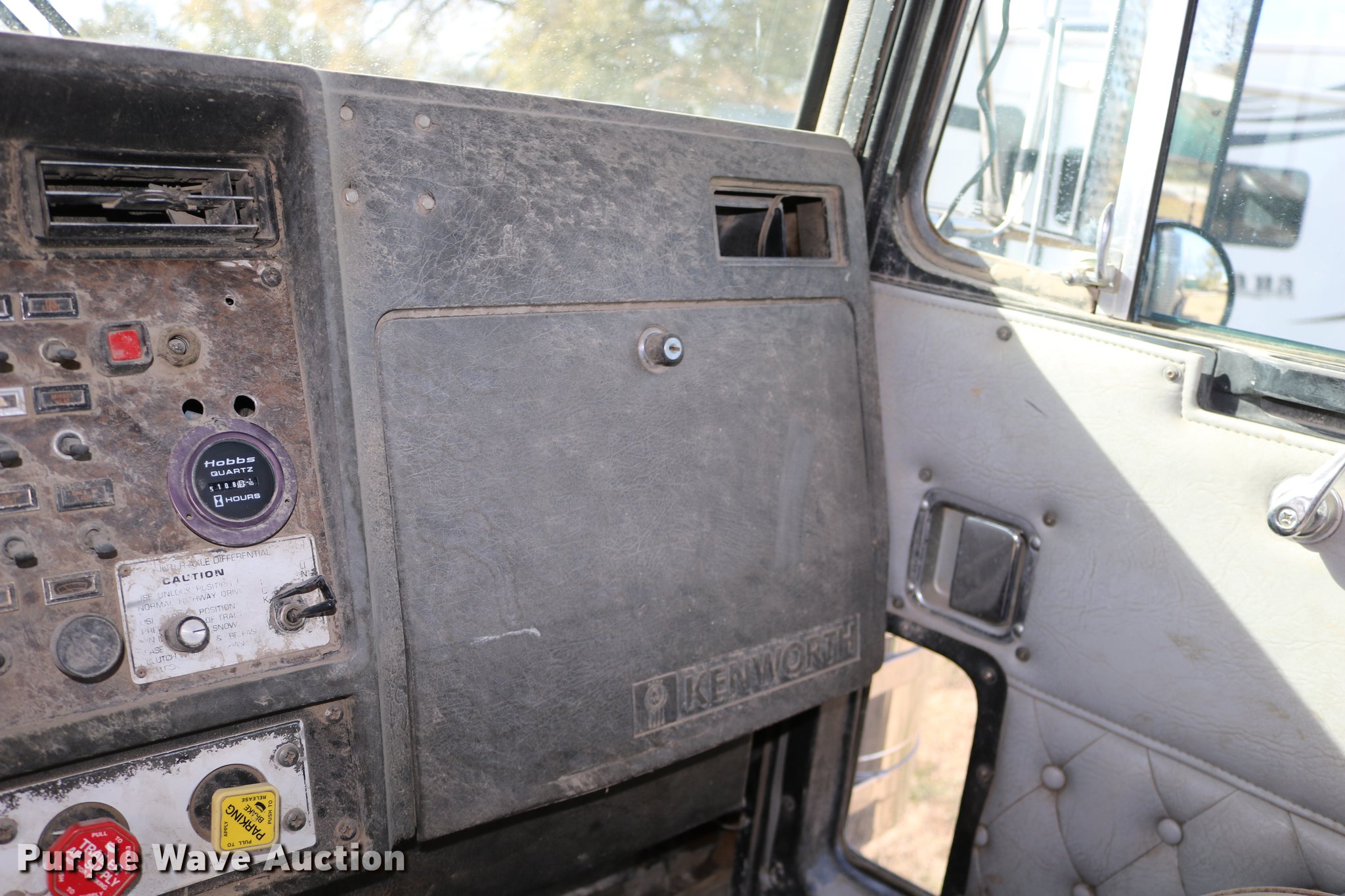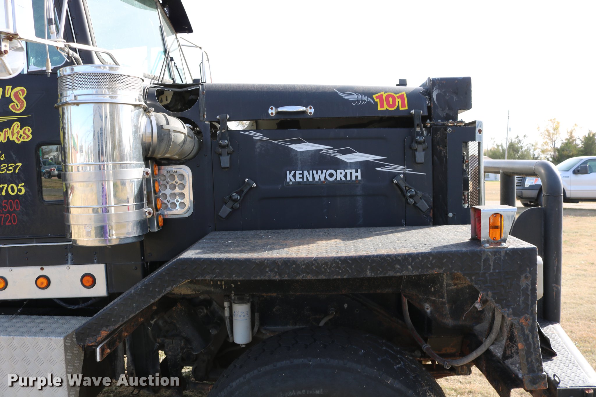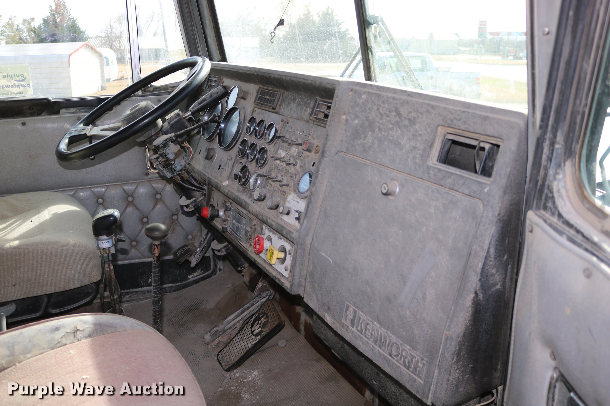 Purple Wave is selling a used Flat Bed Truck in Kansas. This item is a 1988 Kenworth LW900 flatbed truck with the following: 6,674 km on odometer, 5,109 hours on meter, Caterpillar 3406 DITA six cylinder turbo diesel engine, Eaton Fuller 1362C 13 speed manual transmission, Tandem axle, AC and heat, AM/FM/CD, Heated mirrors, Air suspension seat, Block heater, PTO, Dual exhaust stacks, Flatbed, Wood and steel floor, Headache rack, Branden winch, Tulsa winch, 18.5' gin poles, Toolboxes, Rolling tailboard, Fifth wheel plate, Trailer wiring, Outlet broken, Dual fuel tanks, Spring over walking beam suspension, Air brakes, Approx. 276" wheelbase, 425/65R22.5 front tires, 11R22.5 rear tires, GVWR 29,031 lbs, FAWR 9,165 lbs, IAWR 10,433 lbs, RAWR 10,433 lbs, Low air pressure light on, No power steering, One fuel tank may not be hooked up, Two air hoses disconnected by PTO