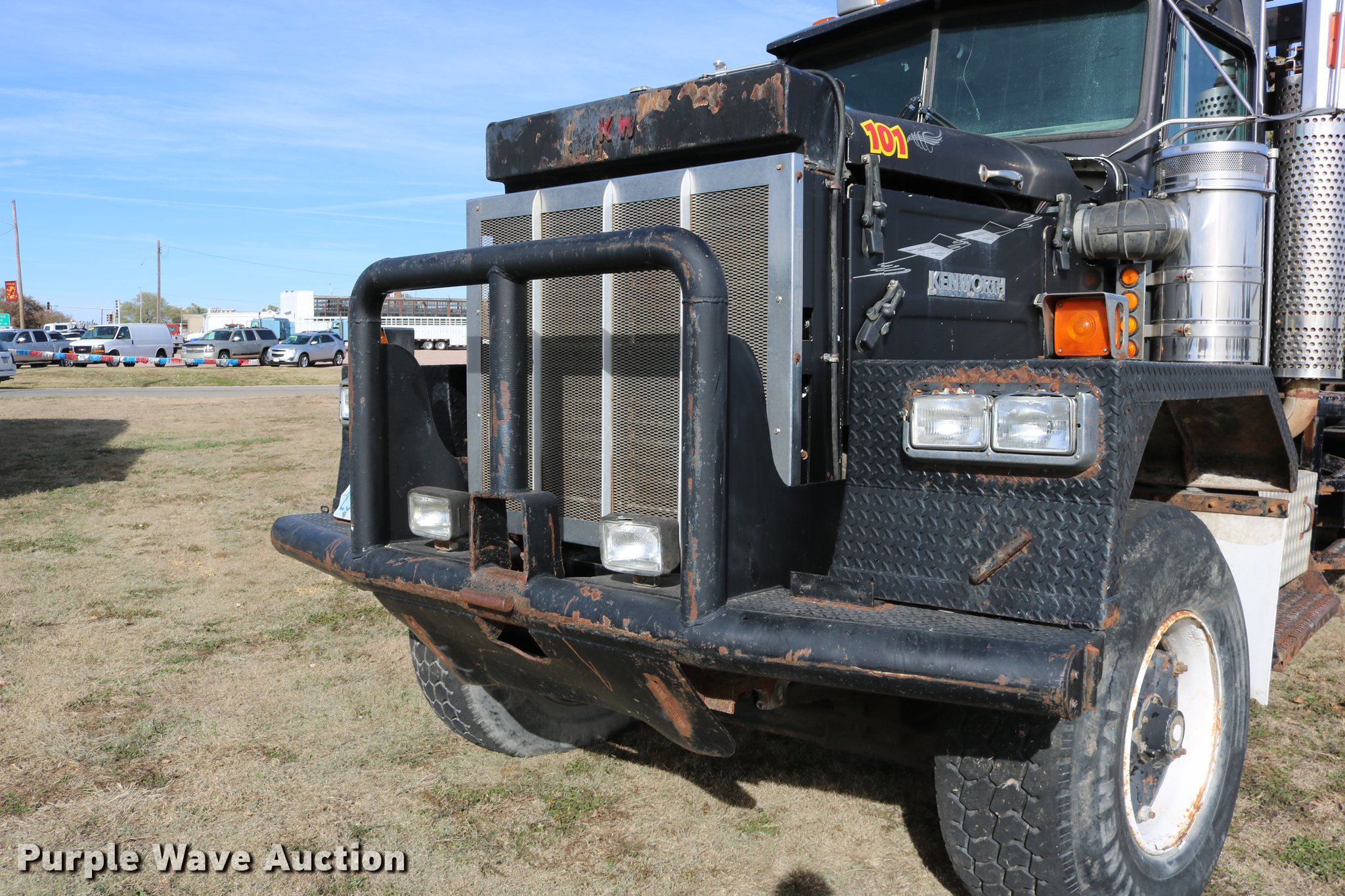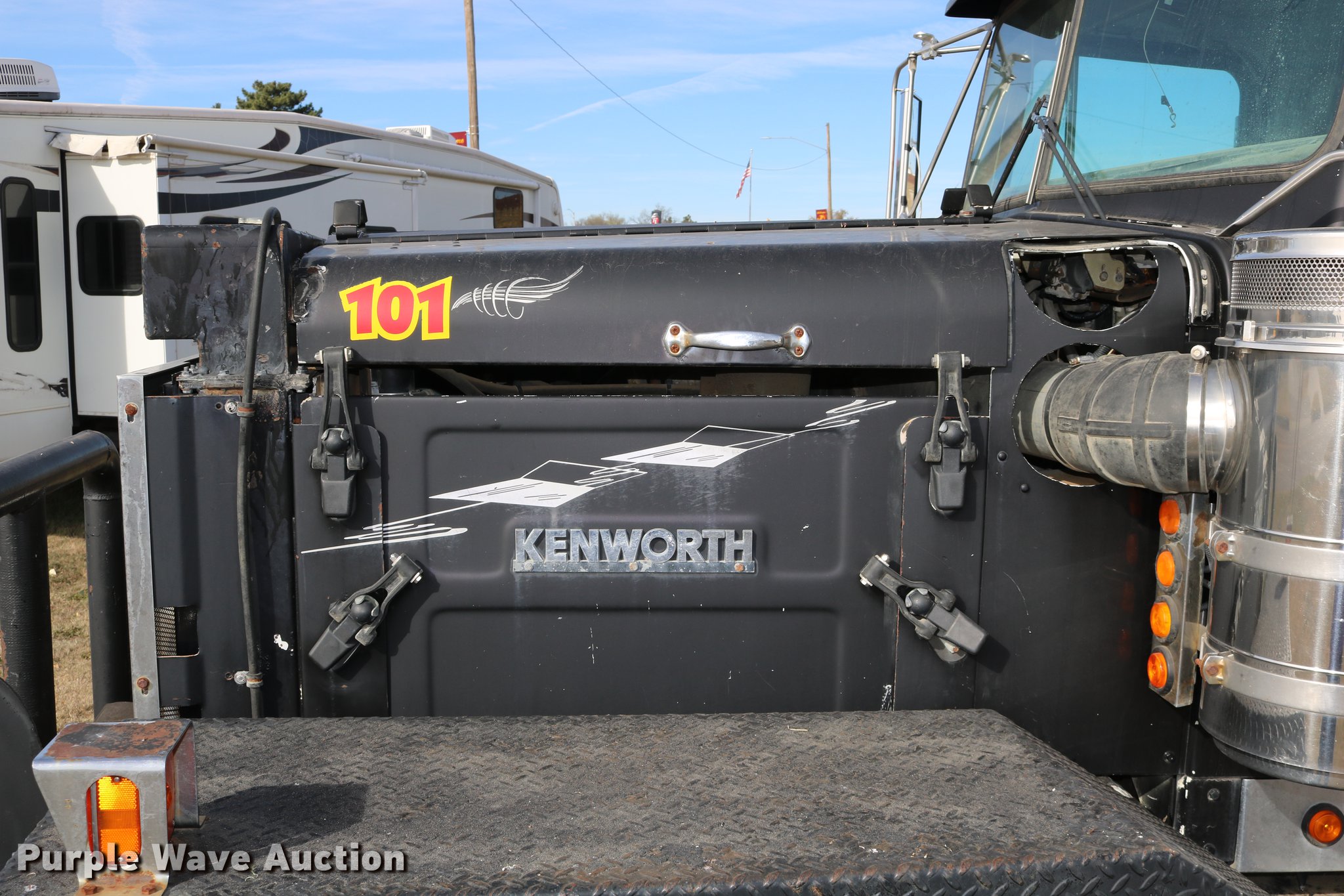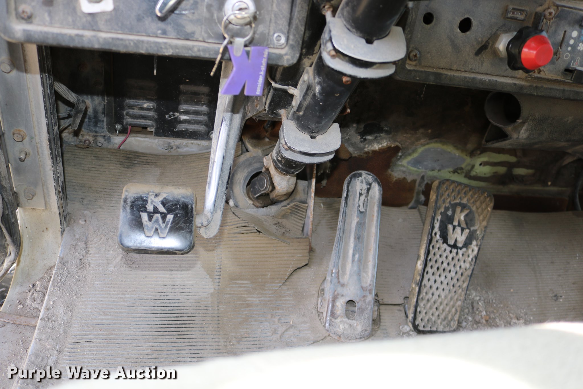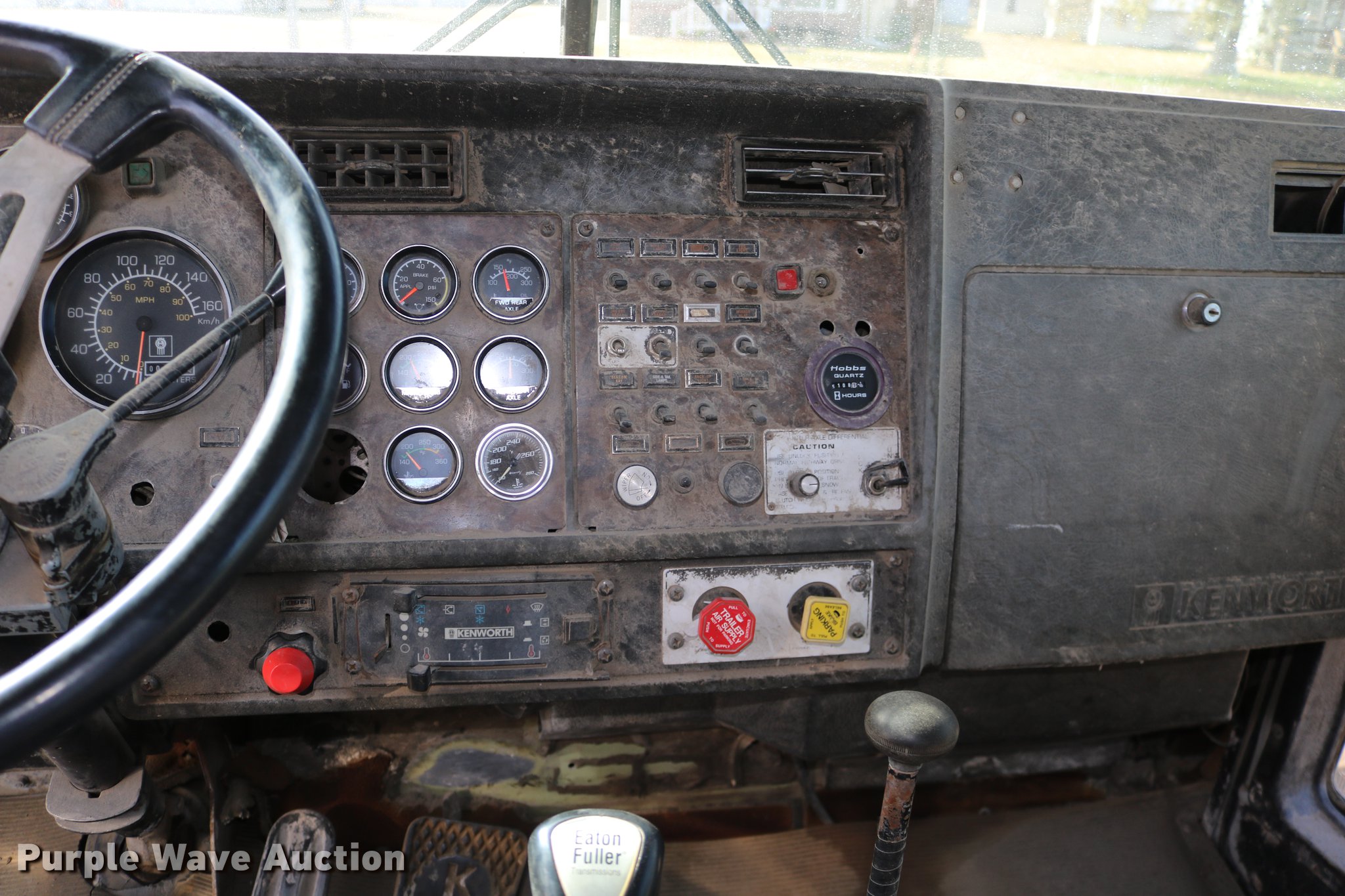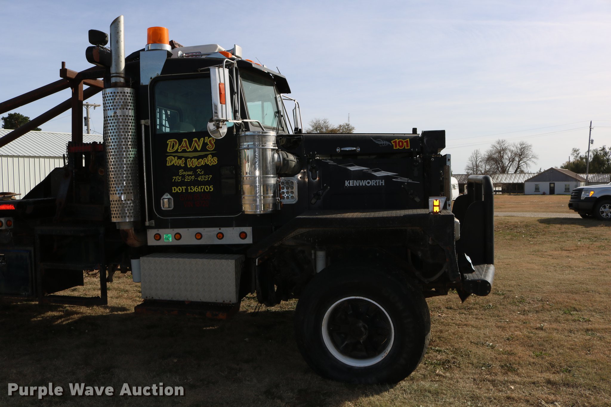 Purple Wave is selling a used Flat Bed Truck in Kansas. This item is a 1988 Kenworth LW900 flatbed truck with the following: 6,674 km on odometer, 5,109 hours on meter, Caterpillar 3406 DITA six cylinder turbo diesel engine, Eaton Fuller 1362C 13 speed manual transmission, Tandem axle, AC and heat, AM/FM/CD, Heated mirrors, Air suspension seat, Block heater, PTO, Dual exhaust stacks, Flatbed, Wood and steel floor, Headache rack, Branden winch, Tulsa winch, 18.5' gin poles, Toolboxes, Rolling tailboard, Fifth wheel plate, Trailer wiring, Outlet broken, Dual fuel tanks, Spring over walking beam suspension, Air brakes, Approx. 276" wheelbase, 425/65R22.5 front tires, 11R22.5 rear tires, GVWR 29,031 lbs, FAWR 9,165 lbs, IAWR 10,433 lbs, RAWR 10,433 lbs, Low air pressure light on, No power steering, One fuel tank may not be hooked up, Two air hoses disconnected by PTO