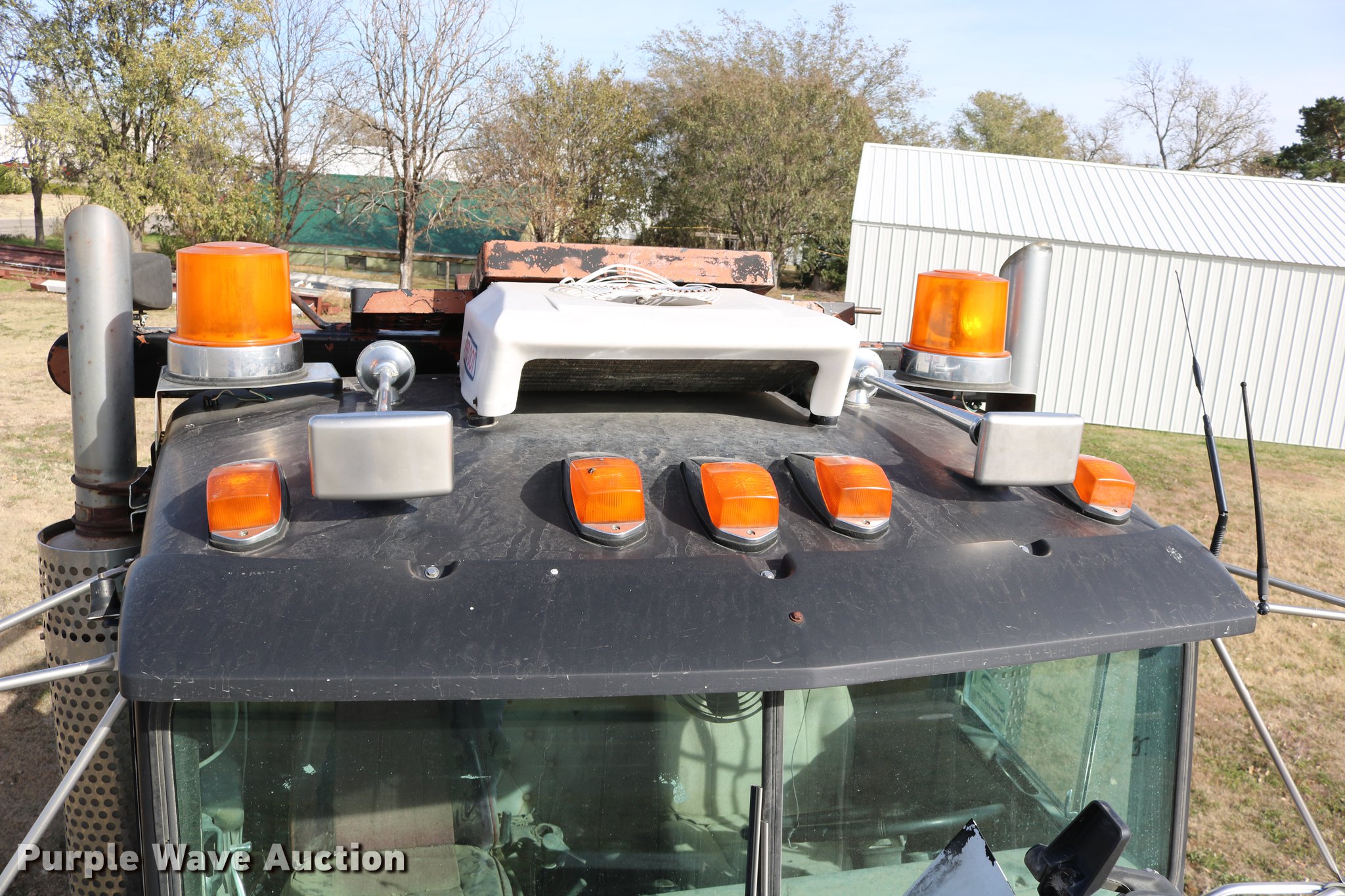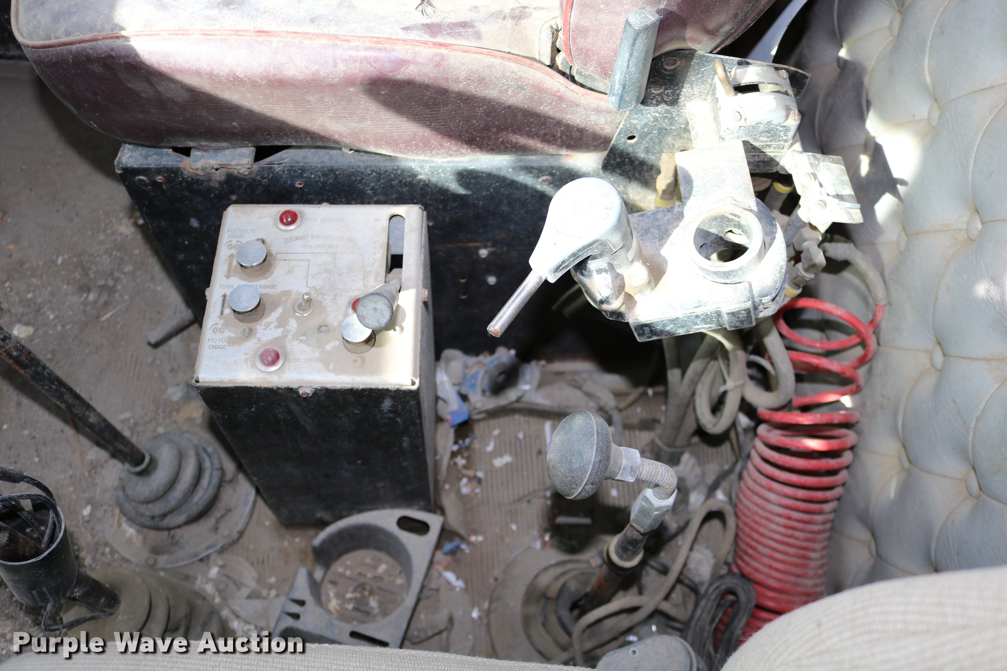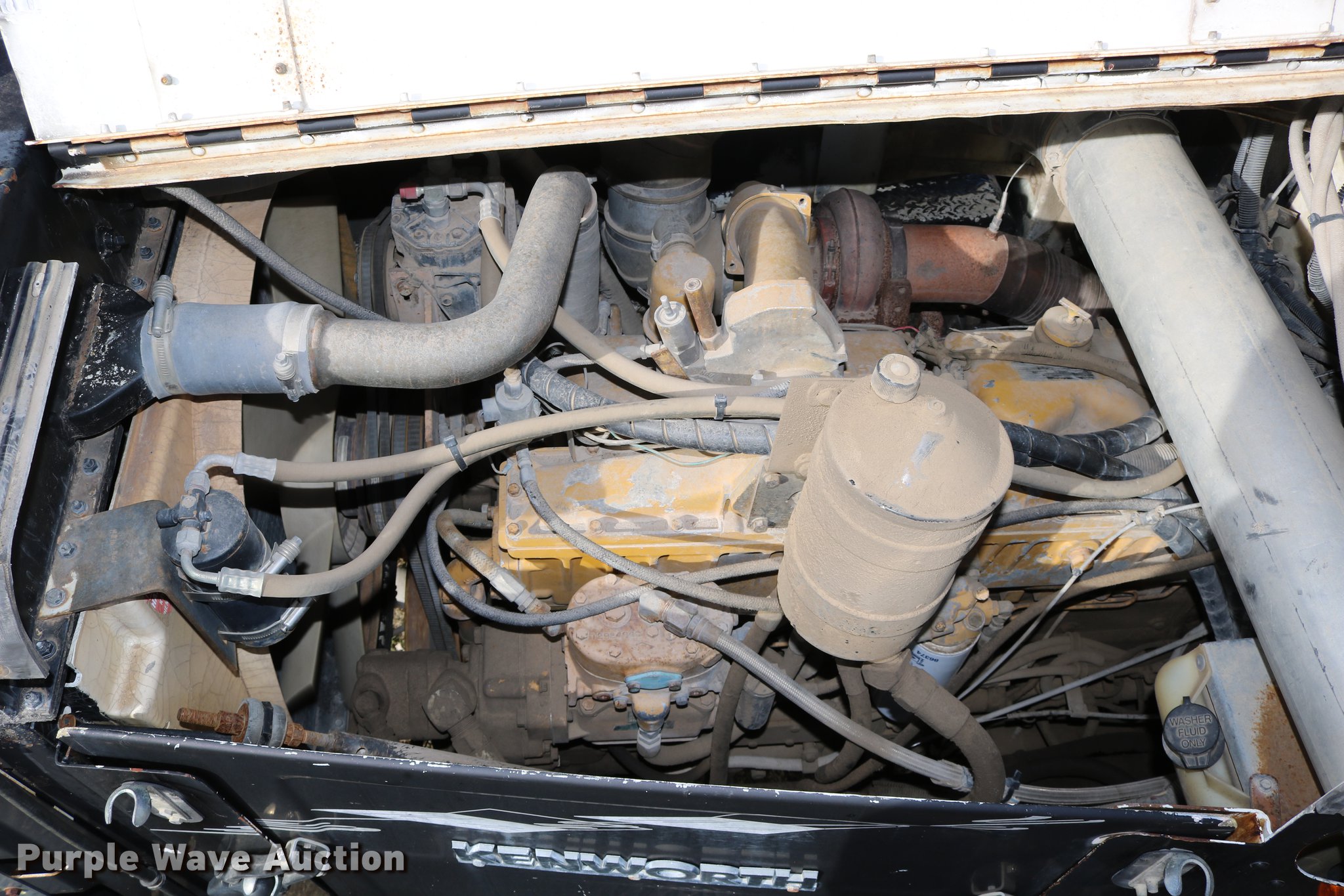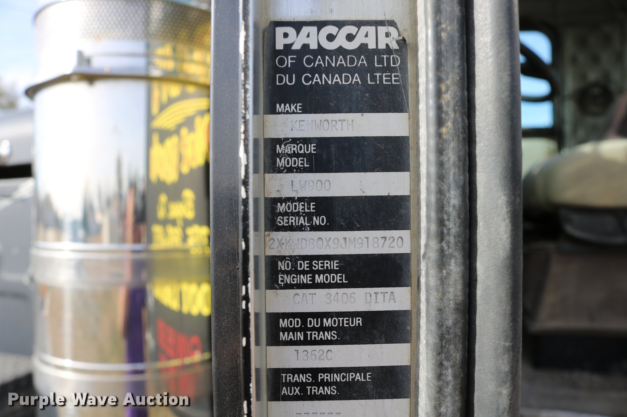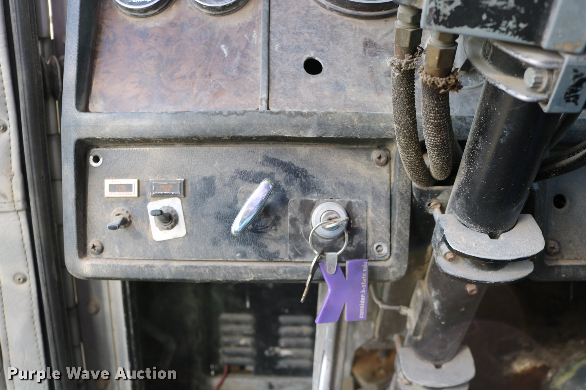 Purple Wave is selling a used Flat Bed Truck in Kansas. This item is a 1988 Kenworth LW900 flatbed truck with the following: 6,674 km on odometer, 5,109 hours on meter, Caterpillar 3406 DITA six cylinder turbo diesel engine, Eaton Fuller 1362C 13 speed manual transmission, Tandem axle, AC and heat, AM/FM/CD, Heated mirrors, Air suspension seat, Block heater, PTO, Dual exhaust stacks, Flatbed, Wood and steel floor, Headache rack, Branden winch, Tulsa winch, 18.5' gin poles, Toolboxes, Rolling tailboard, Fifth wheel plate, Trailer wiring, Outlet broken, Dual fuel tanks, Spring over walking beam suspension, Air brakes, Approx. 276" wheelbase, 425/65R22.5 front tires, 11R22.5 rear tires, GVWR 29,031 lbs, FAWR 9,165 lbs, IAWR 10,433 lbs, RAWR 10,433 lbs, Low air pressure light on, No power steering, One fuel tank may not be hooked up, Two air hoses disconnected by PTO