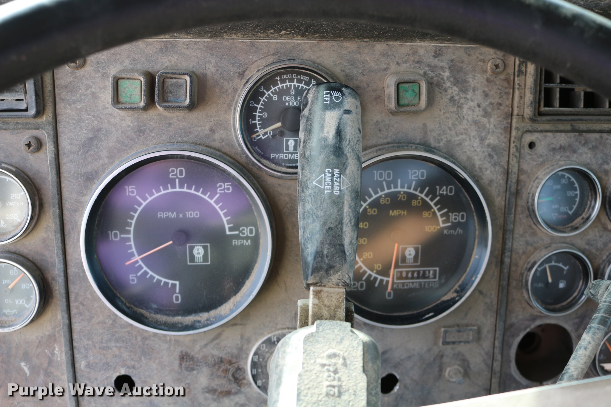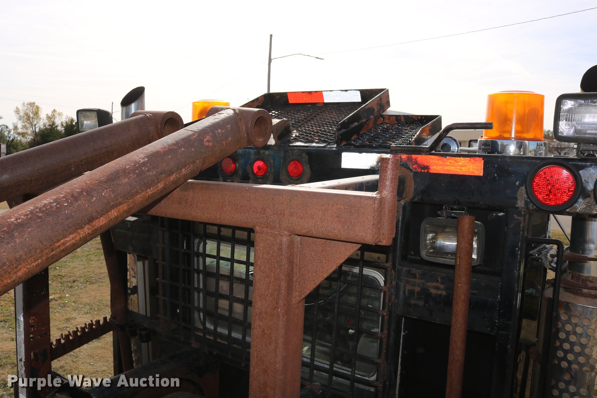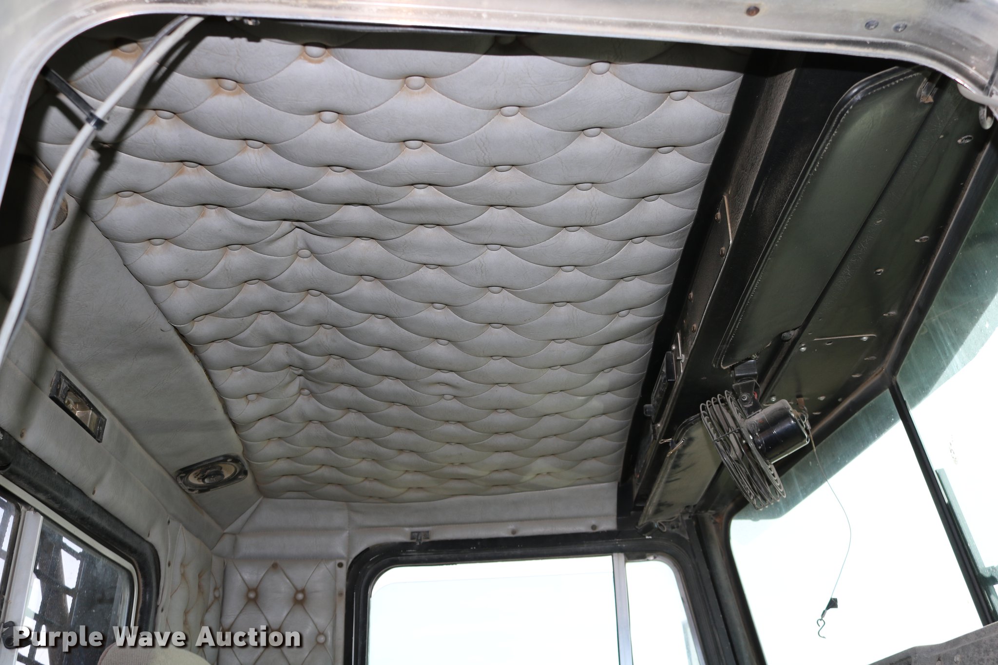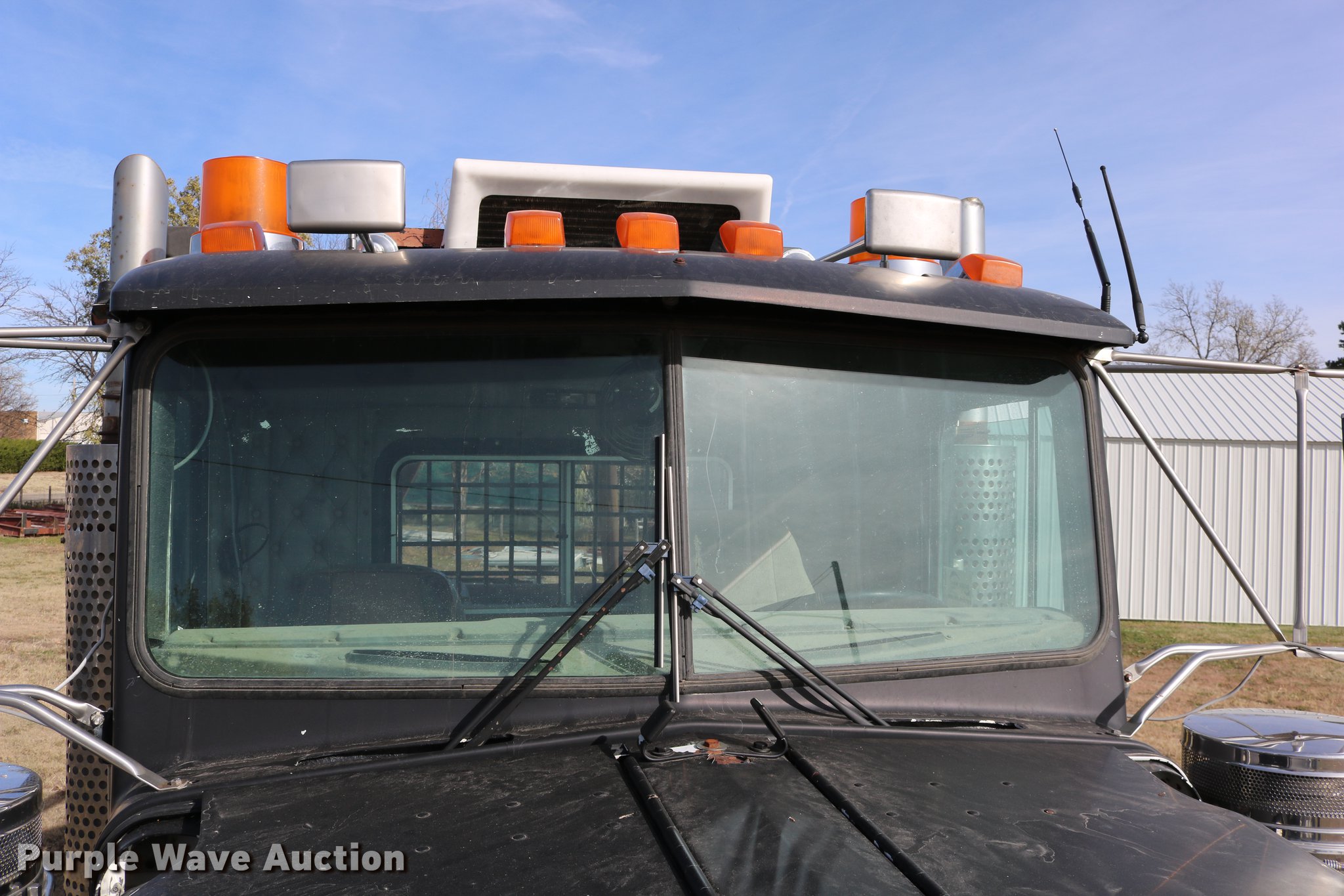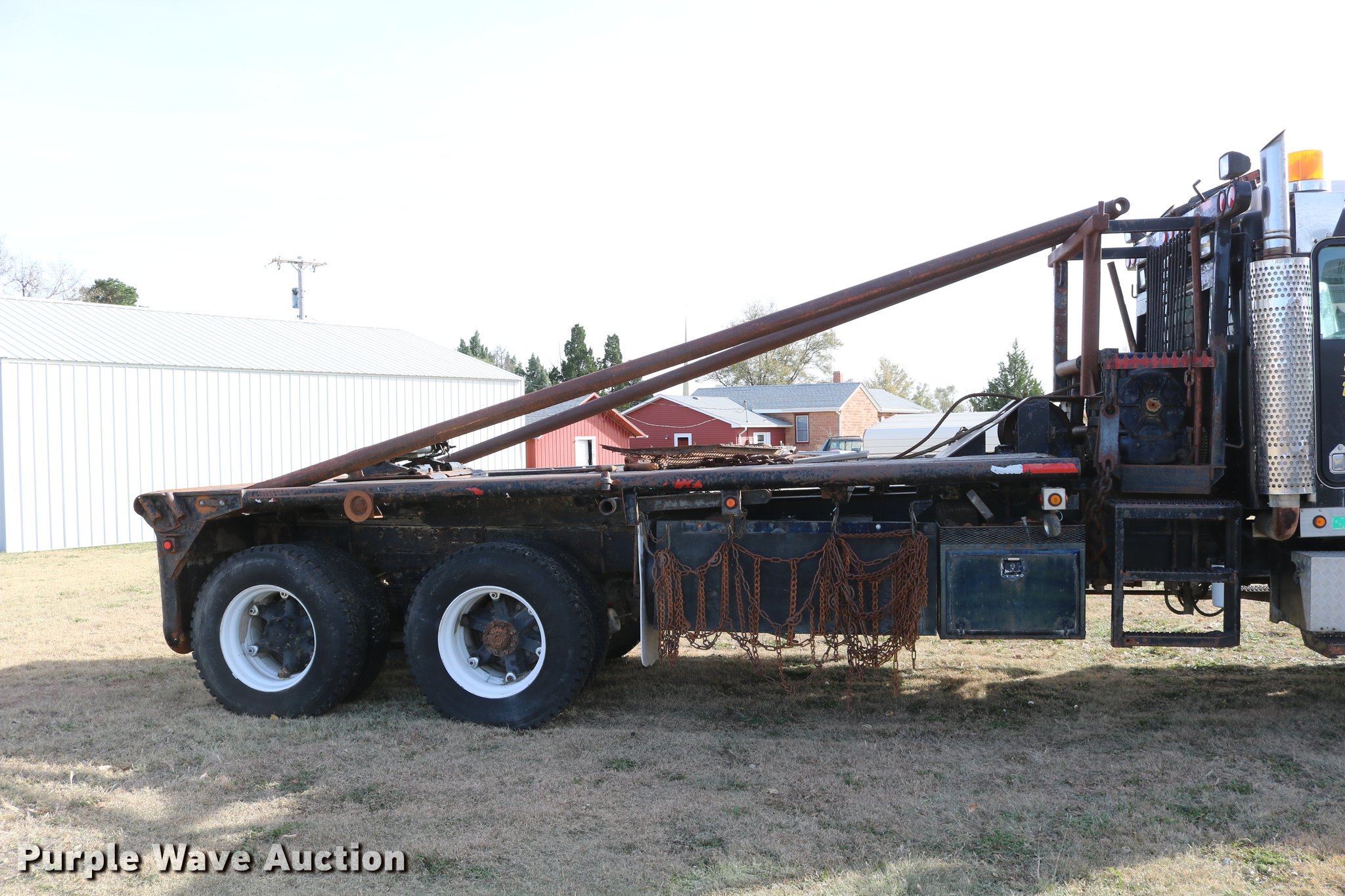 Purple Wave is selling a used Flat Bed Truck in Kansas. This item is a 1988 Kenworth LW900 flatbed truck with the following: 6,674 km on odometer, 5,109 hours on meter, Caterpillar 3406 DITA six cylinder turbo diesel engine, Eaton Fuller 1362C 13 speed manual transmission, Tandem axle, AC and heat, AM/FM/CD, Heated mirrors, Air suspension seat, Block heater, PTO, Dual exhaust stacks, Flatbed, Wood and steel floor, Headache rack, Branden winch, Tulsa winch, 18.5' gin poles, Toolboxes, Rolling tailboard, Fifth wheel plate, Trailer wiring, Outlet broken, Dual fuel tanks, Spring over walking beam suspension, Air brakes, Approx. 276" wheelbase, 425/65R22.5 front tires, 11R22.5 rear tires, GVWR 29,031 lbs, FAWR 9,165 lbs, IAWR 10,433 lbs, RAWR 10,433 lbs, Low air pressure light on, No power steering, One fuel tank may not be hooked up, Two air hoses disconnected by PTO