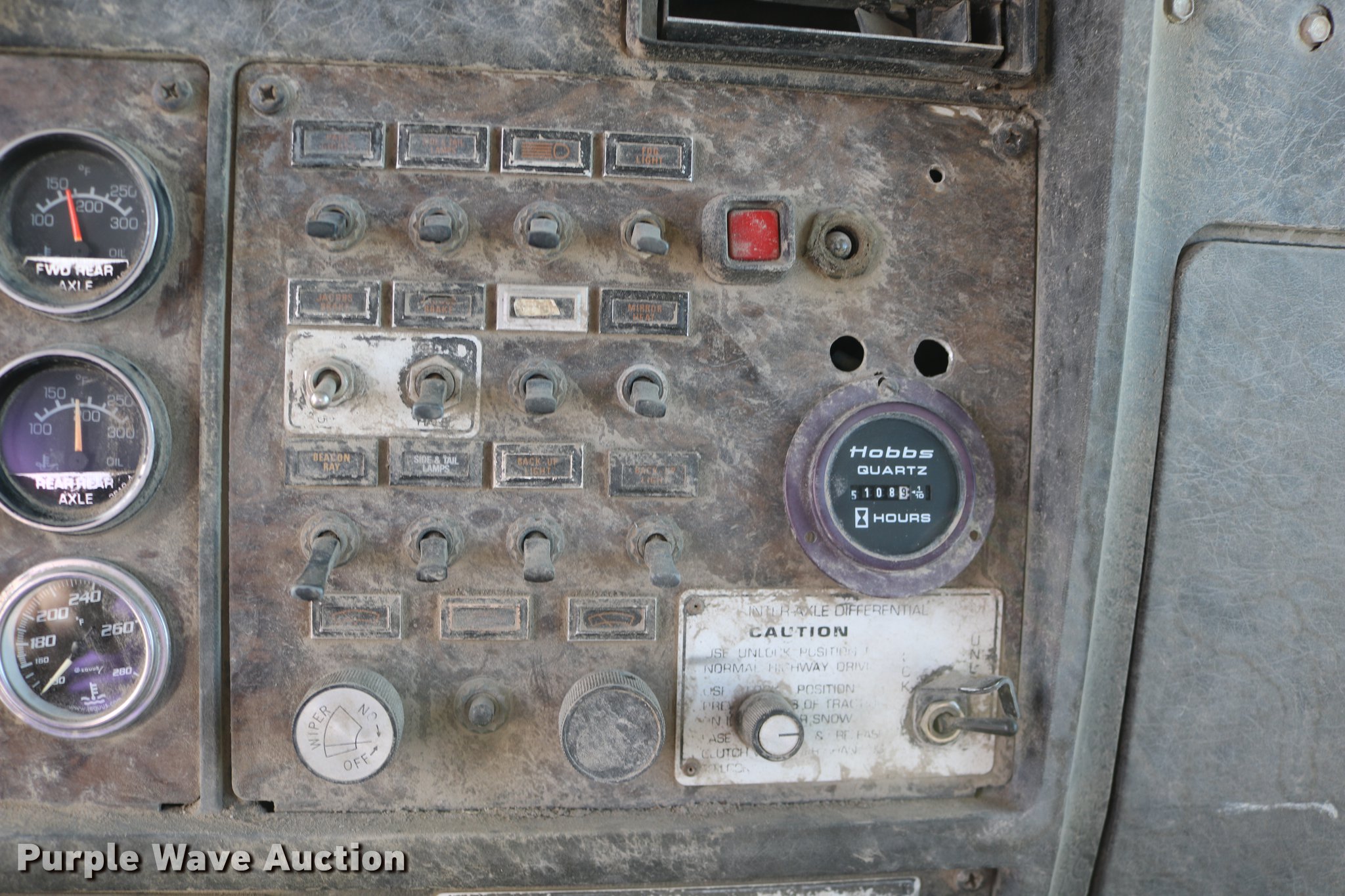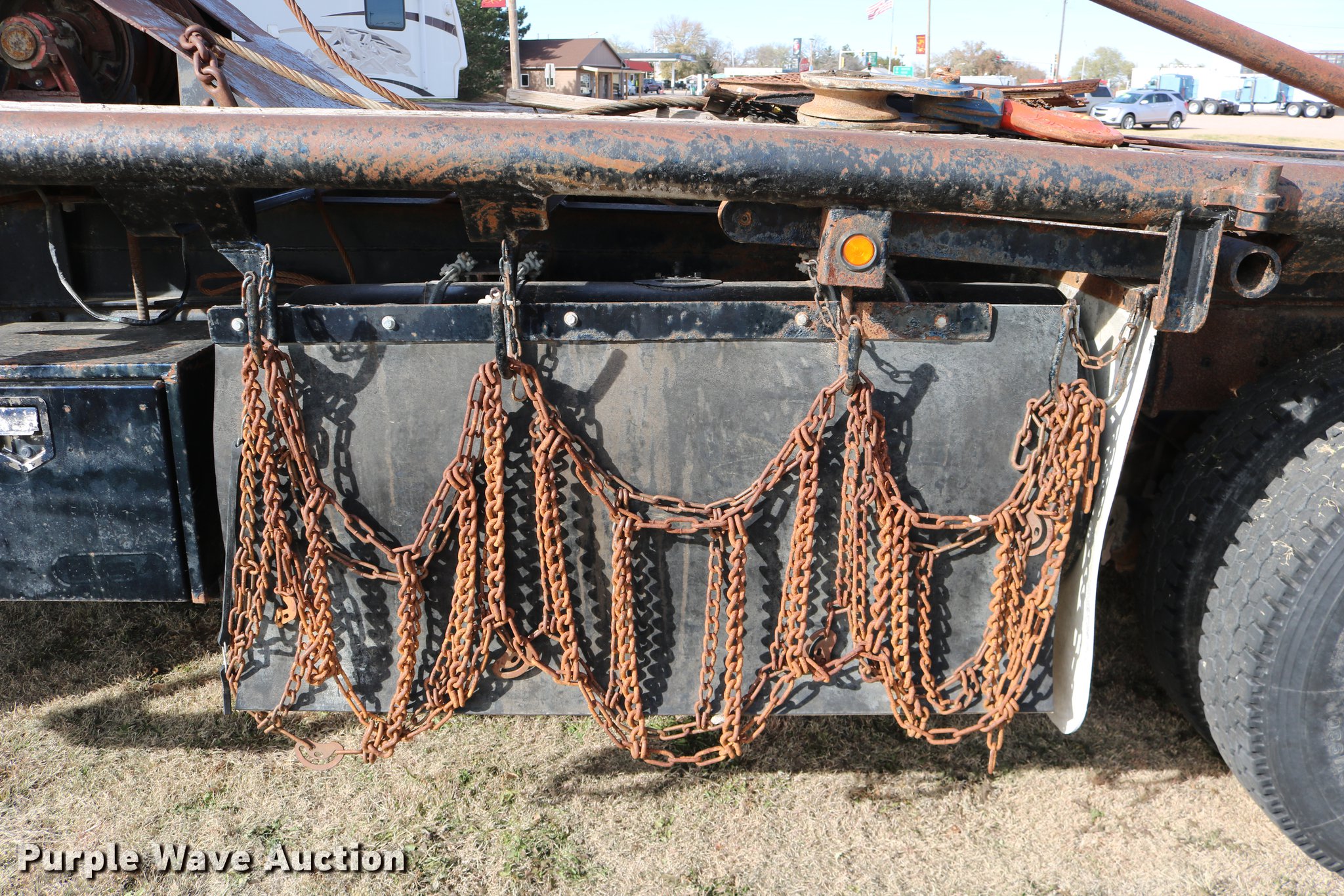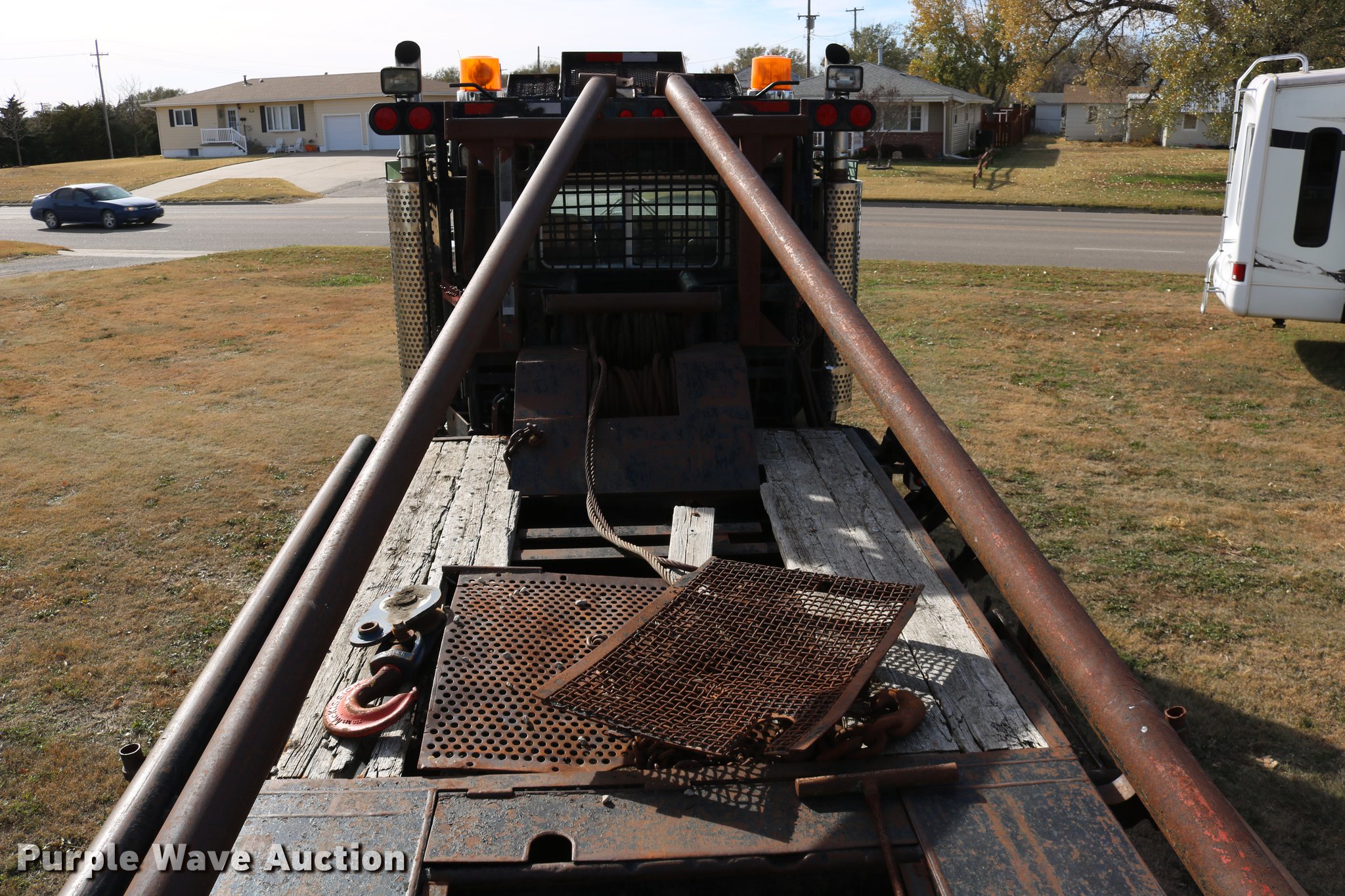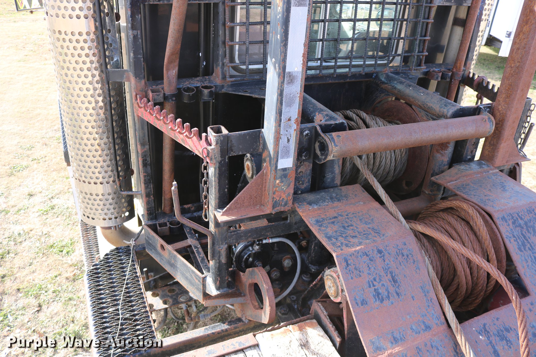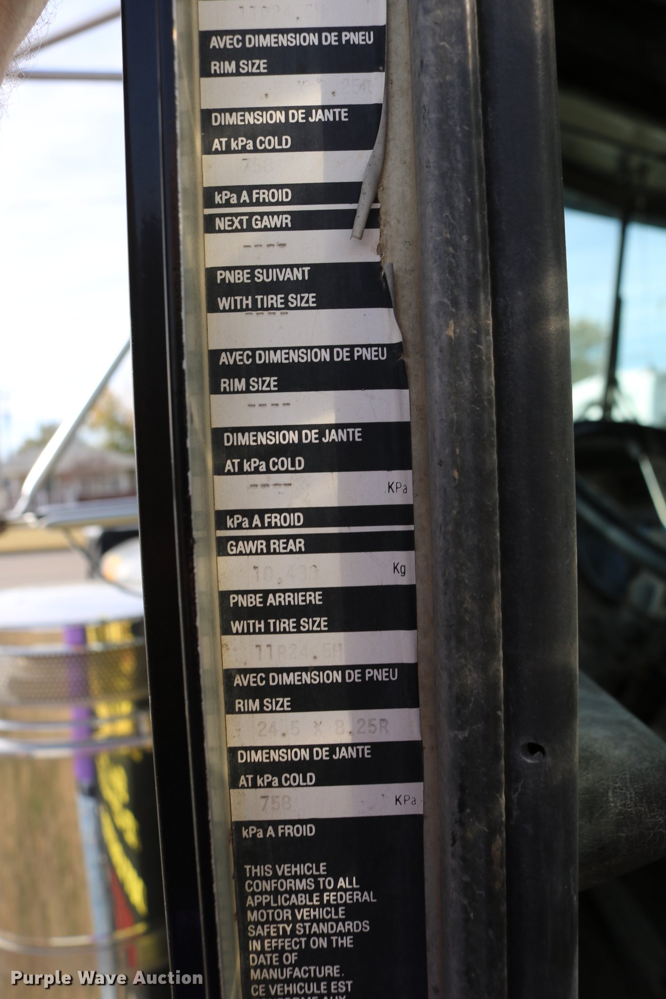 Purple Wave is selling a used Flat Bed Truck in Kansas. This item is a 1988 Kenworth LW900 flatbed truck with the following: 6,674 km on odometer, 5,109 hours on meter, Caterpillar 3406 DITA six cylinder turbo diesel engine, Eaton Fuller 1362C 13 speed manual transmission, Tandem axle, AC and heat, AM/FM/CD, Heated mirrors, Air suspension seat, Block heater, PTO, Dual exhaust stacks, Flatbed, Wood and steel floor, Headache rack, Branden winch, Tulsa winch, 18.5' gin poles, Toolboxes, Rolling tailboard, Fifth wheel plate, Trailer wiring, Outlet broken, Dual fuel tanks, Spring over walking beam suspension, Air brakes, Approx. 276" wheelbase, 425/65R22.5 front tires, 11R22.5 rear tires, GVWR 29,031 lbs, FAWR 9,165 lbs, IAWR 10,433 lbs, RAWR 10,433 lbs, Low air pressure light on, No power steering, One fuel tank may not be hooked up, Two air hoses disconnected by PTO