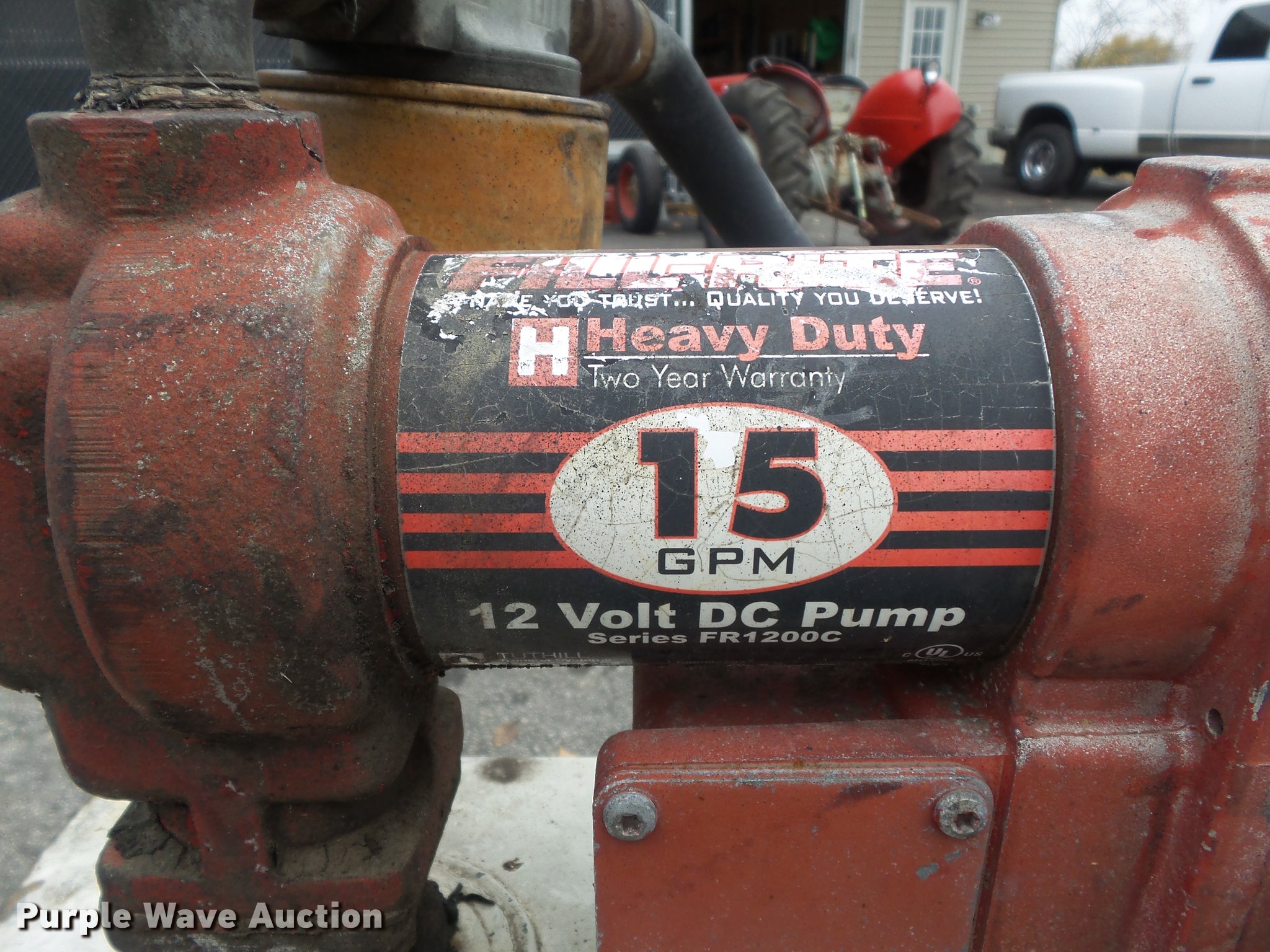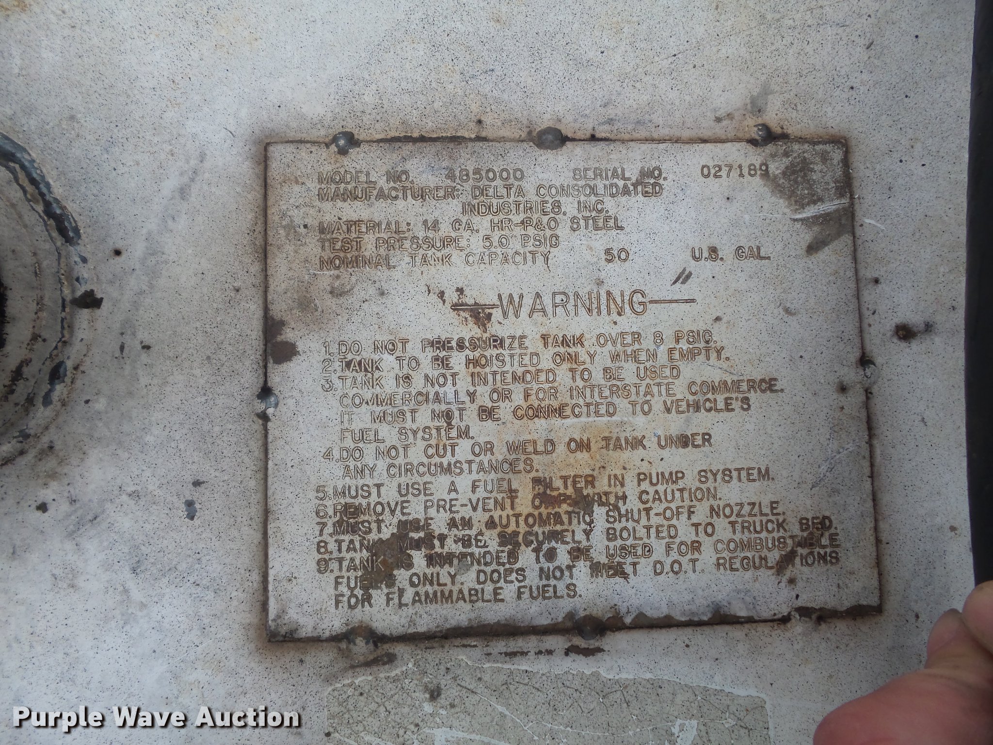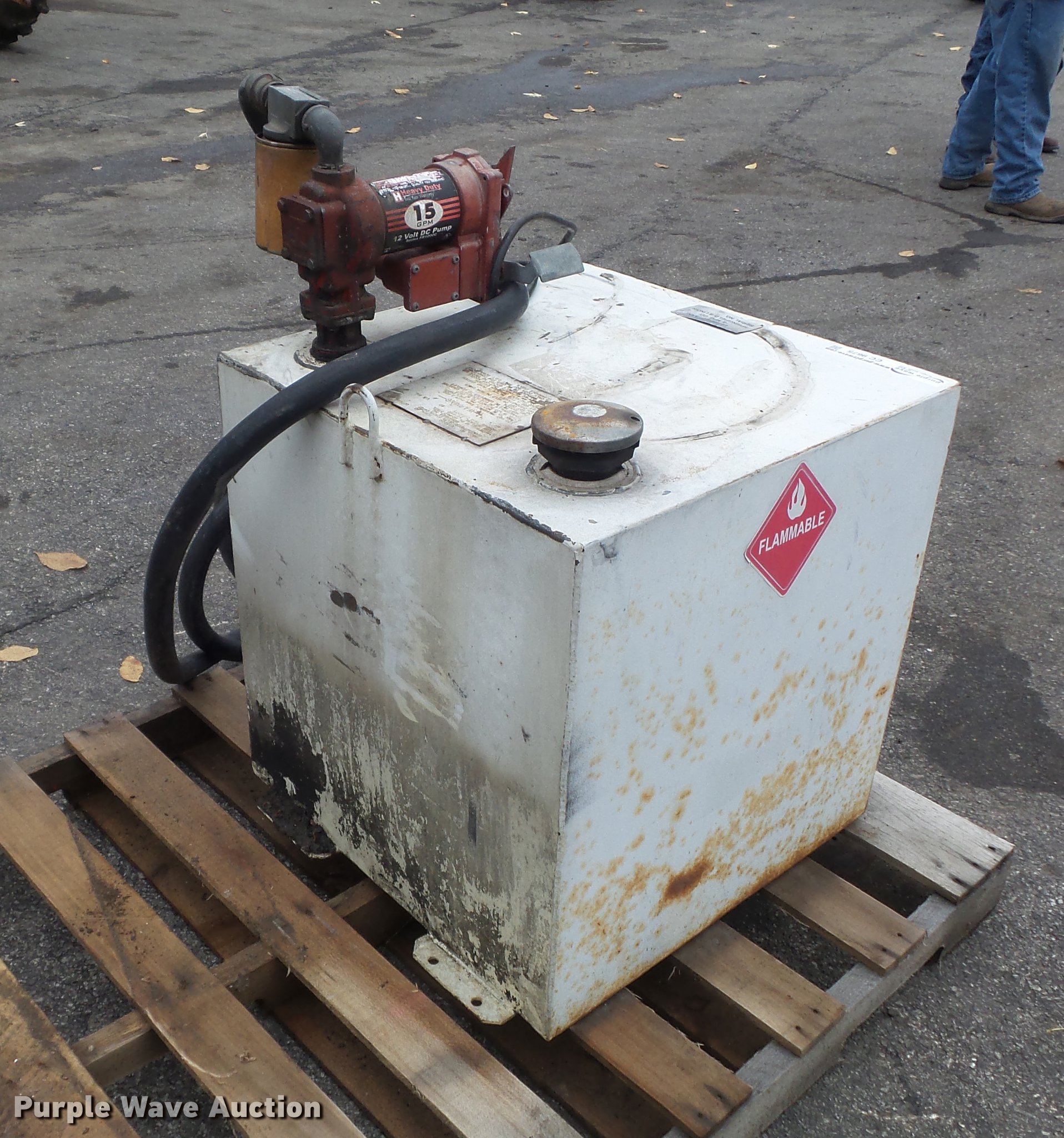 Purple Wave is selling a used Fuel and Lube in Missouri. This item is a Delta Consolidated 485000 fuel tank with the following: 23"L x 23"W x 24"H, 50 gallon capacity, 12V electric pump, 15 gpm, Serial 027189