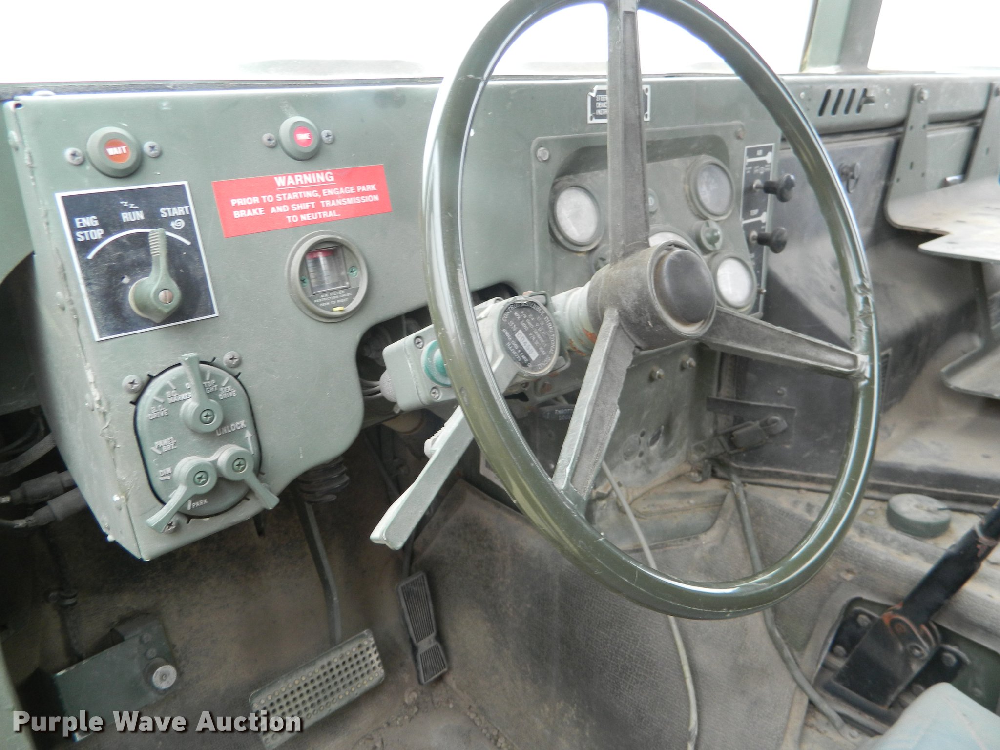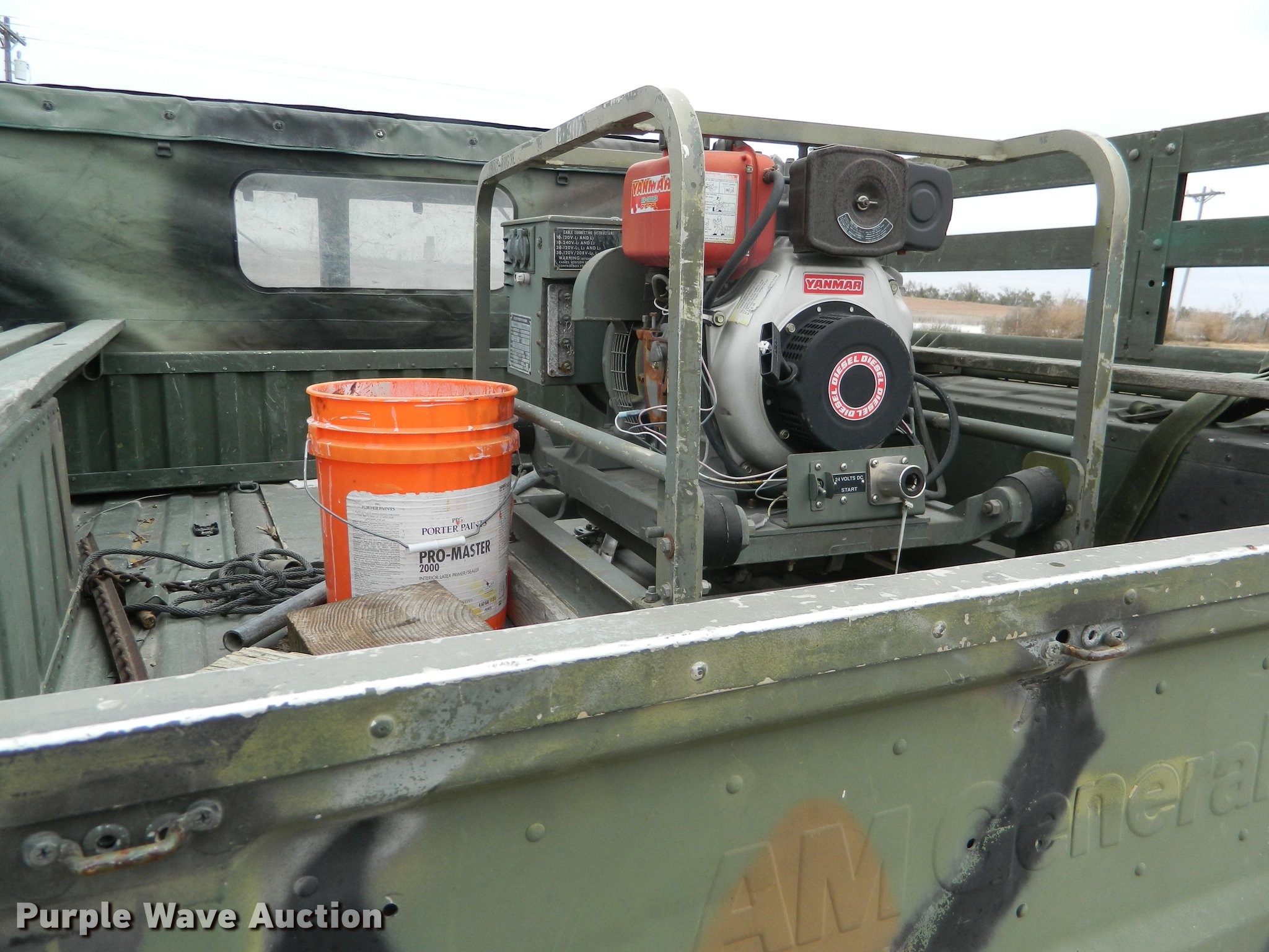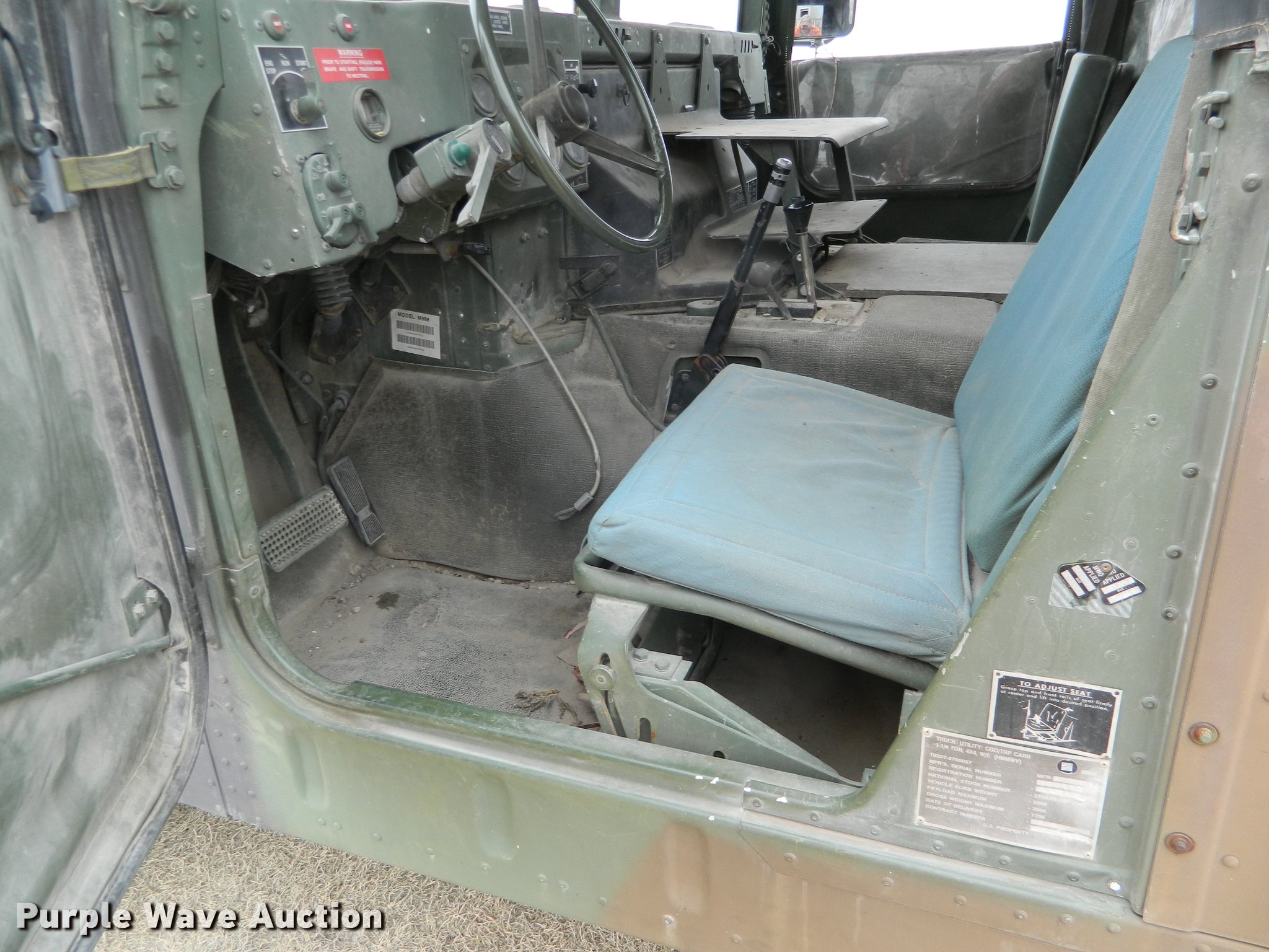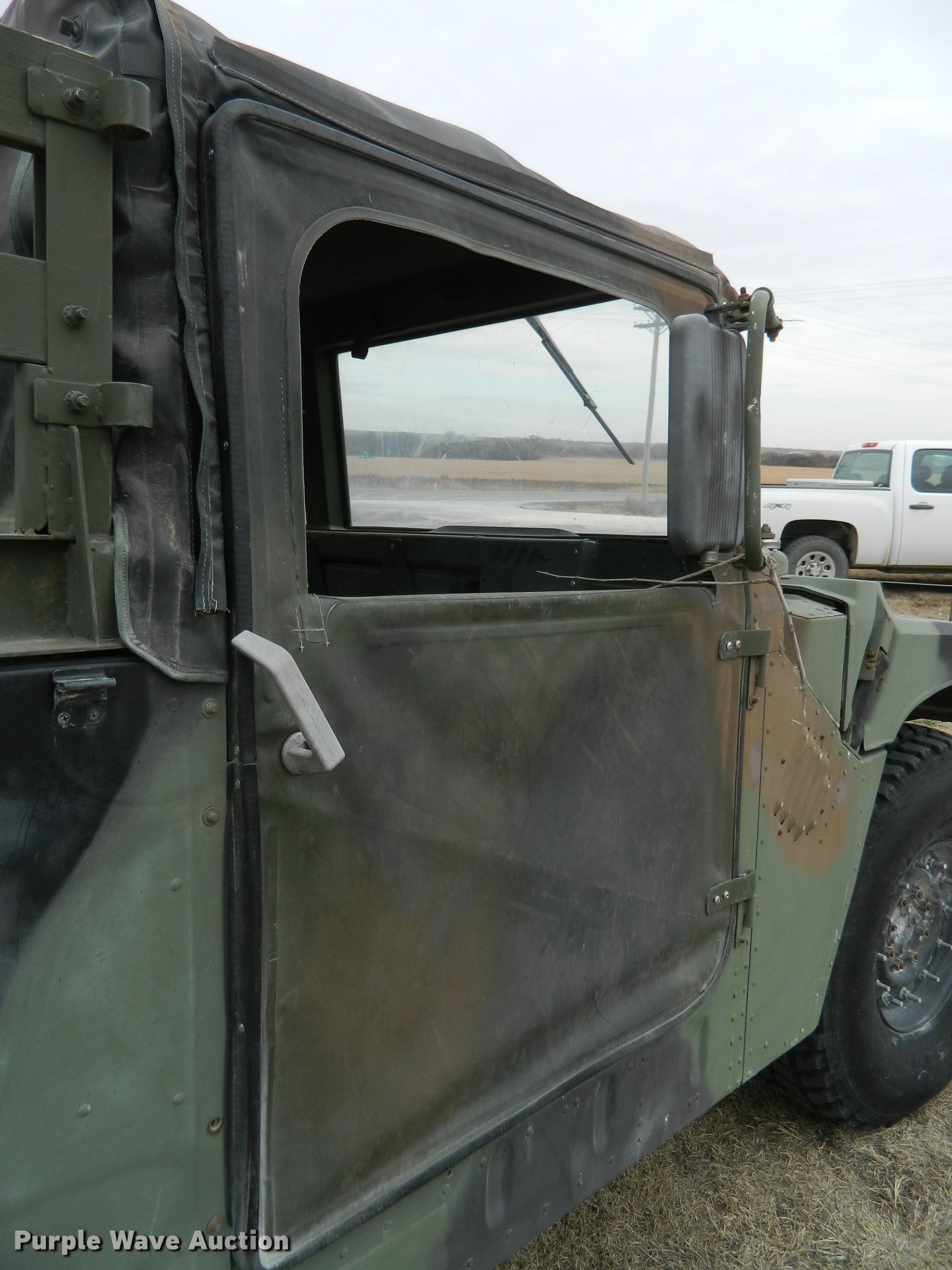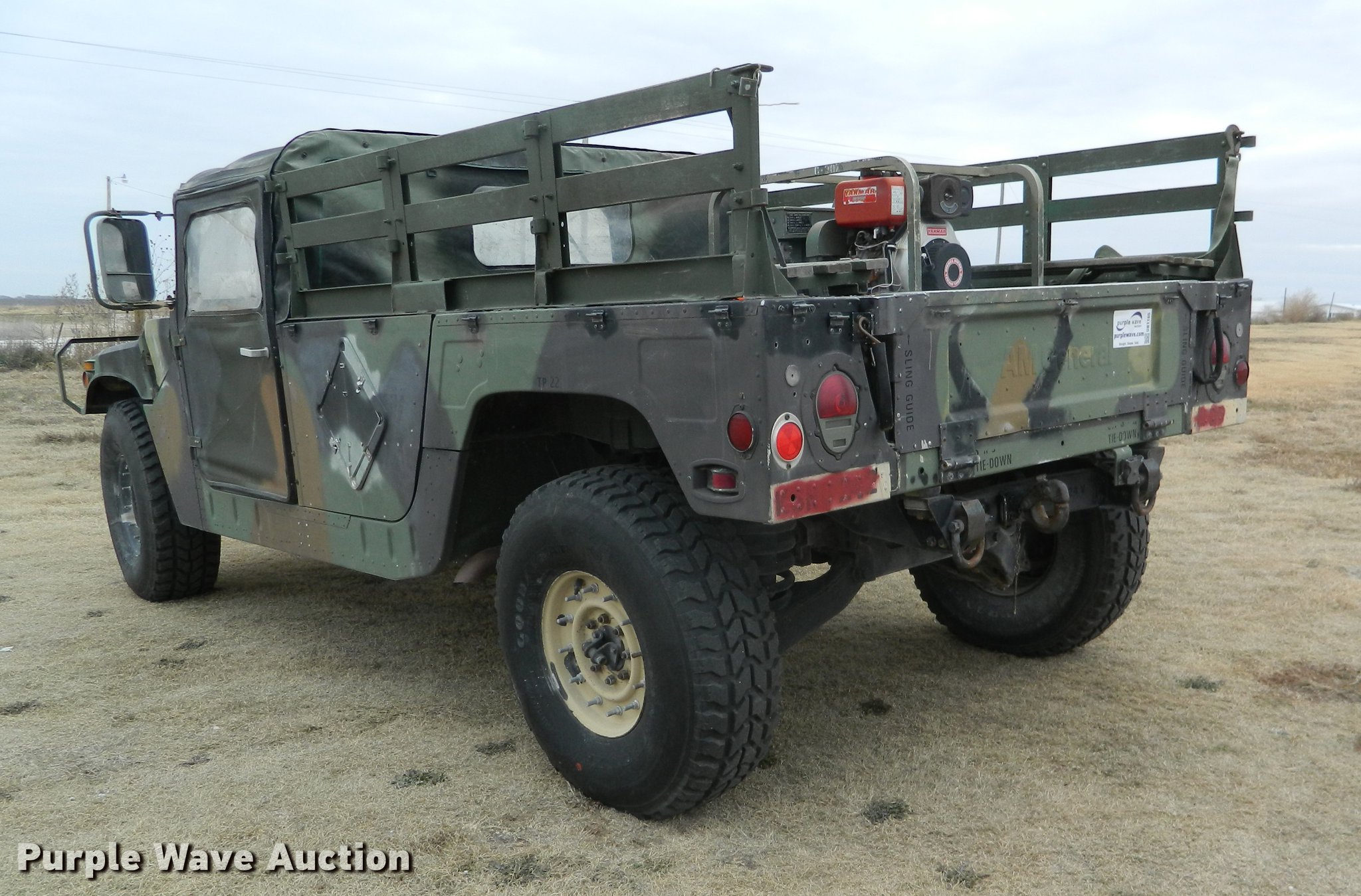 Purple Wave is selling a used 3/4 or 1 Ton Pickup or Van in Kansas. This item is a 1990 Am General M998 Humvee pickup truck with the following: 29,096 miles on odometer, 6.2L six cylinder diesel engine, Automatic transmission, Four wheel drive, Heat, Vinyl interior, Front tow hooks, Generator, 3 kW, Diesel engine, Folding seats in bed, Pintle hitch, Rear tie downs, 37x12.50R16.5 tires, Additional passenger door