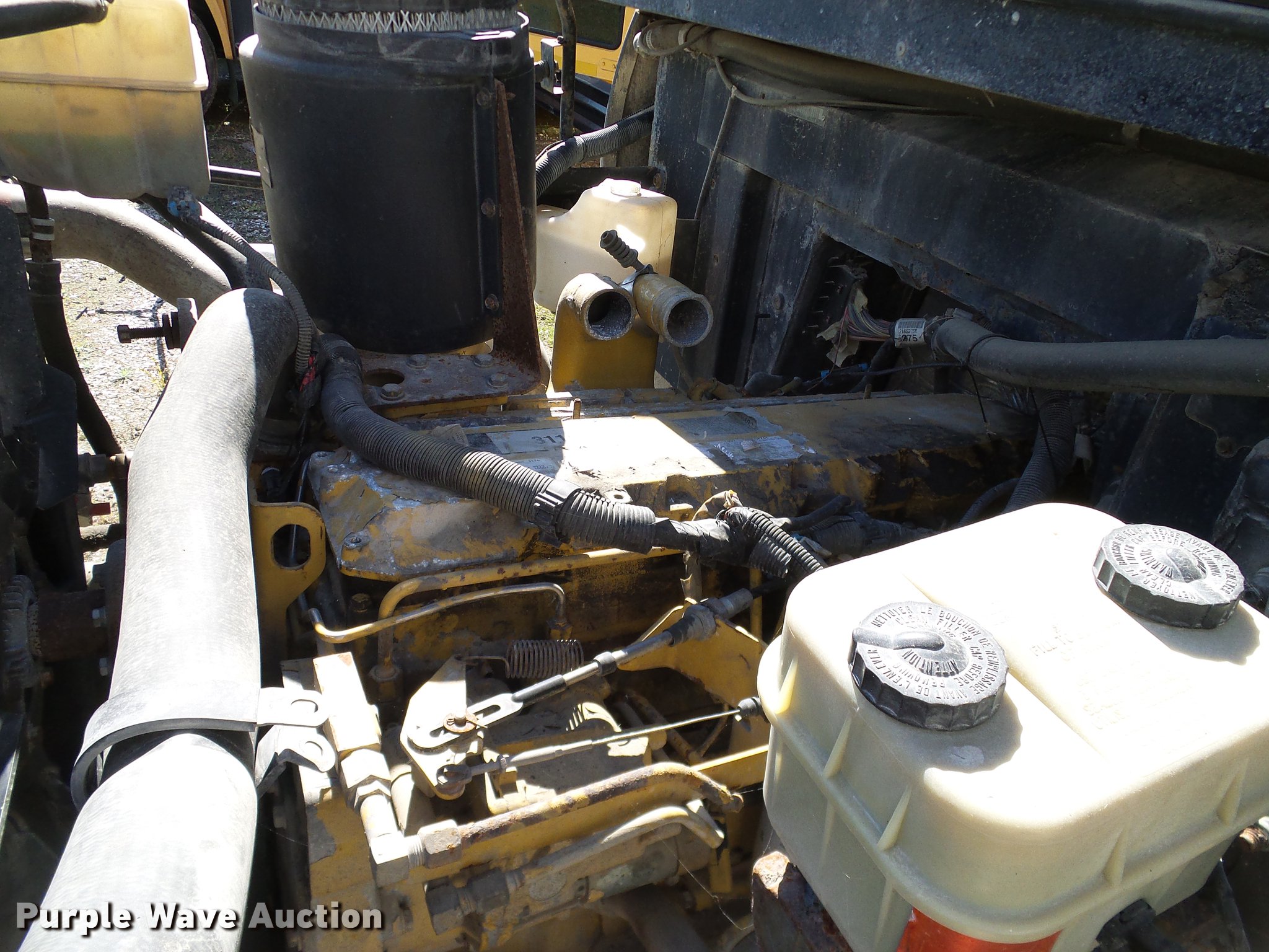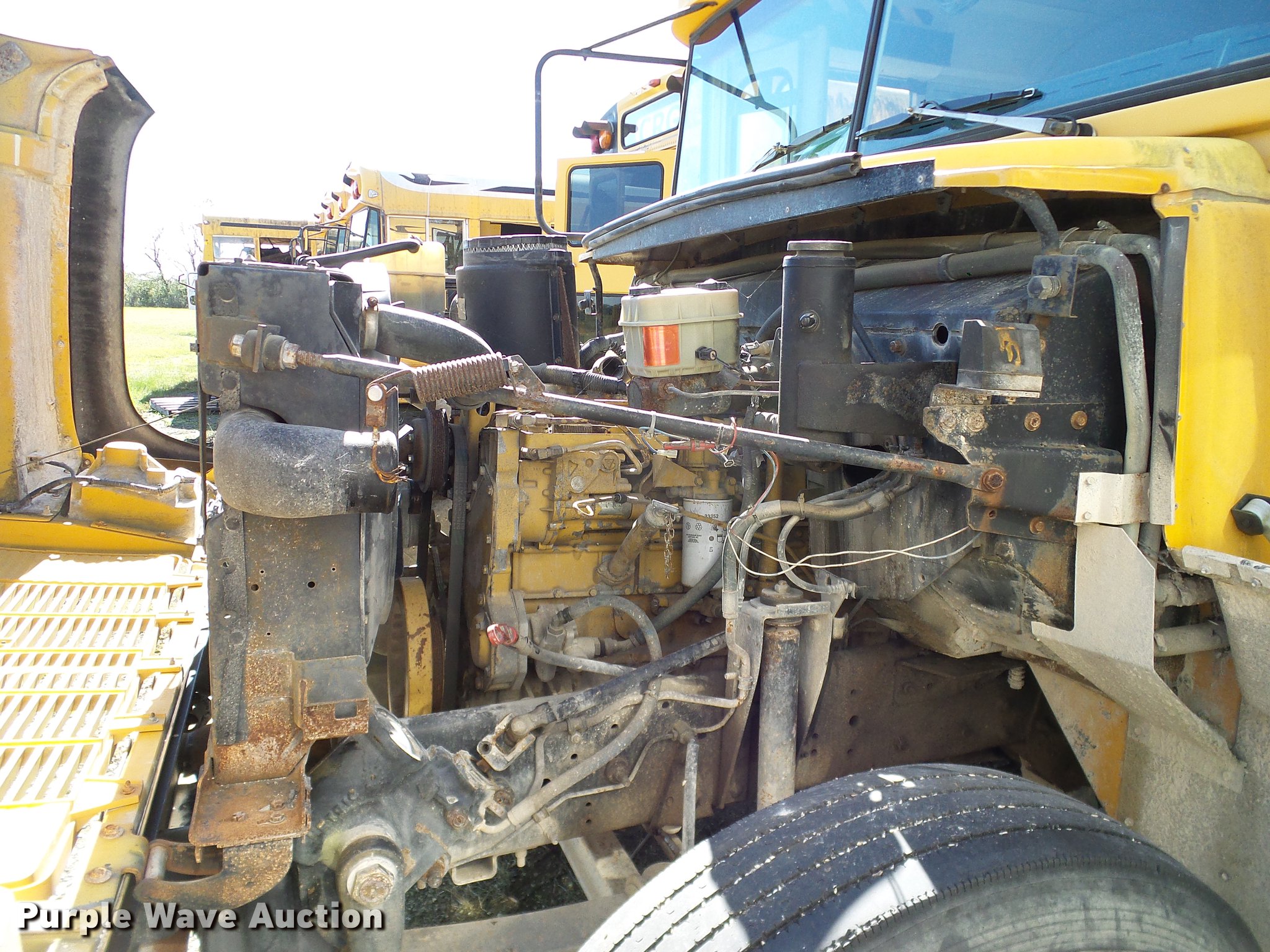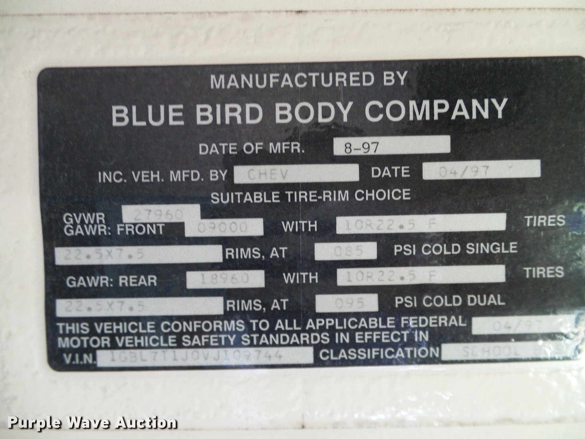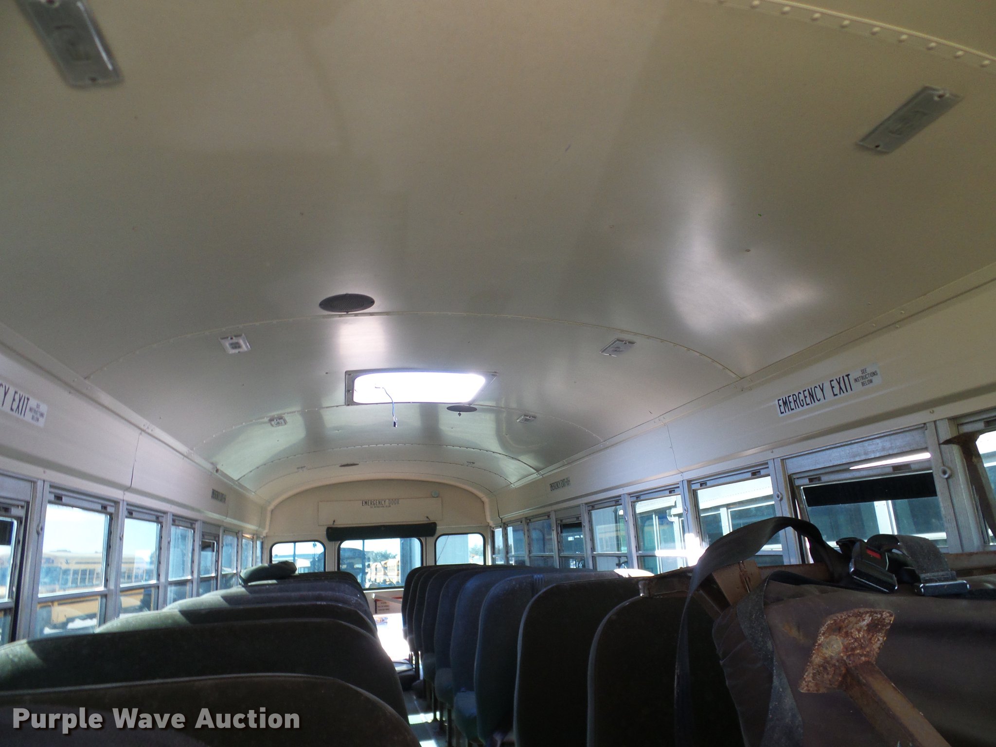 Purple Wave is selling a used Bus in Texas. This item is a 1997 Chevrolet Blue Bird school bus with the following: 141,792 miles on odometer, Caterpillar 3116 6.6L six cylinder turbo diesel engine, Automatic transmission, Single axle, 44 passenger capacity, (22) adult seats, Ceiling, rear, and side emergency exits, Spring suspension, Hydraulic brakes, 254" wheelbase, 10R22.5 tires, GVWR 27,960 lbs, Drivers seat missing, Glass cracked/missing, Non-operational unit, parts missing, Unit# B127