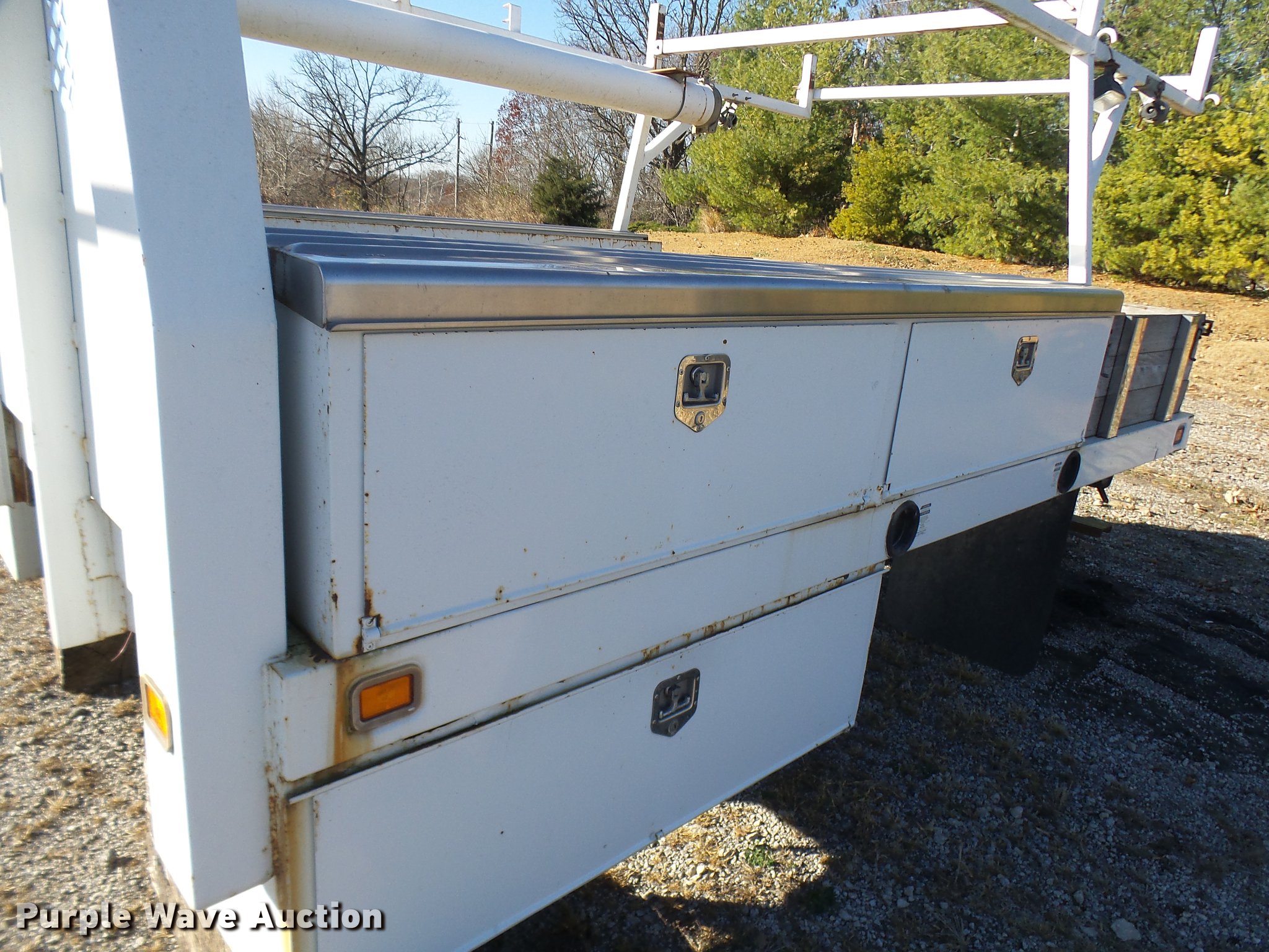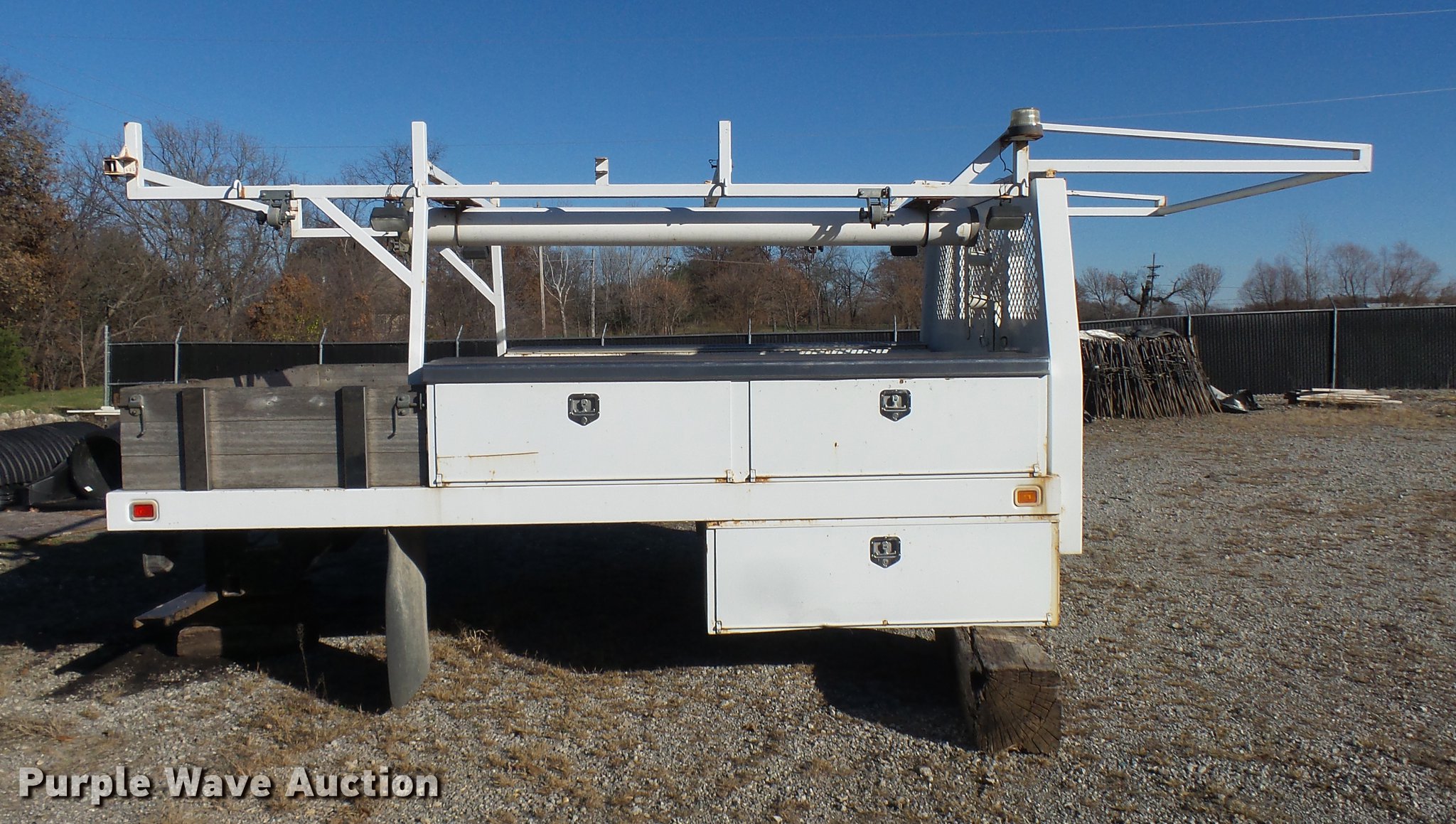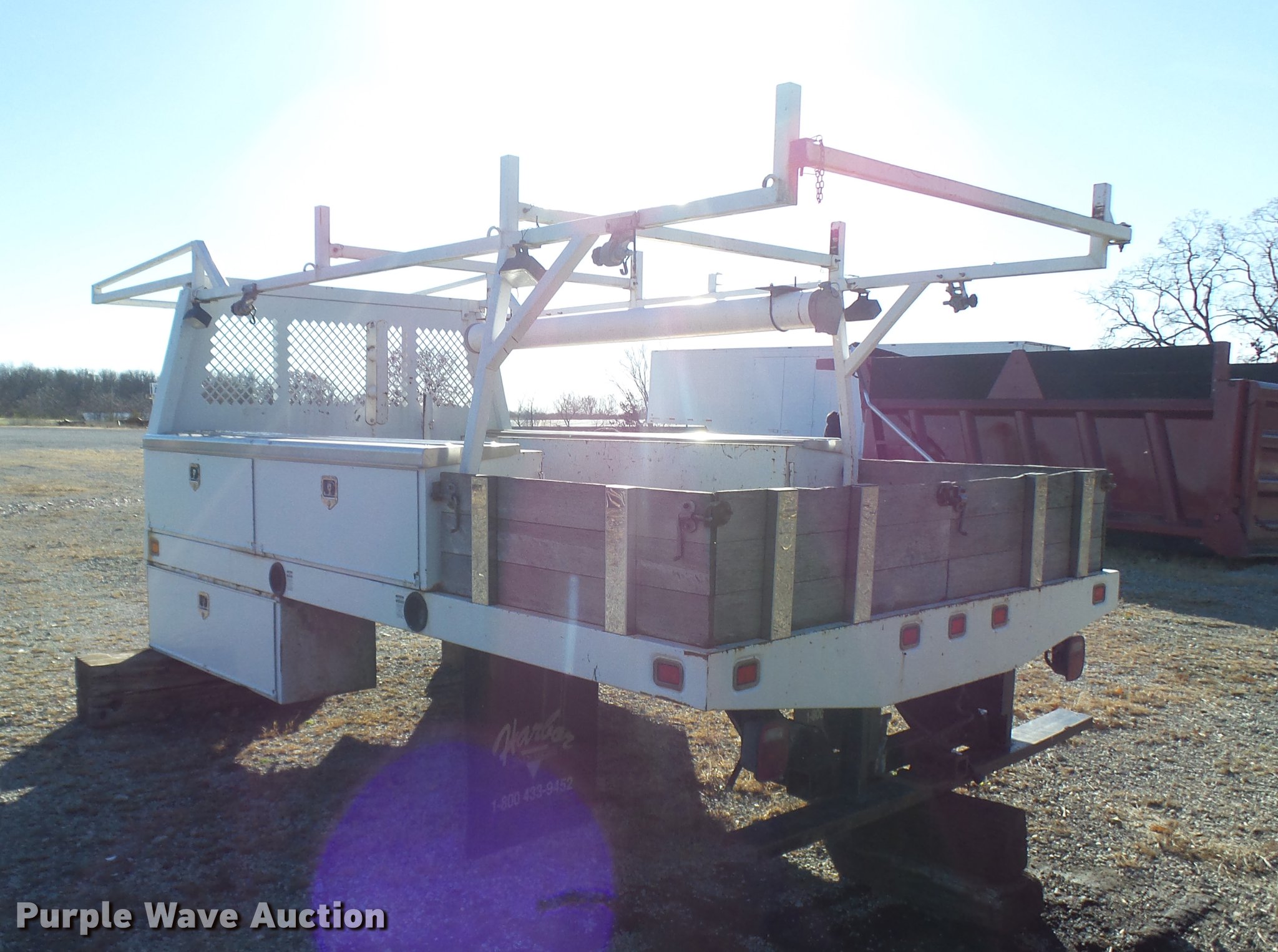 Purple Wave is selling a used Truck Part and Attach. in Missouri. This item is a 2006 Harbor truck body/Knapheide utility bed with the following: 12.5'L x 8'W, Steel floor, Headache rack, Ladder/pipe rack, (2) side storage boxes, Oxygen and acetylene tank storage, Stake pockets, Removable tailgate and sides, Receiver hitch, Drop bumper and lights, Mud flaps