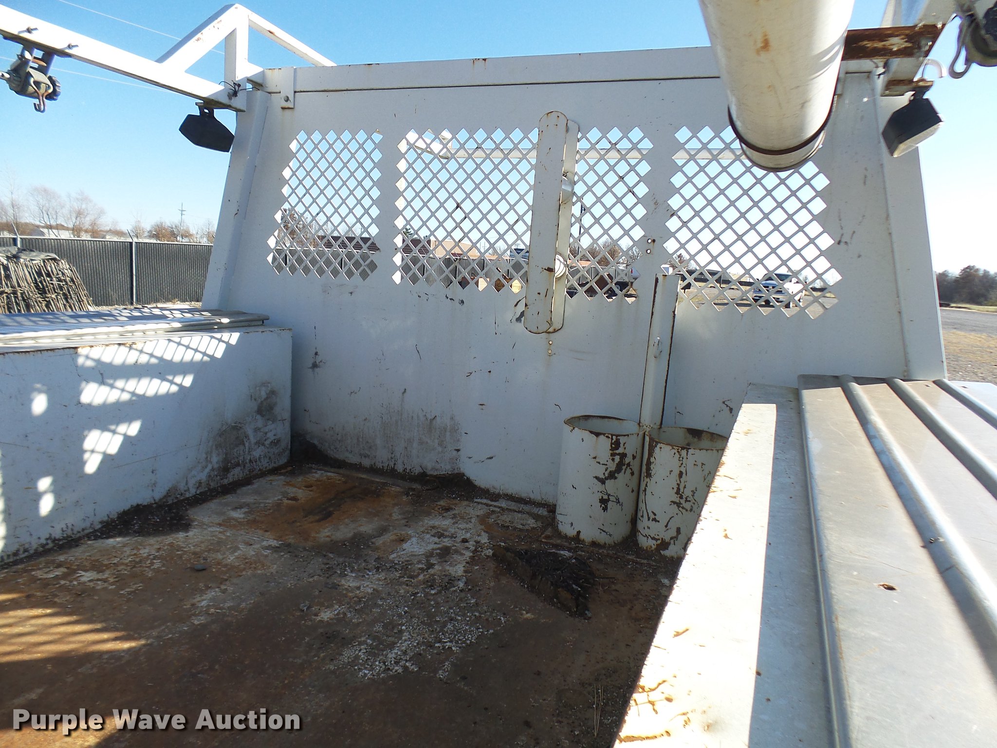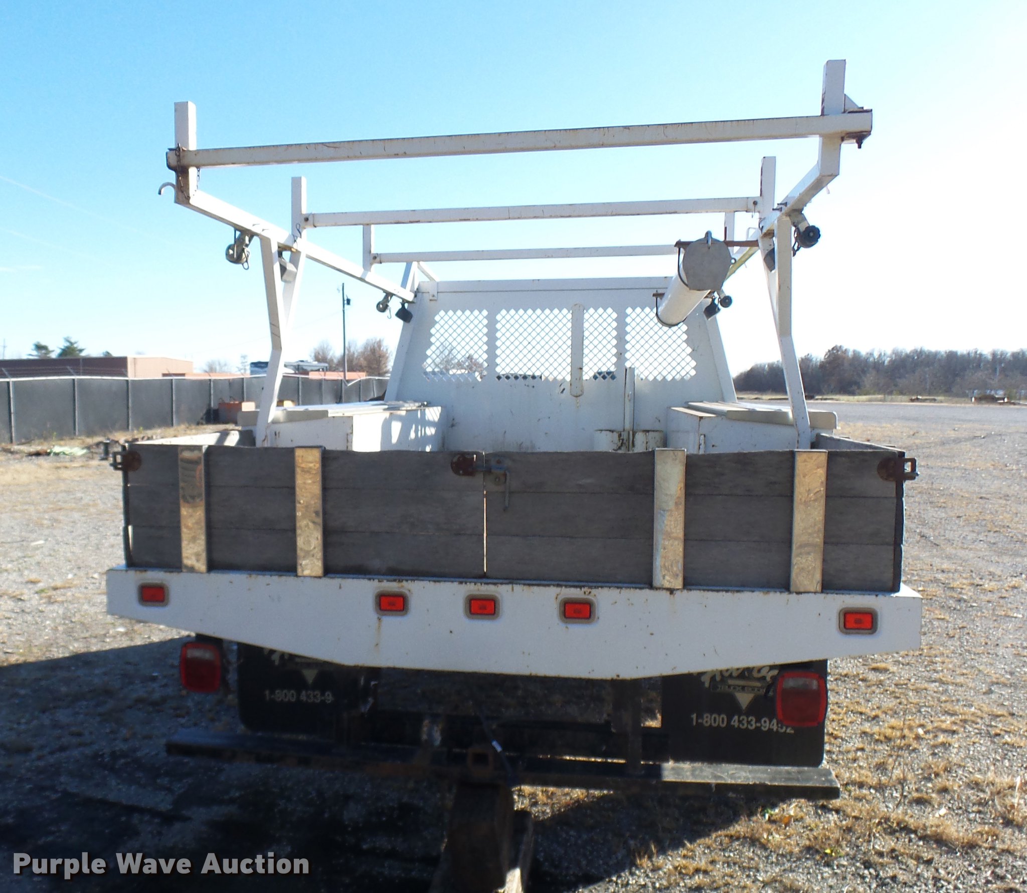 2006 Harbor truck body/Knapheide utility bed. 12.5'L x 8'W, Steel floor, Headache rack, Ladder/pipe rack, (2) side storage boxes, Oxygen and acetylene tank storage, Stake pockets, Removable tailgate and sides, Receiver hitch, Drop bumper and lights, Mud flaps. JK Concrete Construction. 15919 Kidwell Rd. Greenwood, MO 64034