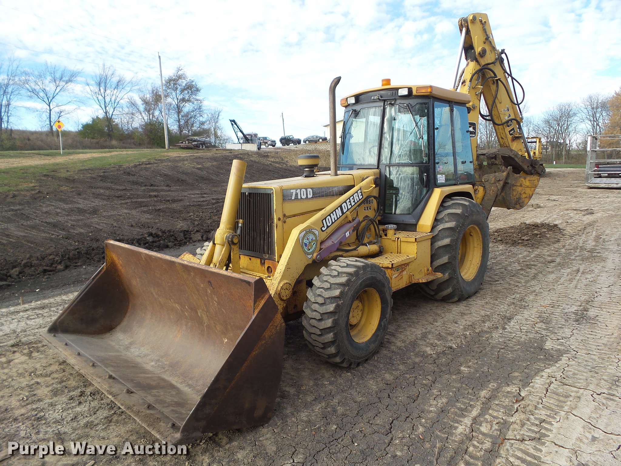 Purple Wave is selling a used Tractor Loader Backhoe in Iowa. This item is a 1995 John Deere 710D backhoe with the following: 9,801 hours on meter, Hours may vary, unit is still in use, John Deere 6059TT002 six cylinder turbo diesel engine, Serial T06059T505079, Powershift transmission, 4F-4R gears, Four wheel drive, Differential lock, EROPS, Tilt steering wheel, Suspension seat, Wipers, Front and rear work lights, John Deere AT164531 96"W loader bucket, Bolt-on cutting edge, Auxiliary hydraulics, Hydraulics capped, E-stick, Construction Products 36"W backhoe bucket, (5) teeth, Amulet M071AW mechanical thumb, Adjustable links, Serial 9813, Block heater, Ether start, Front counter weights, 15-19.5NHS front tires, 21L-28 rear tires, Serial T0710DJ811620