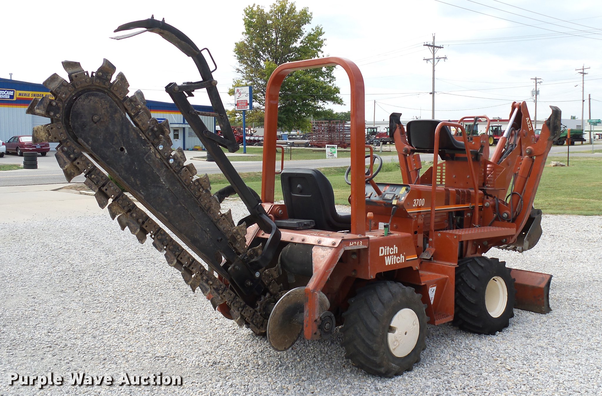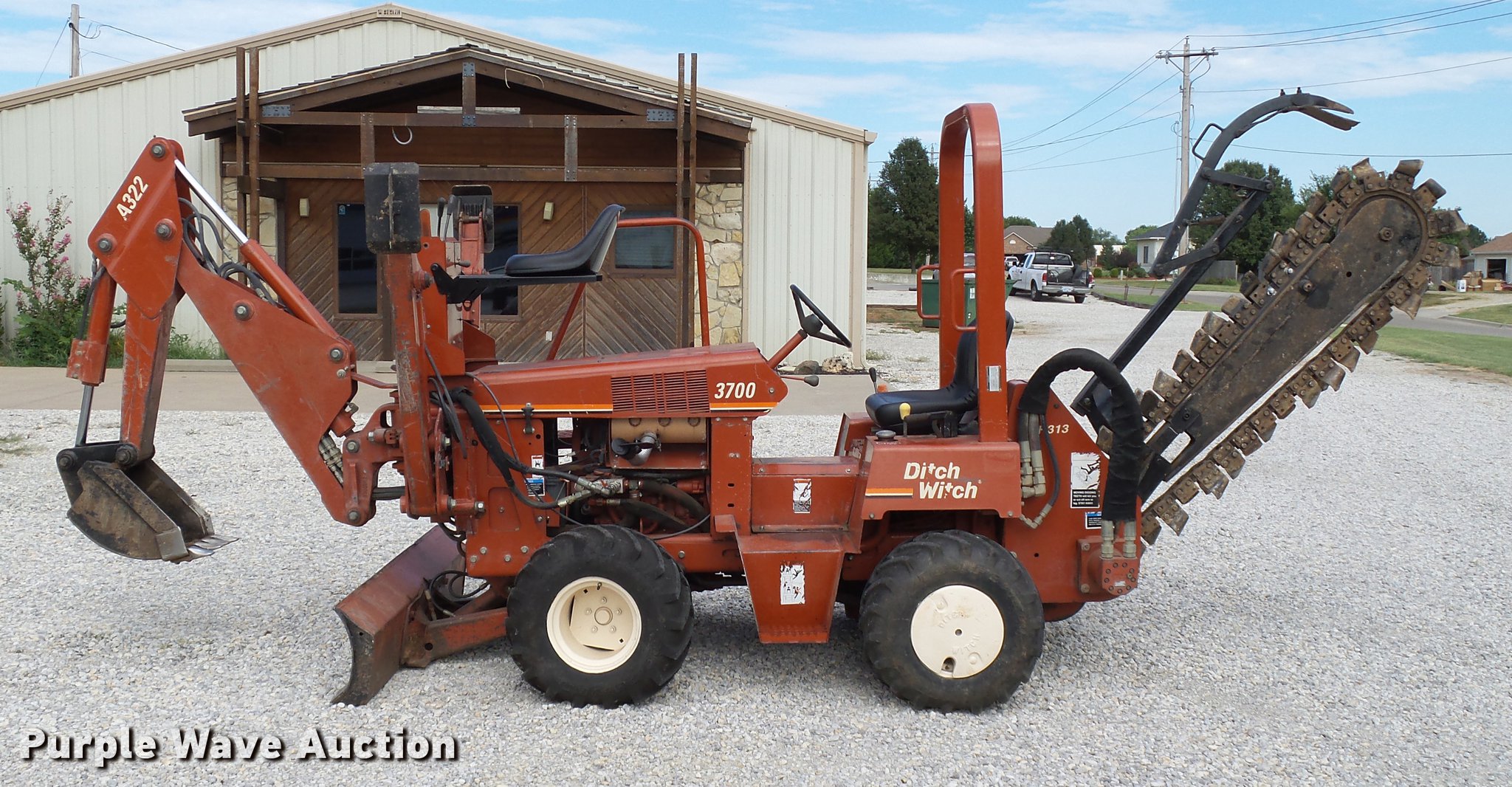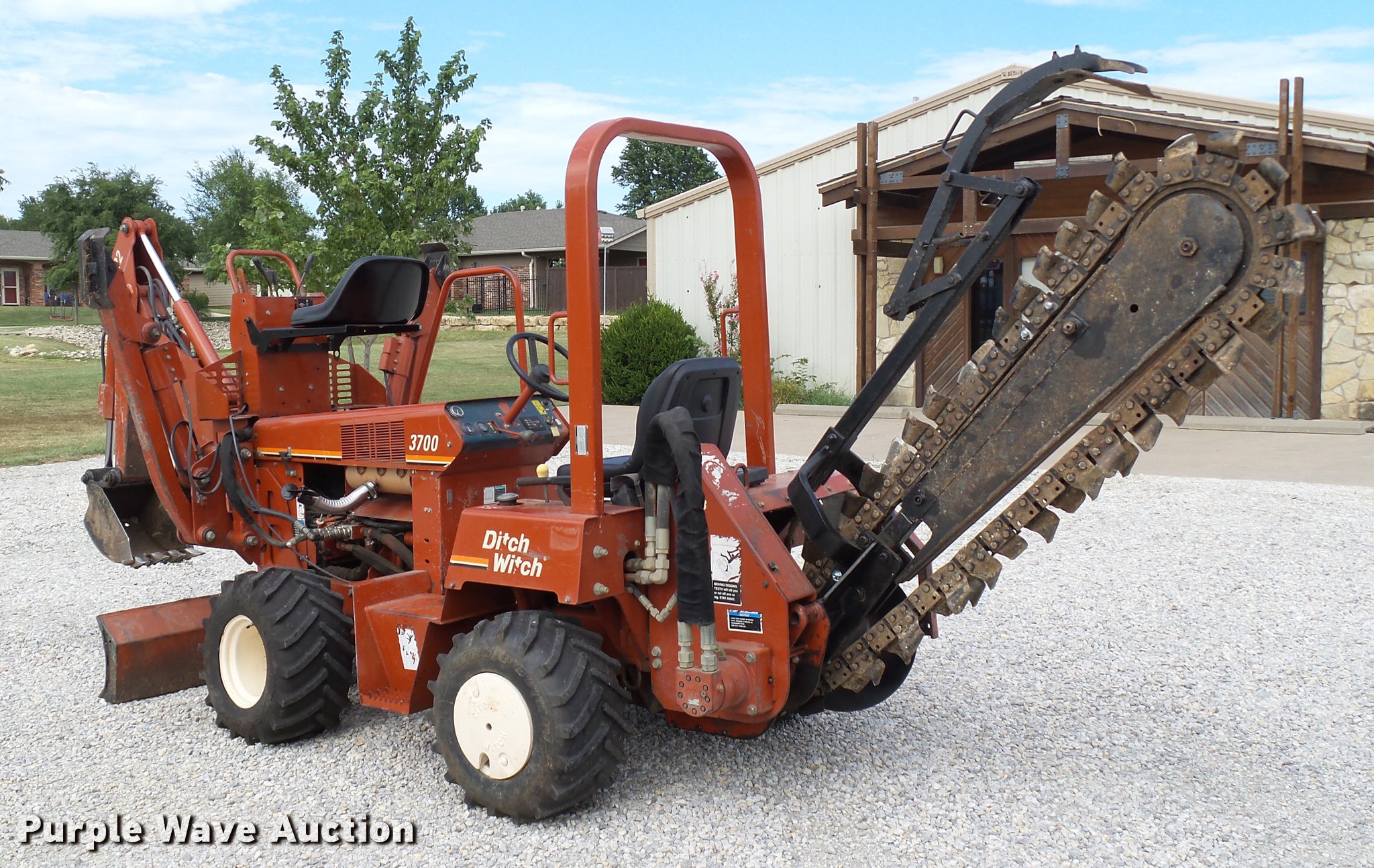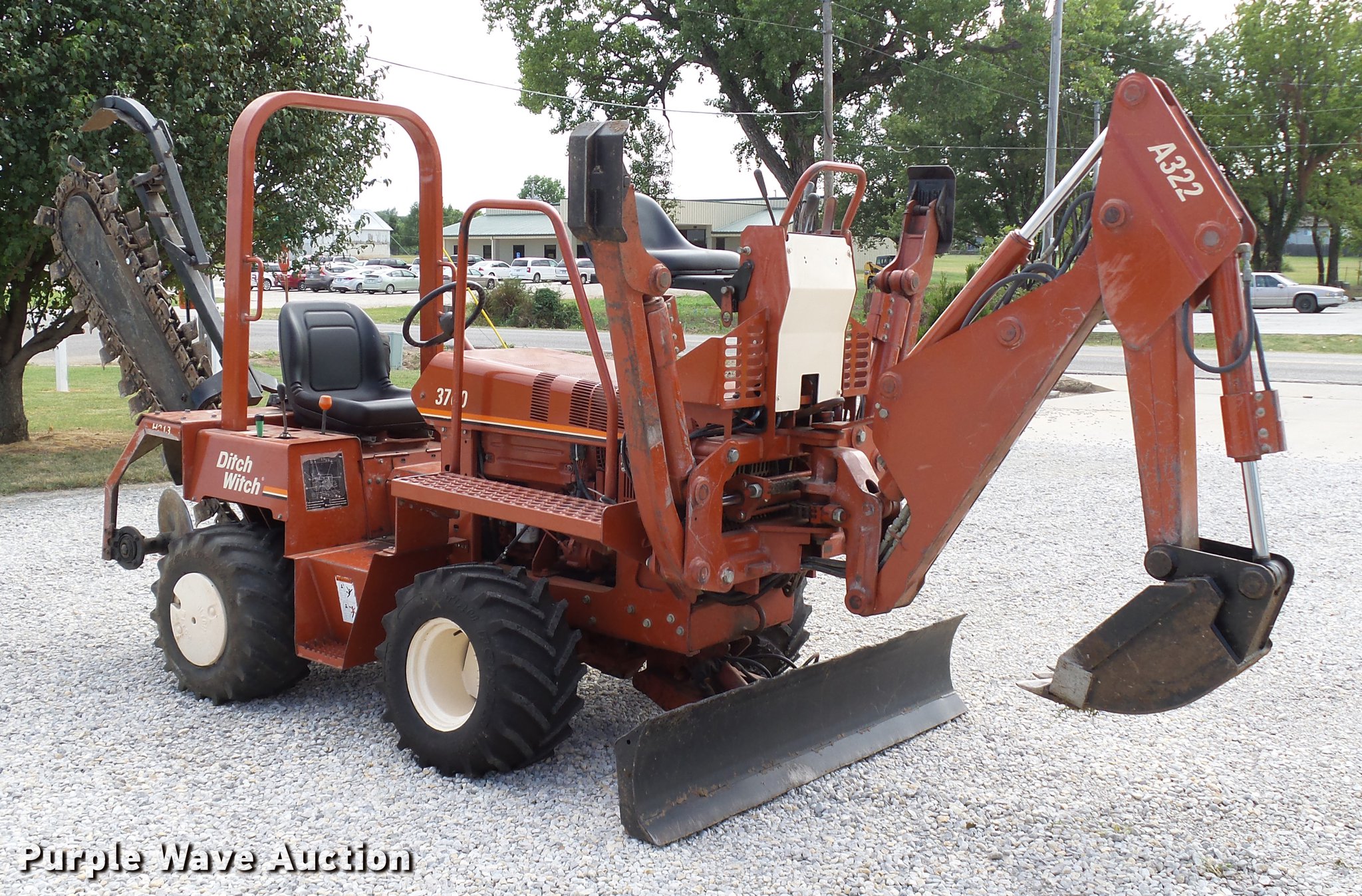 Purple Wave is selling a used Trencher or Rock Saw in Oklahoma. This item is a 2000 Ditch Witch 3700DD trencher with the following: 780 hours on meter, Deutz F3L1011F three cylinder diesel engine, 45 HP, Serial 00447673, Hydrostatic transmission, Four wheel drive, Auxiliary hydraulic connections, Two Post ROPS bar, H313 trencher, 63" trenching depth, 6" cutting width, Dirt teeth, Restraint bar, Crumber bridge, Manual crumber arch, Serial 8T0185, A322 backhoe, 72" maximum digging depth, 102" reach from pivot, 160 degree swing, 12"W bucket, (4) teeth, Serial 1T0414, 64"W four-way backfill blade, Carlisle Tru Power 26 x 12.00-12 NHS tires, Serial 3T0825