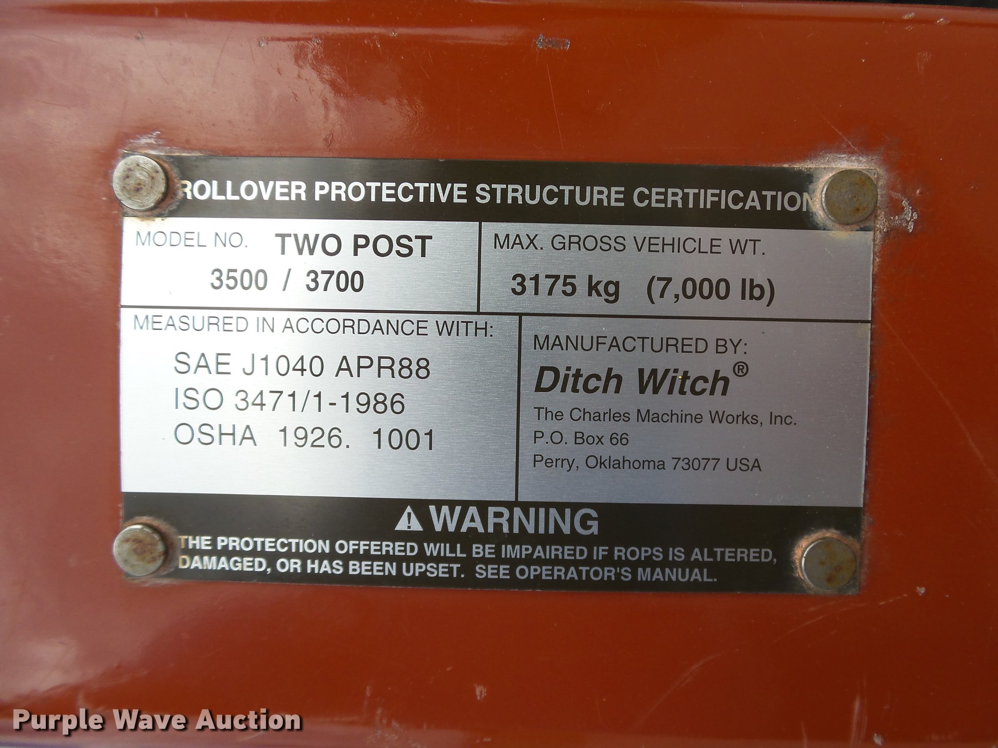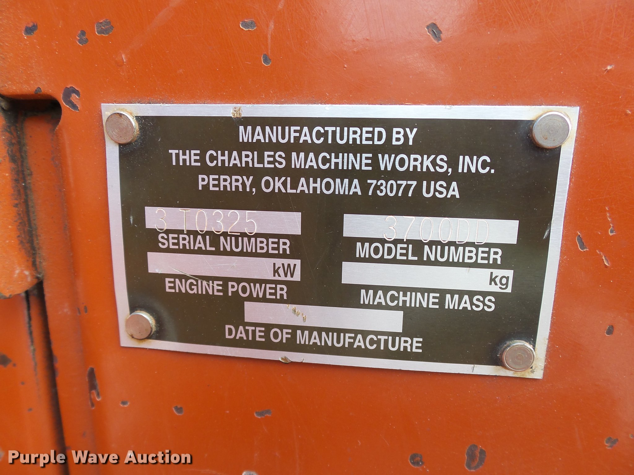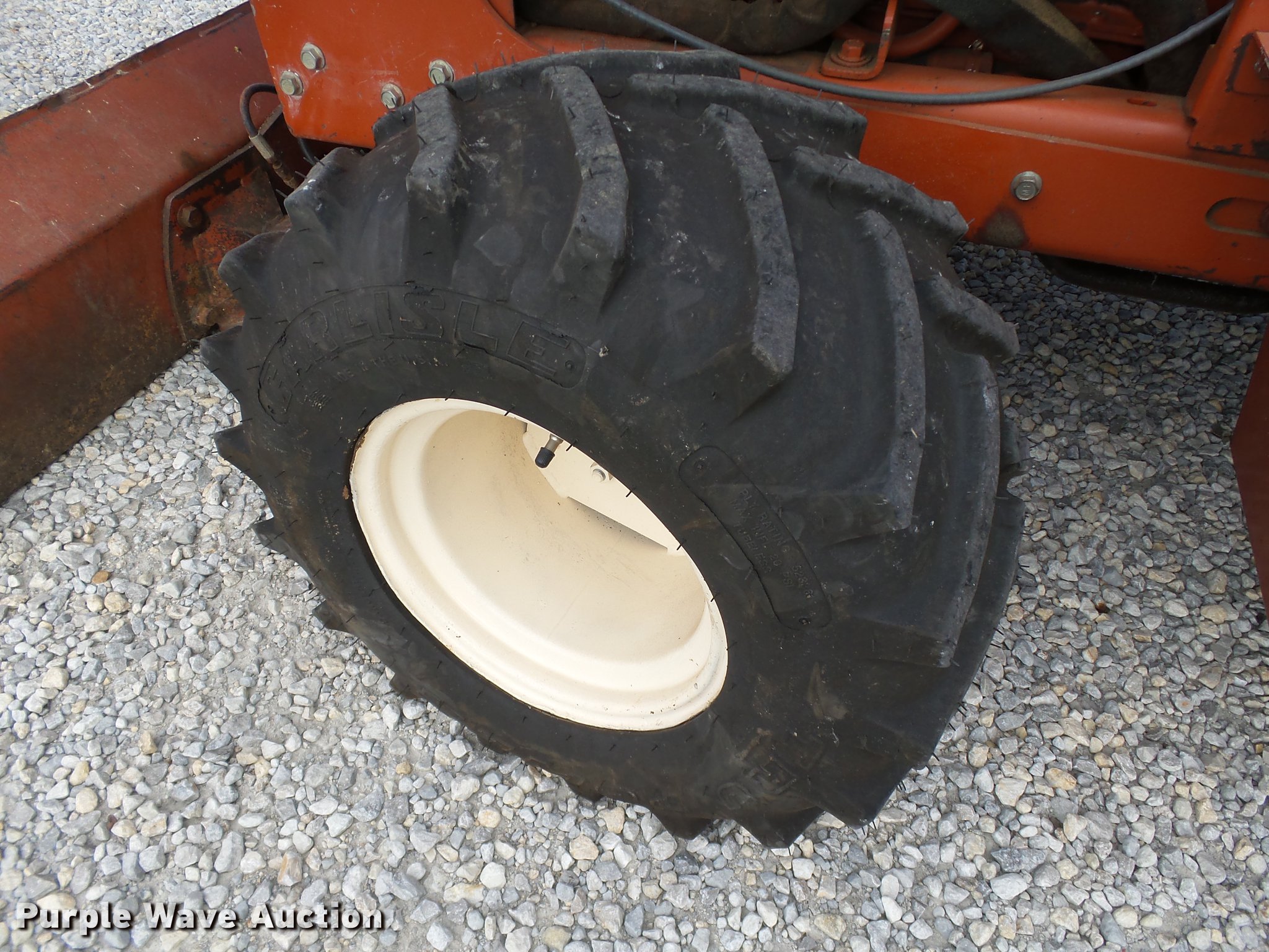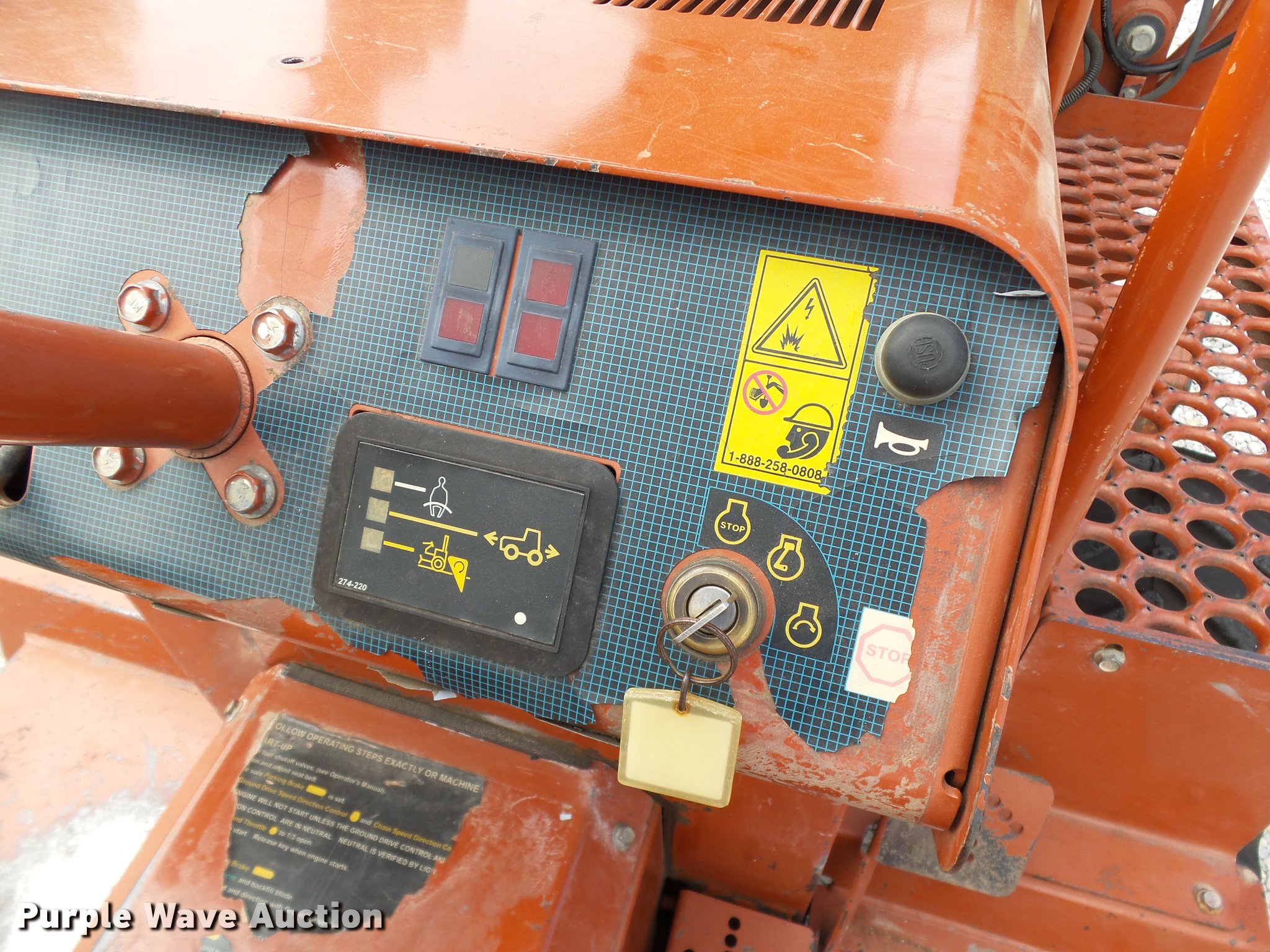 Purple Wave is selling a used Trencher or Rock Saw in Oklahoma. This item is a 2000 Ditch Witch 3700DD trencher with the following: 780 hours on meter, Deutz F3L1011F three cylinder diesel engine, 45 HP, Serial 00447673, Hydrostatic transmission, Four wheel drive, Auxiliary hydraulic connections, Two Post ROPS bar, H313 trencher, 63" trenching depth, 6" cutting width, Dirt teeth, Restraint bar, Crumber bridge, Manual crumber arch, Serial 8T0185, A322 backhoe, 72" maximum digging depth, 102" reach from pivot, 160 degree swing, 12"W bucket, (4) teeth, Serial 1T0414, 64"W four-way backfill blade, Carlisle Tru Power 26 x 12.00-12 NHS tires, Serial 3T0825