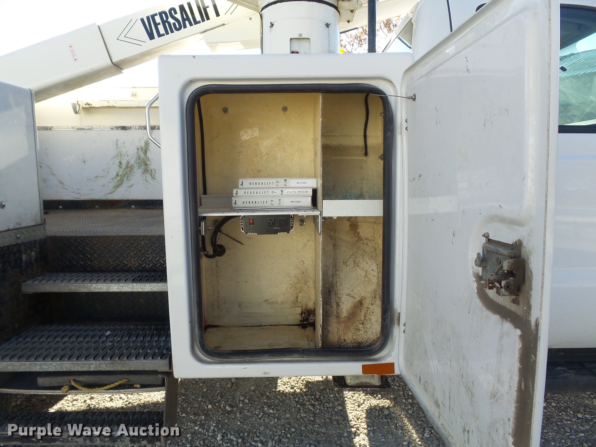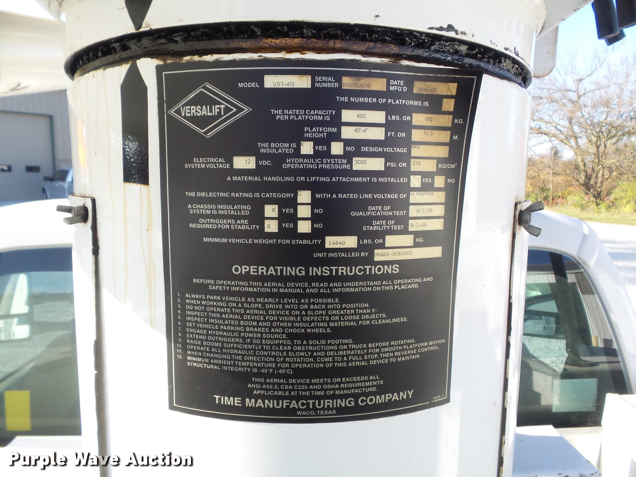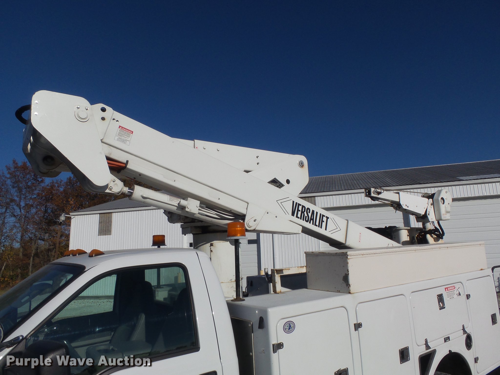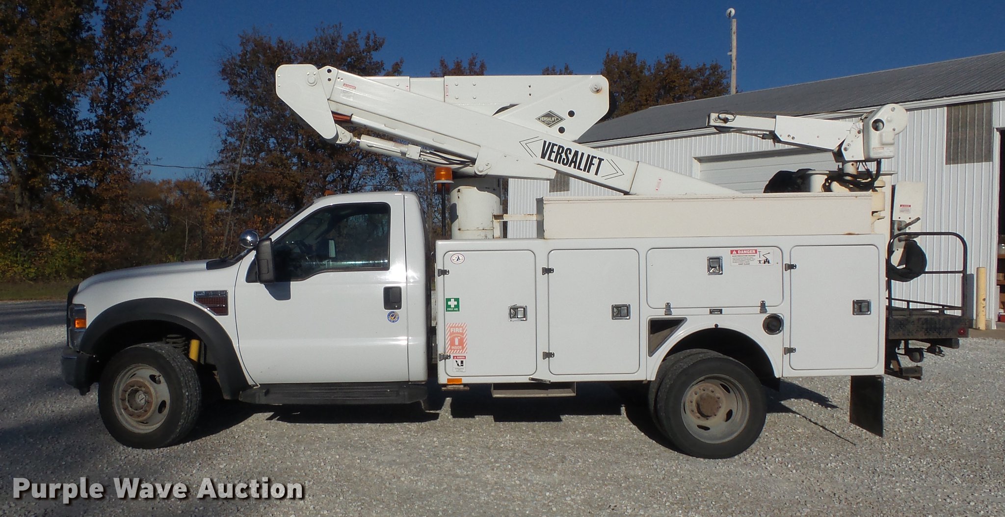 Purple Wave is selling a used Bucket Truck in Illinois. This item is a 2008 Ford F550 XL Super Duty bucket truck with the following: 192,155 miles on odometer, 6.4L V8 OHV 32V turbo diesel engine, Automatic transmission, Four wheel drive, Single axle, AC and heat, AM/FM, Trailer brake controller, Block heater, Backup alarm, Beacon light, PTO, Front tow hooks, Brand FX service bed, 11'L, Shelving, 1,200 watt power inverter, Serial 08-19014, 2008 Versalift VST-40I boom, 400 lbs maximum lift capacity, 40' maximum lift height, Man basket, Ground and platform controls, 100 degree bucket rotation, Boom rotation, Articulated, insulated, telescopic boom, Extendable jib crane, 1,000 lbs maximum lift capacity, Rope material handler, Serial KW080016, Single fuel tank, Spring suspension, Hydraulic brakes, 225/70R19.5 tires, GVWR 19,500 lbs