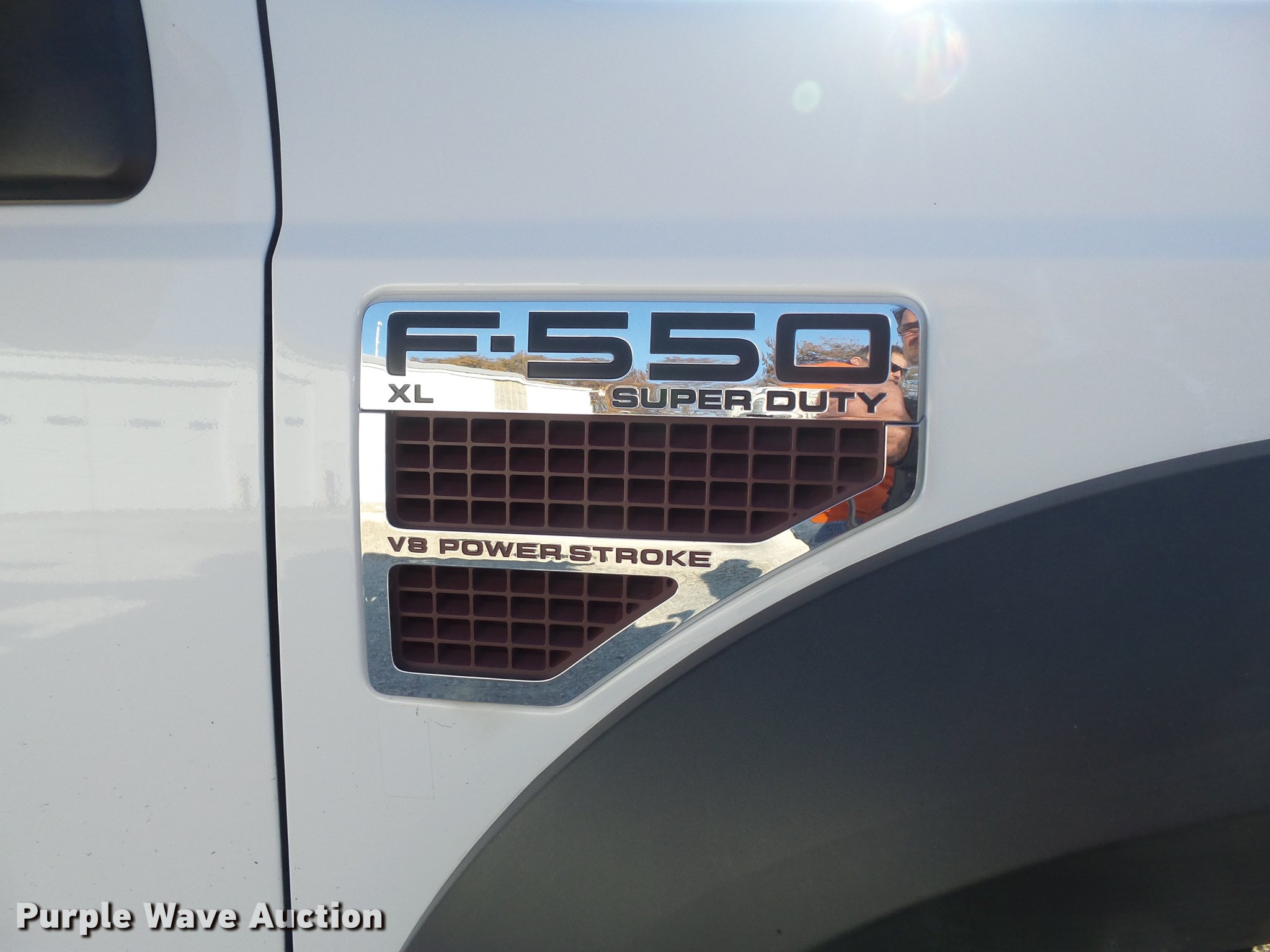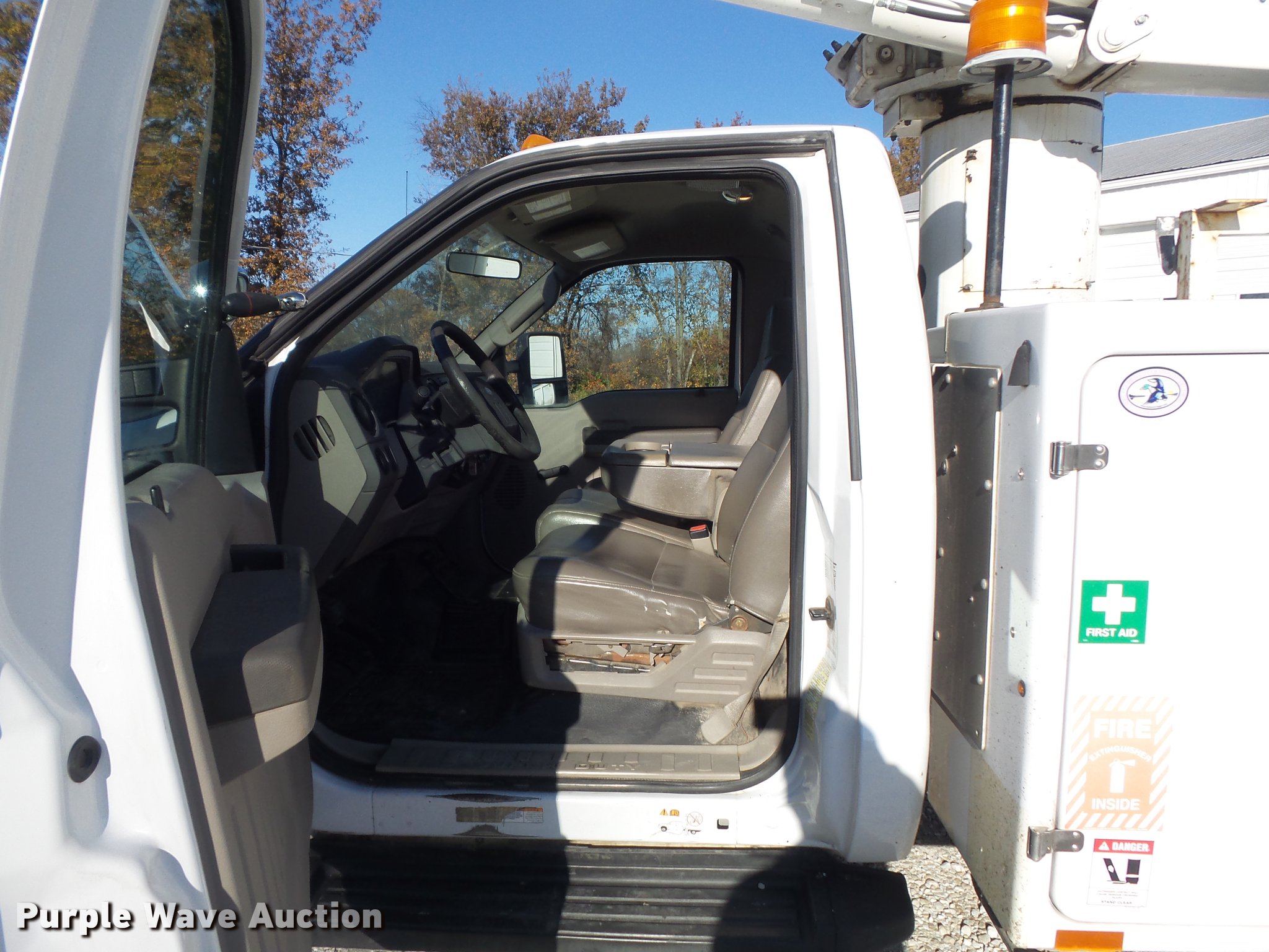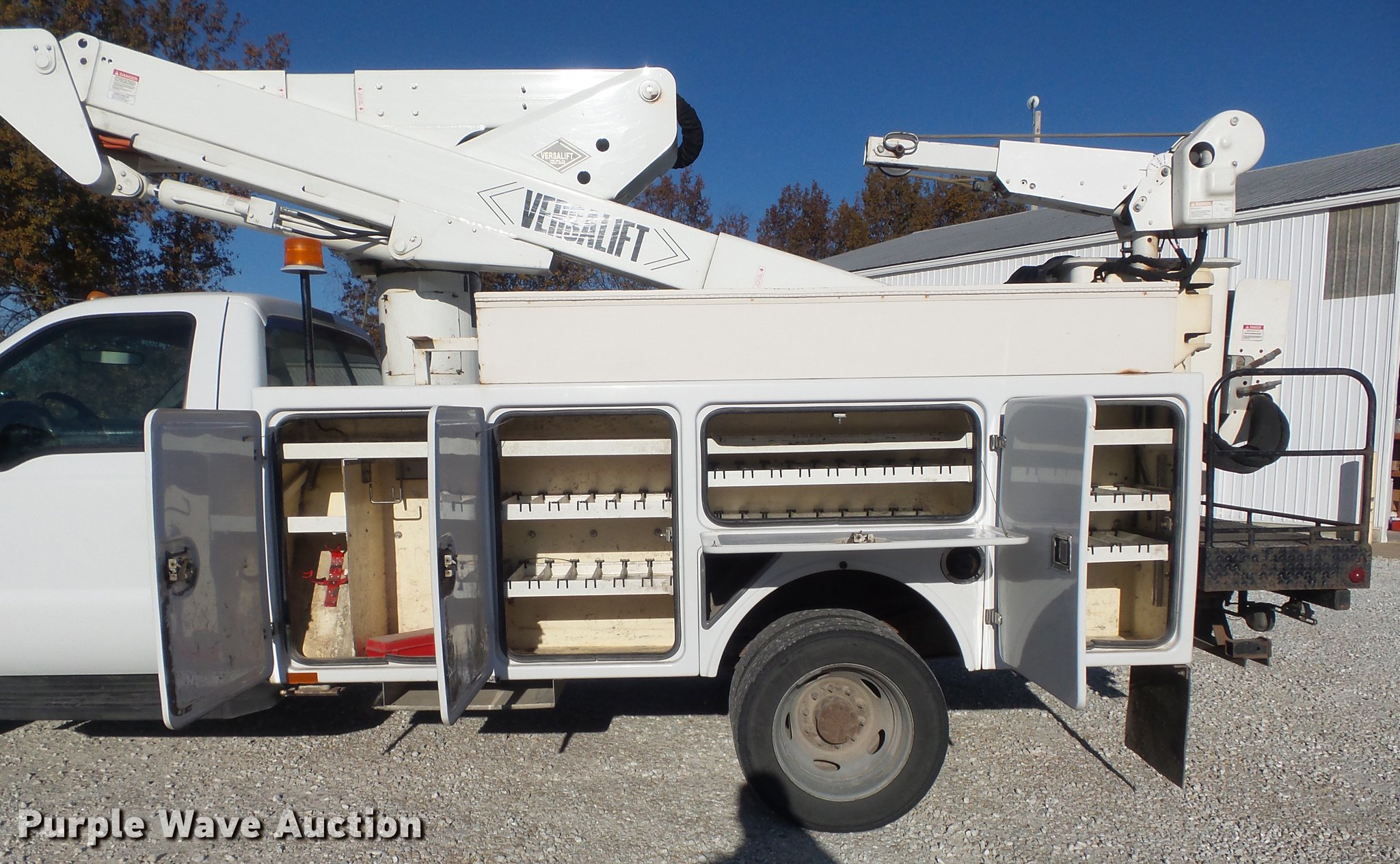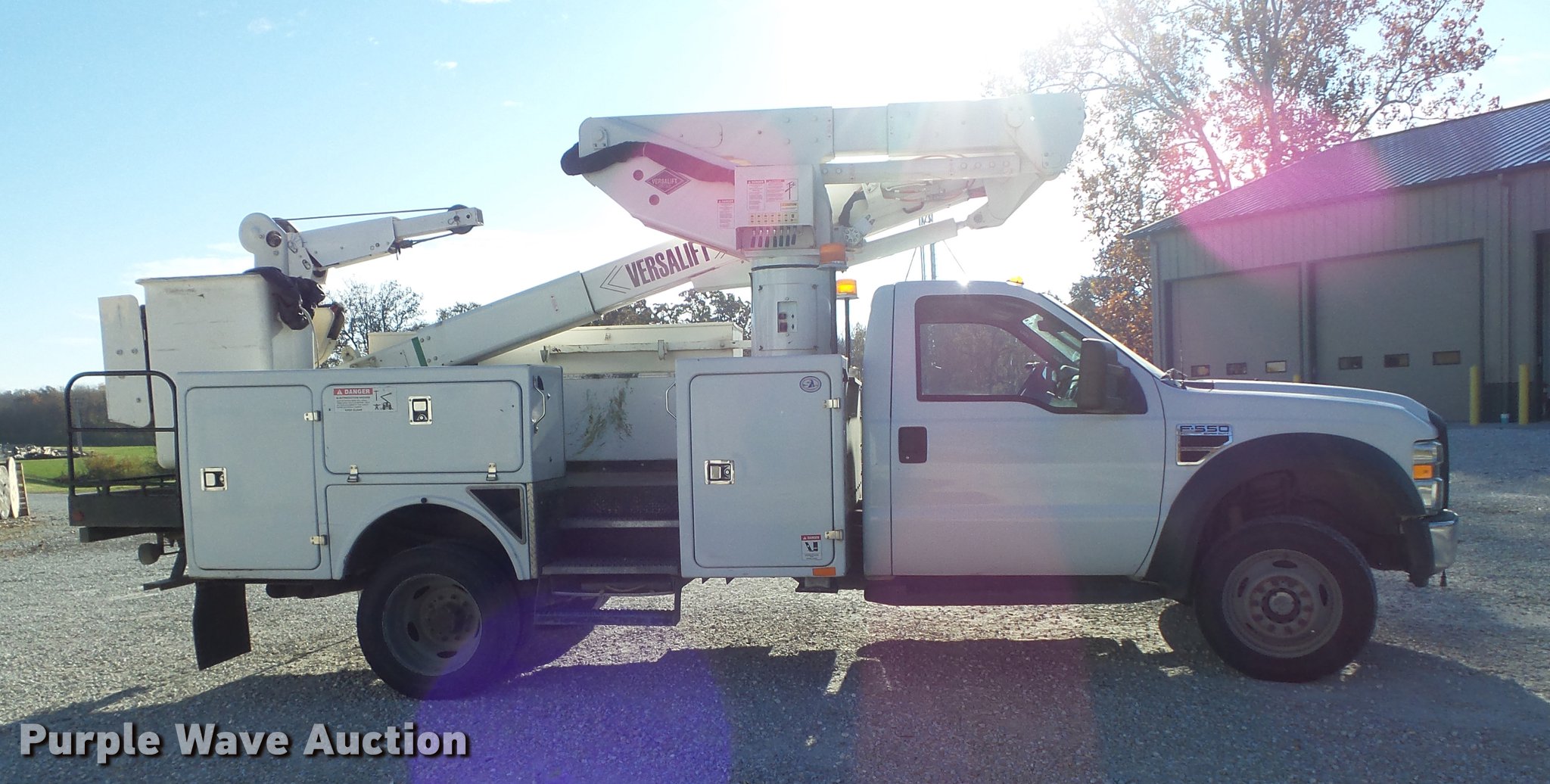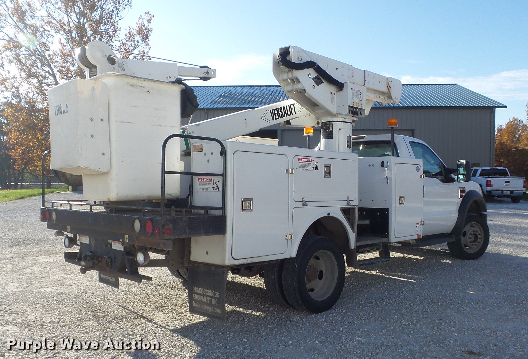 Purple Wave is selling a used Bucket Truck in Illinois. This item is a 2008 Ford F550 XL Super Duty bucket truck with the following: 192,155 miles on odometer, 6.4L V8 OHV 32V turbo diesel engine, Automatic transmission, Four wheel drive, Single axle, AC and heat, AM/FM, Trailer brake controller, Block heater, Backup alarm, Beacon light, PTO, Front tow hooks, Brand FX service bed, 11'L, Shelving, 1,200 watt power inverter, Serial 08-19014, 2008 Versalift VST-40I boom, 400 lbs maximum lift capacity, 40' maximum lift height, Man basket, Ground and platform controls, 100 degree bucket rotation, Boom rotation, Articulated, insulated, telescopic boom, Extendable jib crane, 1,000 lbs maximum lift capacity, Rope material handler, Serial KW080016, Single fuel tank, Spring suspension, Hydraulic brakes, 225/70R19.5 tires, GVWR 19,500 lbs