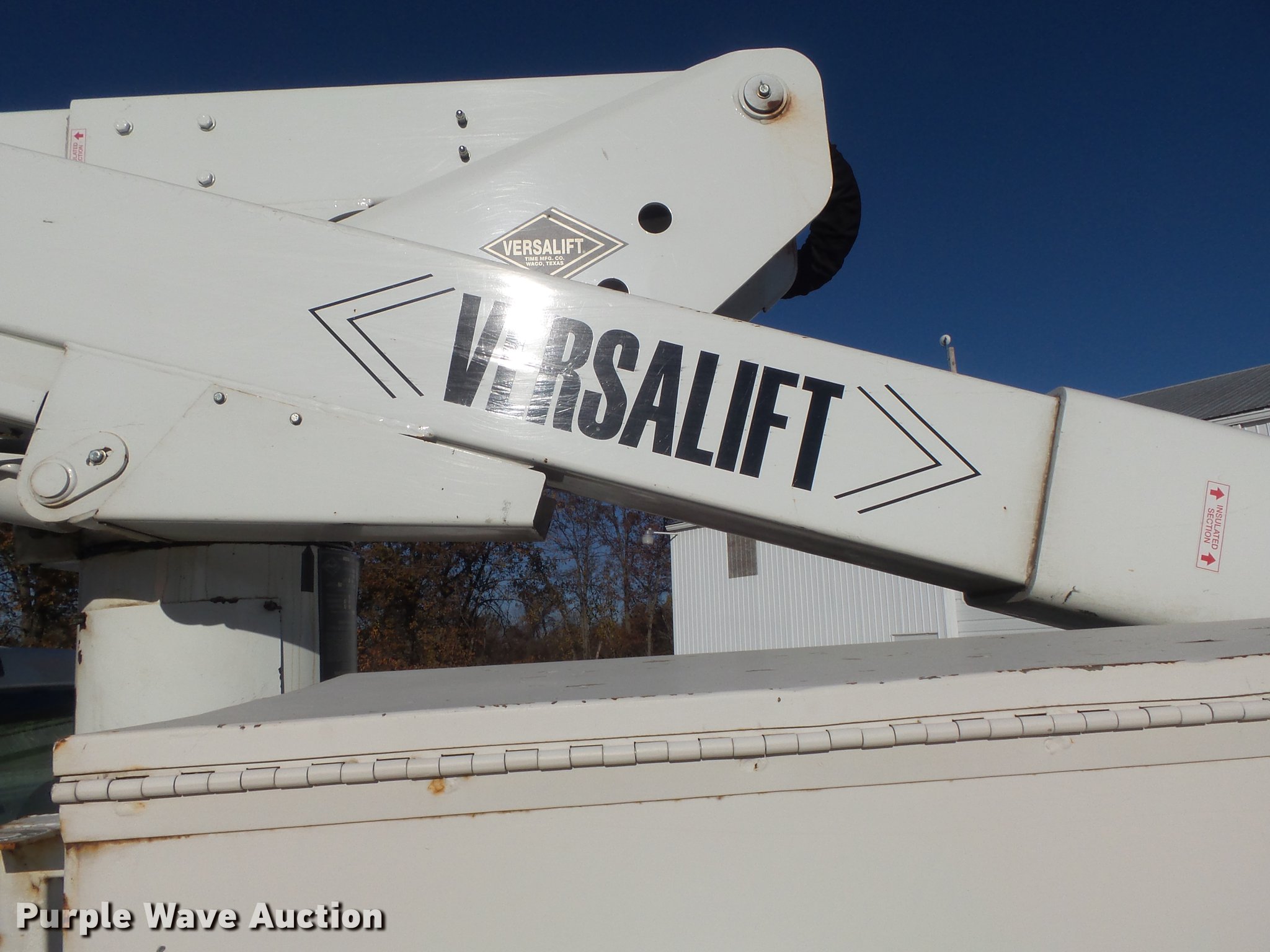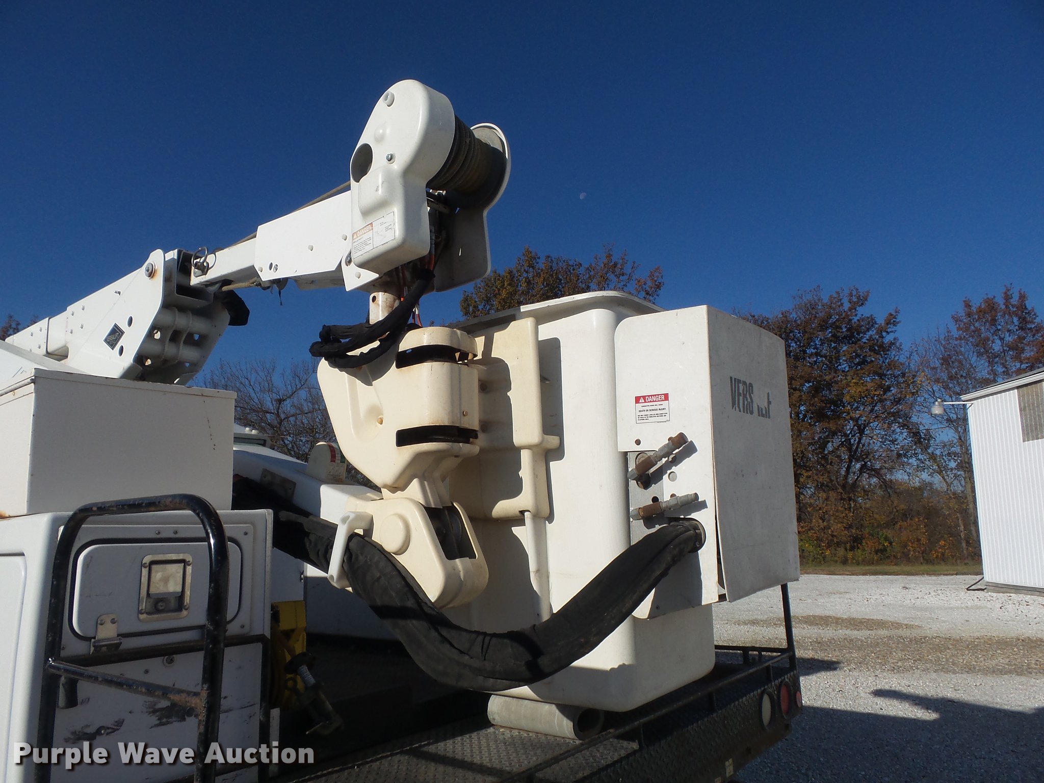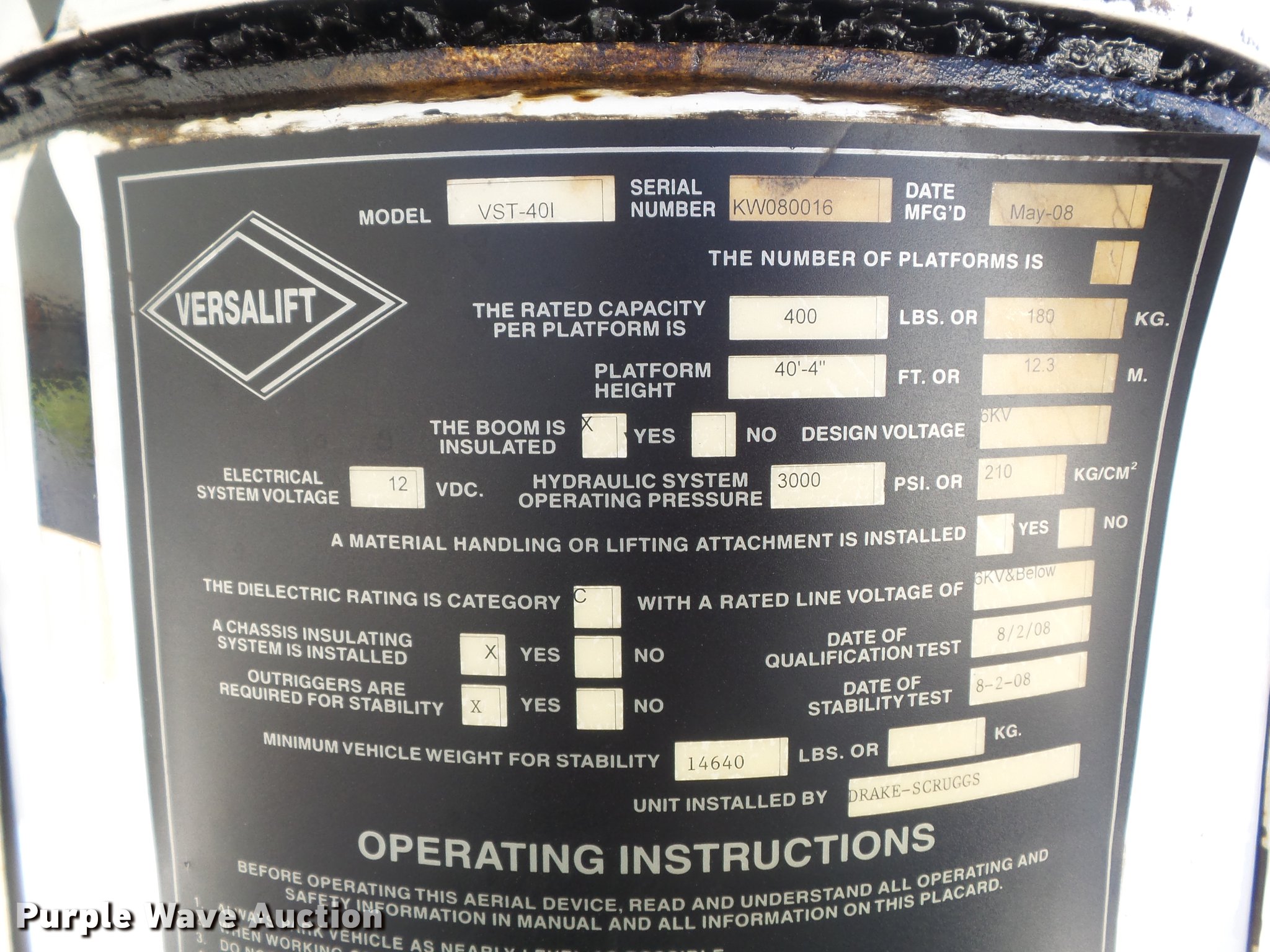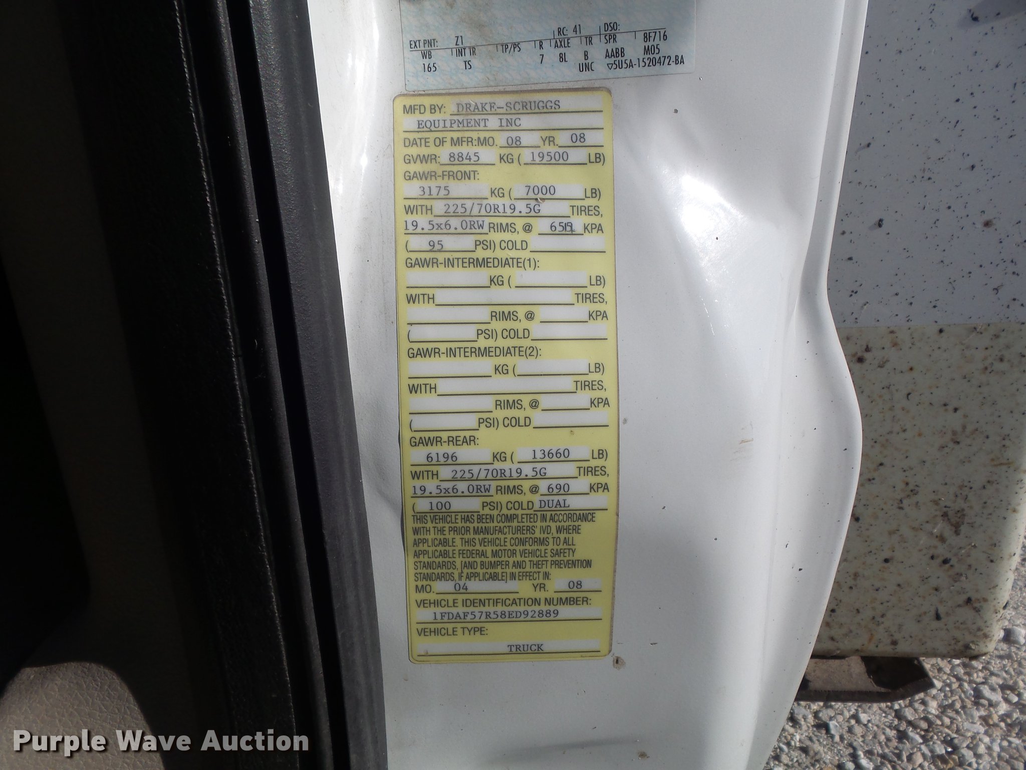 Purple Wave is selling a used Bucket Truck in Illinois. This item is a 2008 Ford F550 XL Super Duty bucket truck with the following: 192,155 miles on odometer, 6.4L V8 OHV 32V turbo diesel engine, Automatic transmission, Four wheel drive, Single axle, AC and heat, AM/FM, Trailer brake controller, Block heater, Backup alarm, Beacon light, PTO, Front tow hooks, Brand FX service bed, 11'L, Shelving, 1,200 watt power inverter, Serial 08-19014, 2008 Versalift VST-40I boom, 400 lbs maximum lift capacity, 40' maximum lift height, Man basket, Ground and platform controls, 100 degree bucket rotation, Boom rotation, Articulated, insulated, telescopic boom, Extendable jib crane, 1,000 lbs maximum lift capacity, Rope material handler, Serial KW080016, Single fuel tank, Spring suspension, Hydraulic brakes, 225/70R19.5 tires, GVWR 19,500 lbs