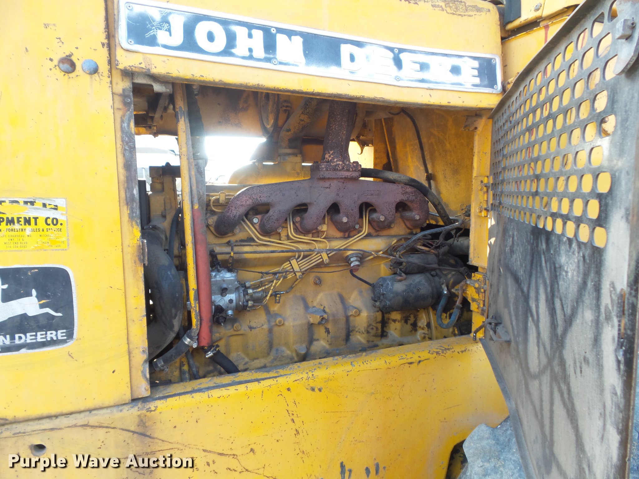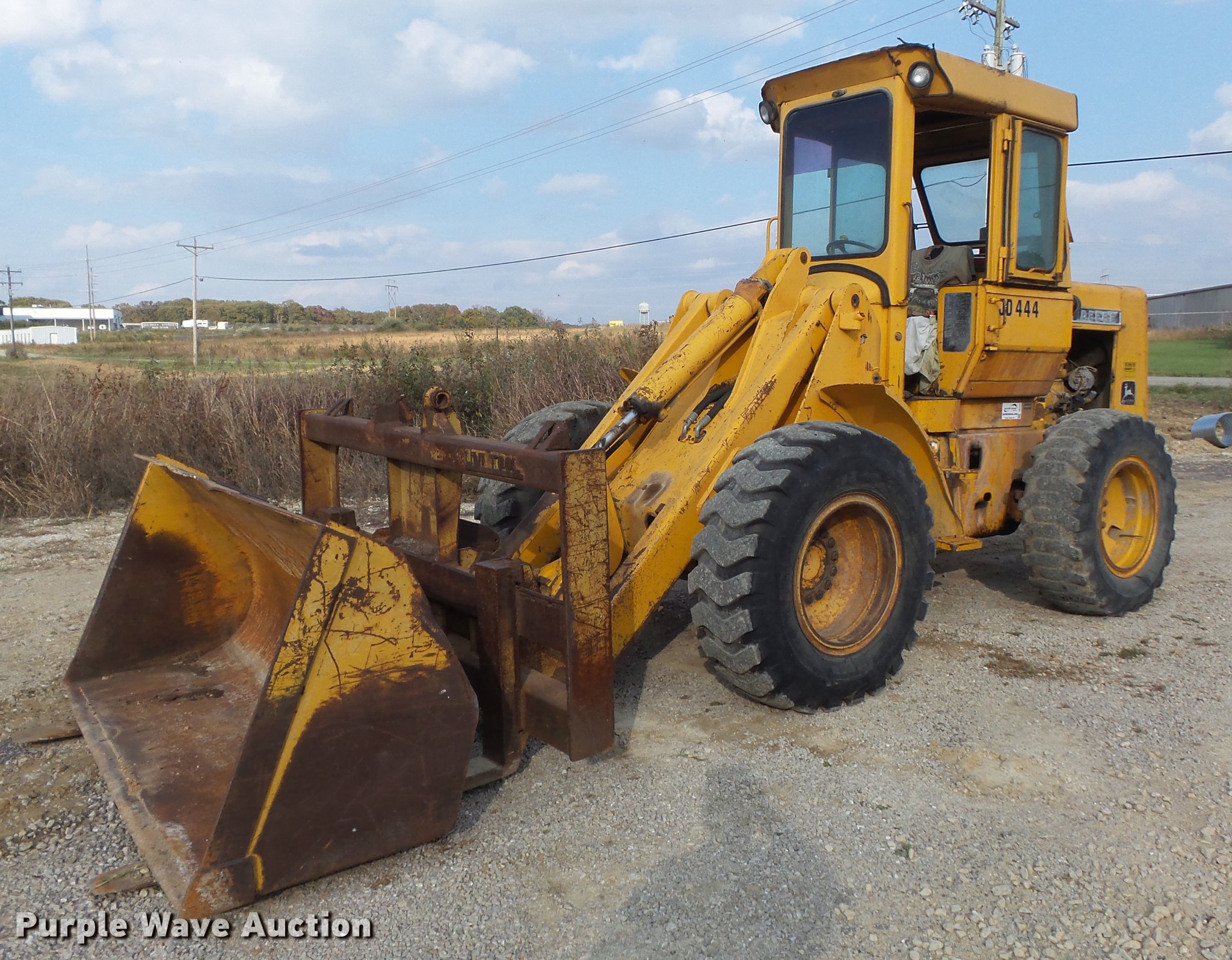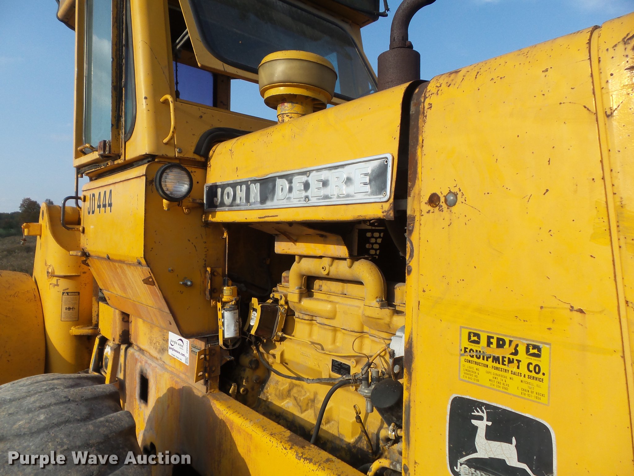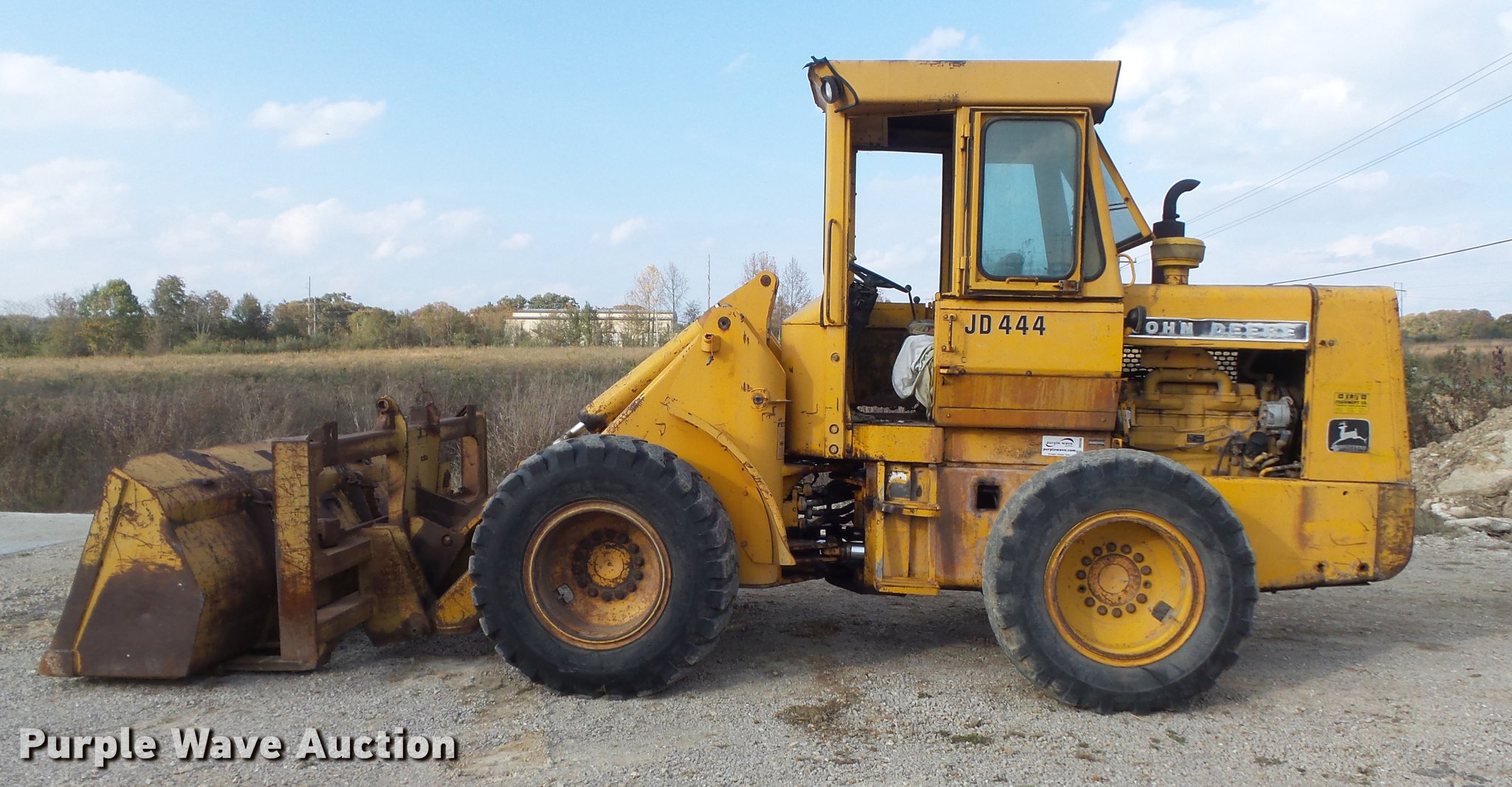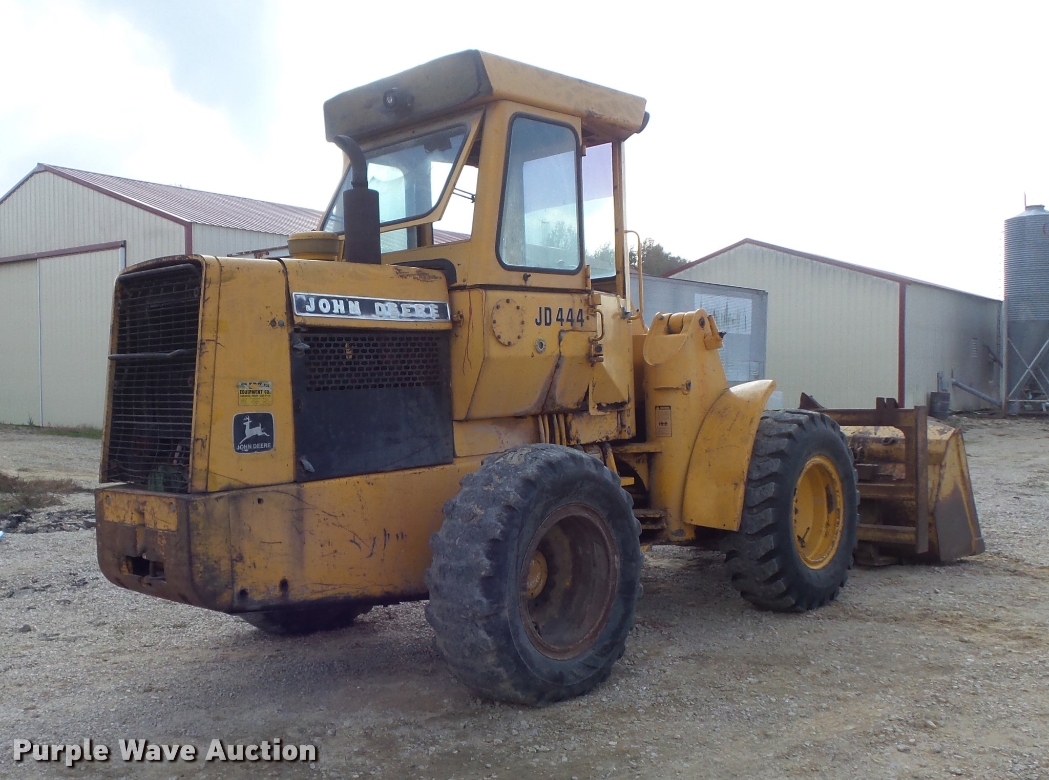 Purple Wave is selling a used Wheel Loader in Missouri. This item is a 1980 John Deere 444 wheel loader with the following: 3,023 hours on meter, John Deere six cylinder diesel engine, 85 HP, Serial T06359DF224230, Powershift transmission, 2F-1R gears, Joystick bucket controls, Front and rear work lights, Block heater, Ether start, 93"W general purpose bucket, Weld-on cutting edge, Uni Tool pallet forks, 48"L, 15.5-25 tires, Hydraulic oil leak, Remanufactured engine 10/2010, Serial 350869T