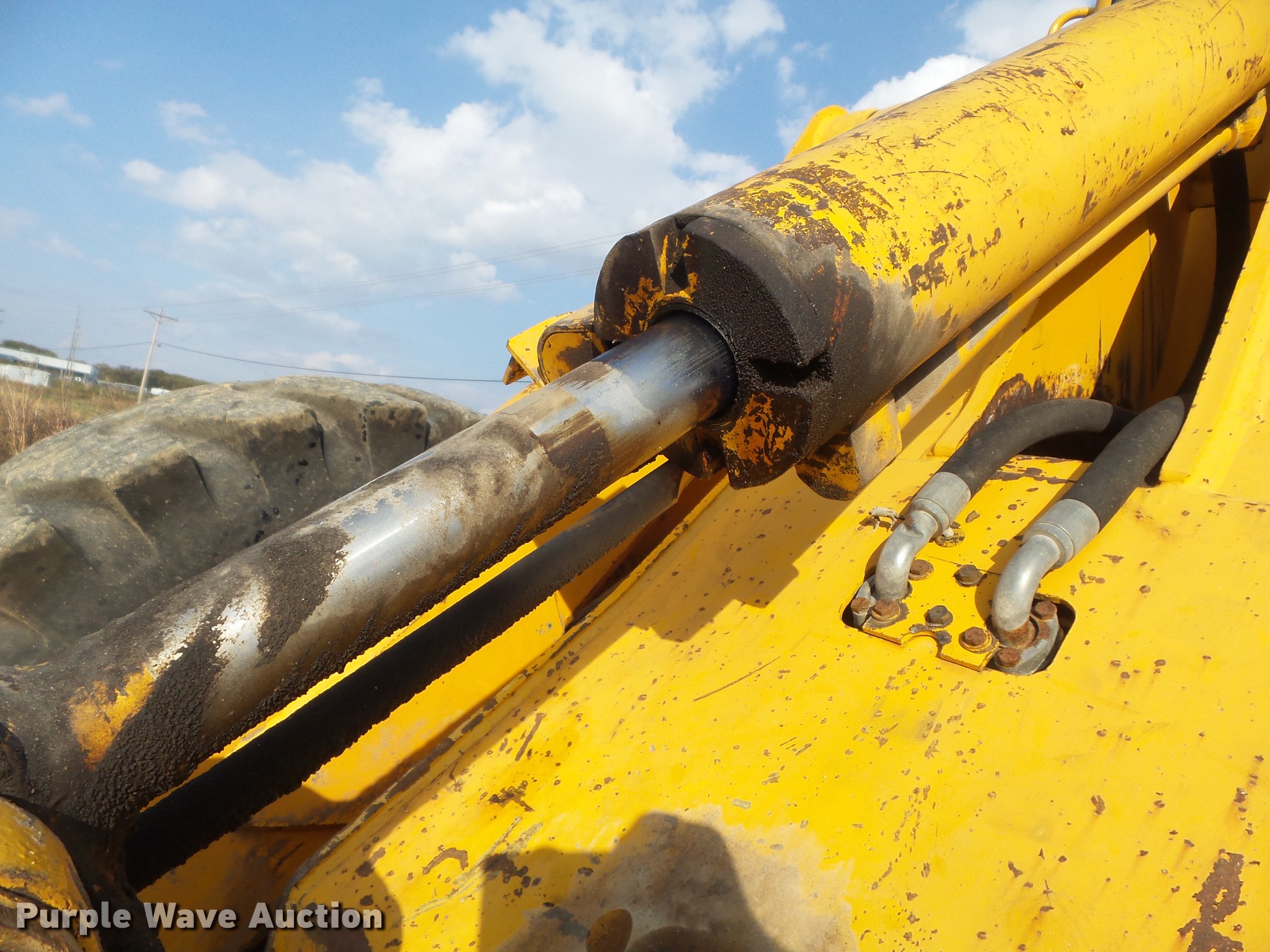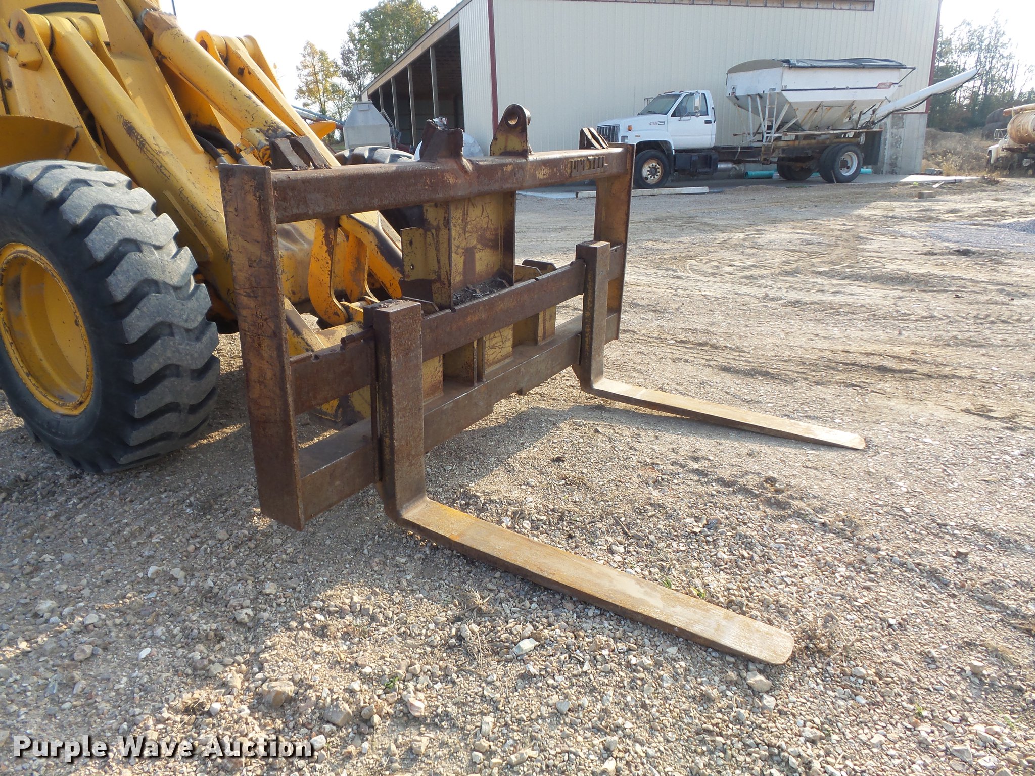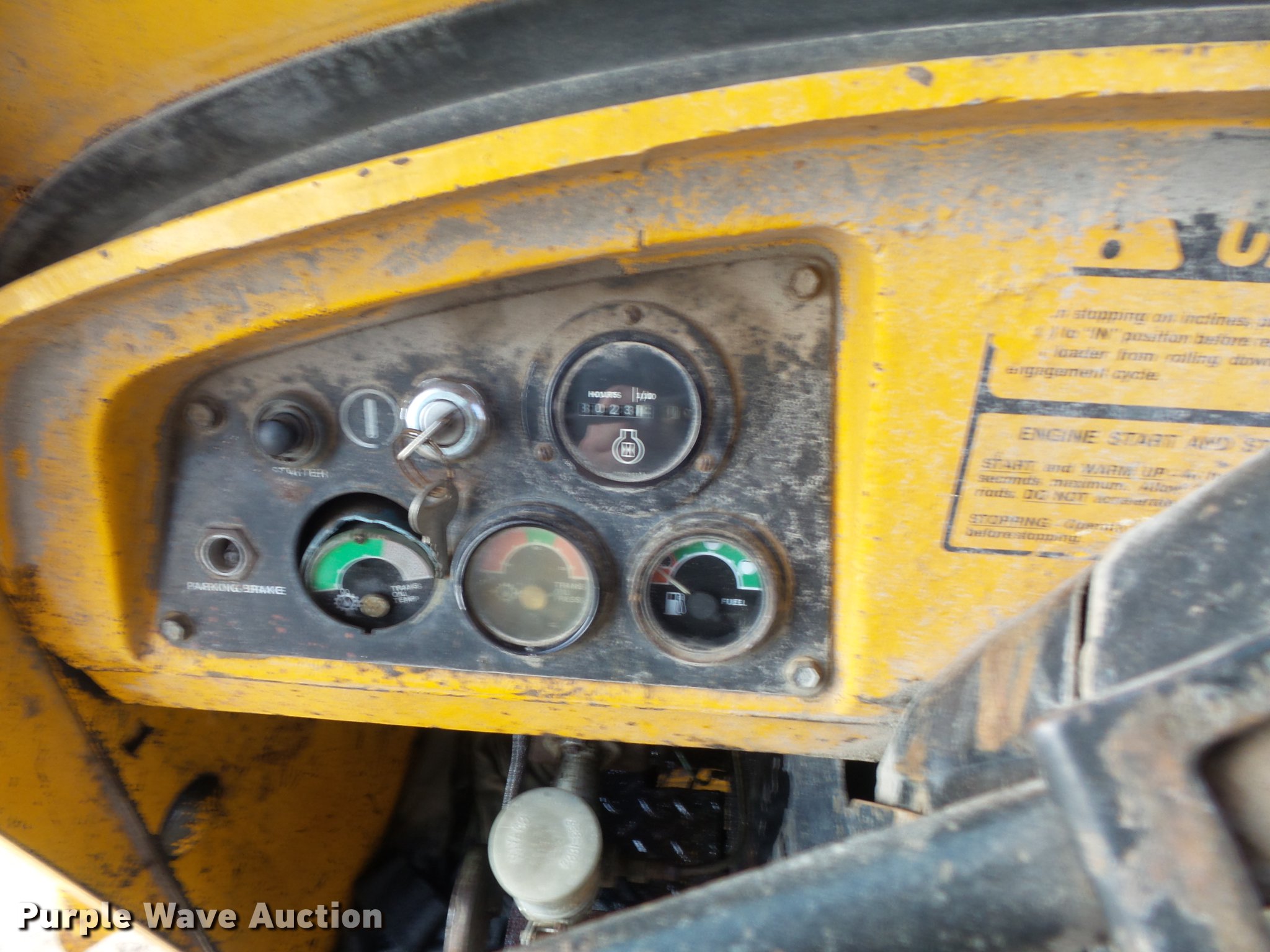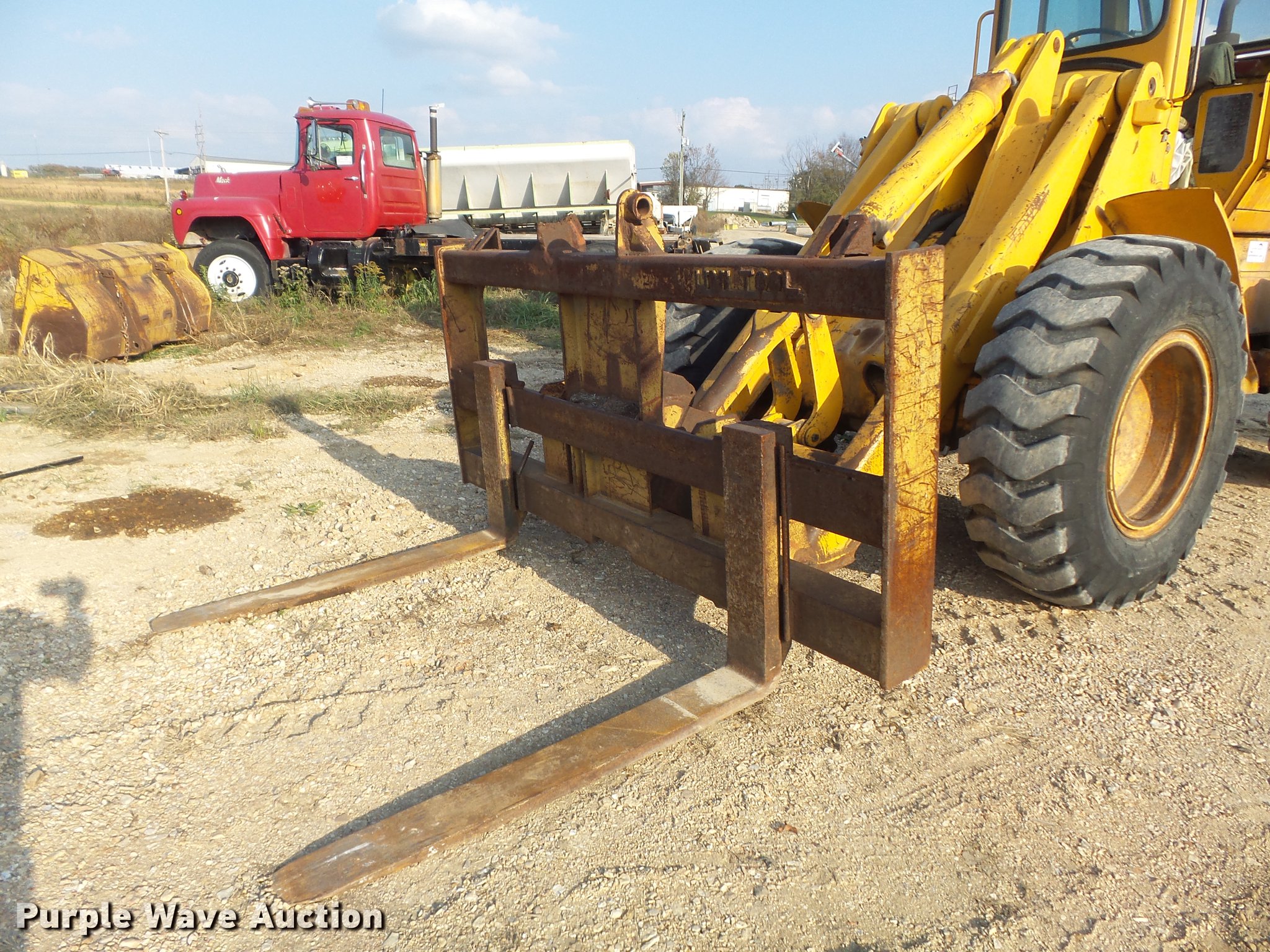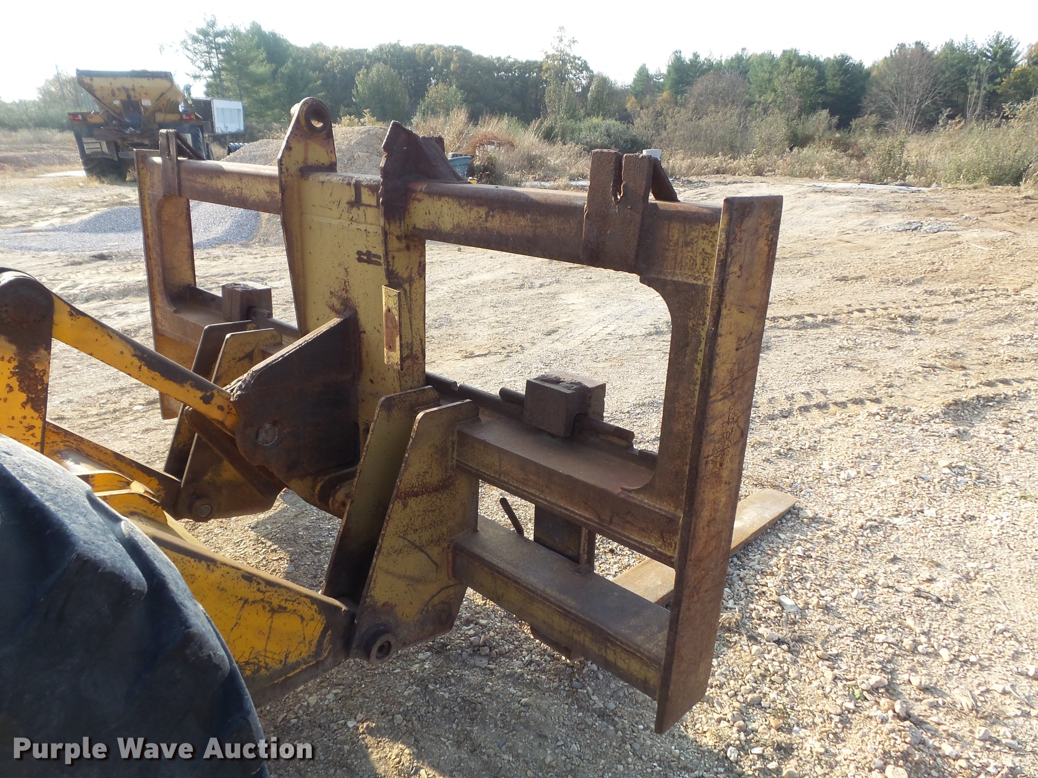 Purple Wave is selling a used Wheel Loader in Missouri. This item is a 1980 John Deere 444 wheel loader with the following: 3,023 hours on meter, John Deere six cylinder diesel engine, 85 HP, Serial T06359DF224230, Powershift transmission, 2F-1R gears, Joystick bucket controls, Front and rear work lights, Block heater, Ether start, 93"W general purpose bucket, Weld-on cutting edge, Uni Tool pallet forks, 48"L, 15.5-25 tires, Hydraulic oil leak, Remanufactured engine 10/2010, Serial 350869T