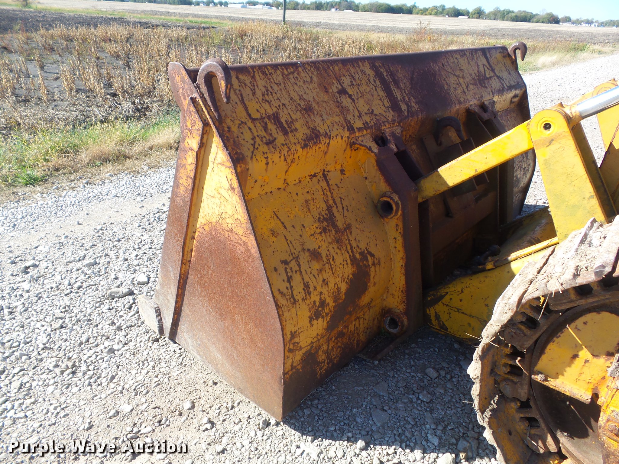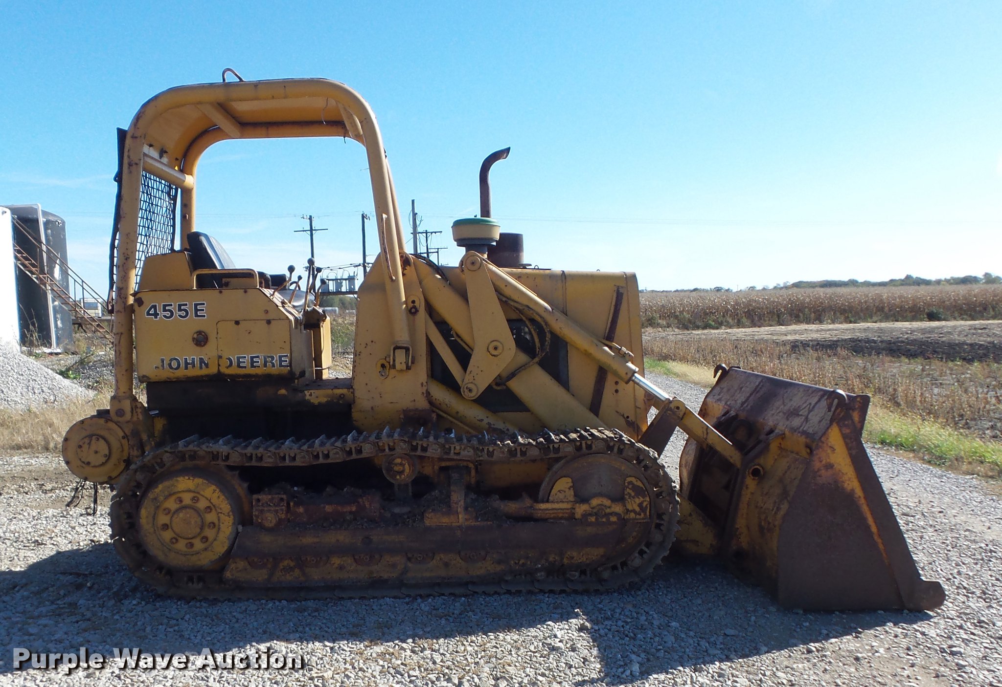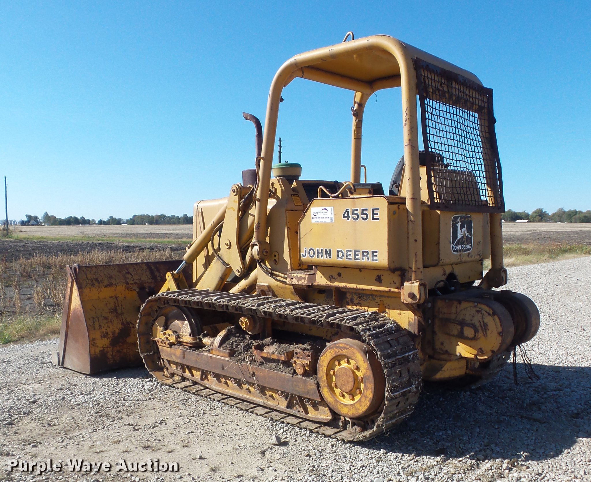 Purple Wave is selling a used Crawler Loader in Illinois. This item is a 1987 John Deere 455E track loader with the following: John Deere four cylinder diesel engine, 70 HP, 8F-4R gears, OROPS, Joystick bucket controls, John Deere AT34579 bucket, 88"W, Weld-on cutting edge, 1.5 cu. yd. capacity, Front auxiliary hydraulics, Winch, Model 3305, Serial 020587, 14"W triple grouser track pads, Serial T0455EX733972