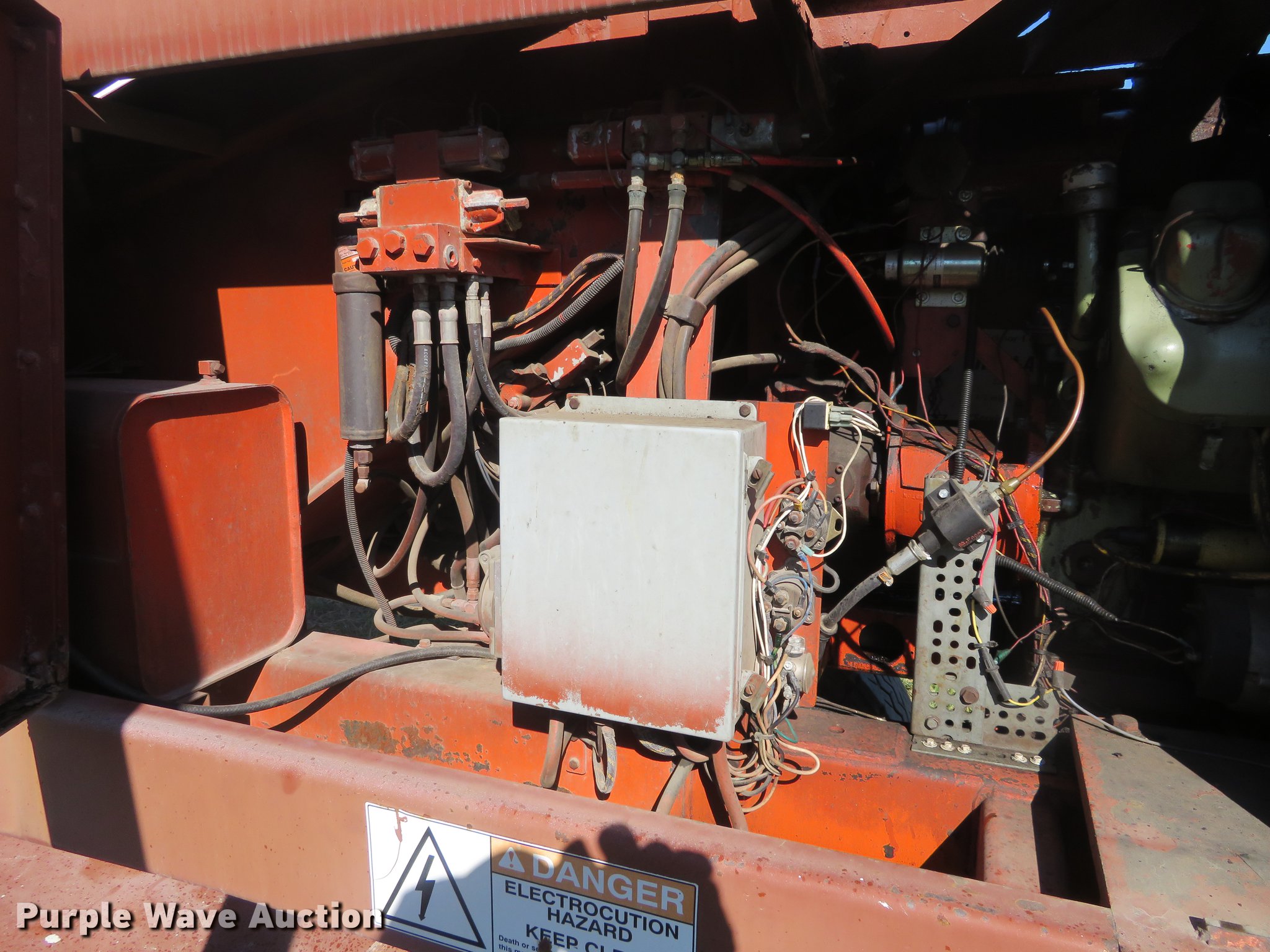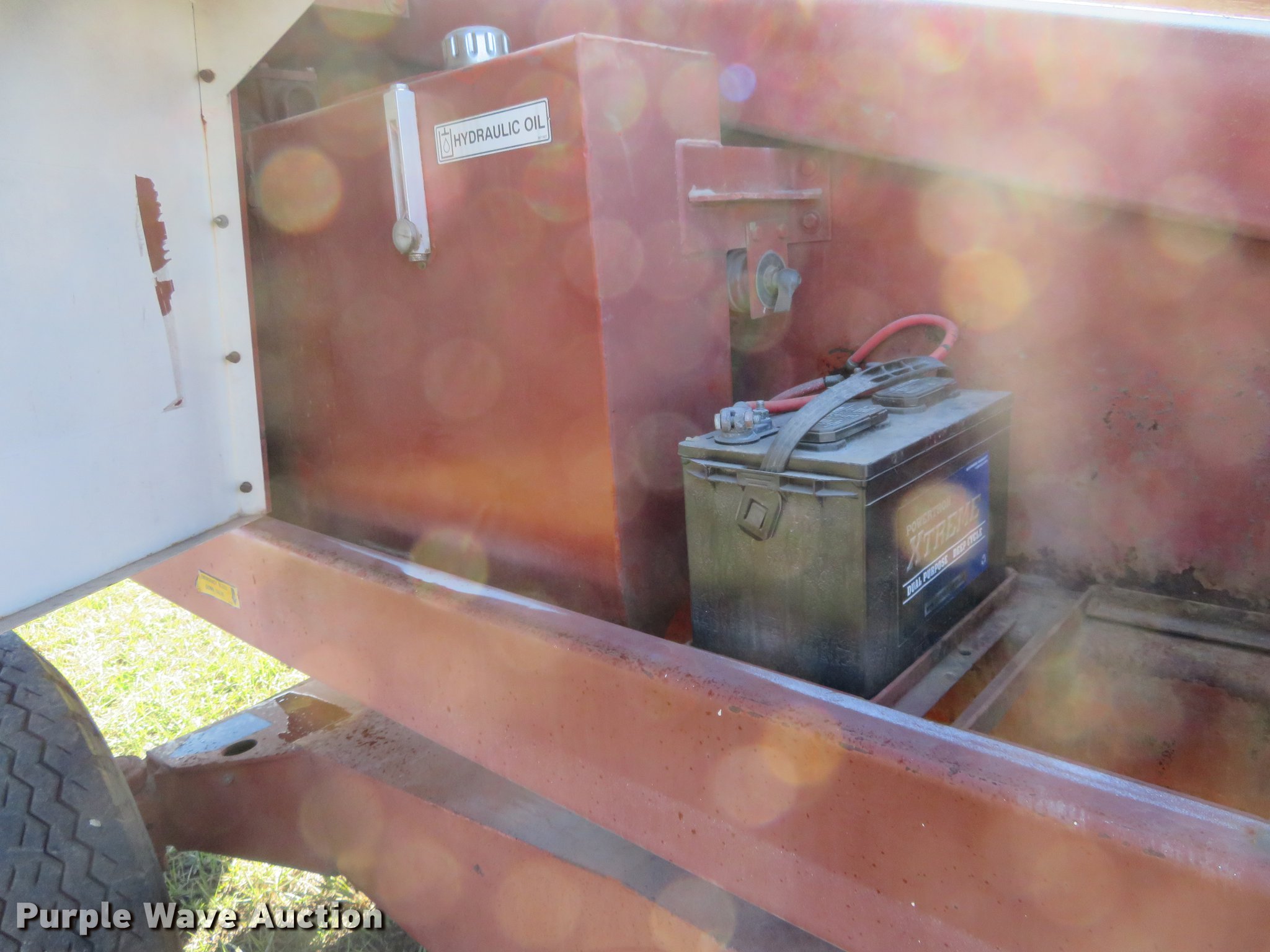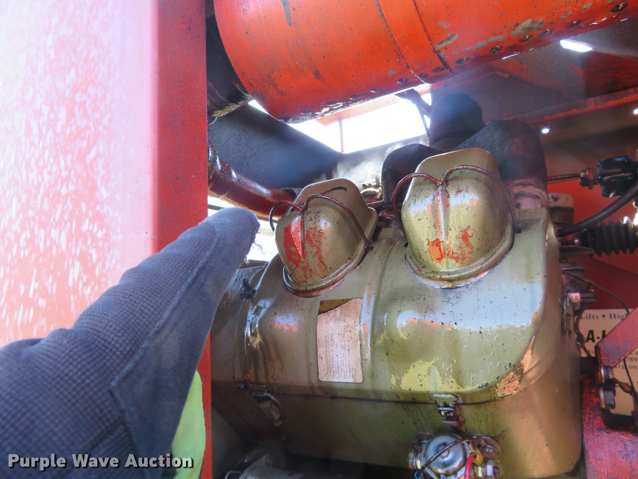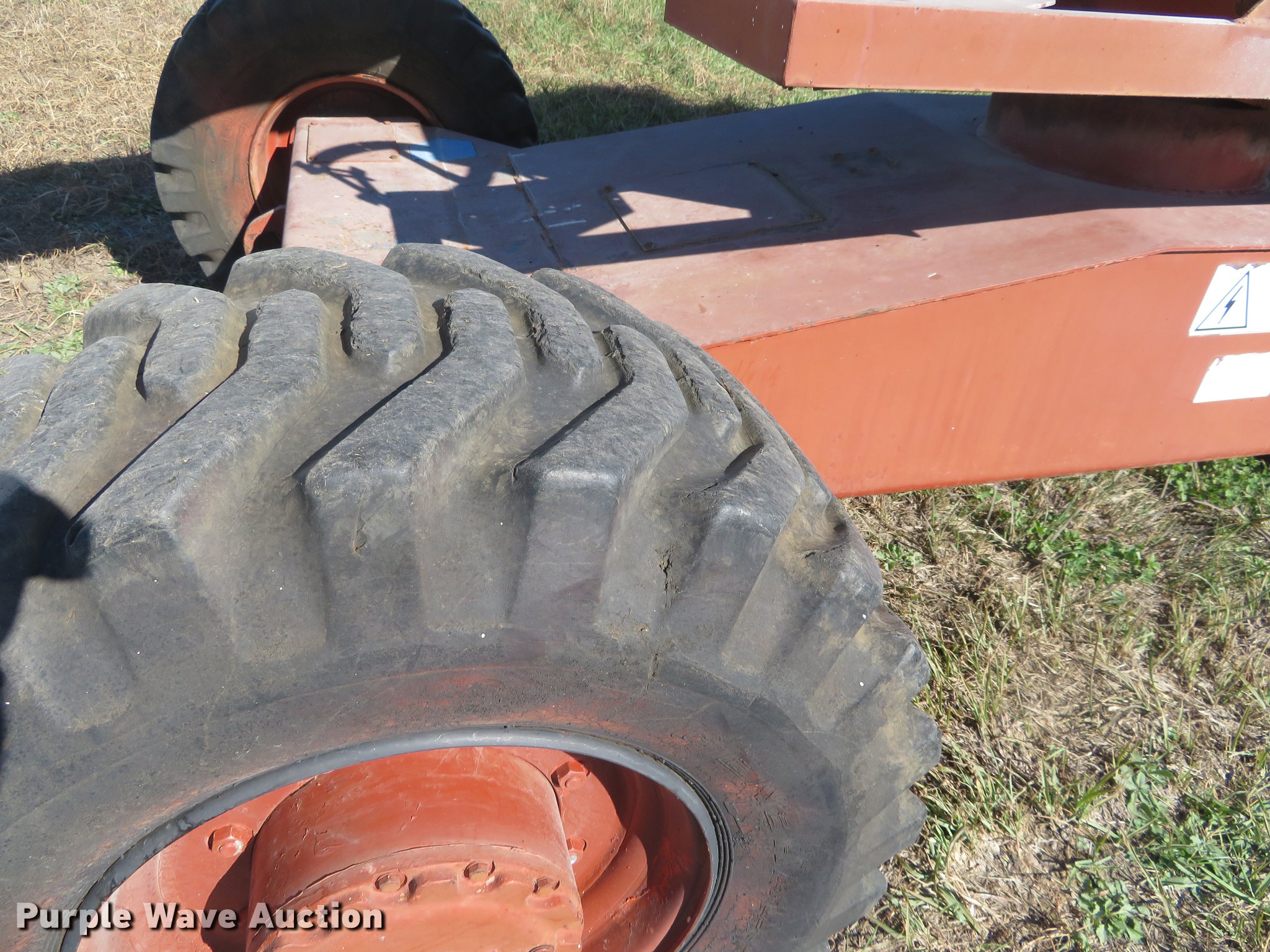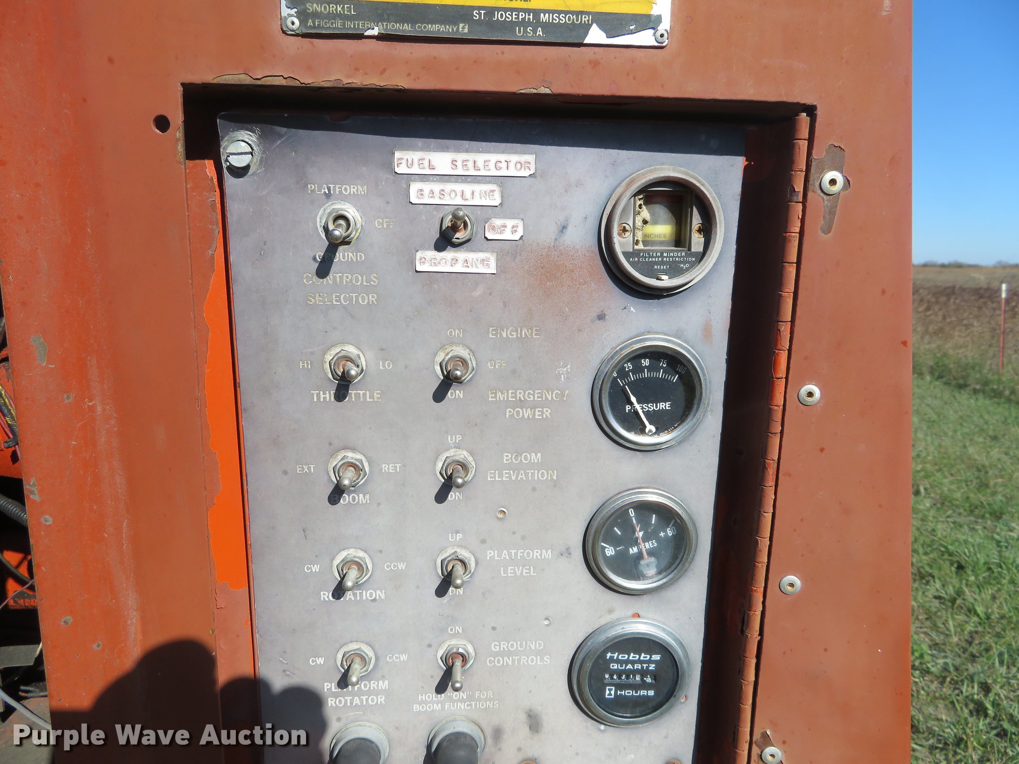 Snorkelift TB60 boom lift. 431 hours on meter, Four cylinder gas engine, 60' maximum lift height, 50' maximum reach, 62" x 34" platform, 19.5 tires, Oil leaks, Serial 864360986. Frank Callender Estate. Howard, KS 67349