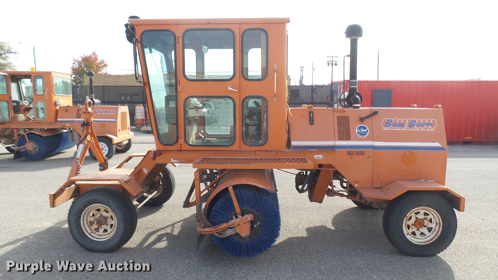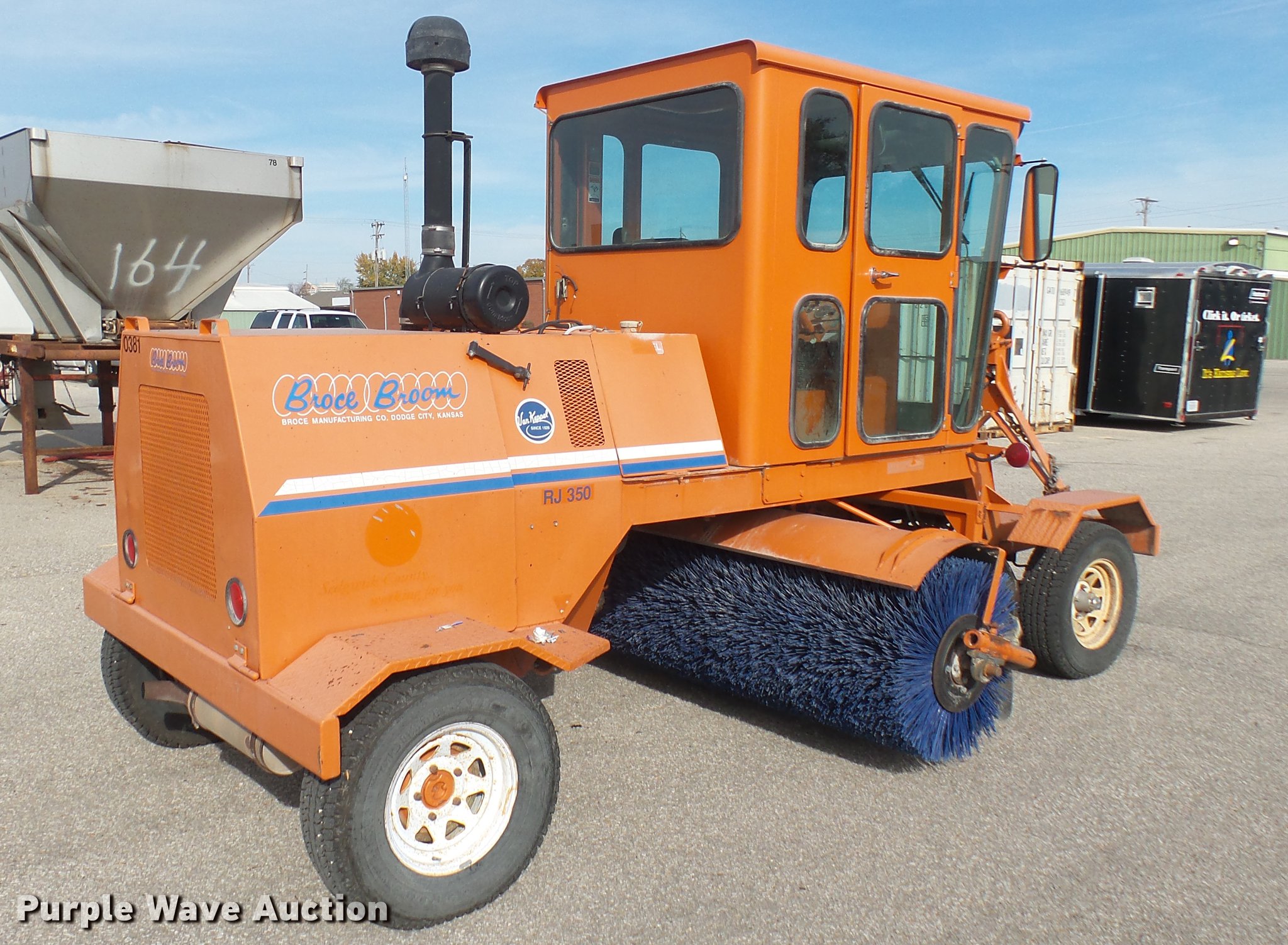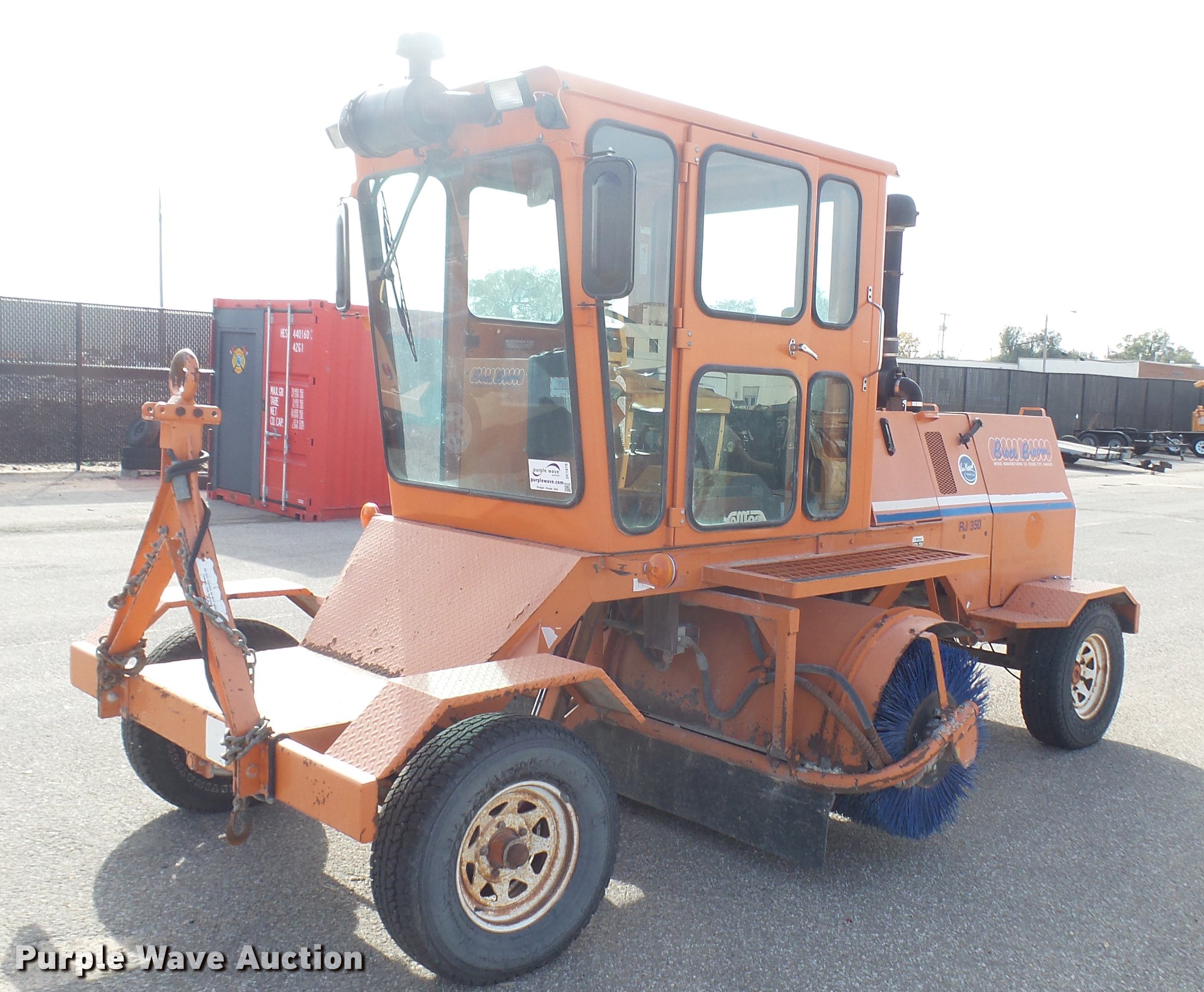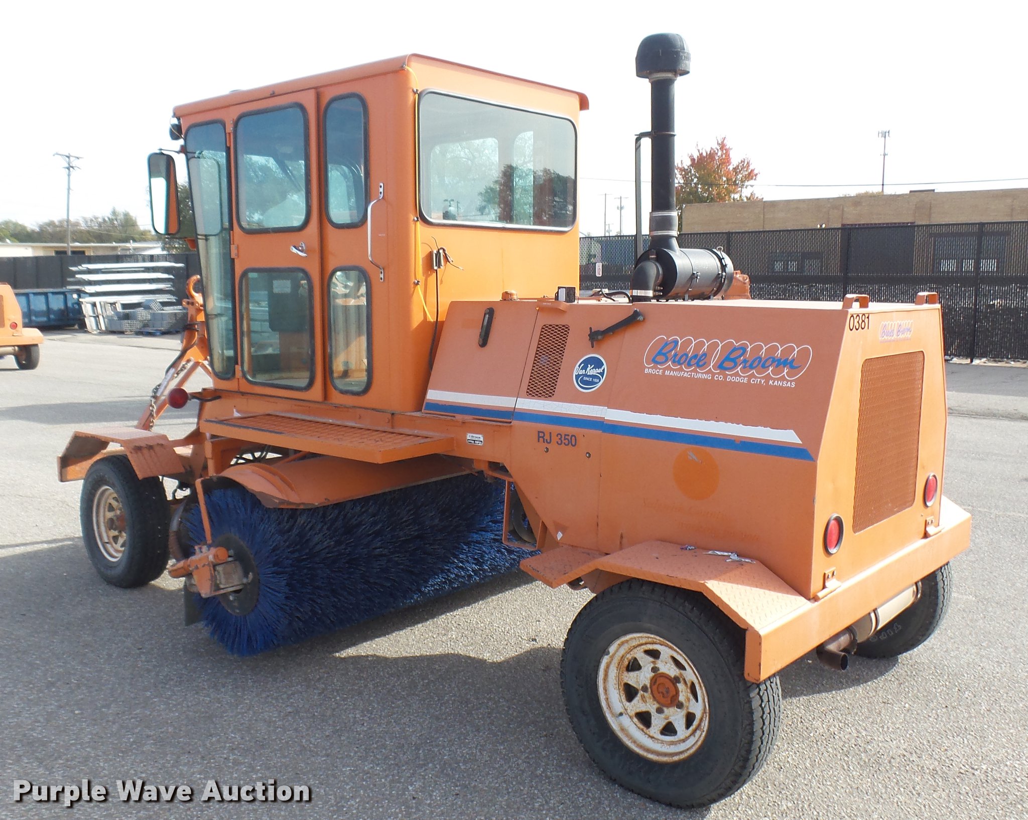 Purple Wave is selling a used Broom in Kansas. This item is a 2003 Broce RJ350 broom with the following: 1,359 hours on meter, John Deere four cylinder diesel engine, Two speed hydrostatic transmission, EROPS, AC and heat, 8'W mid-mount wafer broom, Hydraulic lift, Hydraulic angle adjustment, Work lights, Pintle hitch, Hydraulic brakes, 235/75R15 tires, Serial 404134