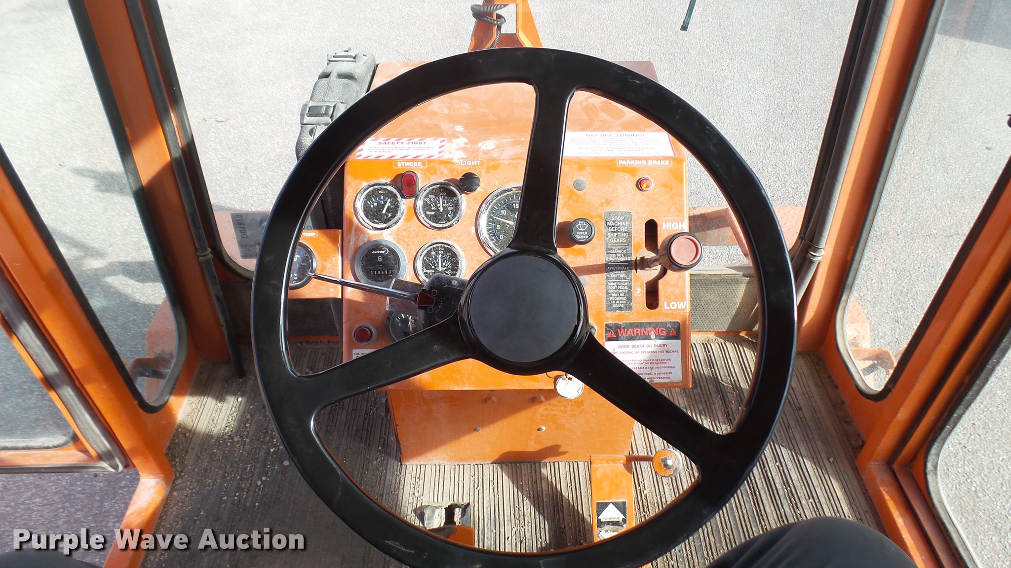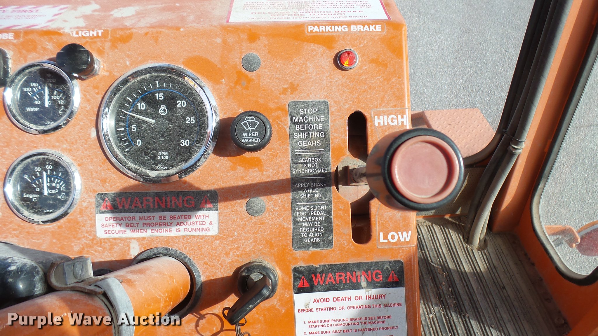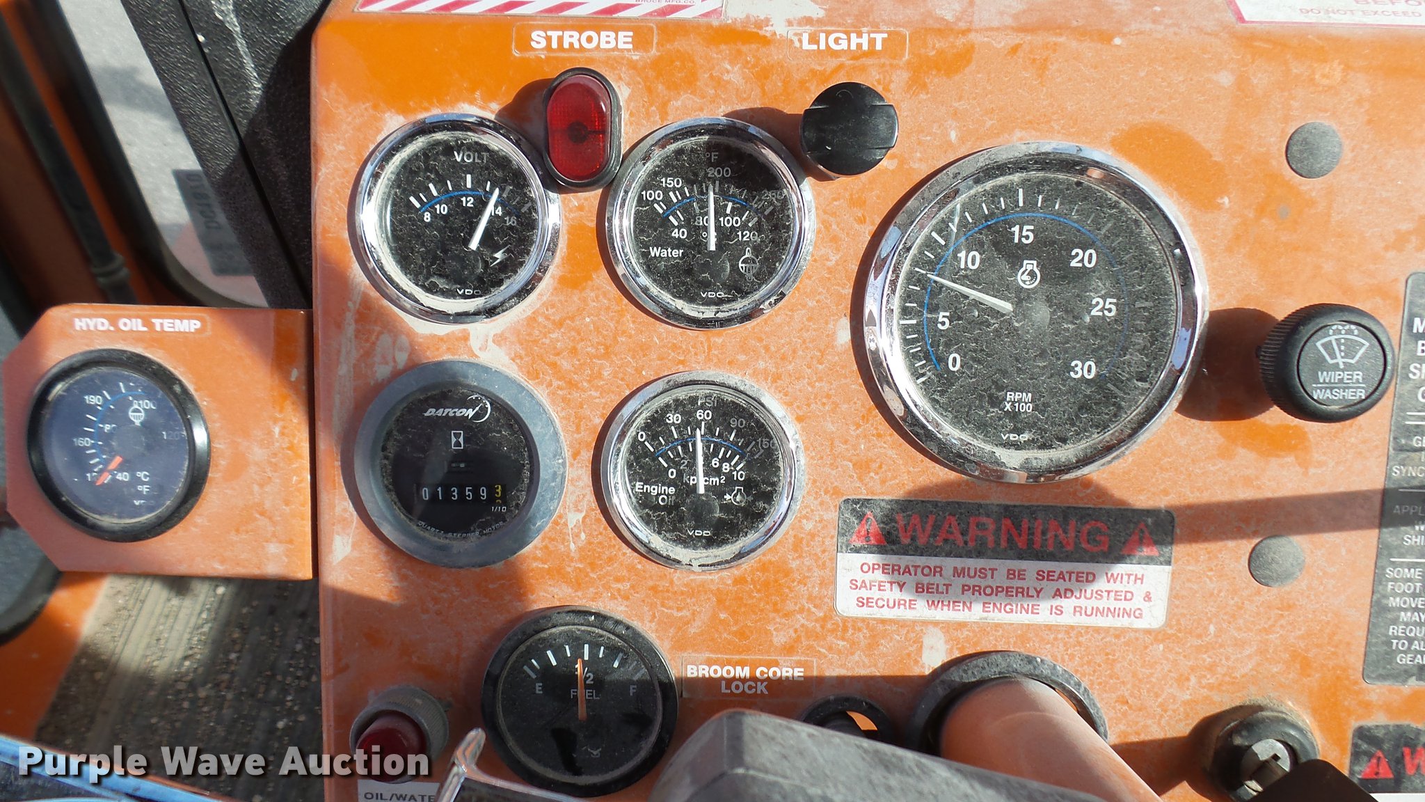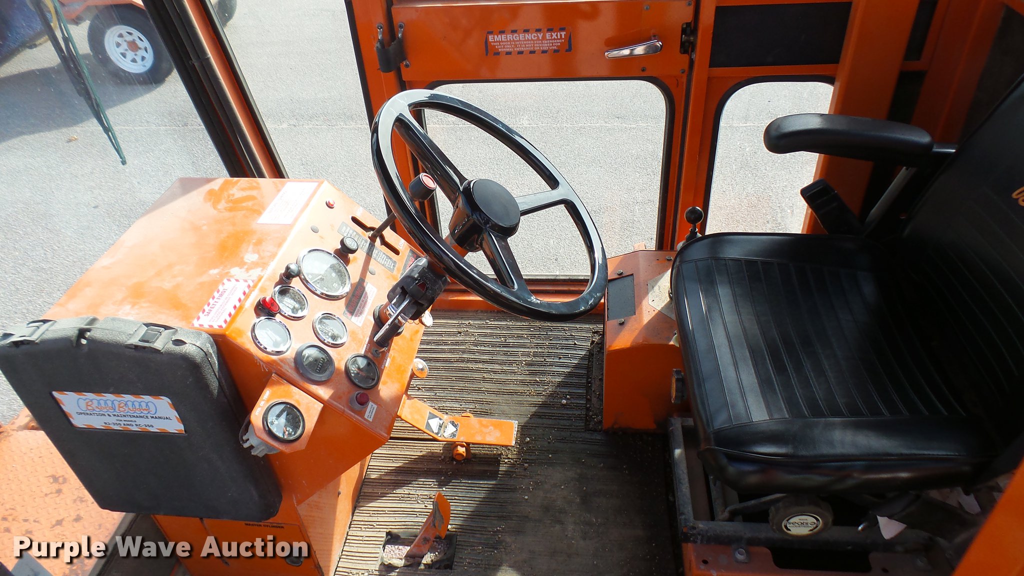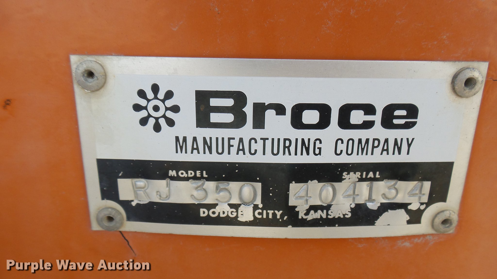 Purple Wave is selling a used Broom in Kansas. This item is a 2003 Broce RJ350 broom with the following: 1,359 hours on meter, John Deere four cylinder diesel engine, Two speed hydrostatic transmission, EROPS, AC and heat, 8'W mid-mount wafer broom, Hydraulic lift, Hydraulic angle adjustment, Work lights, Pintle hitch, Hydraulic brakes, 235/75R15 tires, Serial 404134