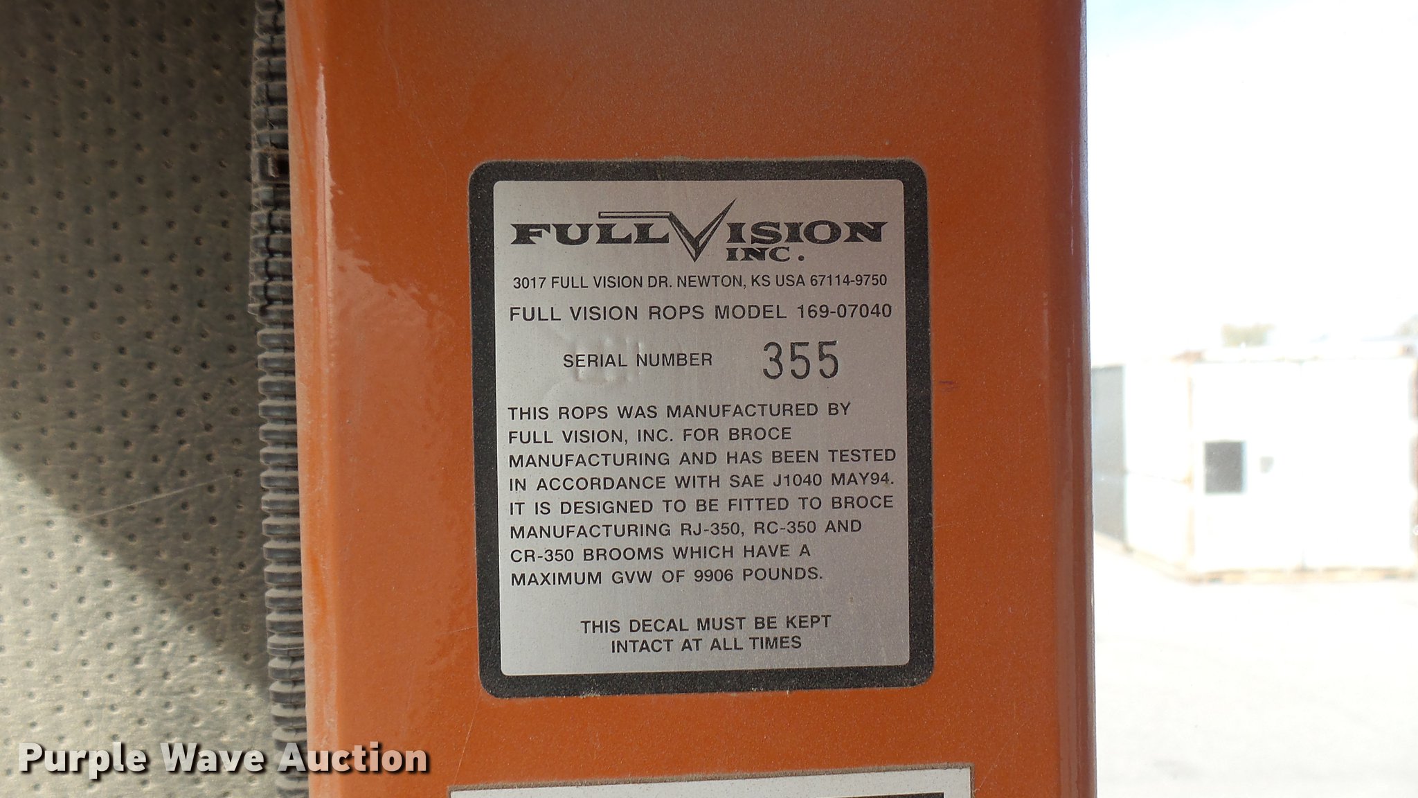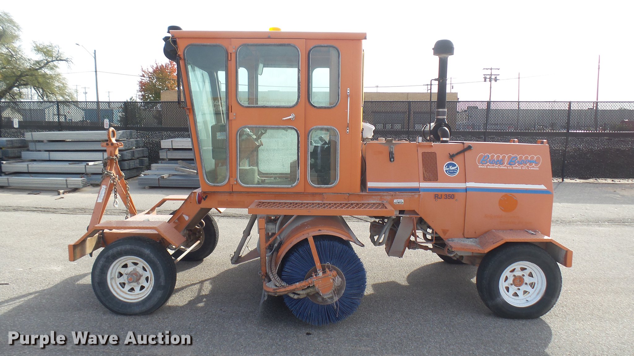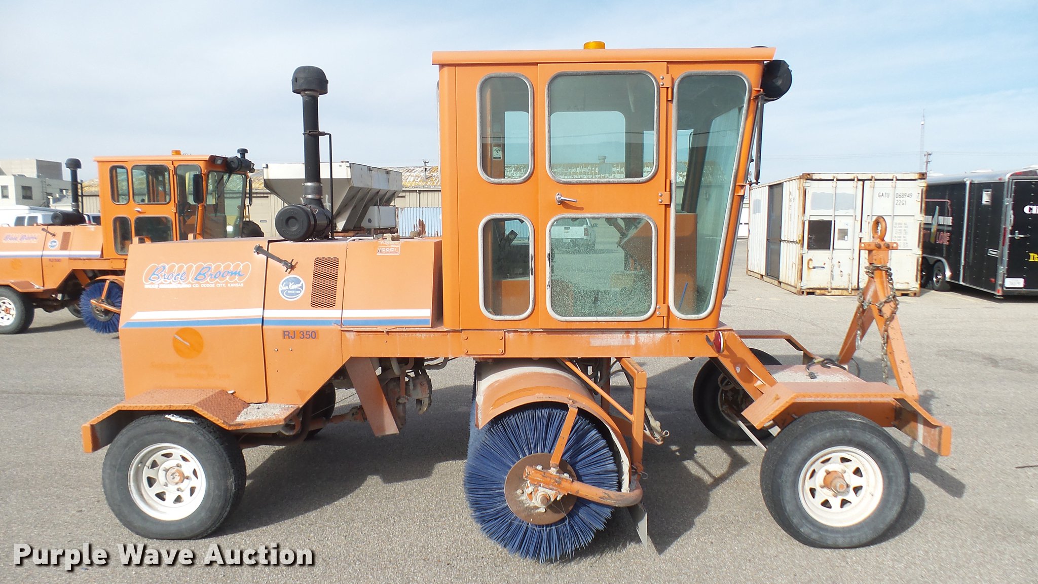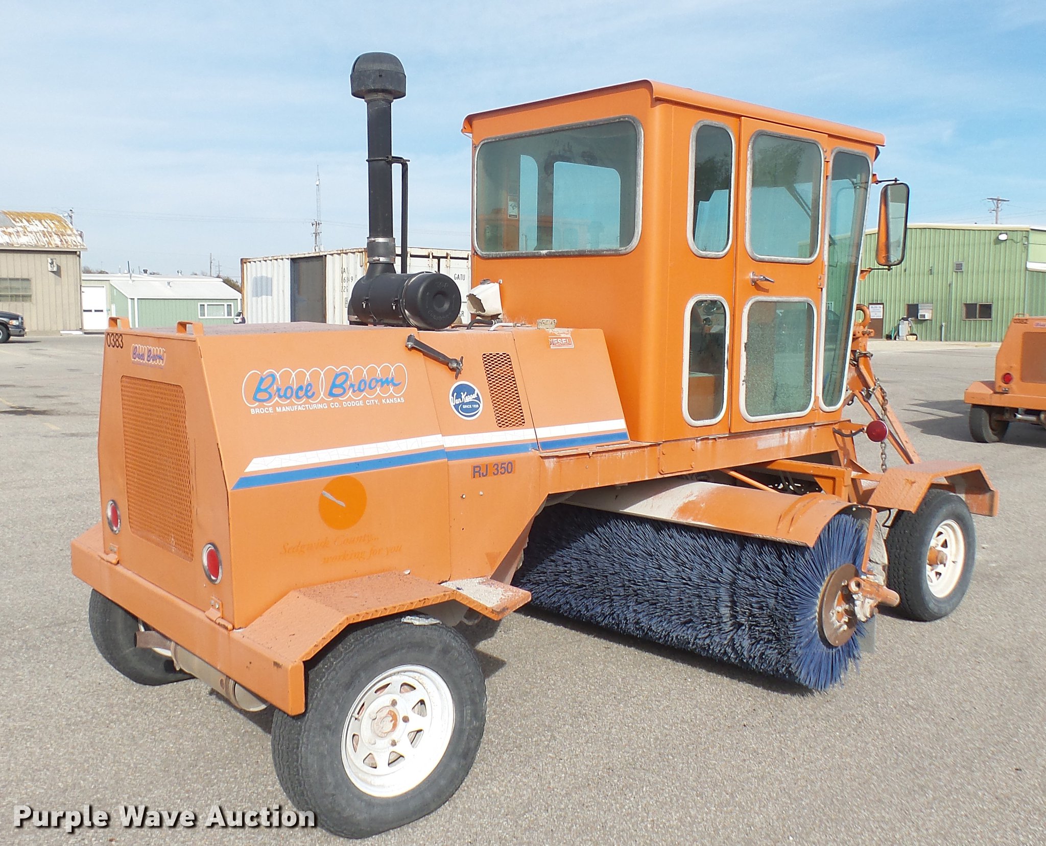 Purple Wave is selling a used Broom in Kansas. This item is a 2003 Broce RJ350 broom with the following: 899 hours on meter, John Deere four cylinder diesel engine, Two speed hydrostatic transmission, EROPS, AC and heat, Joystick broom controls, 8'W mid-mount wafer broom, Hydraulic lift, Hydraulic angle adjustment, Work lights, Pintle hitch, Hydraulic brakes, 235/75R15 tires, Windshield cracked, Serial 404133