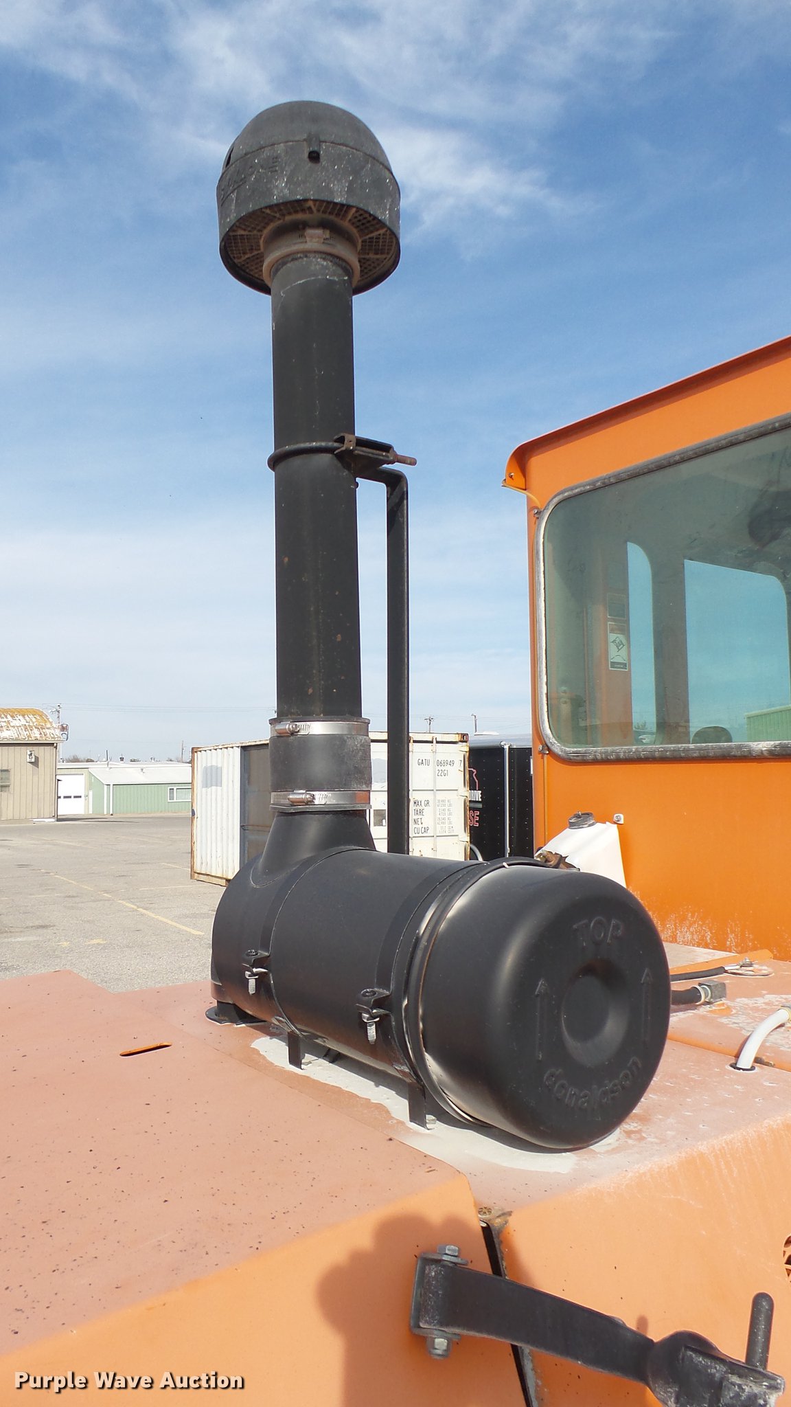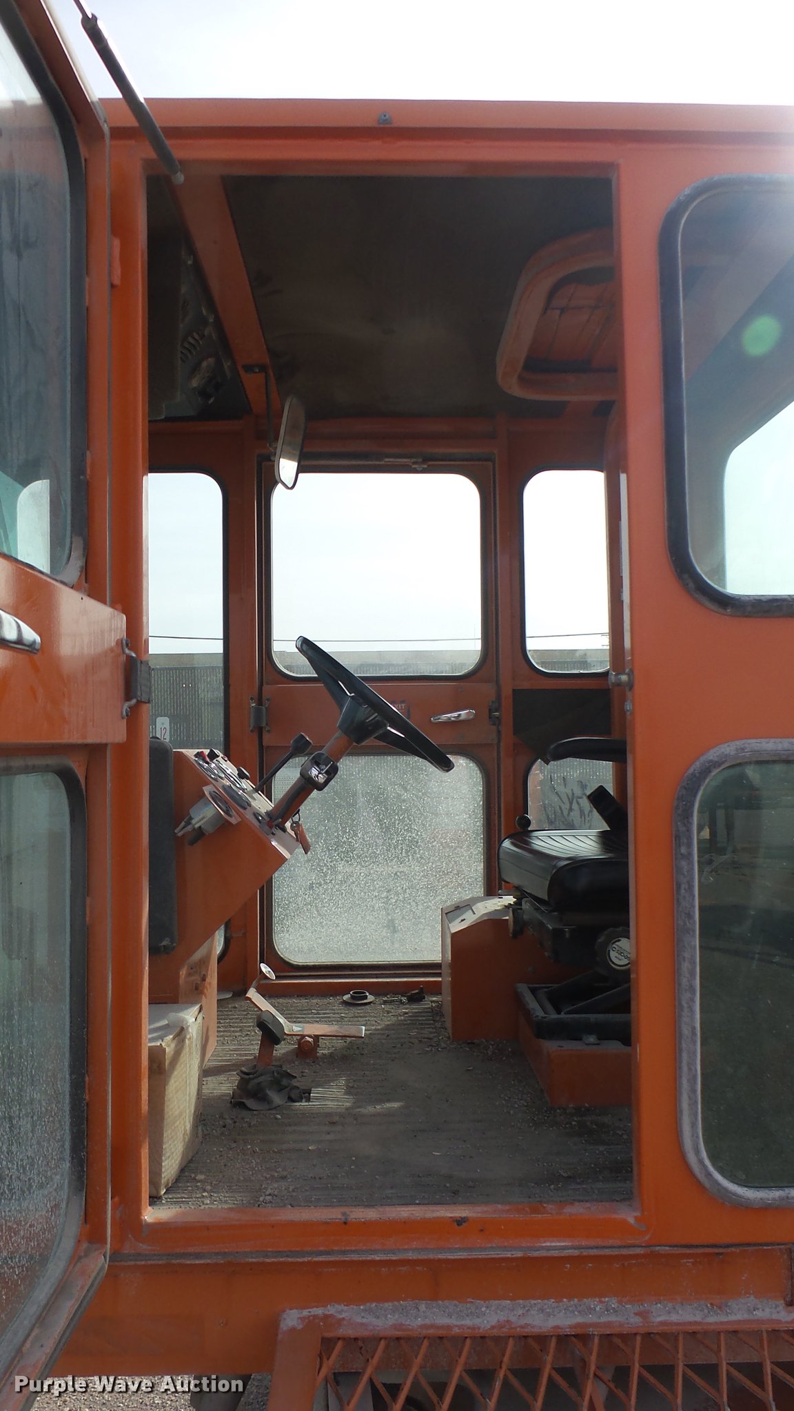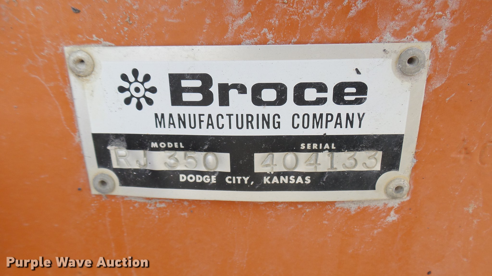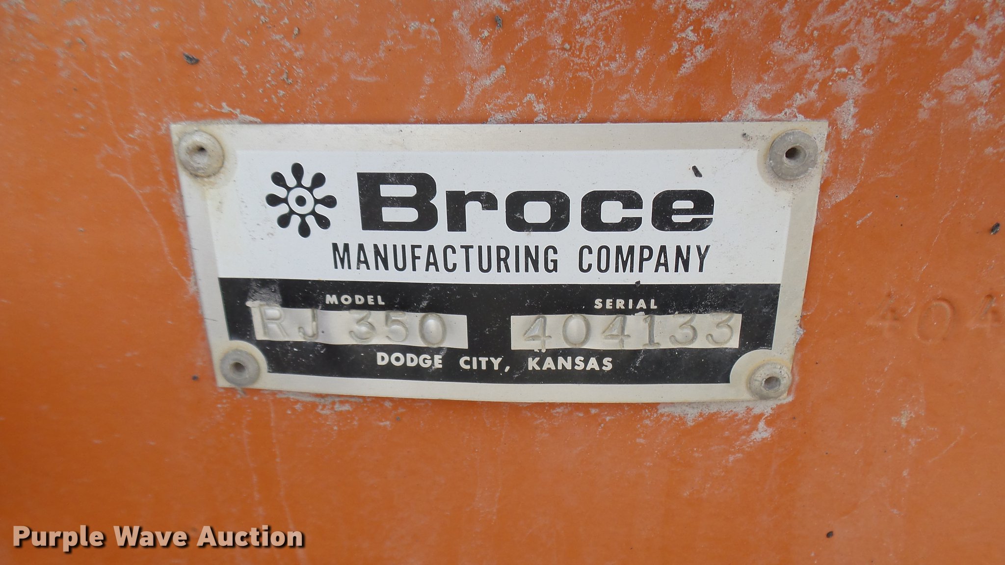 Purple Wave is selling a used Broom in Kansas. This item is a 2003 Broce RJ350 broom with the following: 899 hours on meter, John Deere four cylinder diesel engine, Two speed hydrostatic transmission, EROPS, AC and heat, Joystick broom controls, 8'W mid-mount wafer broom, Hydraulic lift, Hydraulic angle adjustment, Work lights, Pintle hitch, Hydraulic brakes, 235/75R15 tires, Windshield cracked, Serial 404133