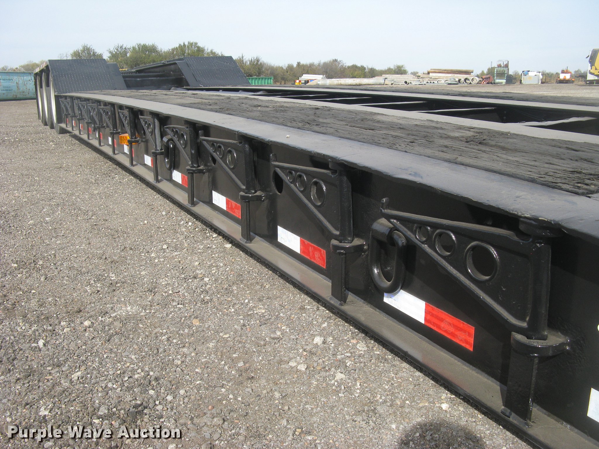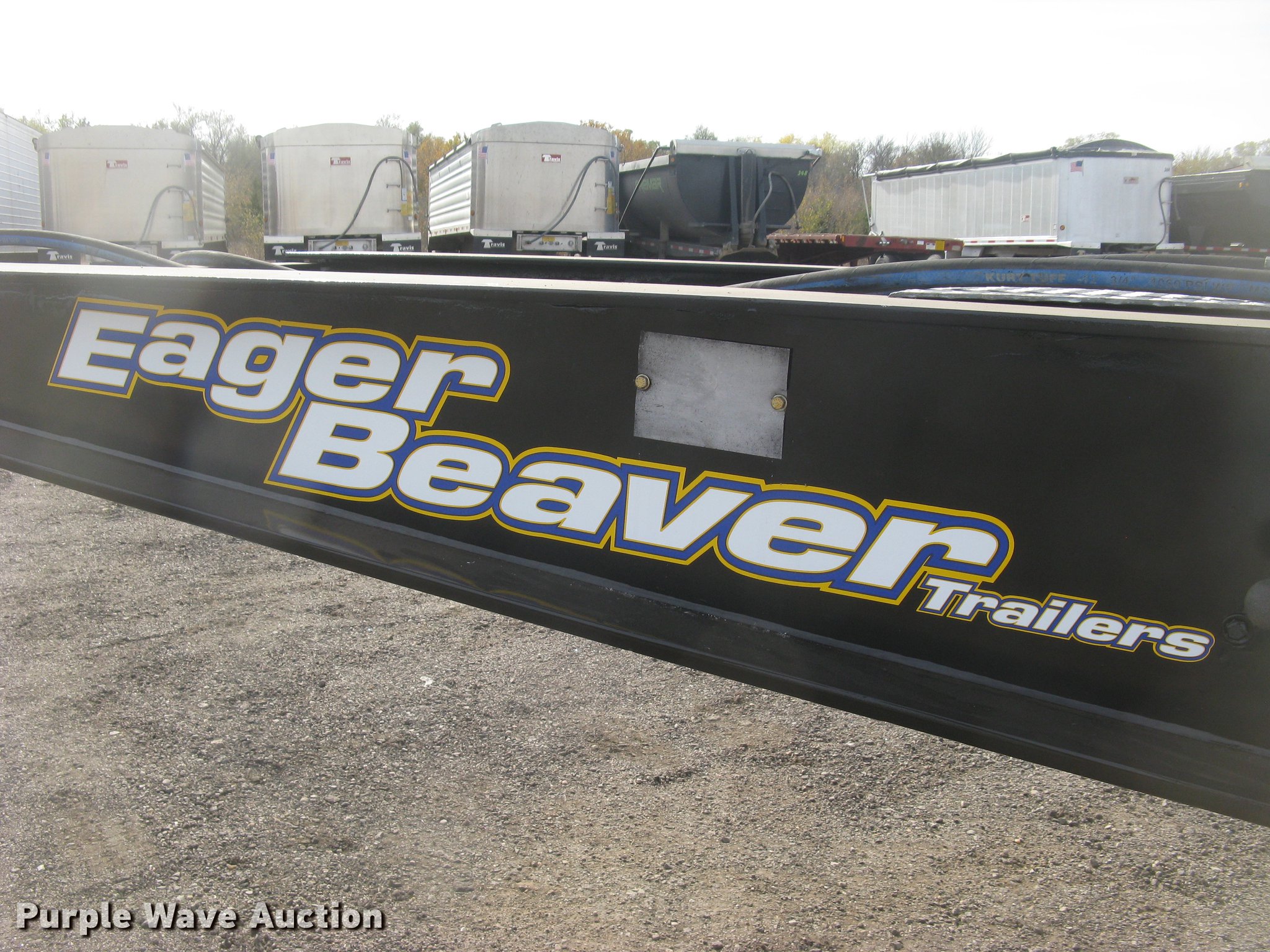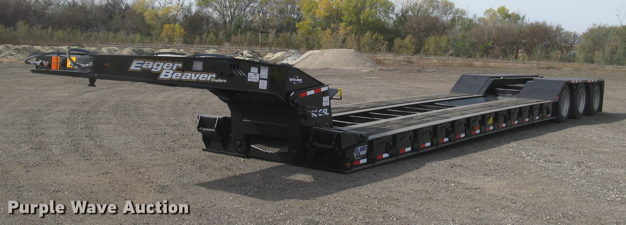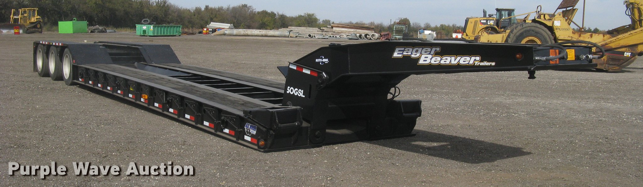 Purple Wave is selling a used Equip. Trailer in Kansas. This item is a 2000 Eager Beaver 50GSL RGN lowboy equipment trailer with the following: 53'L x 102"W overall, 12'L RGN neck, 24'L well, 12'L rear deck, (2) approx. 36"L x 19"W fold up wedge ramps, Wood deck, Fold-out deck extensions, Chain/binder box in floor, Supply or excavator stick trough in floor, D-ring tie downs, Hydraulic detach neck, Fifth wheel plate, Air suspension, Air brakes, Triple axle, 255/70R22.5 tires, Annual inspection completed 11/2017, Unit# 352