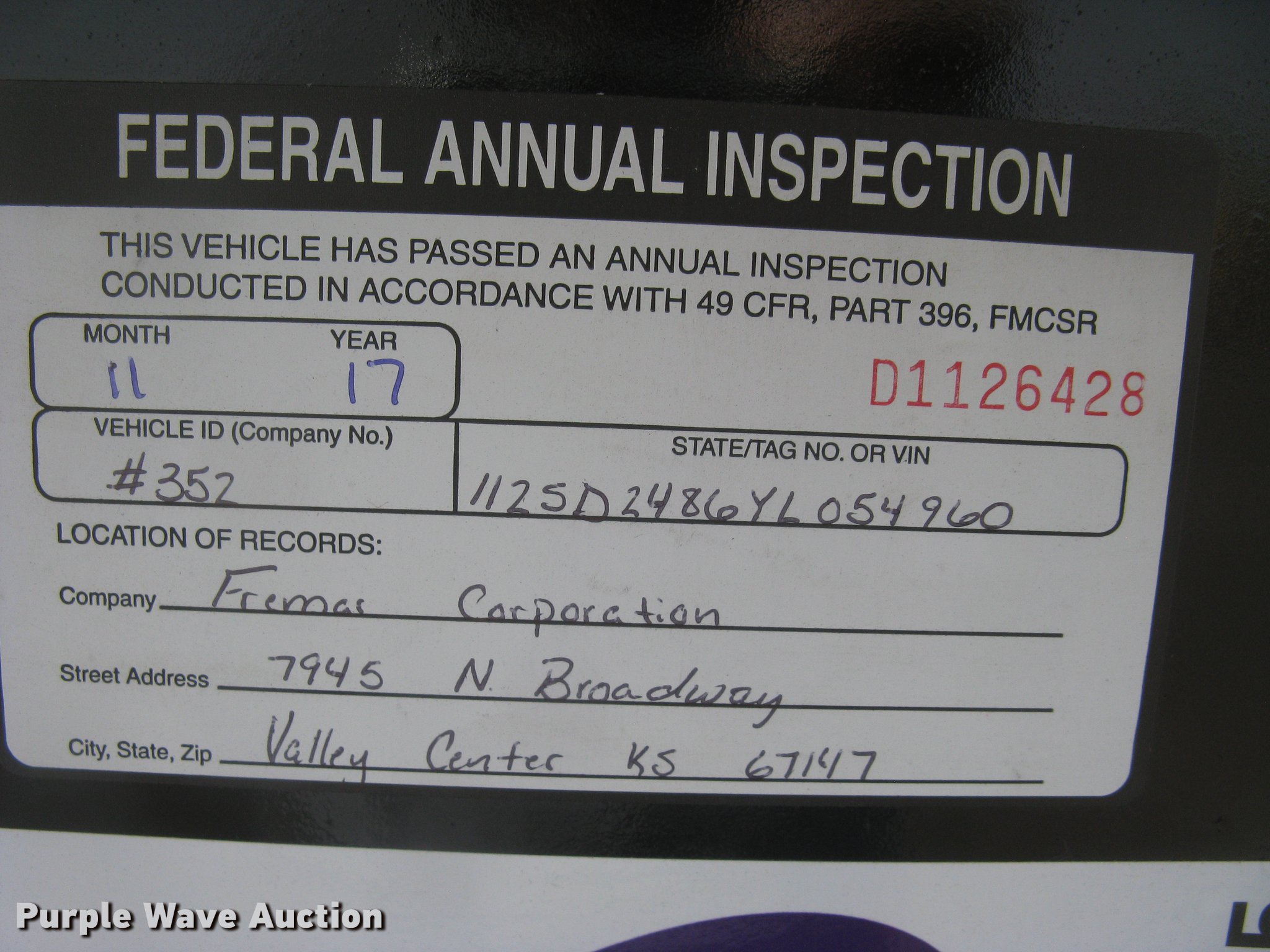 2000 Eager Beaver 50GSL RGN lowboy equipment trailer. 53'L x 102"W overall, 12'L RGN neck, 24'L well, 12'L rear deck, (2) approx. 36"L x 19"W fold up wedge ramps, Wood deck, Fold-out deck extensions, Chain/binder box in floor, Supply or excavator stick trough in floor, D-ring tie downs, Hydraulic detach neck, Fifth wheel plate, Air suspension, Air brakes, Triple axle, 255/70R22.5 tires, Annual inspection completed 11/2017, Unit# 352. Kansas title. 112SD2486YL054960. Fremar Corp. LLC. 7945 N Broadway St. Valley Center, KS 67147