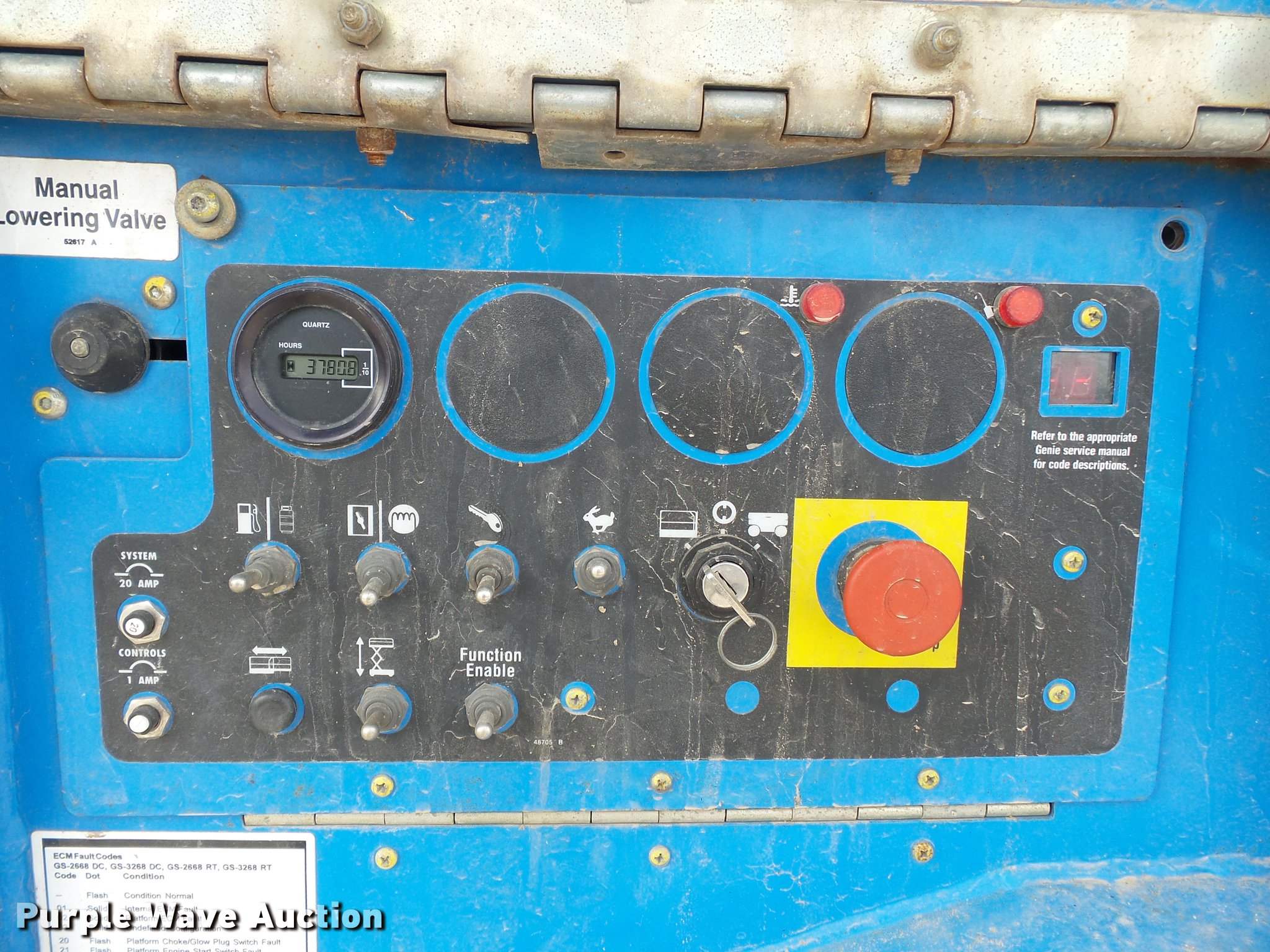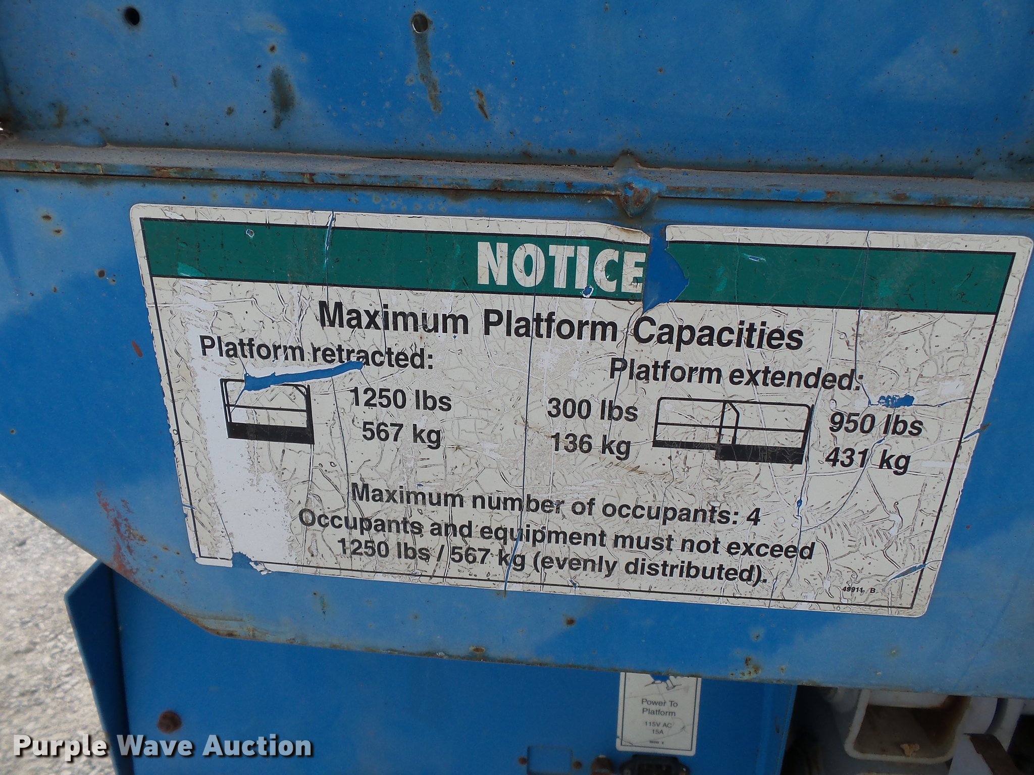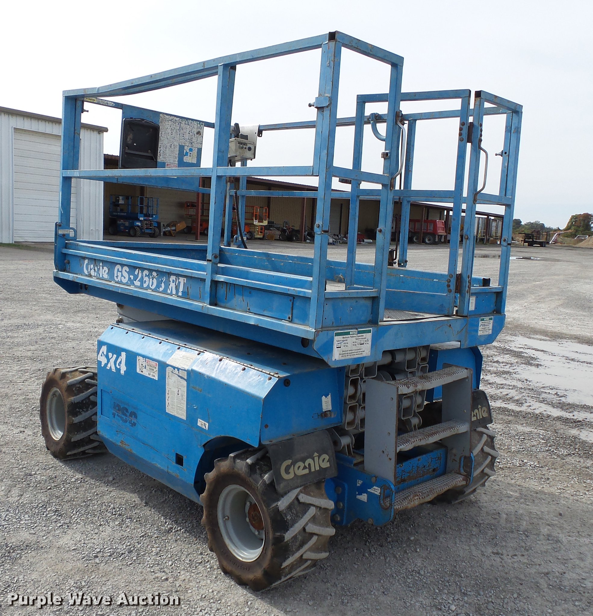 Purple Wave is selling a used Scissor or Vertical Lift in Missouri. This item is a 2000 Genie GS2668RT scissor lift with the following: 3,781 hours on meter, Kubota DF750E three cylinder dual fuel engine, Propane and gas capable, Four wheel drive, 12V, 1,250 lbs maximum lift capacity, 26' maximum lift height, 10'L x 4'W platform, Platform extensions, AC power outlet, Platform and ground controls, 26 x 12 x 12 pneumatic tires, Propane tank included, Serial 32342