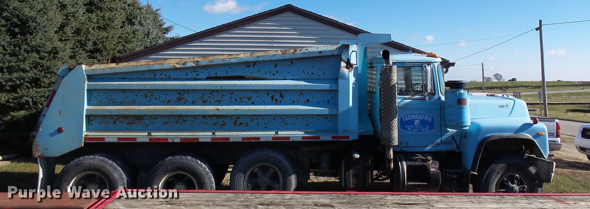 1978 Mack RD686S dump truck. 70,236 miles on odometer, 5,640 hours on meter, Mack ENDT676 six cylinder turbo diesel engine 283 HP at 2,100 RPM, Eaton Fuller RTO14708LL eight speed manual transmission, Triple axle, Heat, AM/FM/CD, Air suspensions seat, Steel dump bed Model MK116X36, 16'L x 7'W, 44" side height, Single ram hoist, Air operated end gate, Pintle hitch, Trailer wiring, 228" wheelbase, Page LM3000 pusher axle, Spring over walking beam suspension, Air brakes, 315/80R22.5 front tires, 11R22.5 rear tires, DOT inspection completed April 2017, Service records available upon request. Iowa title. RD68654810. Tschiggfrie Excavating. 425 Julien Dubuque Dr. Dubuque, IA 52003