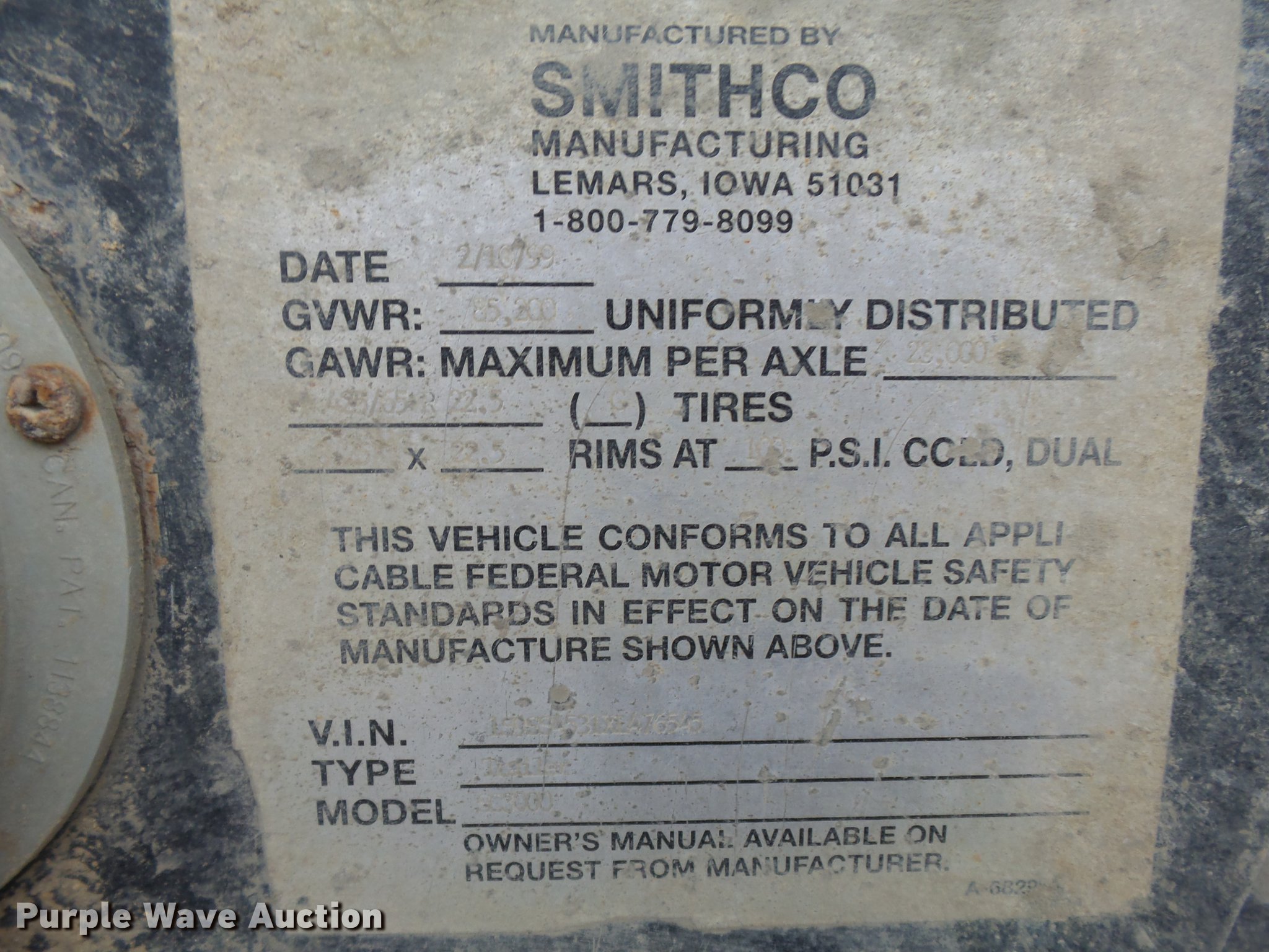1999 Smith Co SC3000 side dump trailer. 40'L, Steel construction, Dual hydraulic cylinders, Manual pin lock, Dual leg landing gear, Fifth wheel plate, Triple axle, Spring suspension, Air brakes, Aluminum wheels, 425/65R22.5 tires, GVWR 85,200 lbs. Iowa title. 1S9SS4531XL476545. Tschiggfrie Excavating. 425 Julien Dubuque Dr. Dubuque, IA 52003
