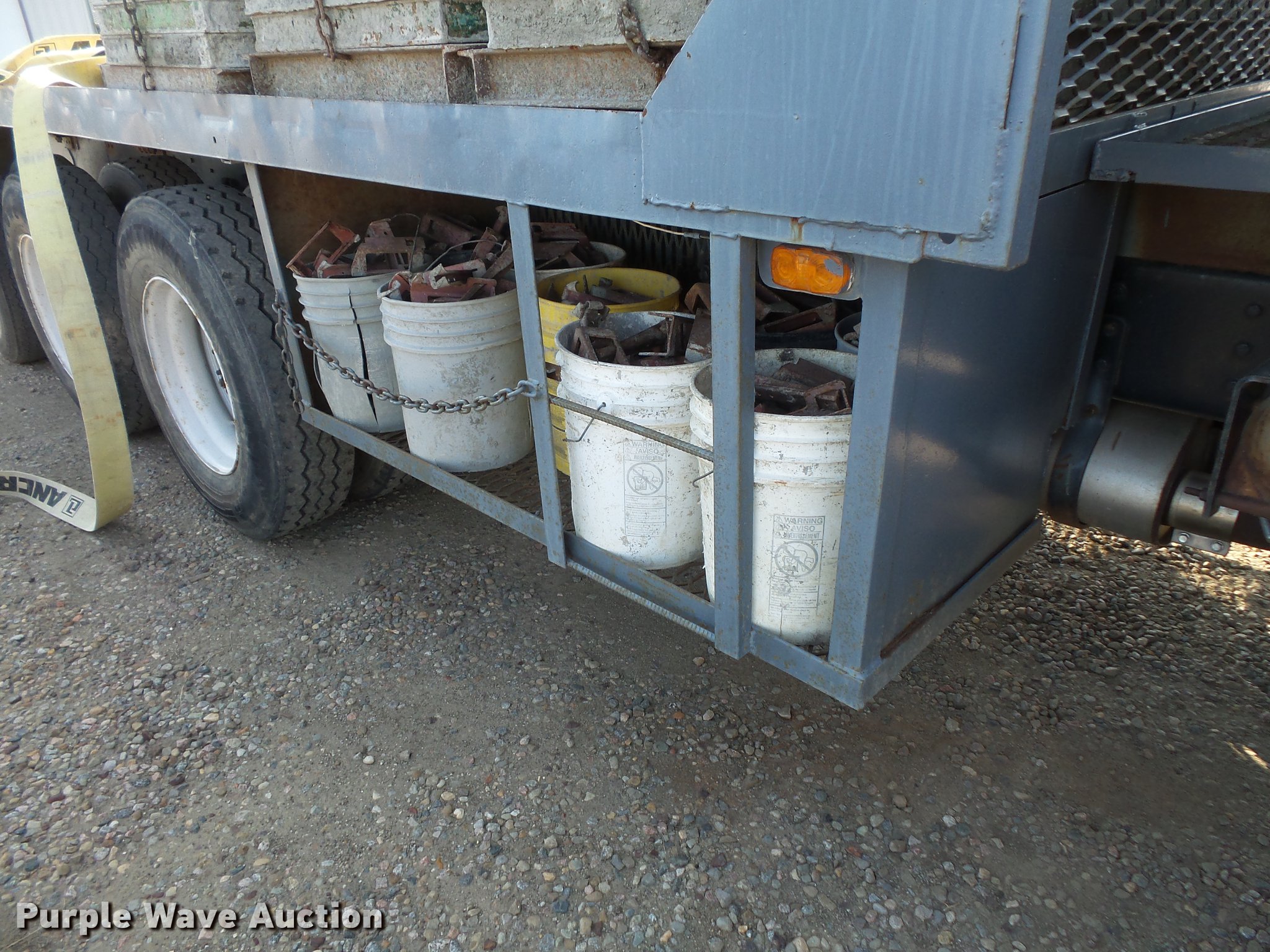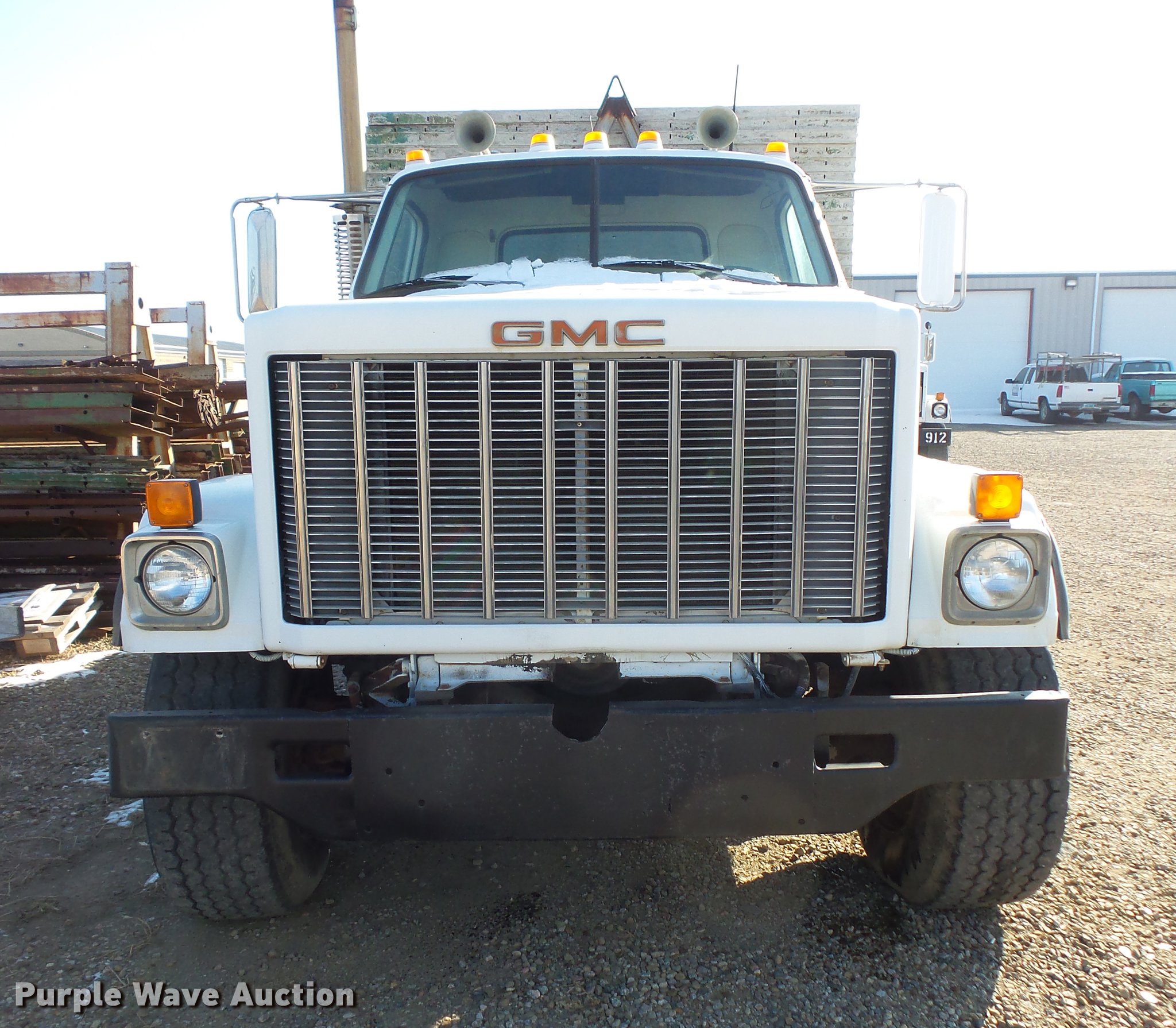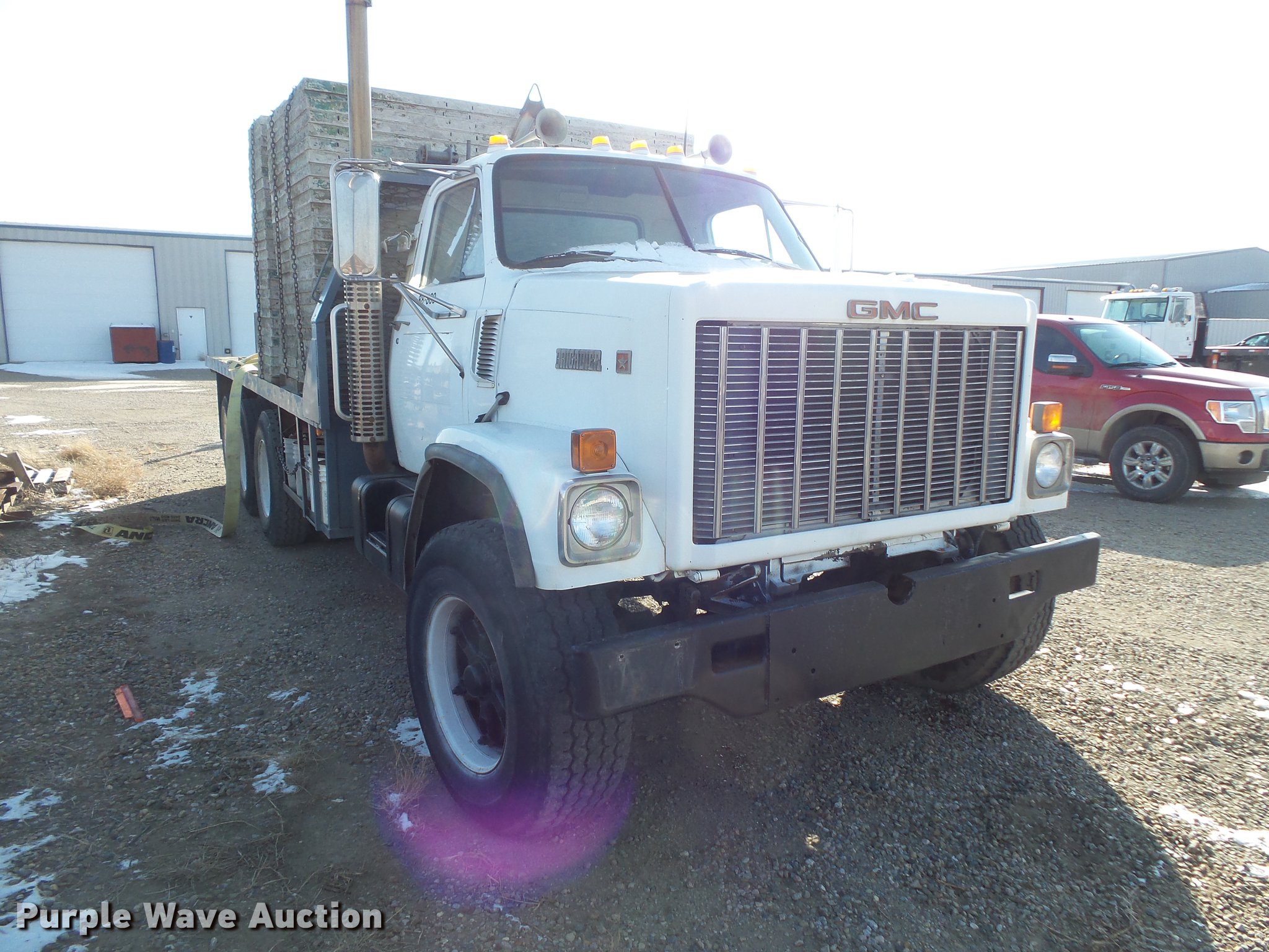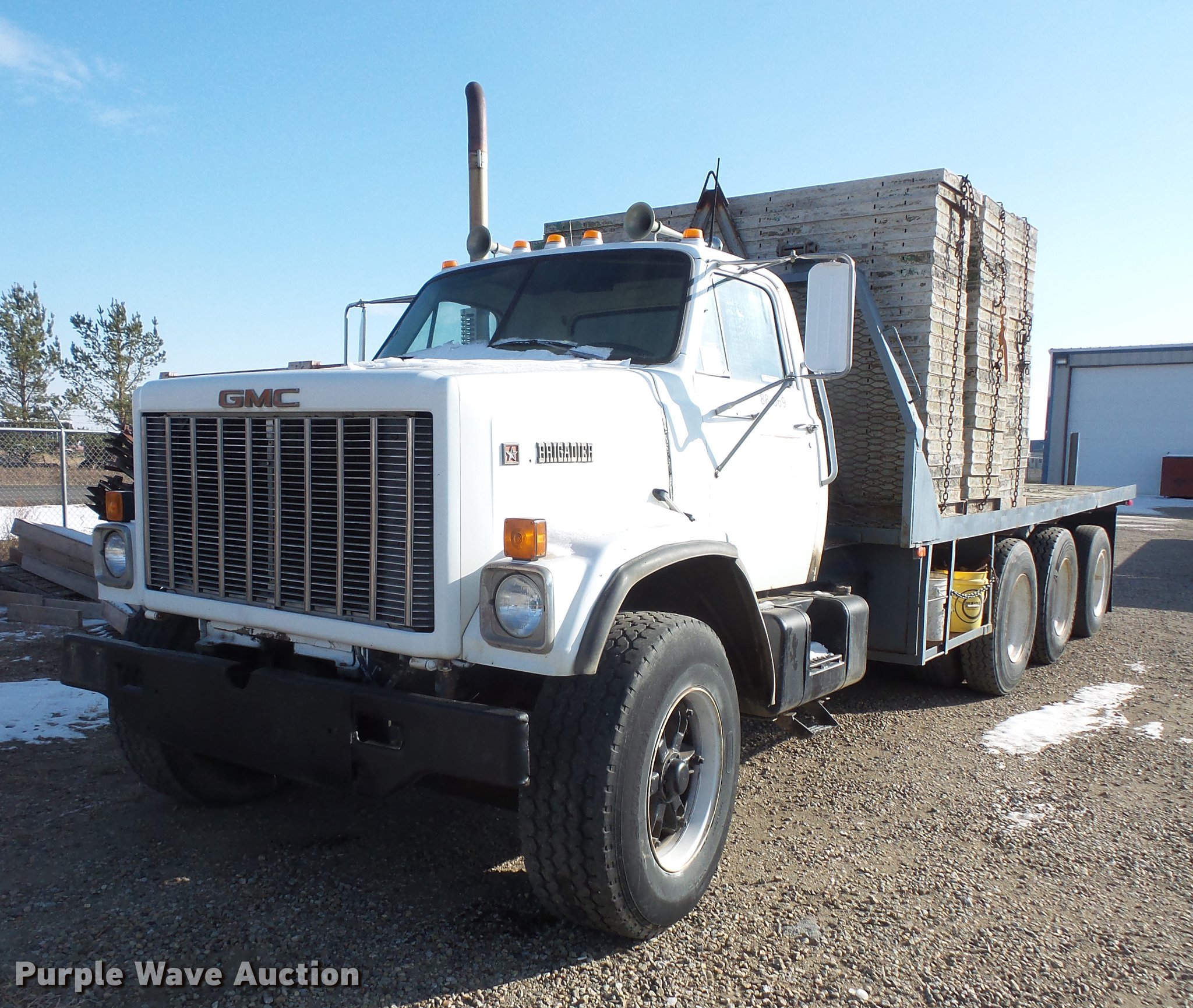 Purple Wave is selling a used Flat Bed Truck in North Dakota. This item is a 1984 GMC Brigadier flatbed truck with the following: 136,050 miles on odometer, Detroit Diesel six cylinder diesel engine, Eight speed manual transmission, Heat, 20'8"L x 94"W wood flatbed, Single fuel tank, Single exhaust stack, Pintle hitch, Trailer wiring, Air lift tag axle, Walking beam suspension, Air brakes, 385/65R22.5 front tires, 11R22.5 rear tires, 9.00R20 tag axle tires, Oil leak, Concrete forms and pin buckets are not included, Unit# 88-869
