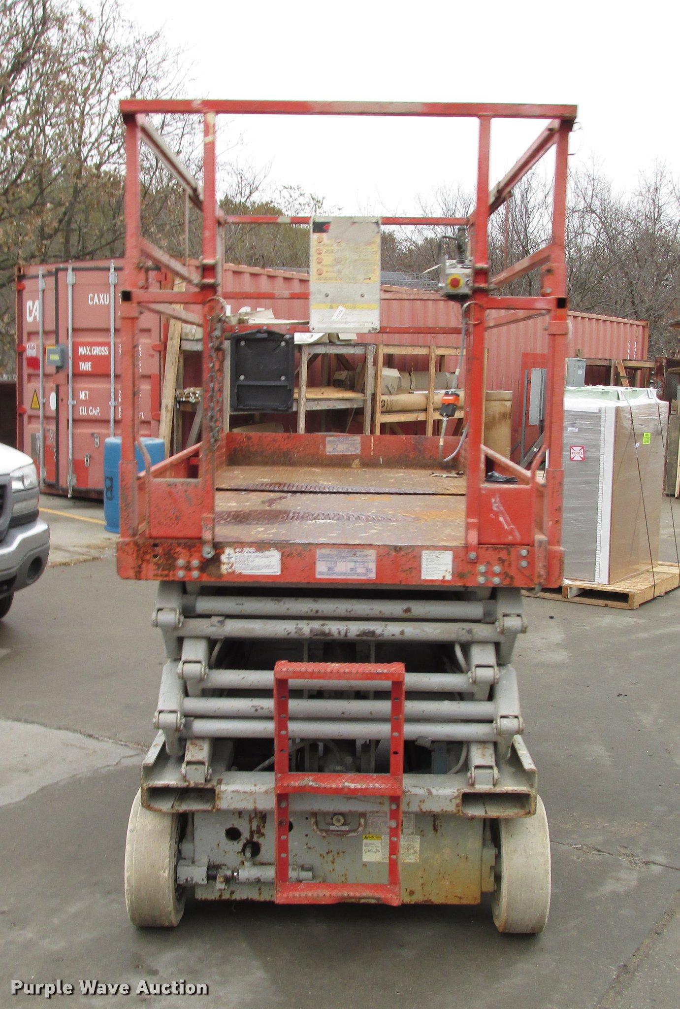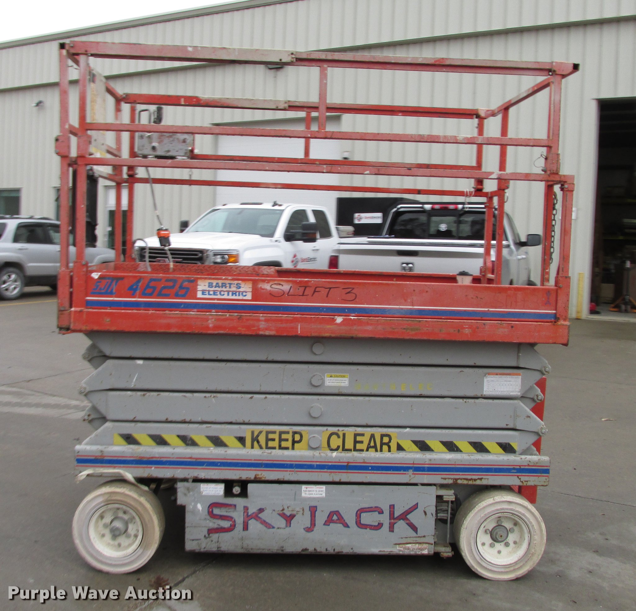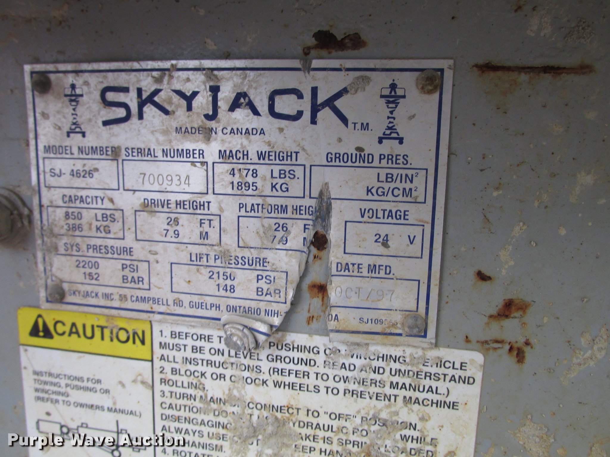 Purple Wave is selling a used Scissor or Vertical Lift in Missouri. This item is a 1997 Sky Jack SJ-4626 scissor lift with the following: 600 hours on meter, 24V electric operation, 800 lbs maximum lift capacity, 26' maximum lift height, Ground and platform controls, 46"W, Solid non-marking tires, Battery charger not included, Serial 700934