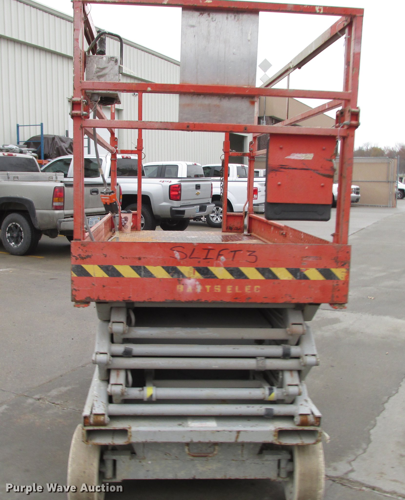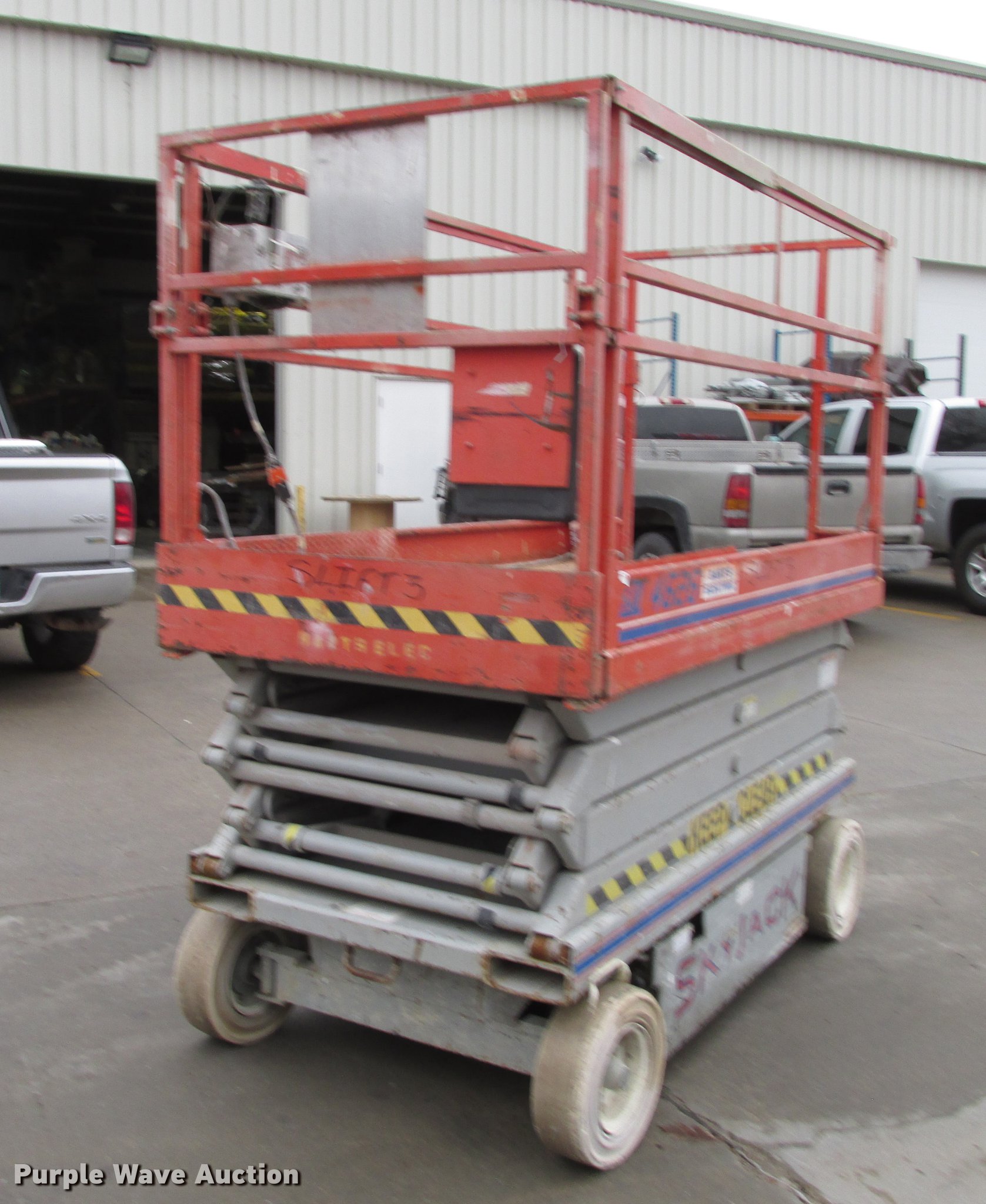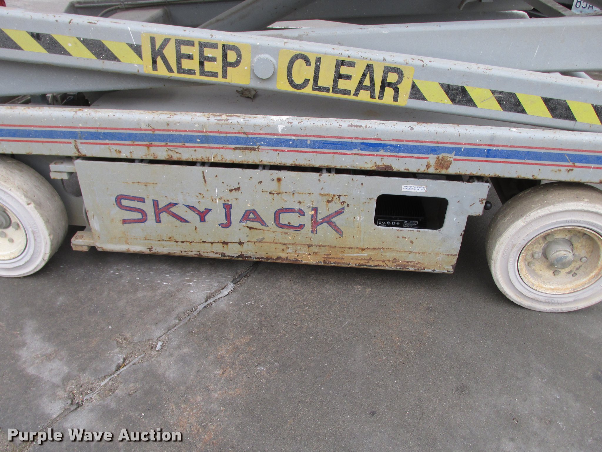 1997 Sky Jack SJ-4626 scissor lift. 600 hours on meter, 24V electric operation, 800 lbs maximum lift capacity, 26' maximum lift height, Ground and platform controls, 46"W, Solid non-marking tires, Battery charger not included, Serial 700934. Barts Electric. 7103 Stewart Rd. Pleasant Valley, MO 64068