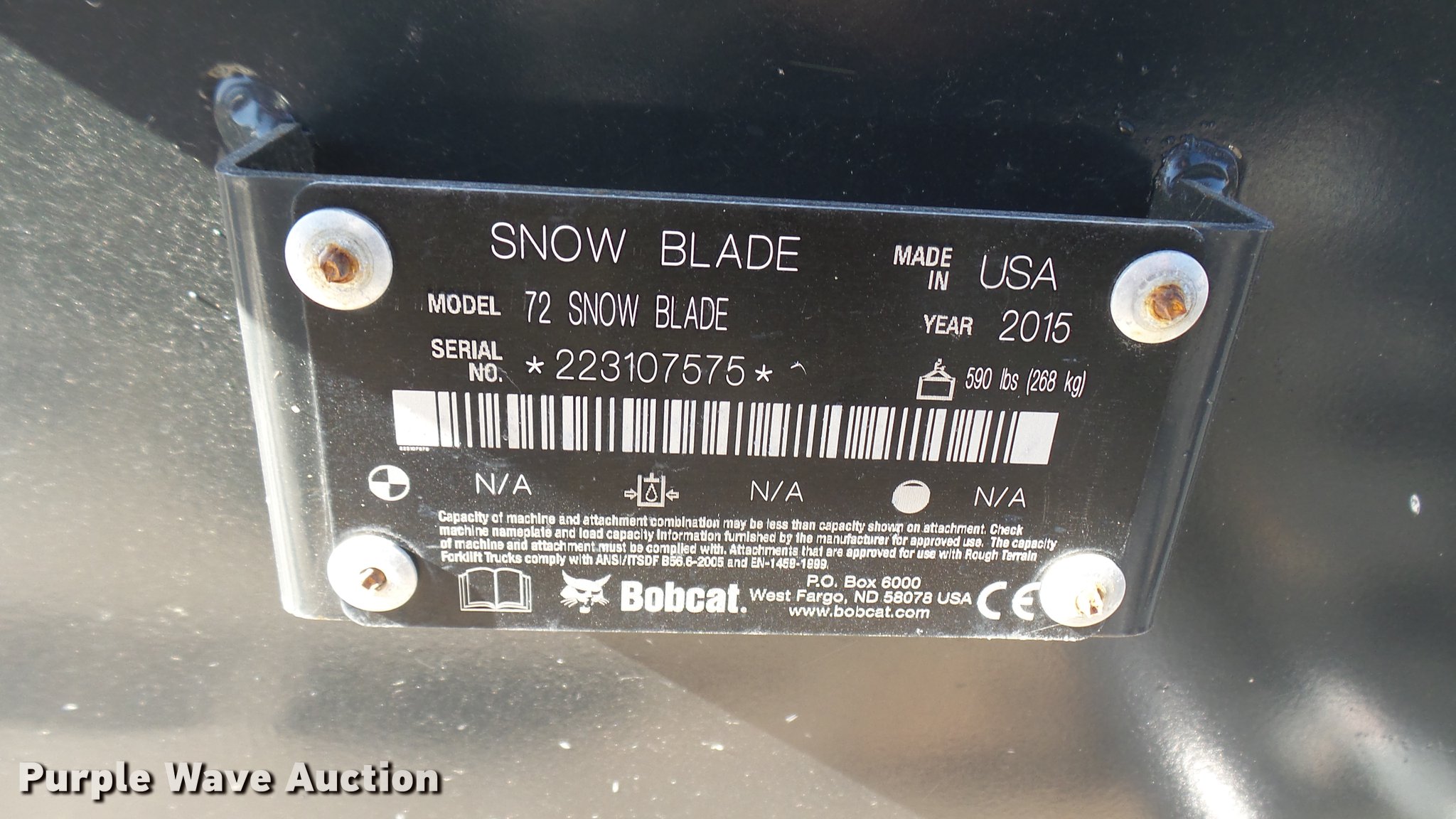2015 Bobcat 72 skid steer snow blade has sold in Wichita, Kansas for $2310. Item DX9756 sold on December 14th, 2017.